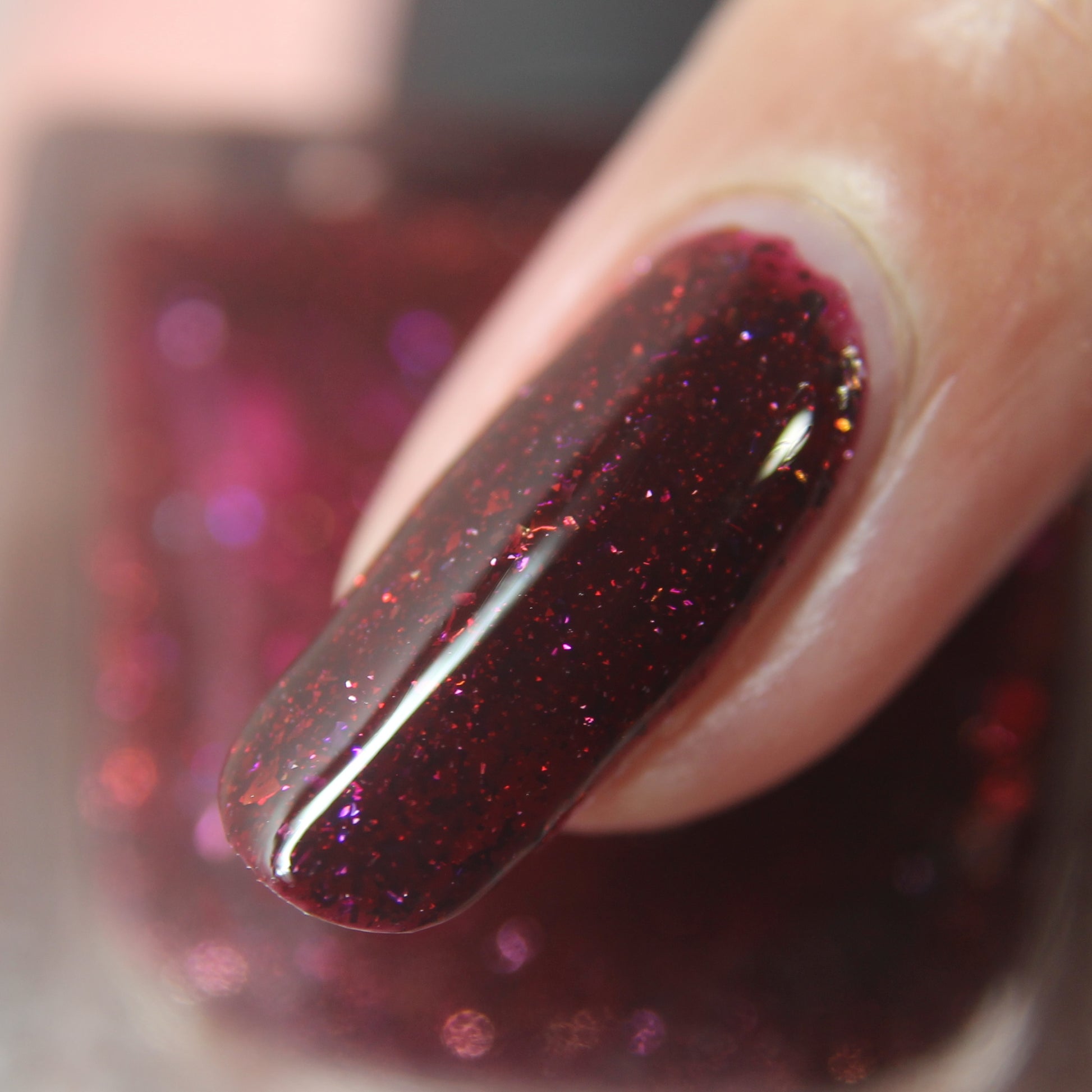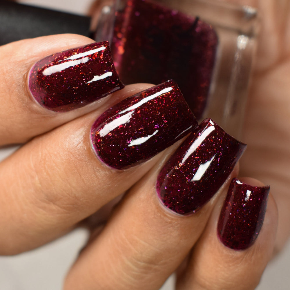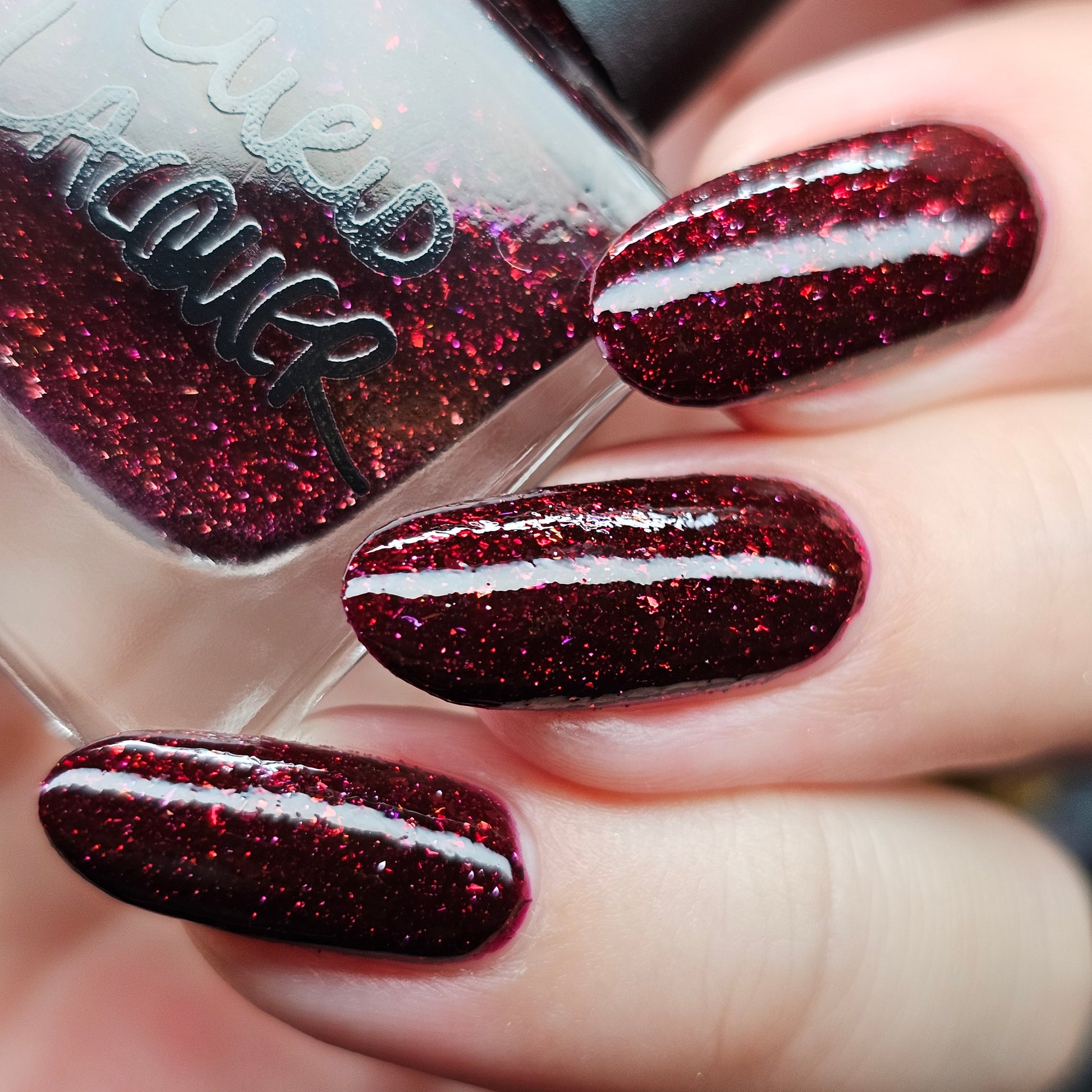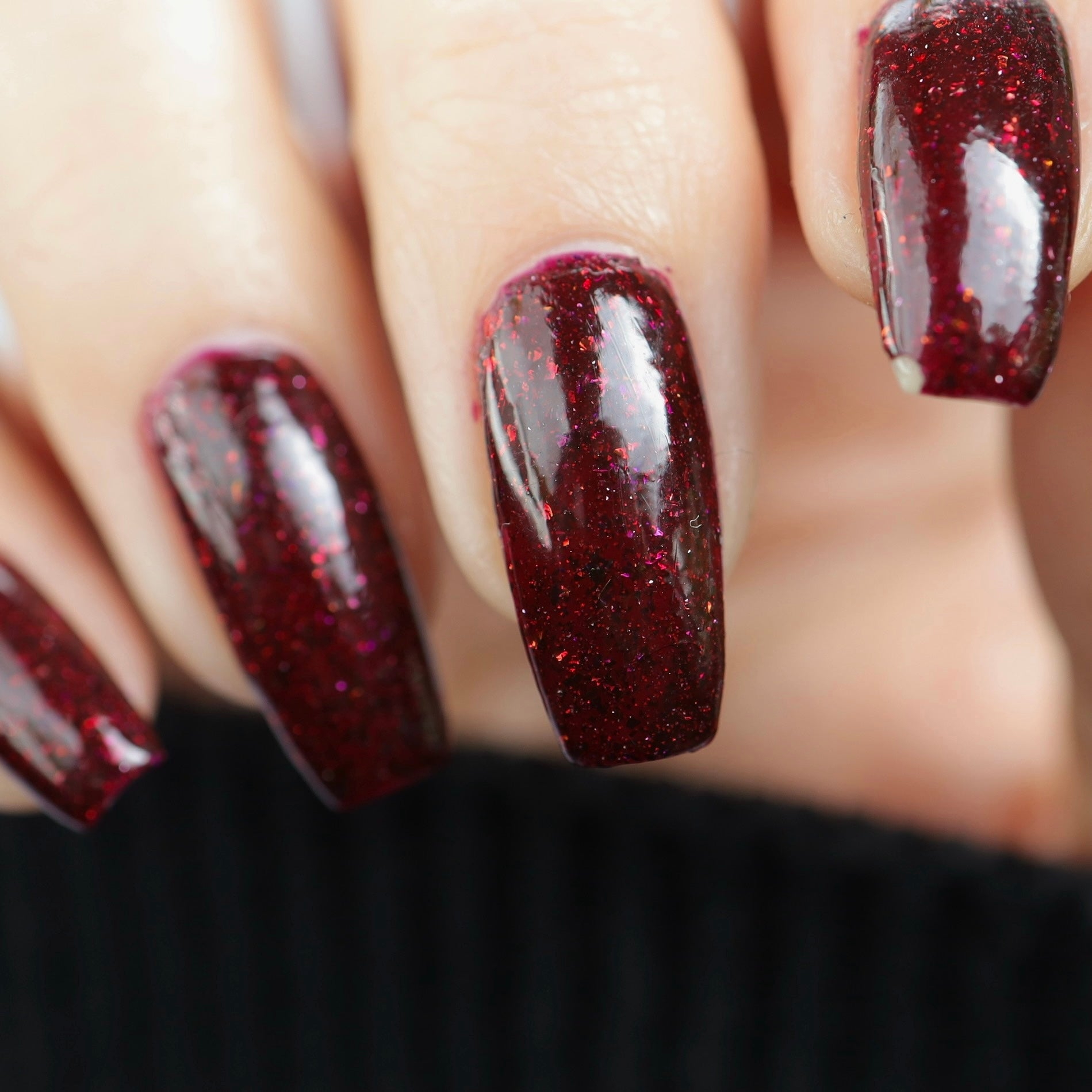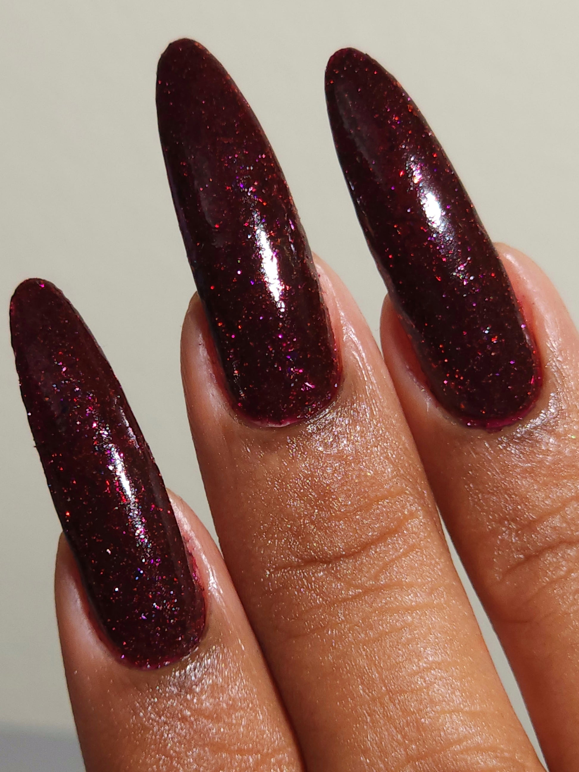 A saturated cool red base with black to red multichrome flakes and red light reflective glitter