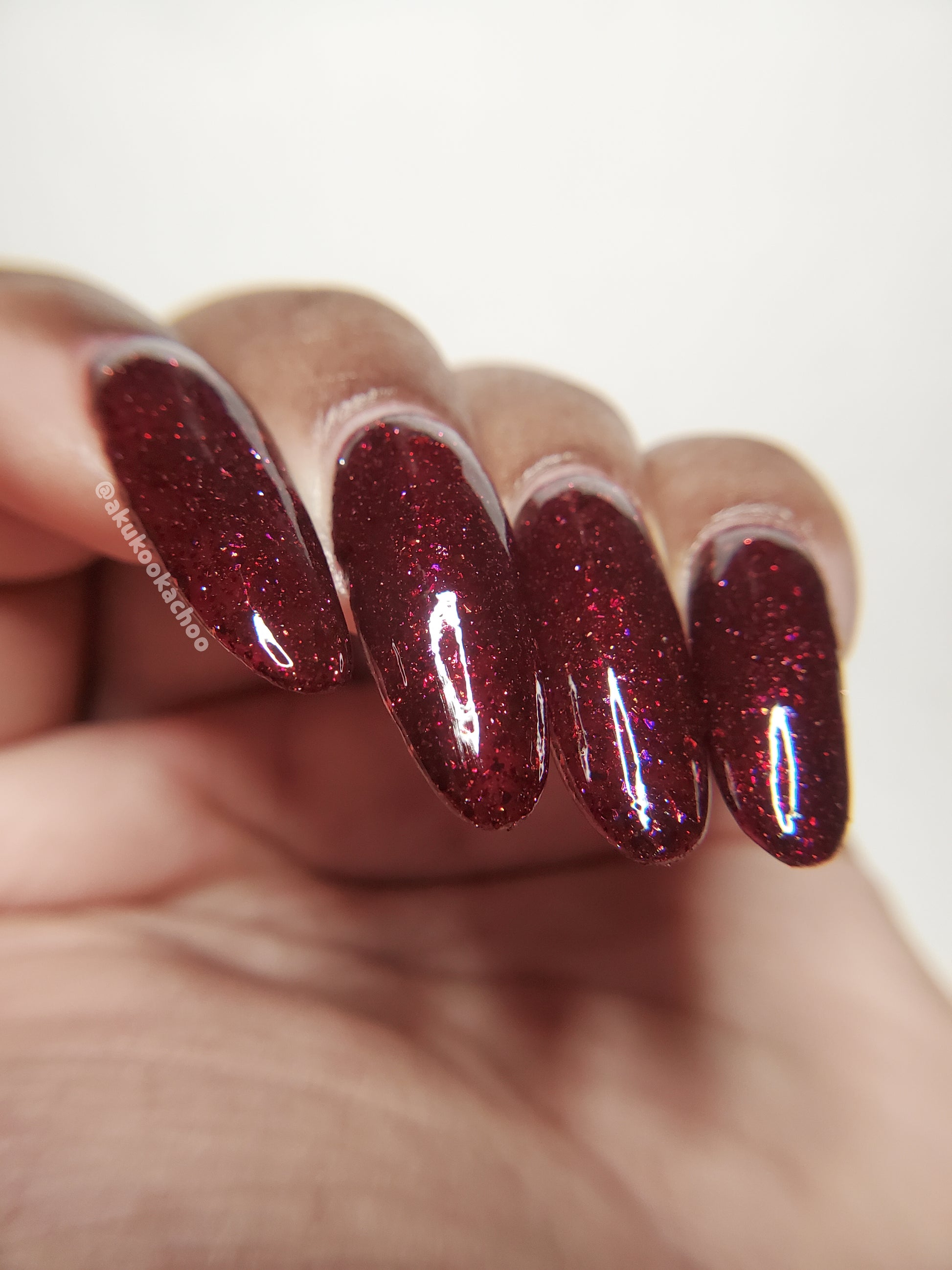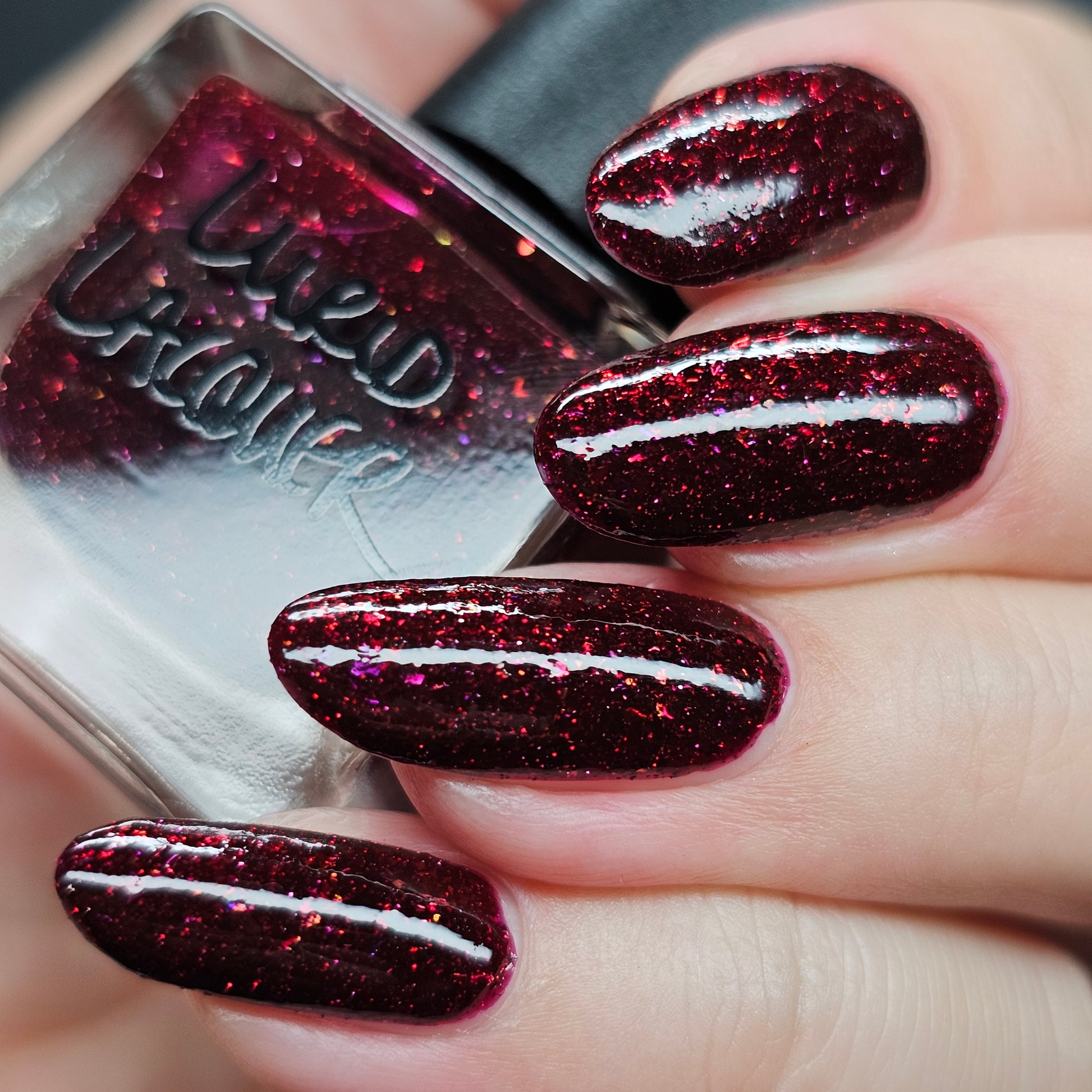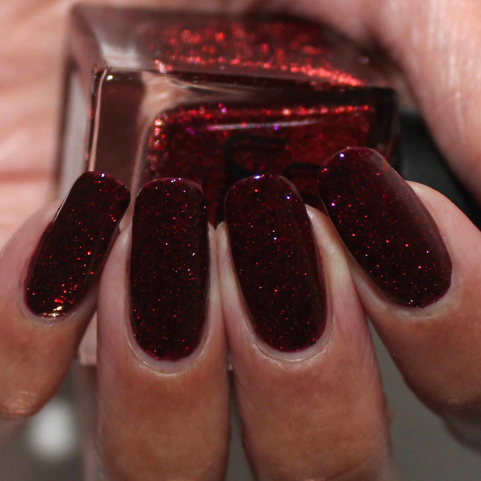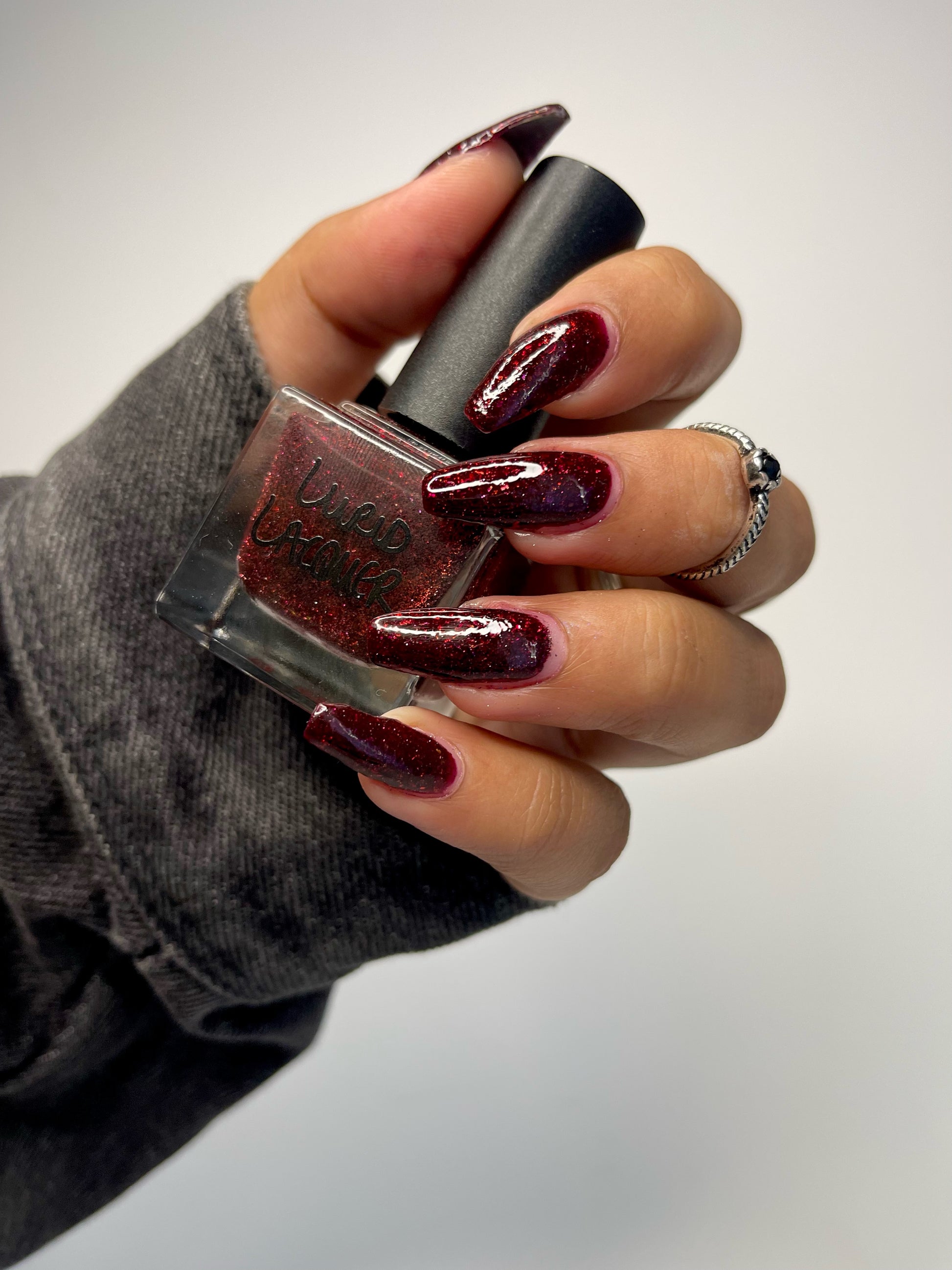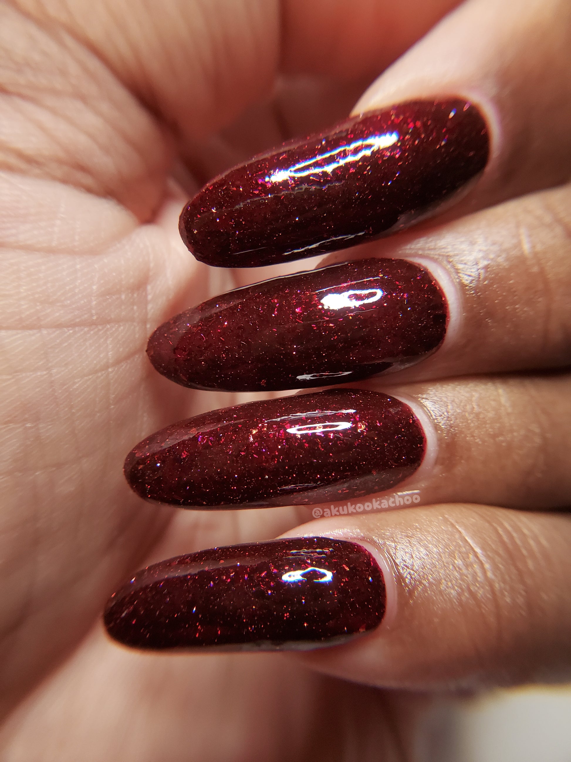 A saturated cool red base with black to red multichrome flakes and red light reflective glitter