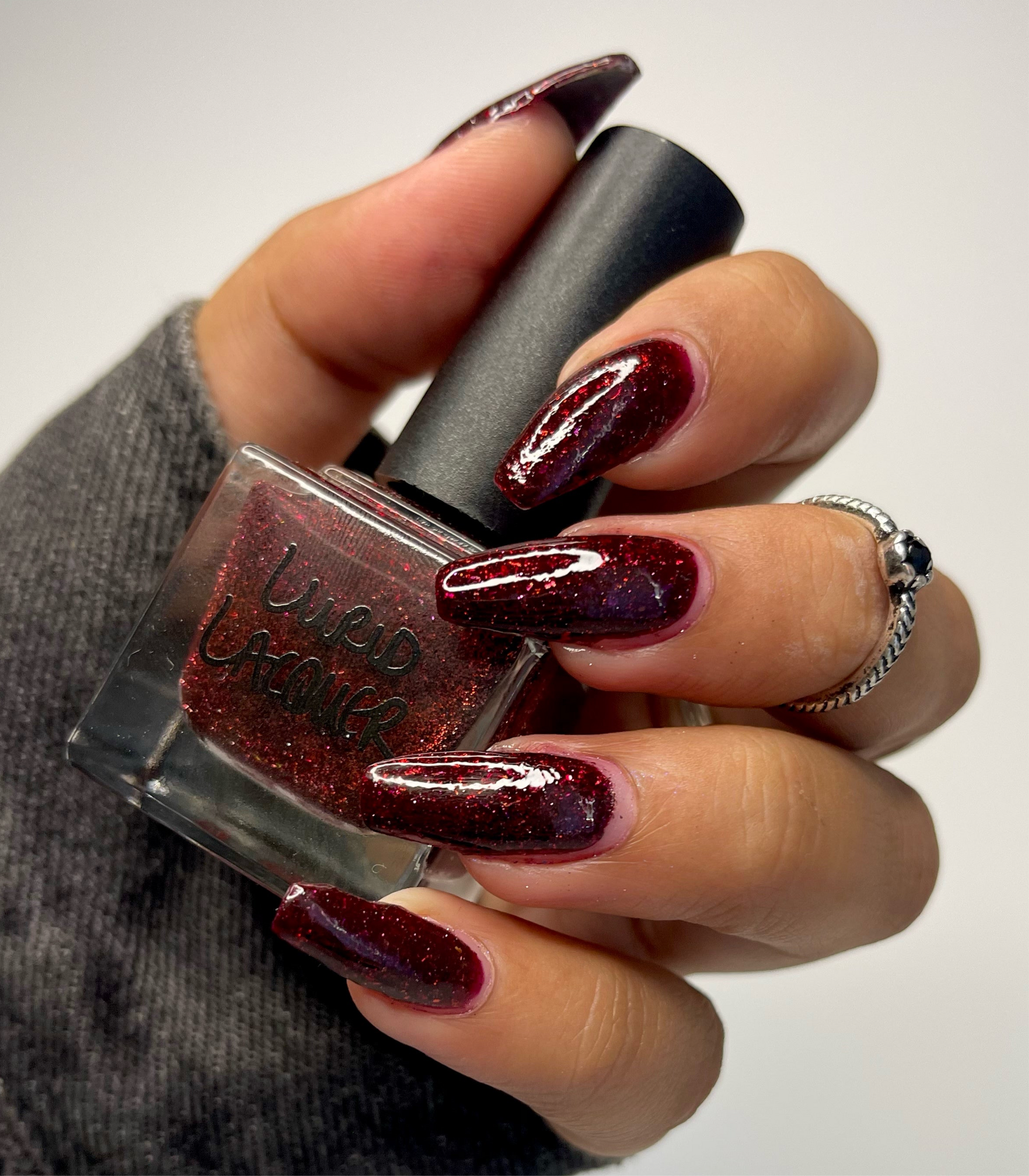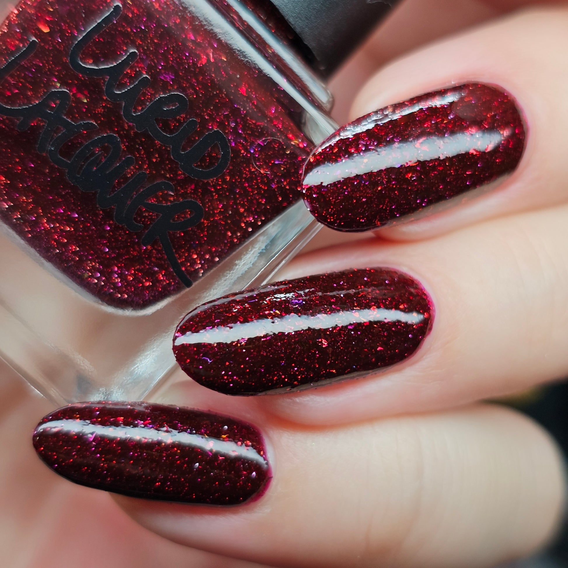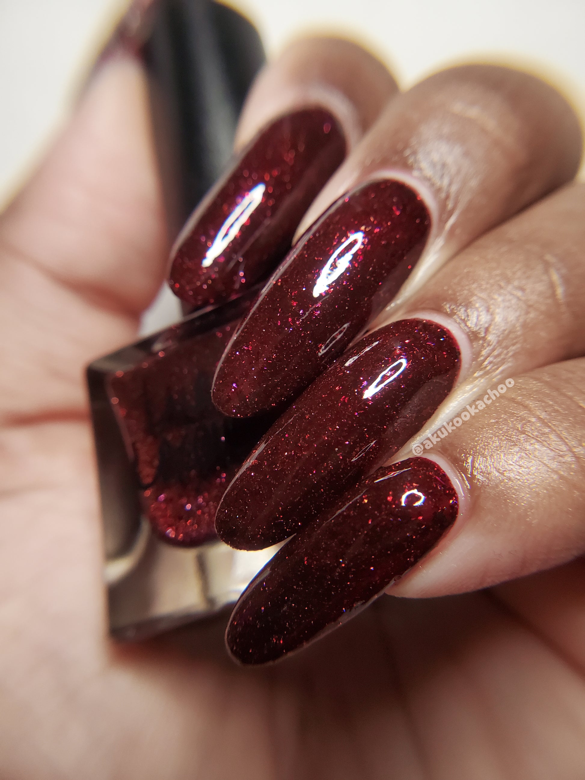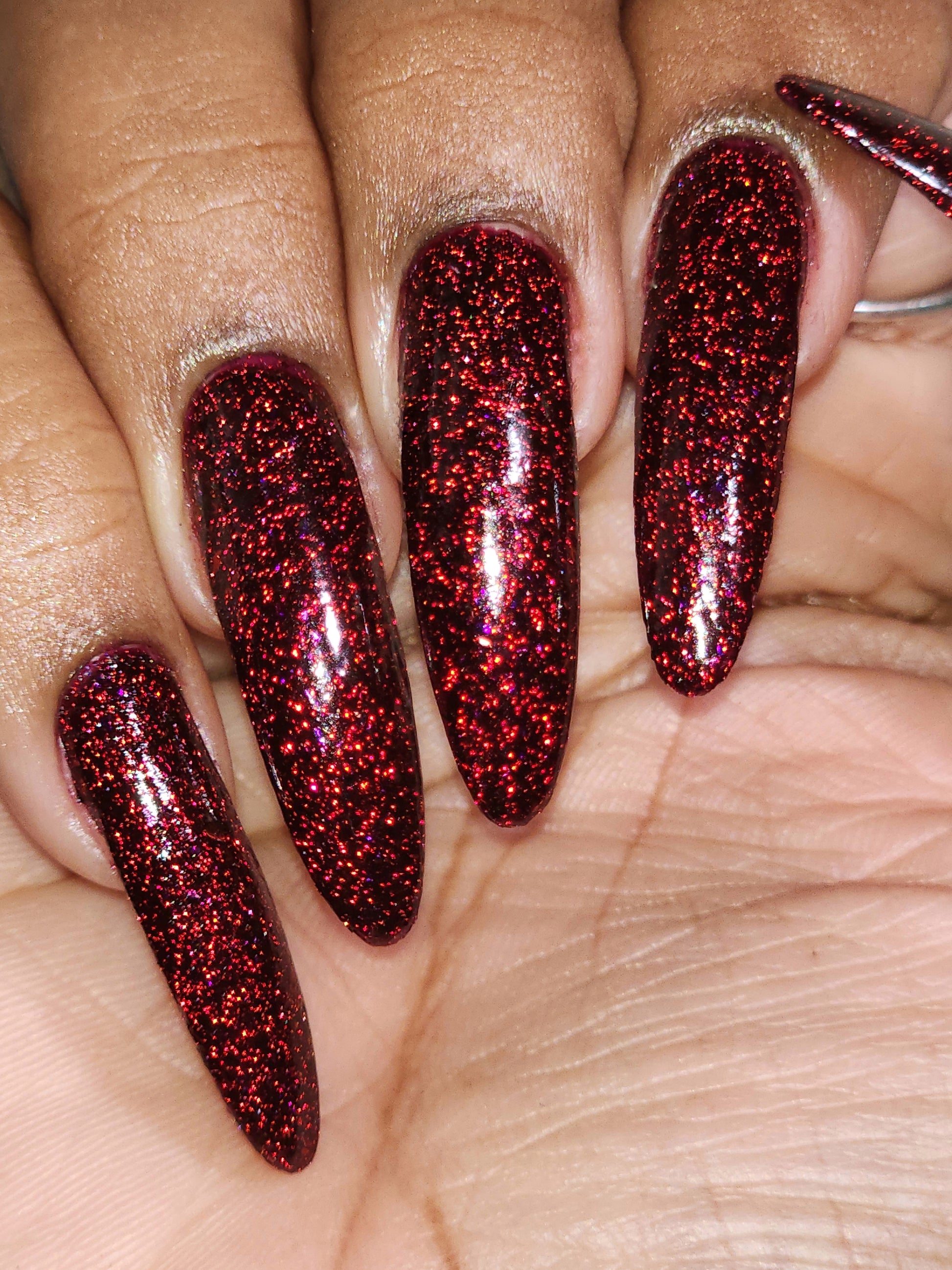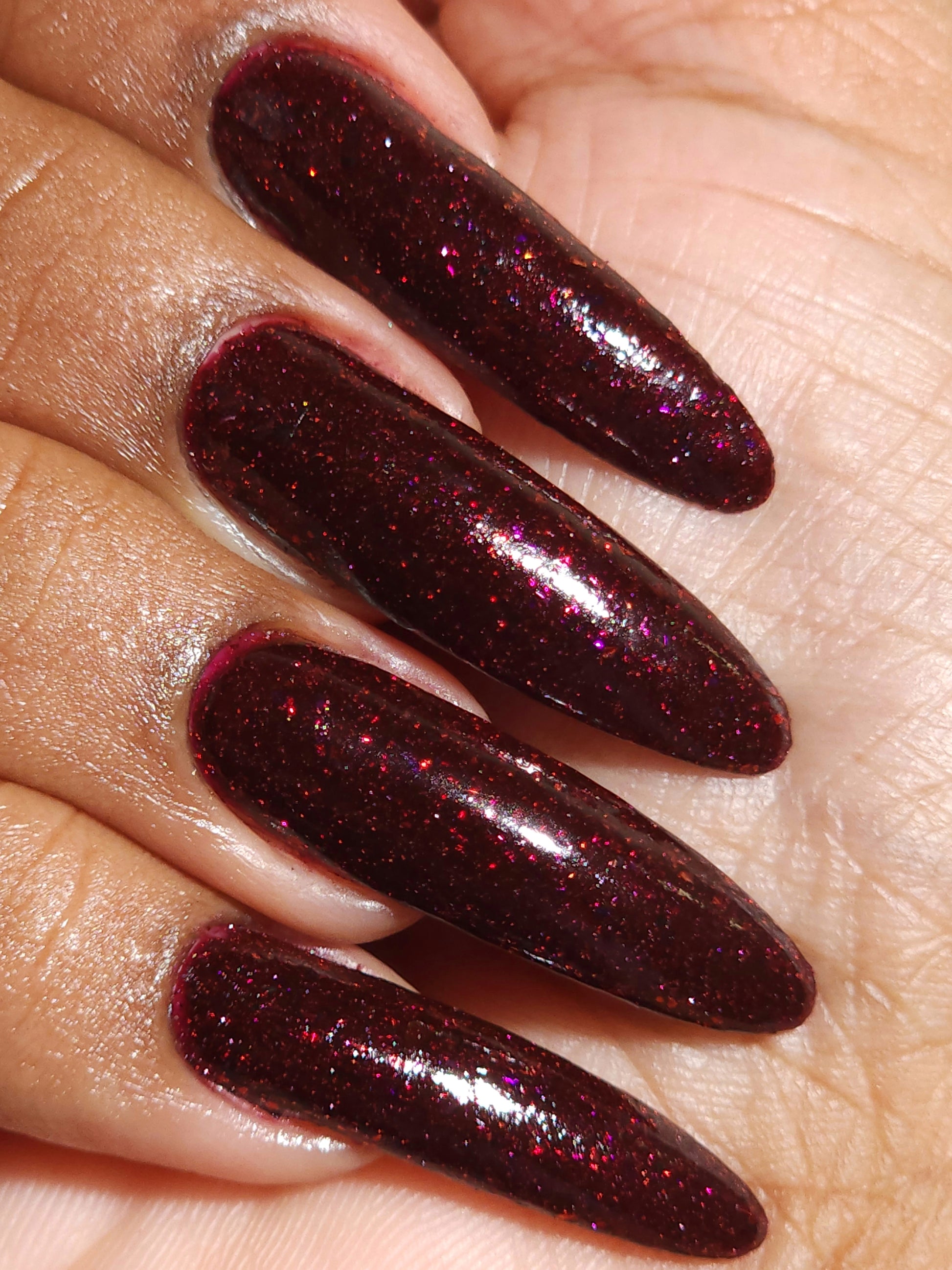 A saturated cool red base with black to red multichrome flakes and red light reflective glitter