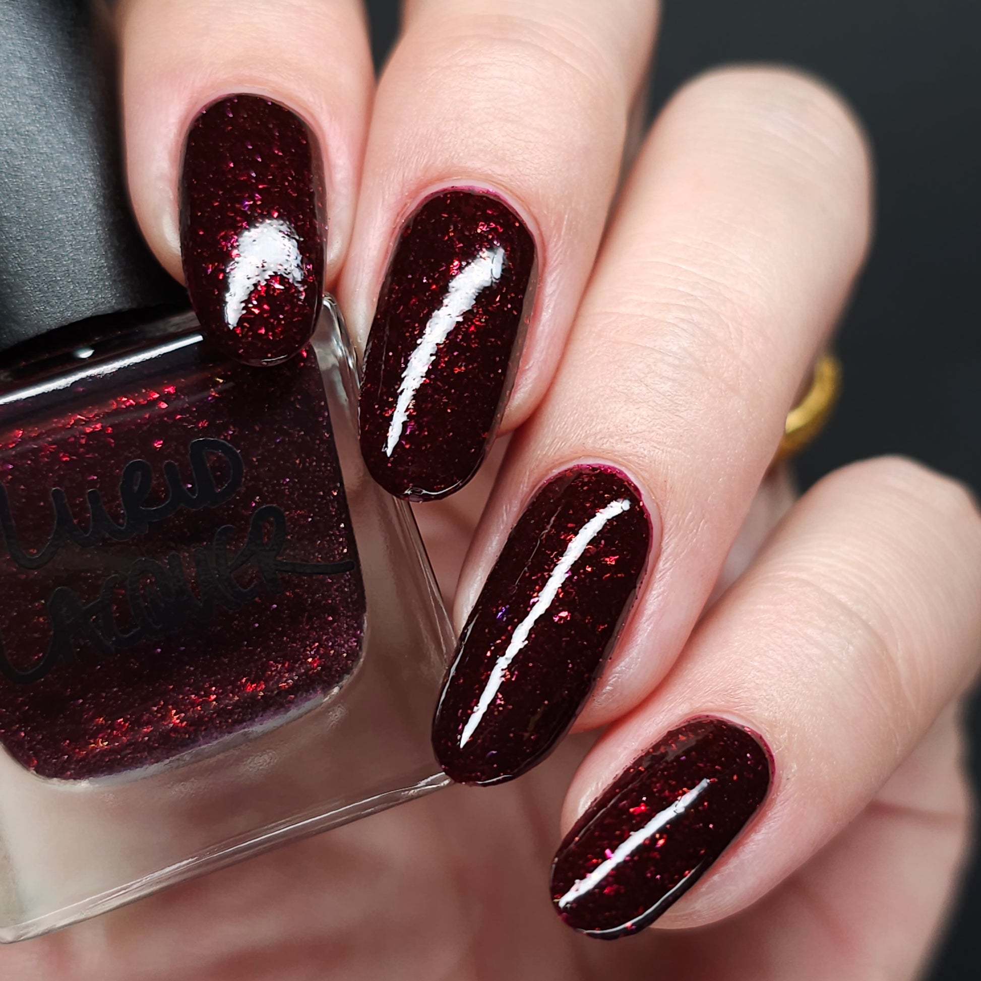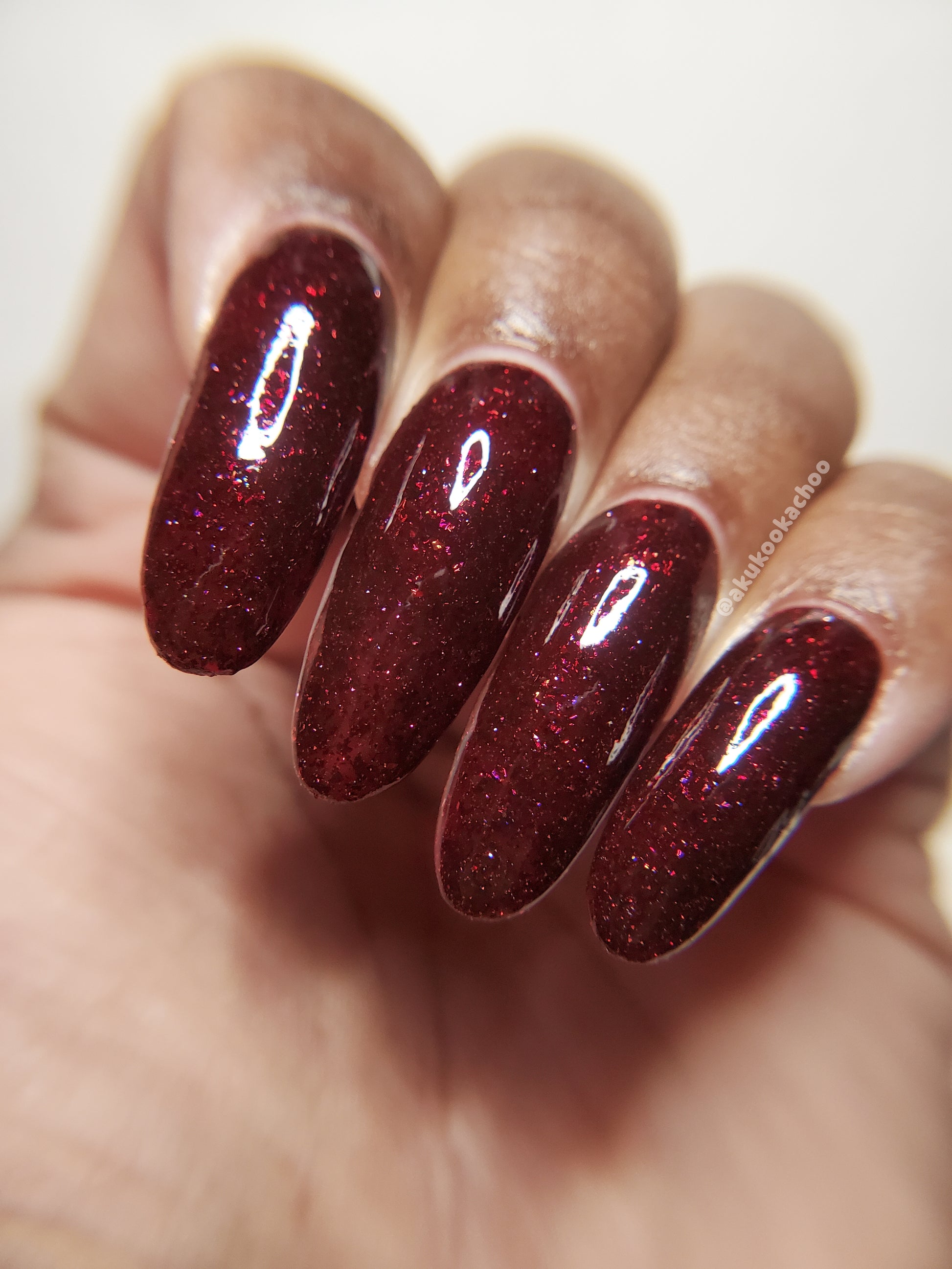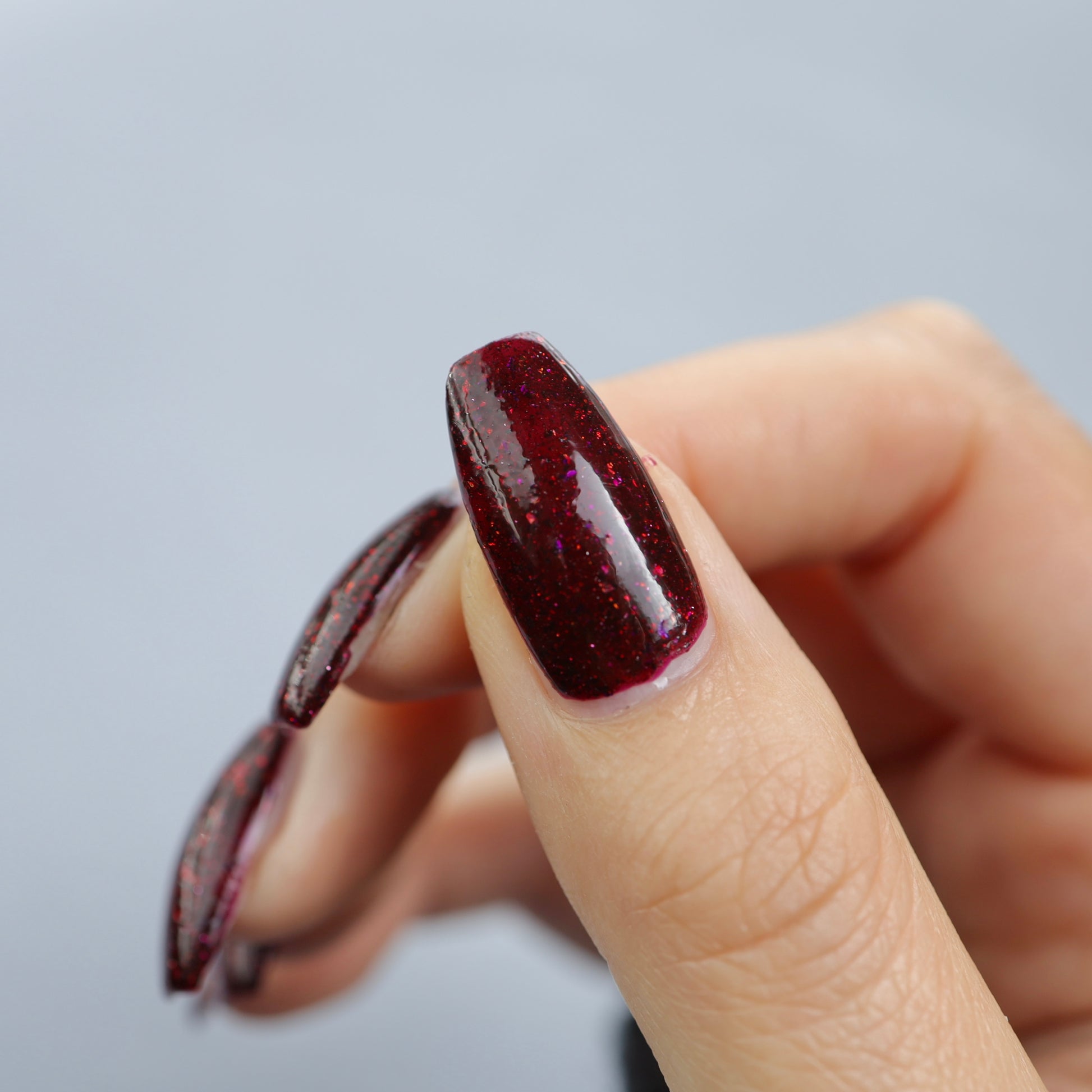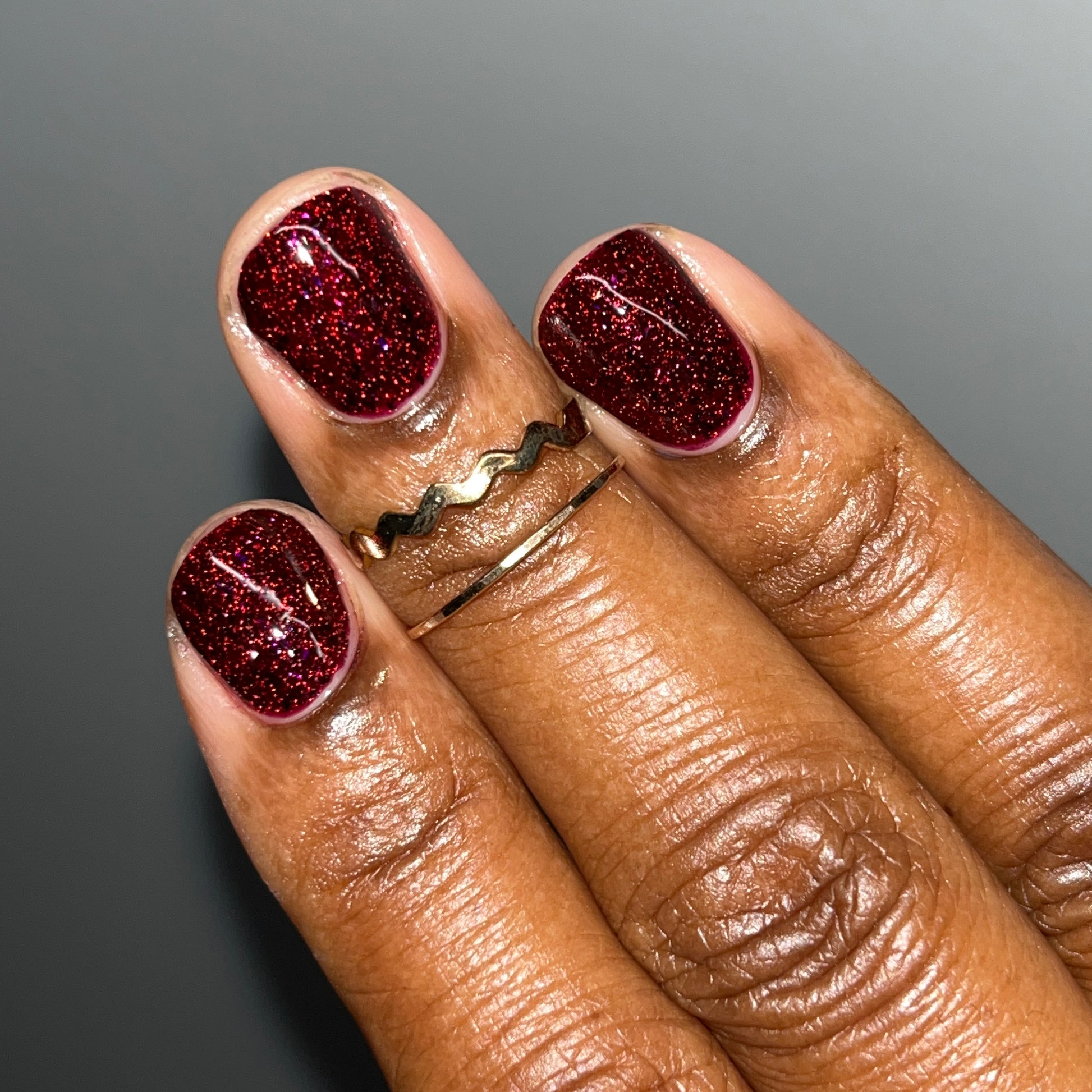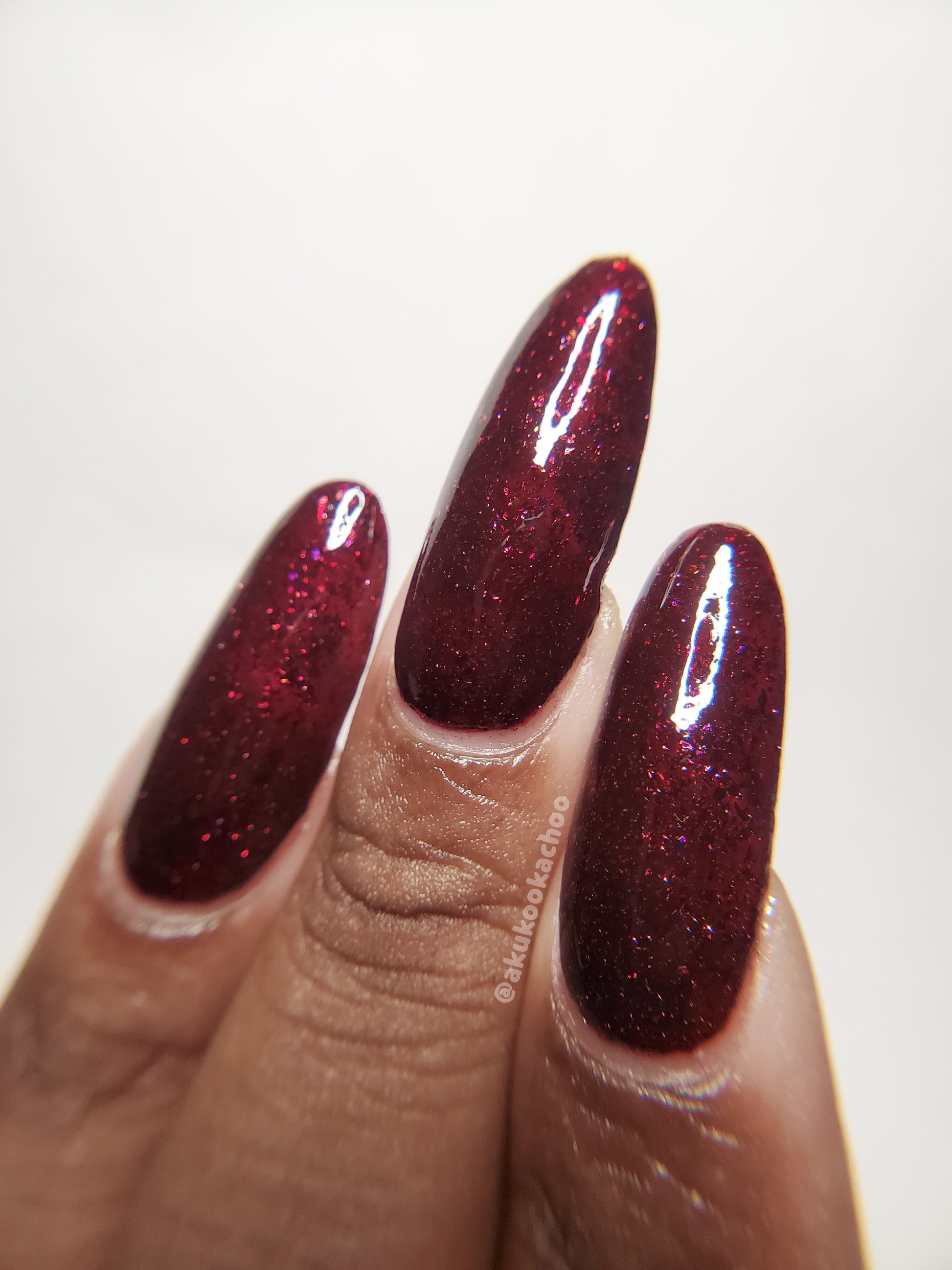 A saturated cool red base with black to red multichrome flakes and red light reflective glitter