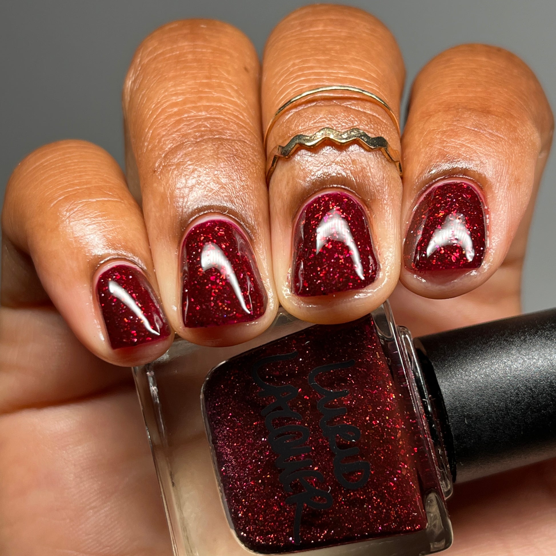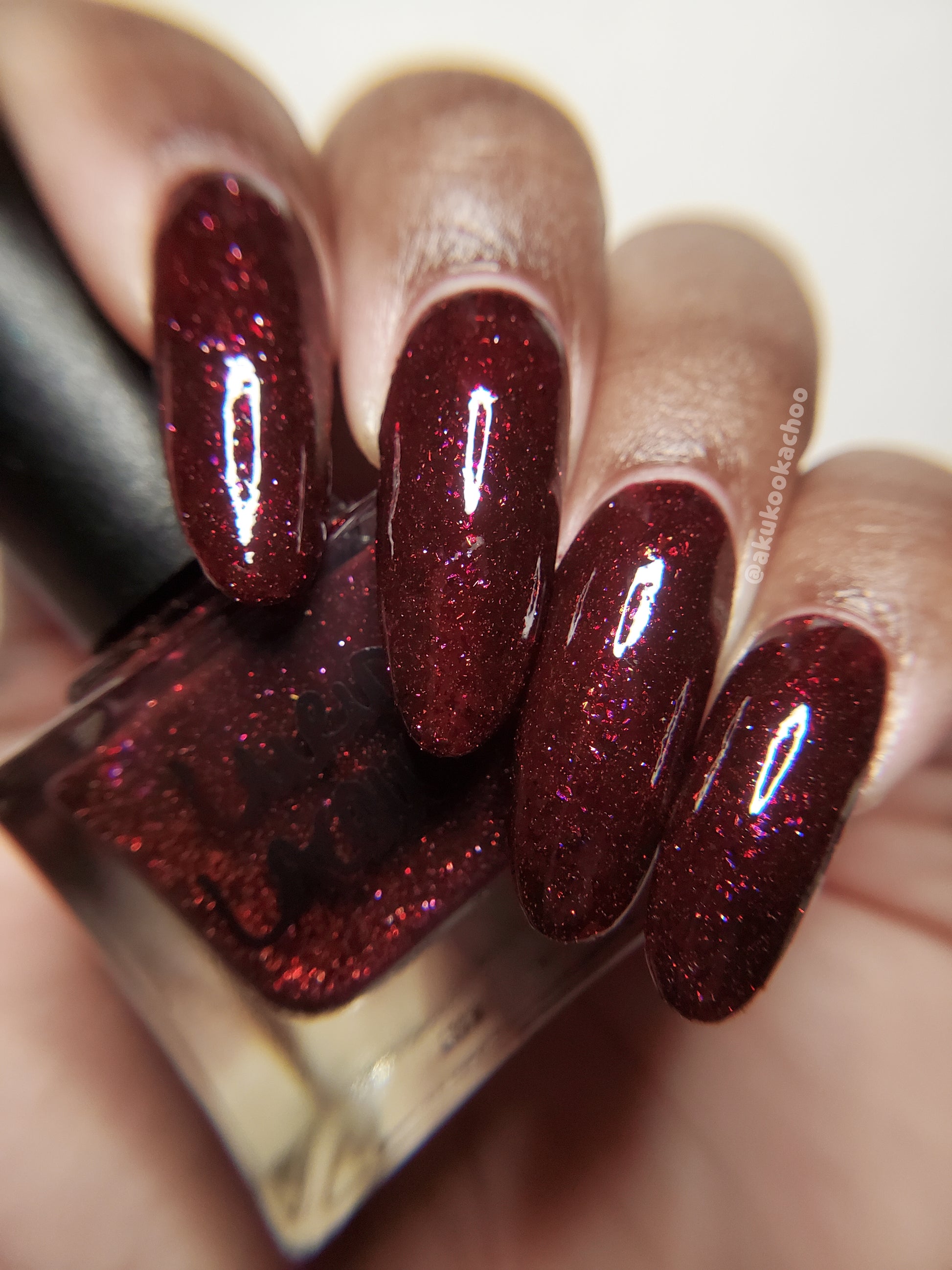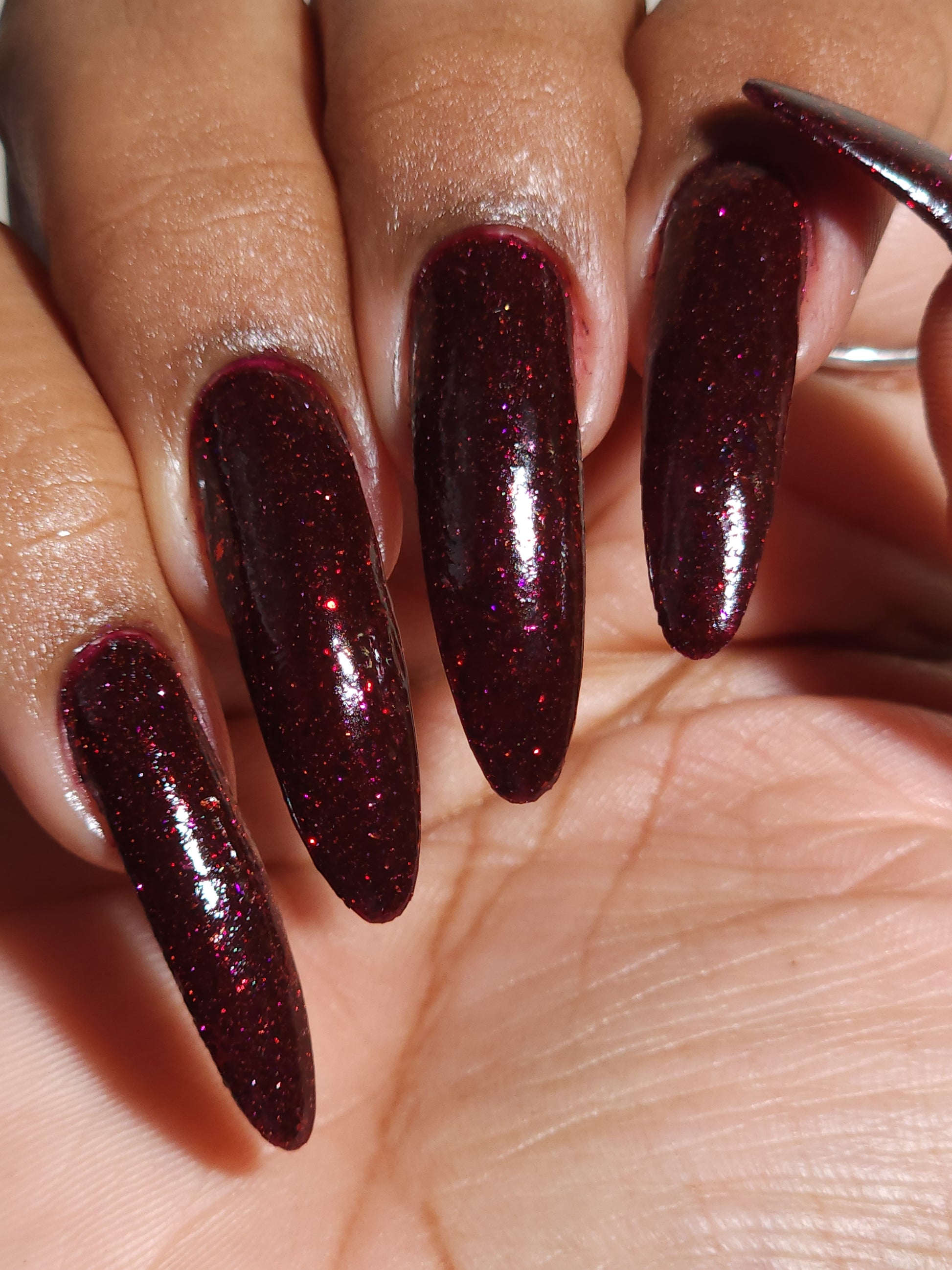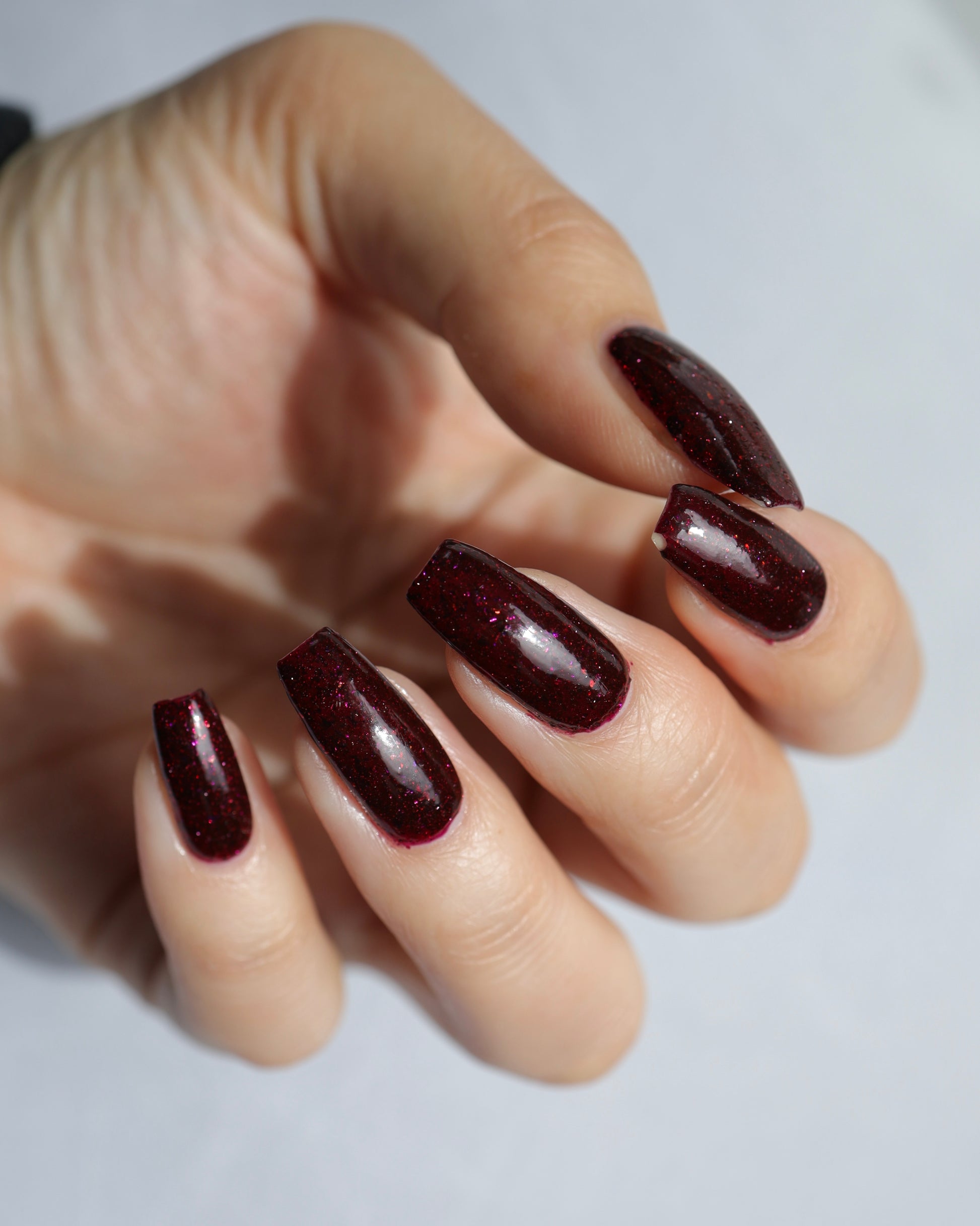 A saturated cool red base with black to red multichrome flakes and red light reflective glitter