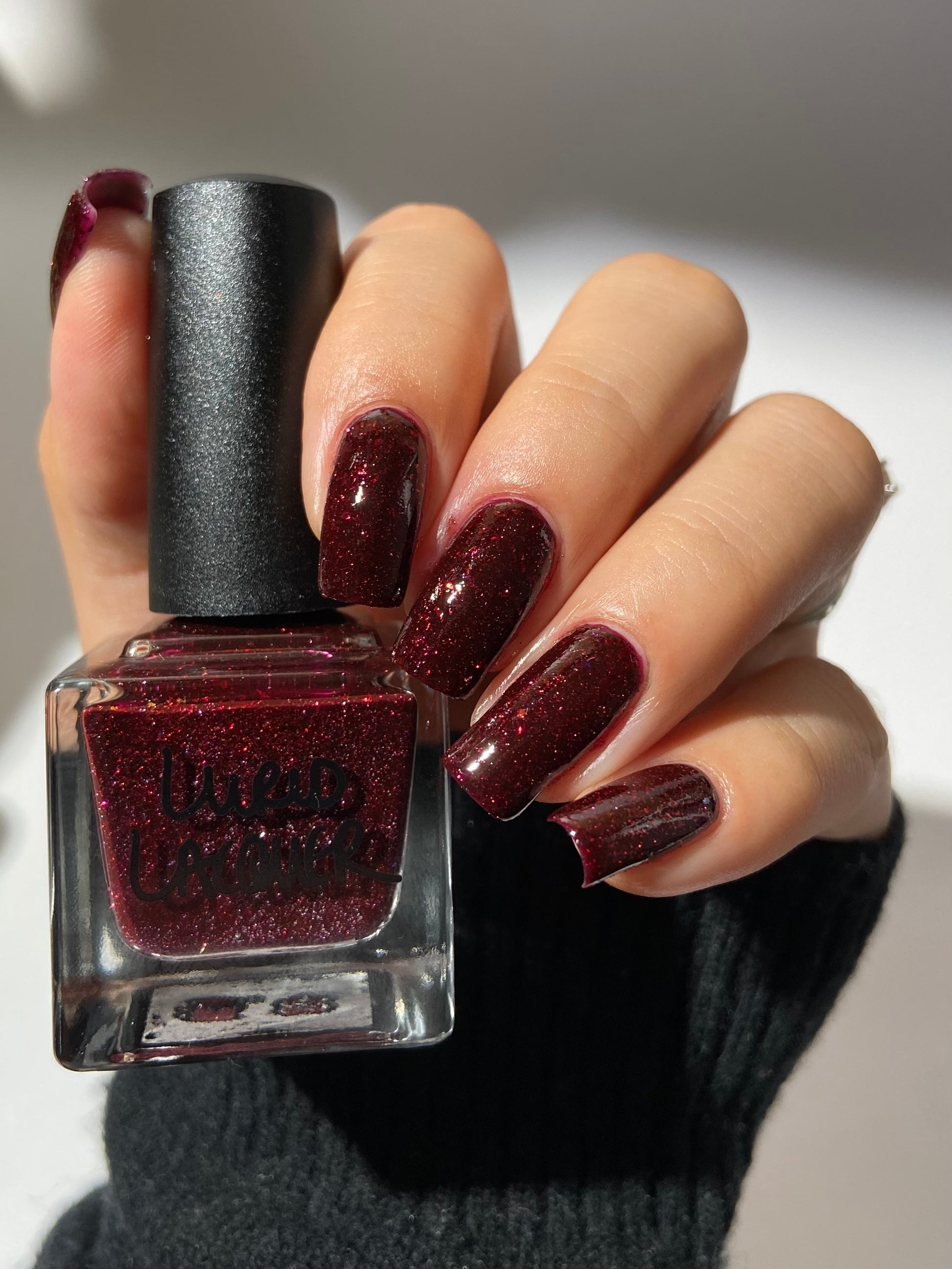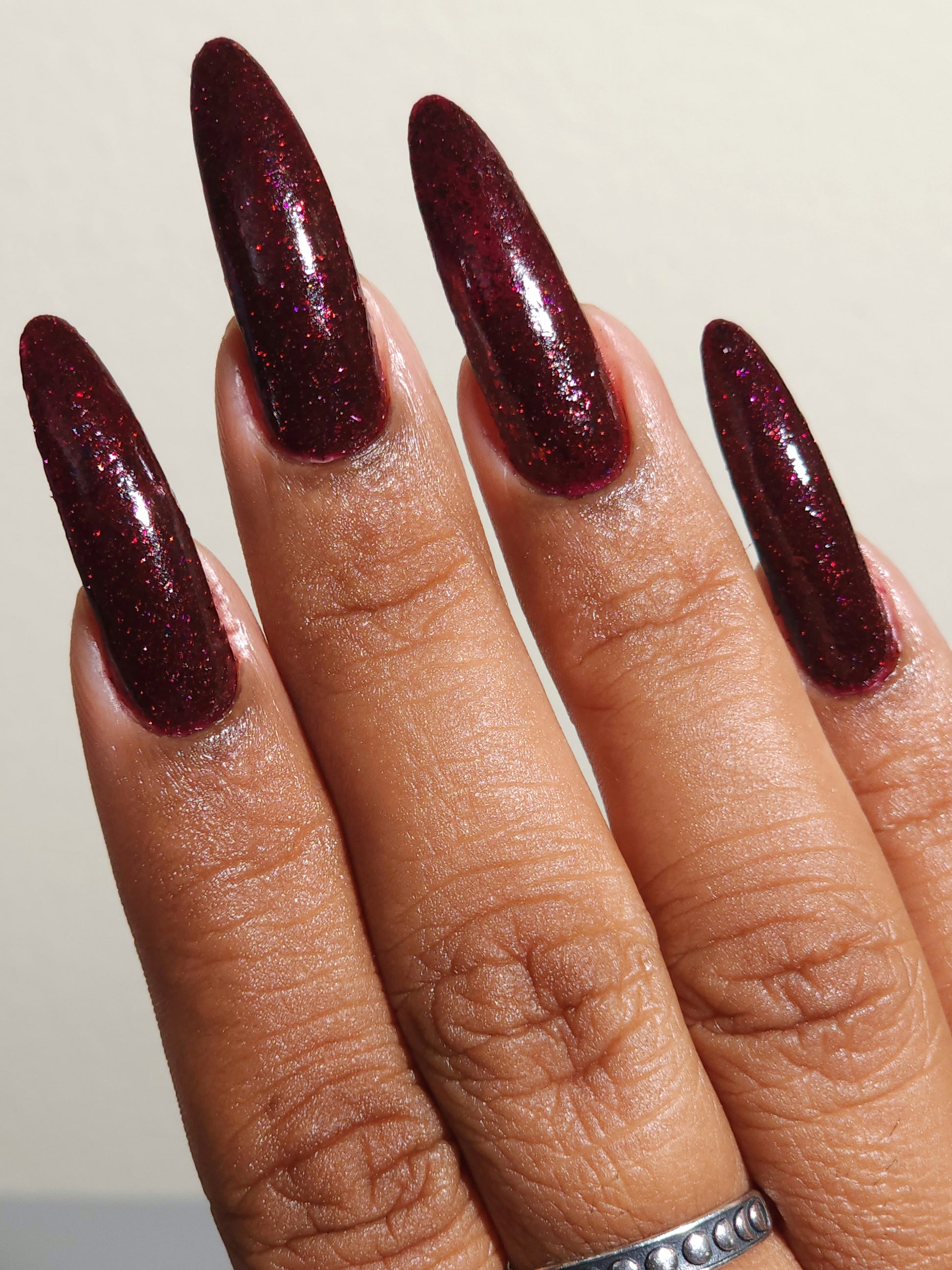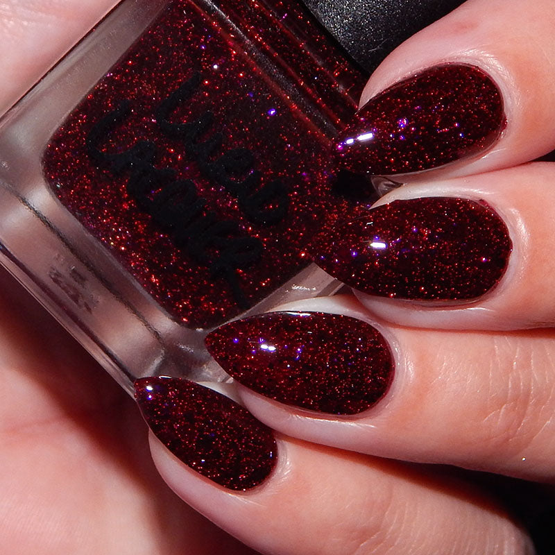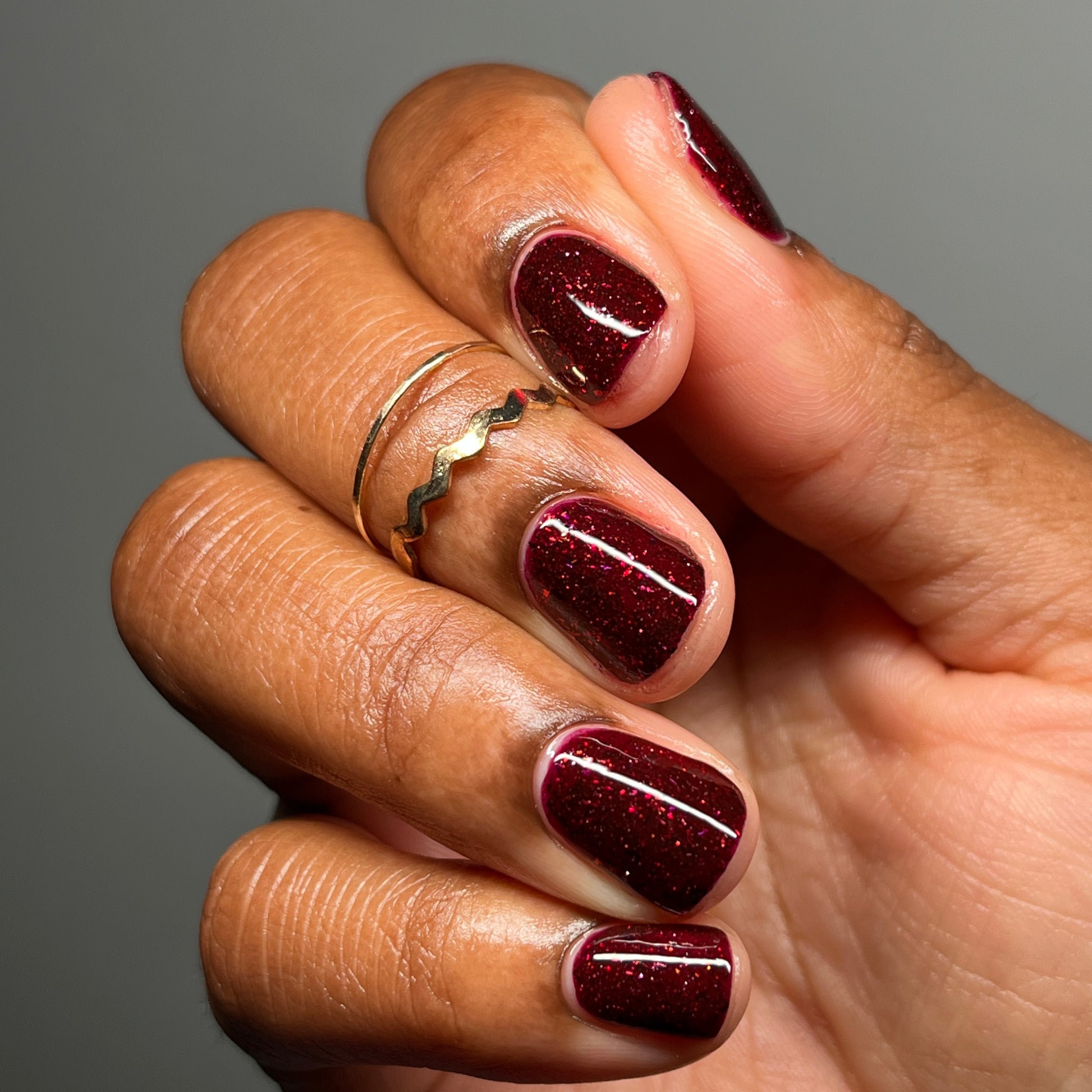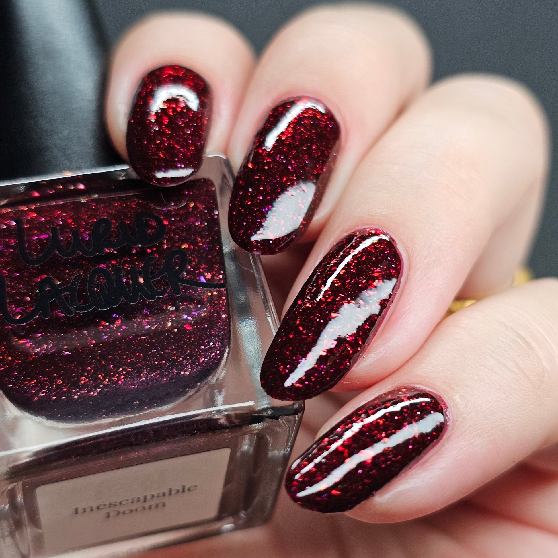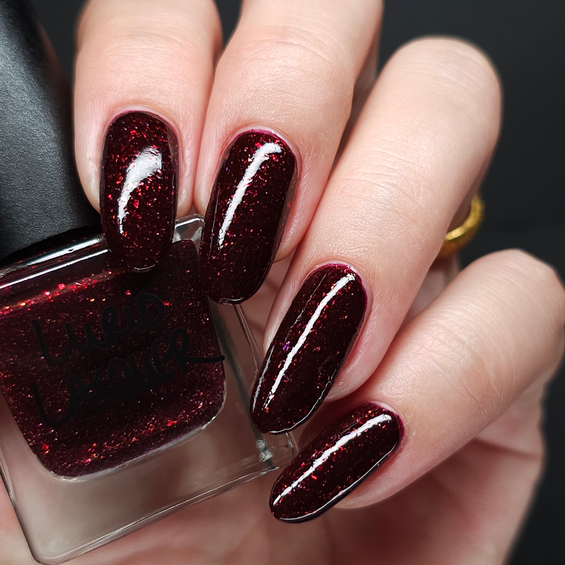 A saturated cool red base with black to red multichrome flakes and red light reflective glitter