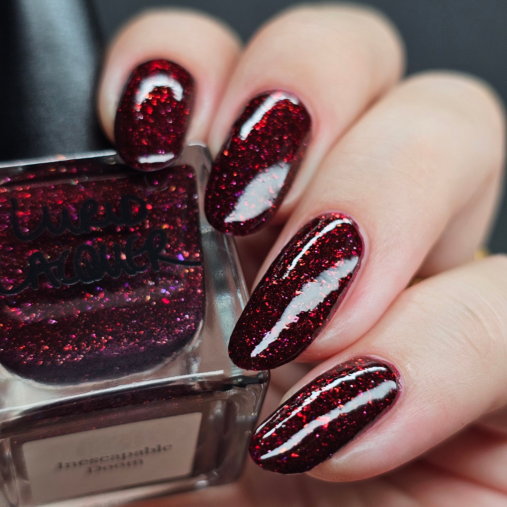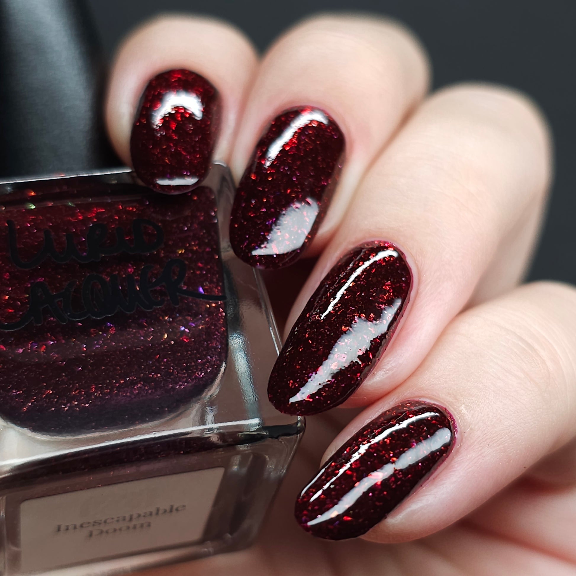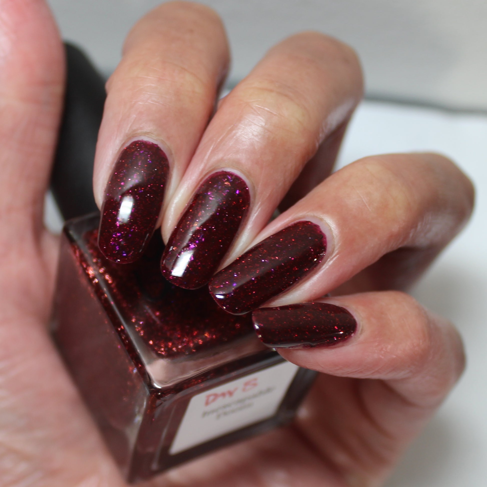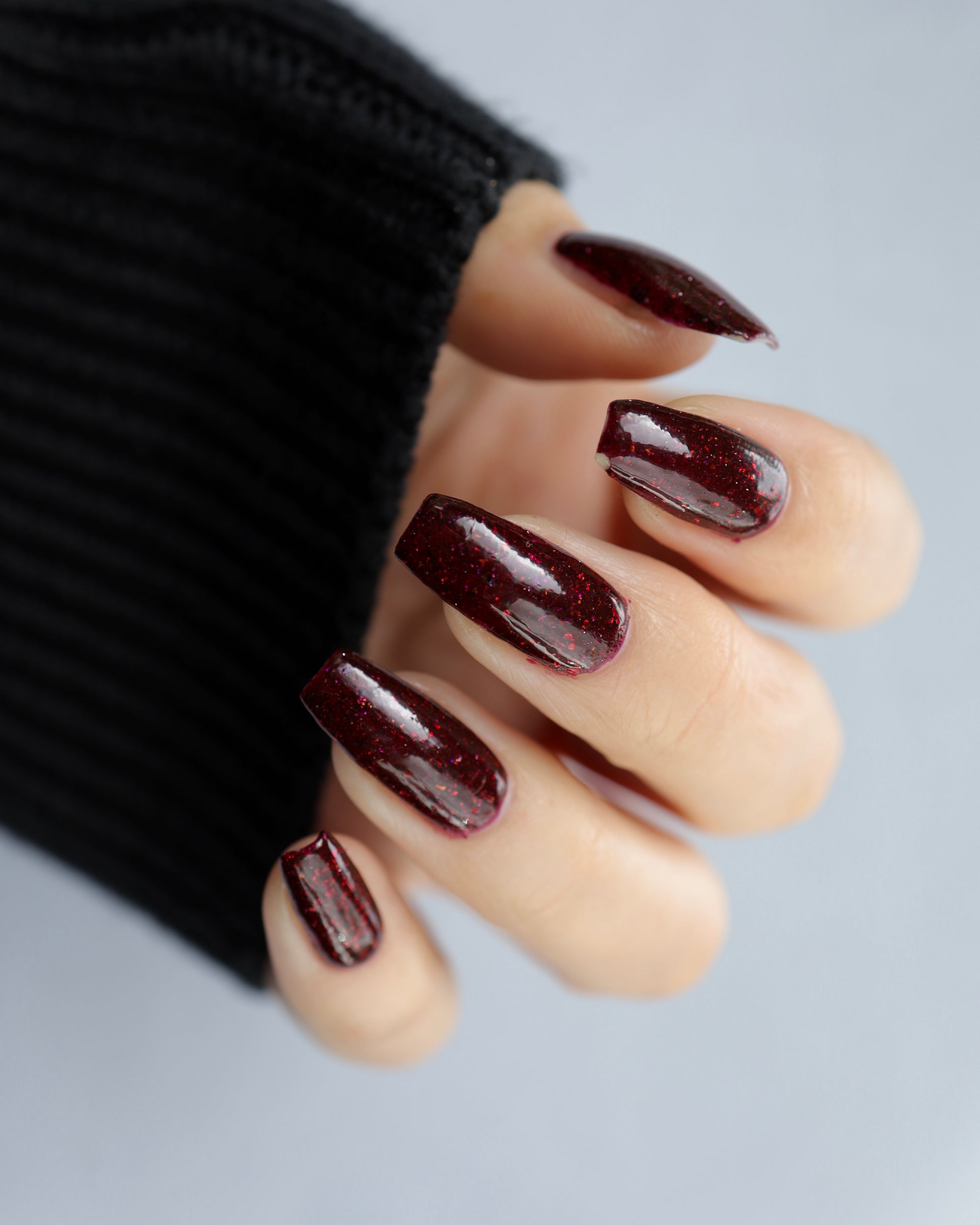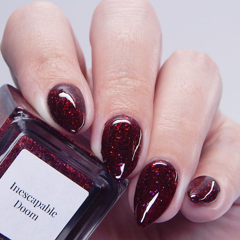 A saturated cool red base with black to red multichrome flakes and red light reflective glitter