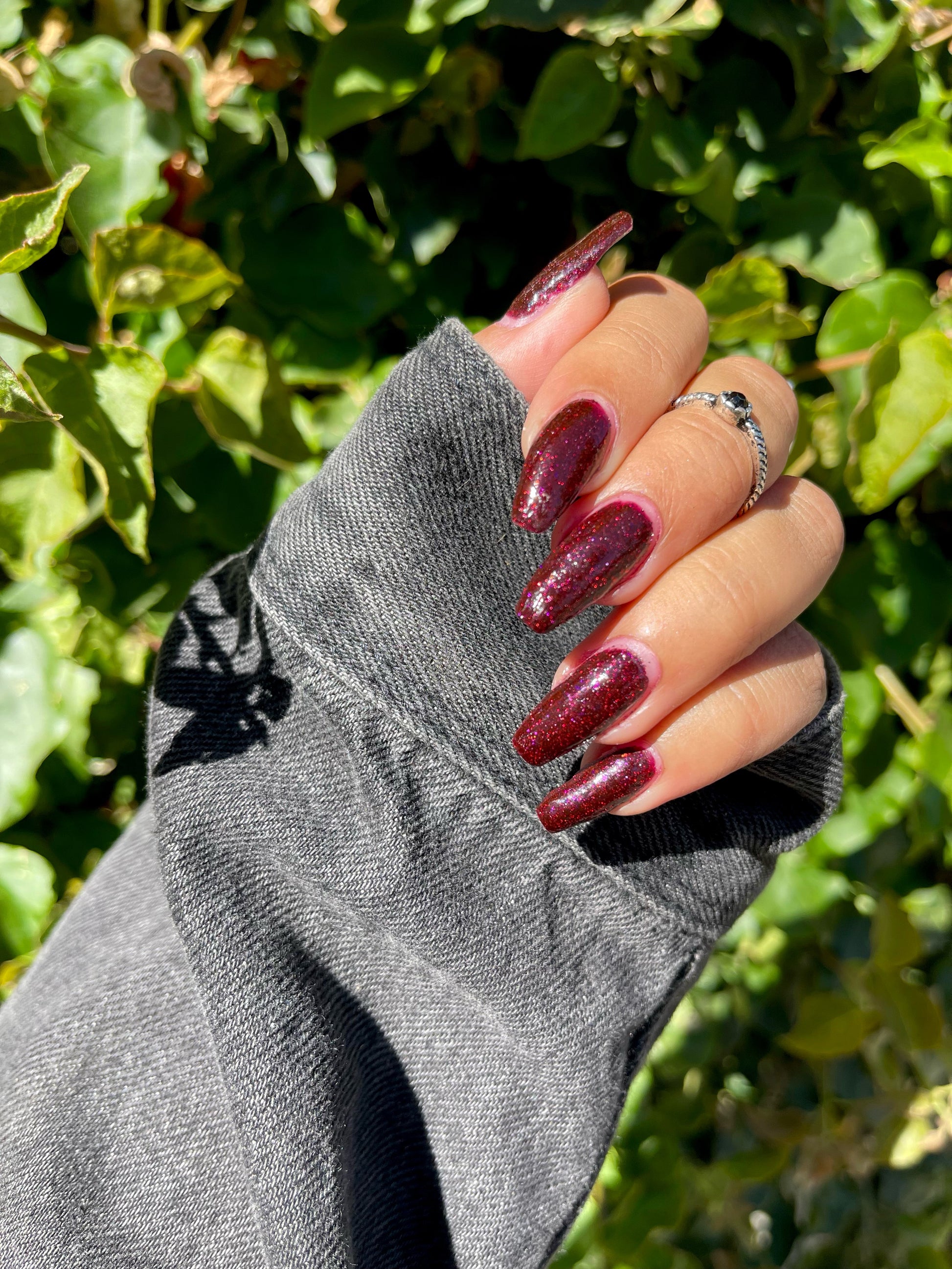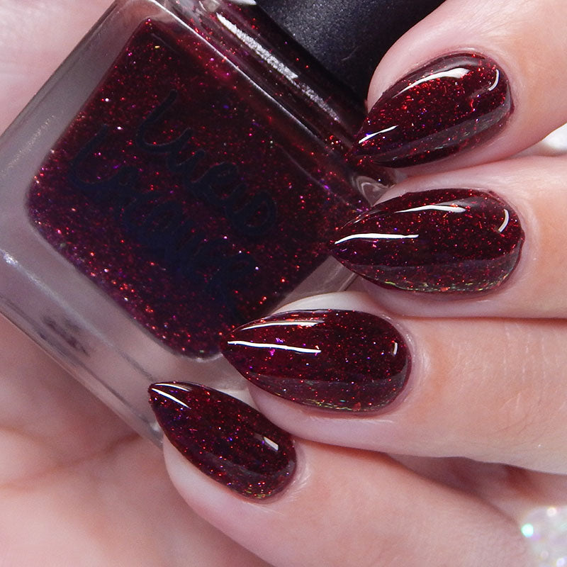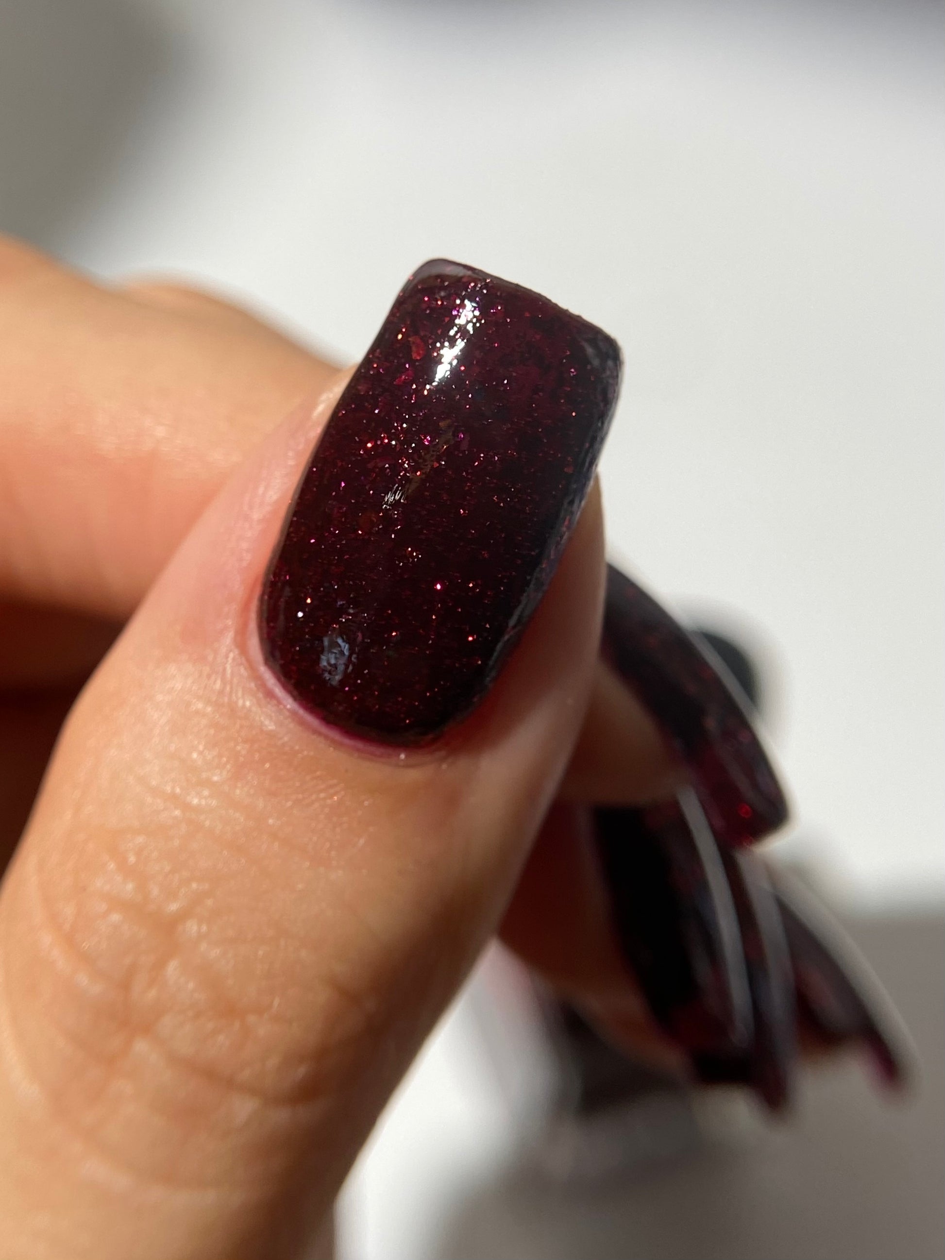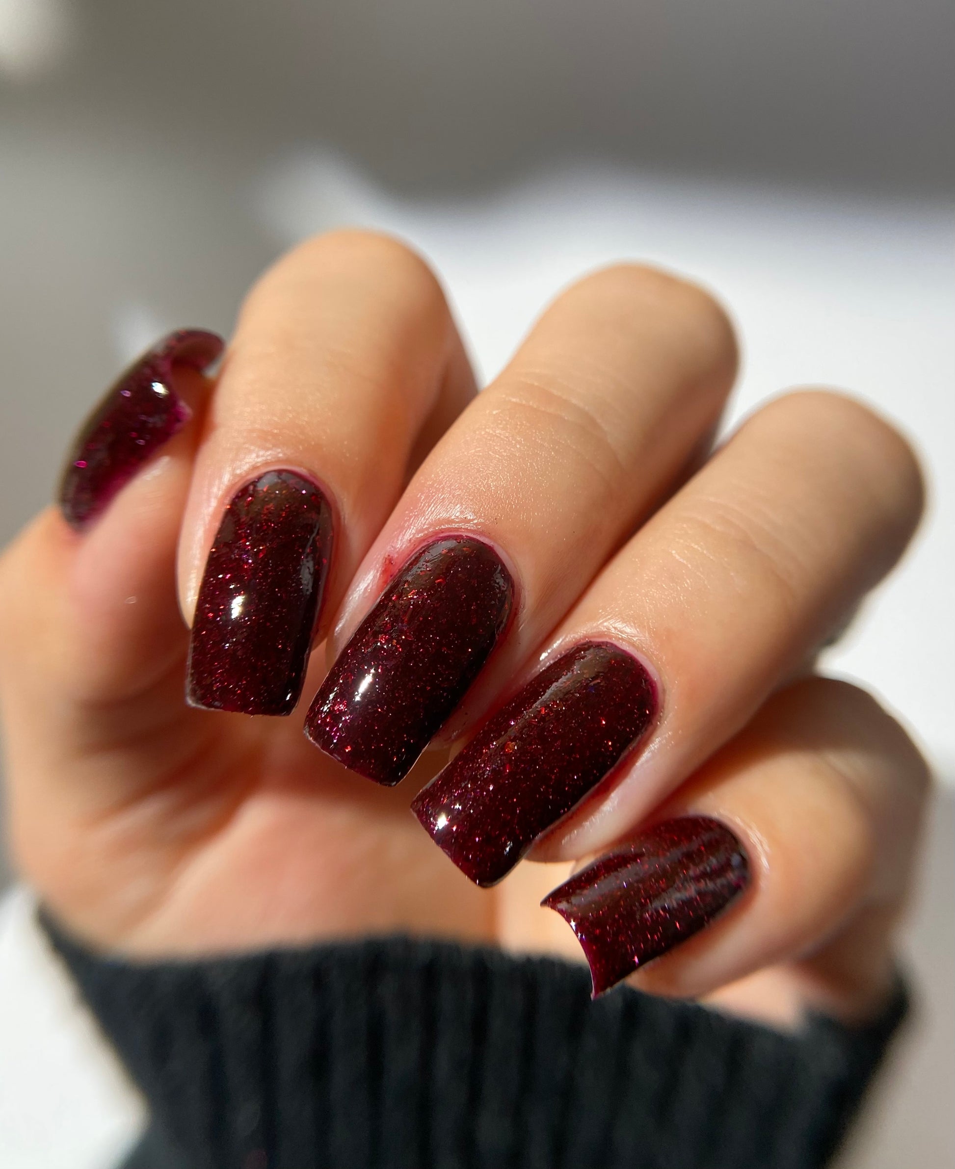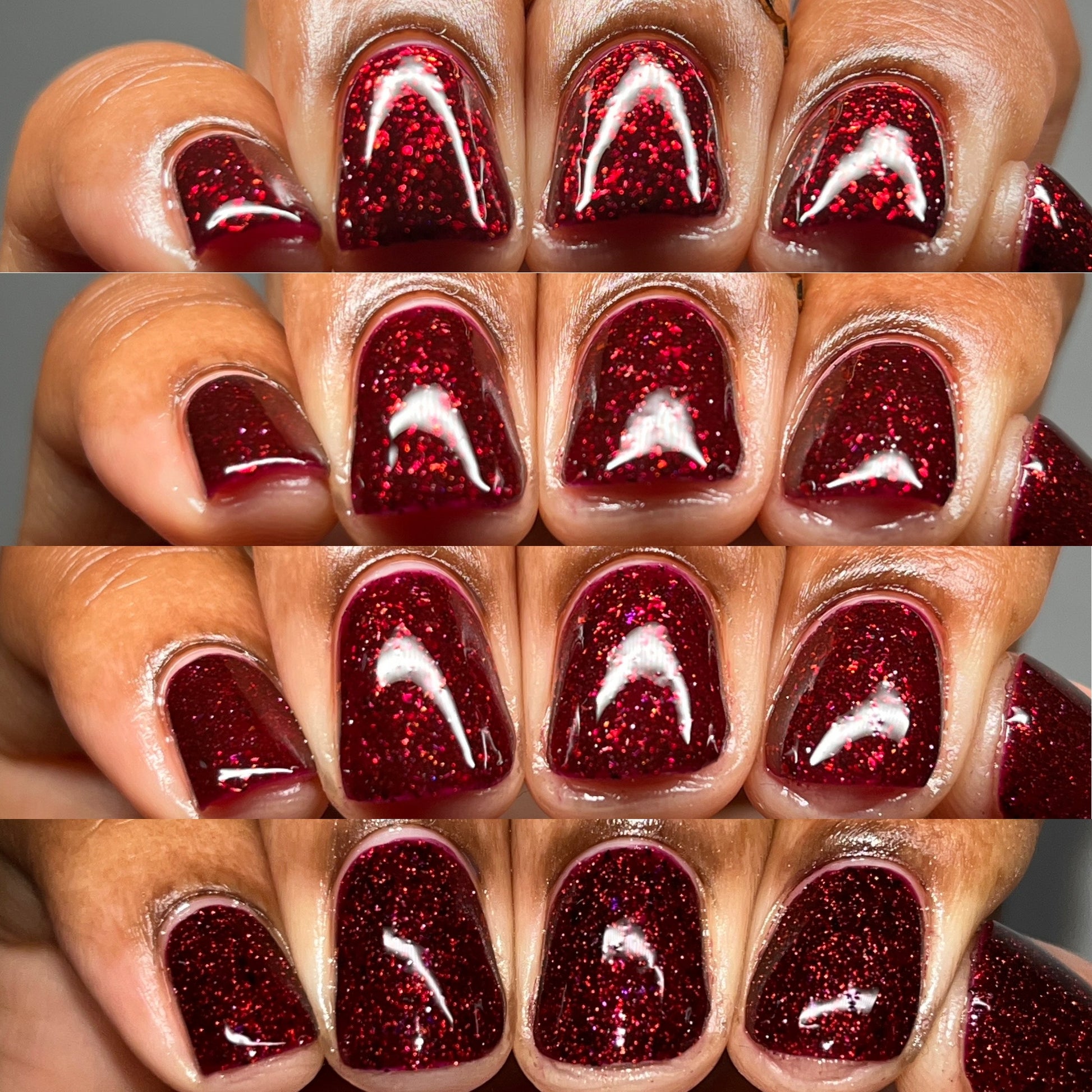 A saturated cool red base with black to red multichrome flakes and red light reflective glitter