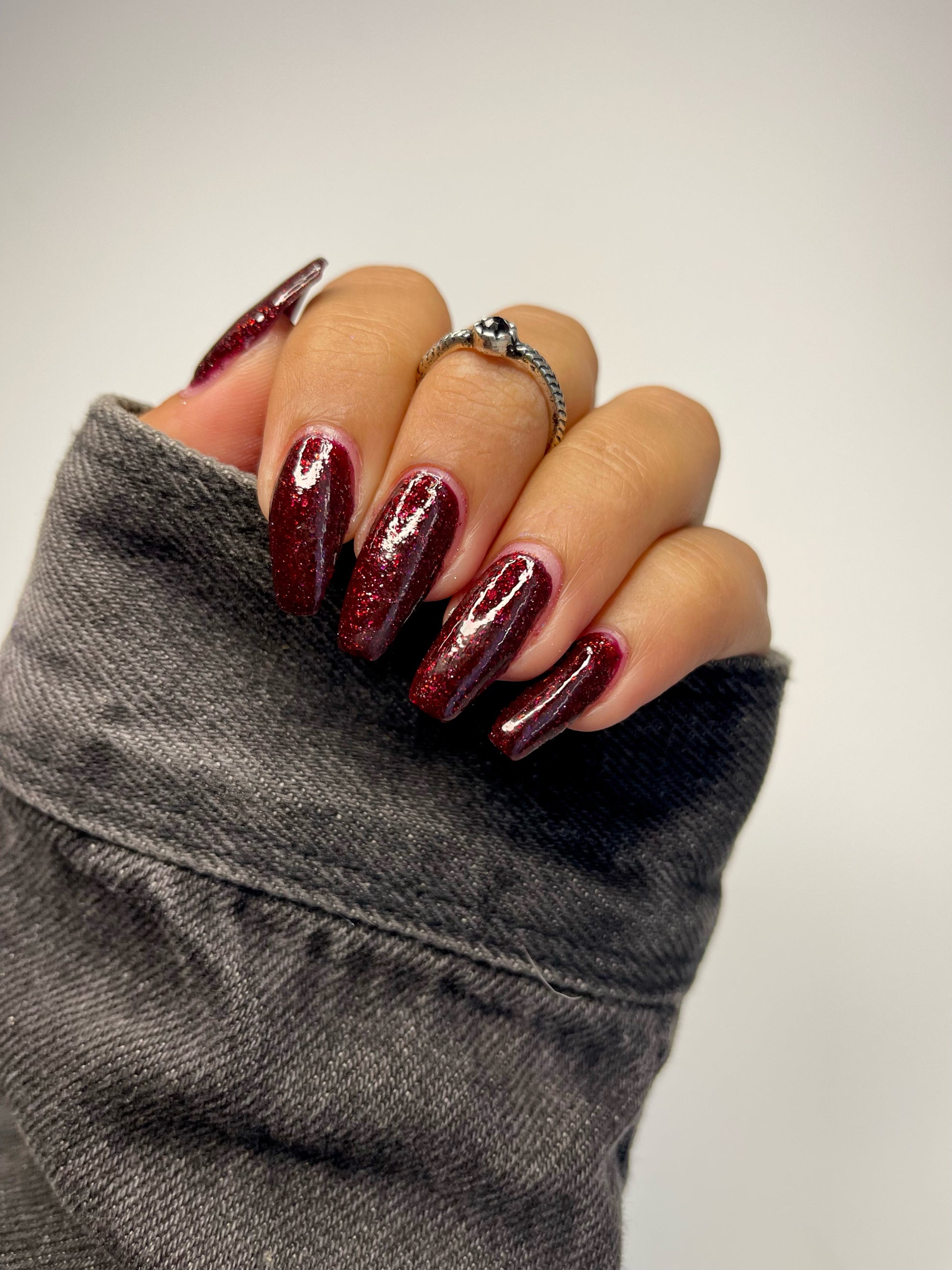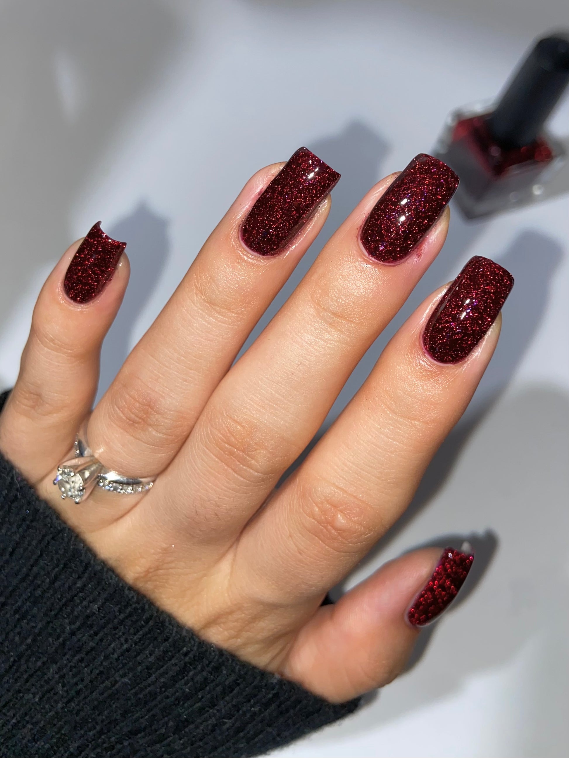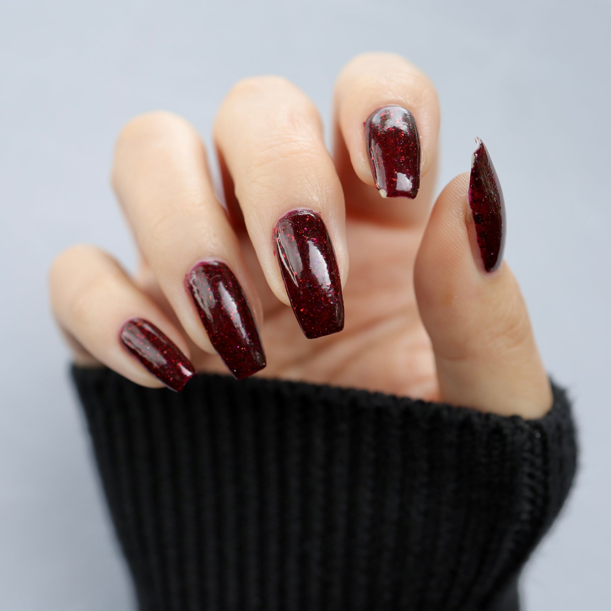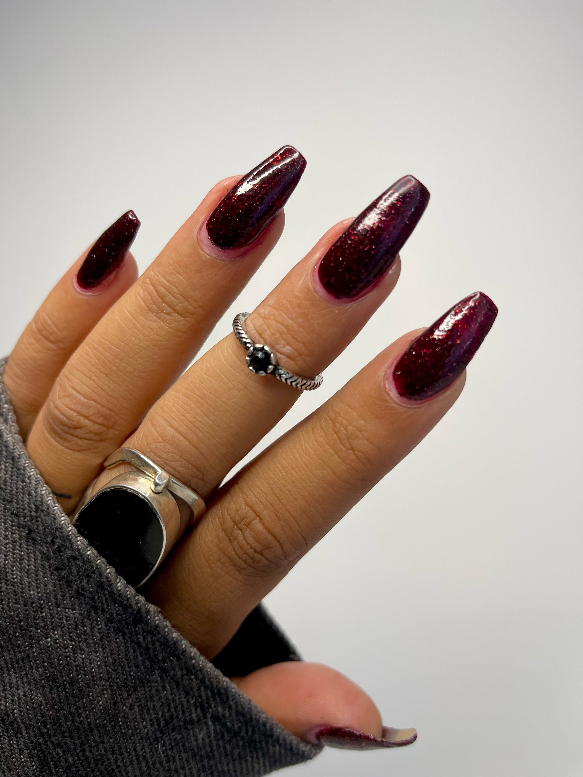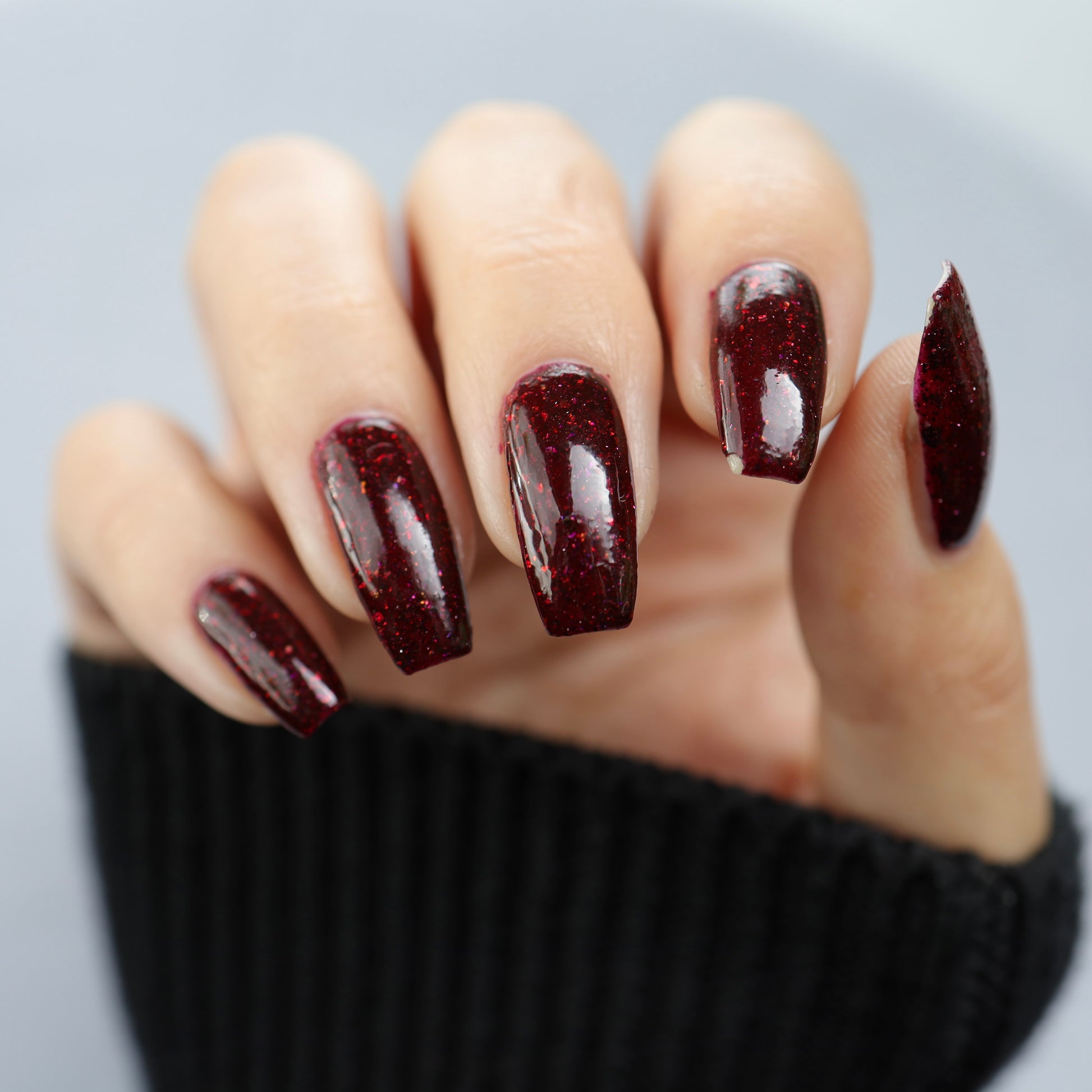 A saturated cool red base with black to red multichrome flakes and red light reflective glitter