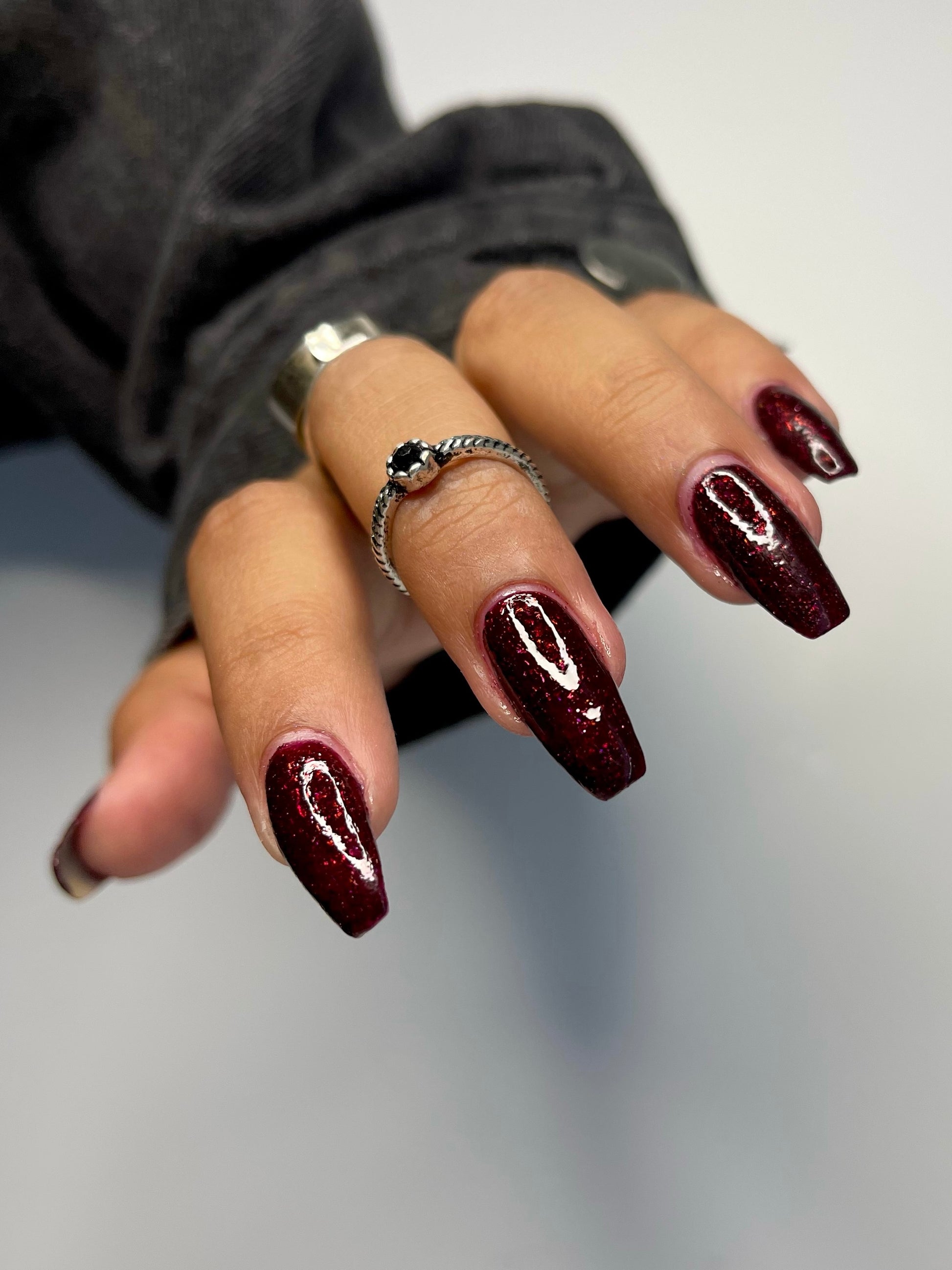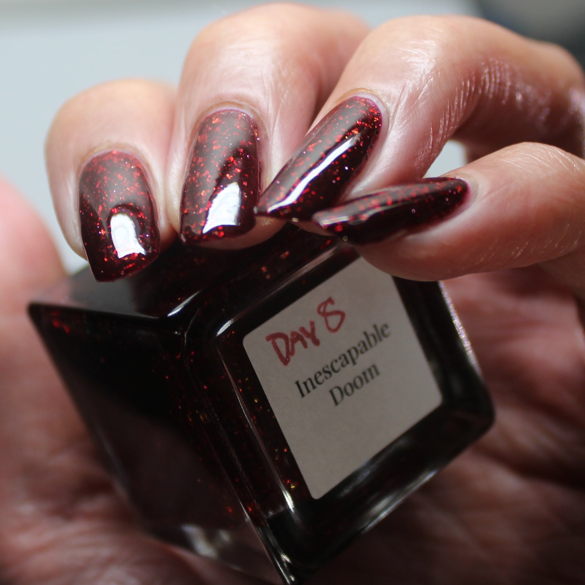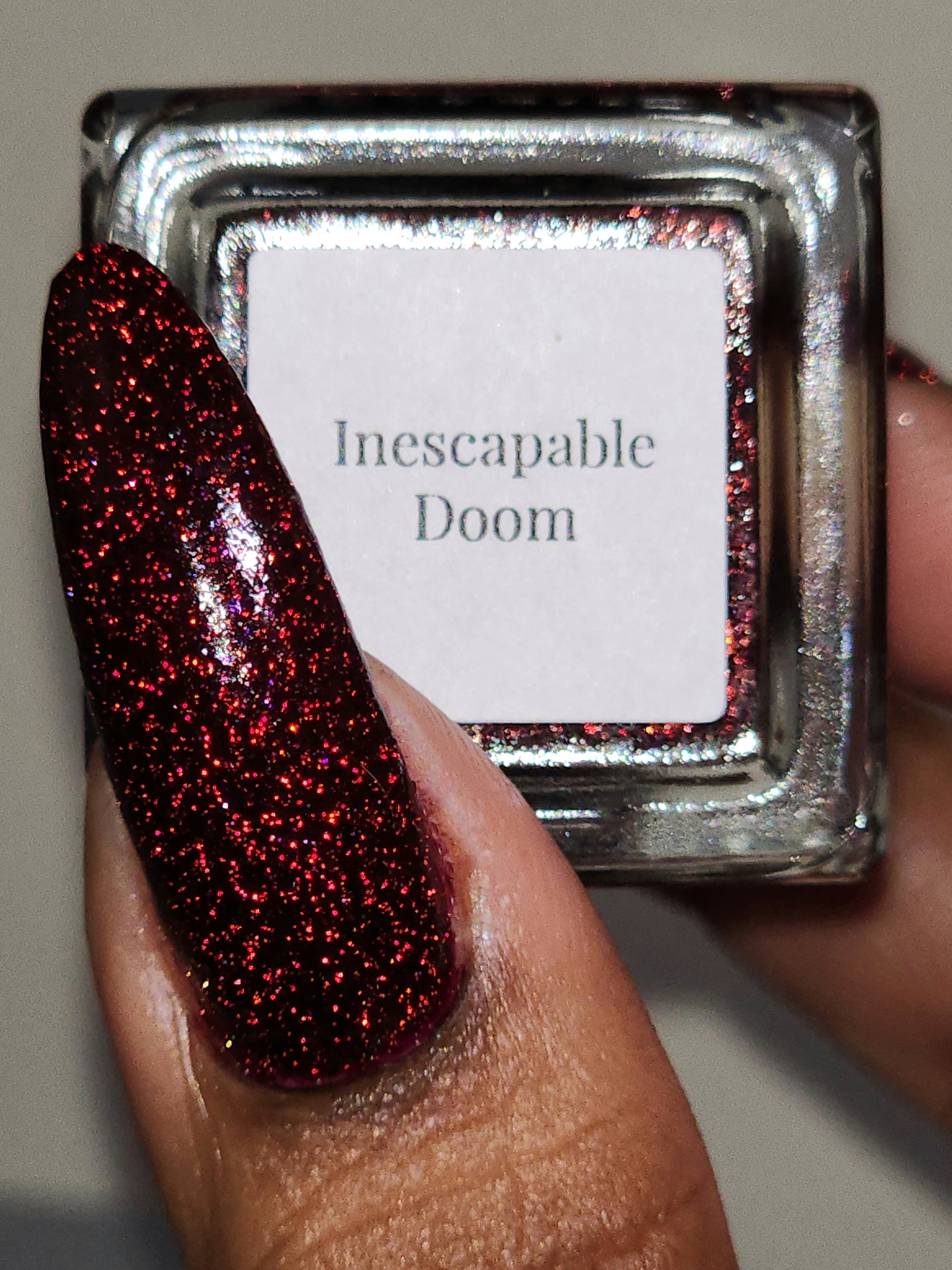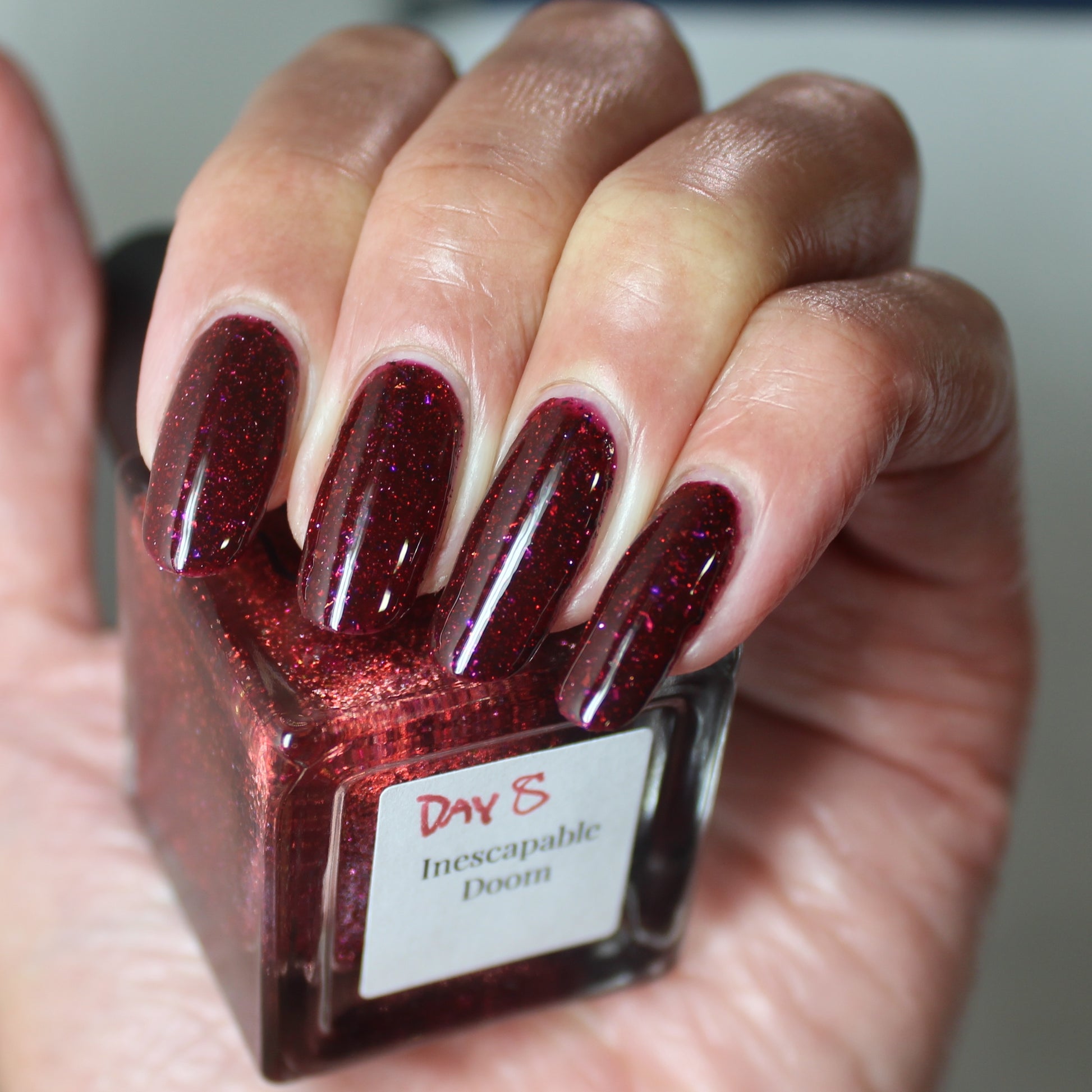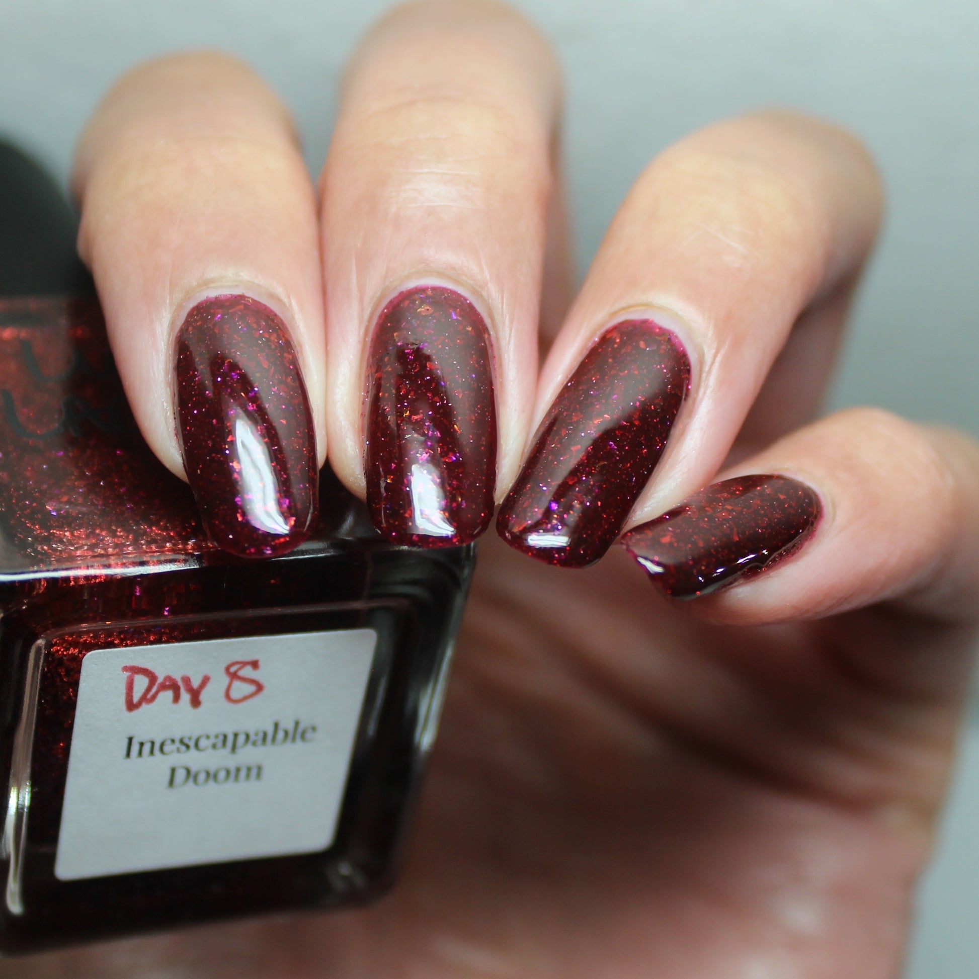 A saturated cool red base with black to red multichrome flakes and red light reflective glitter
