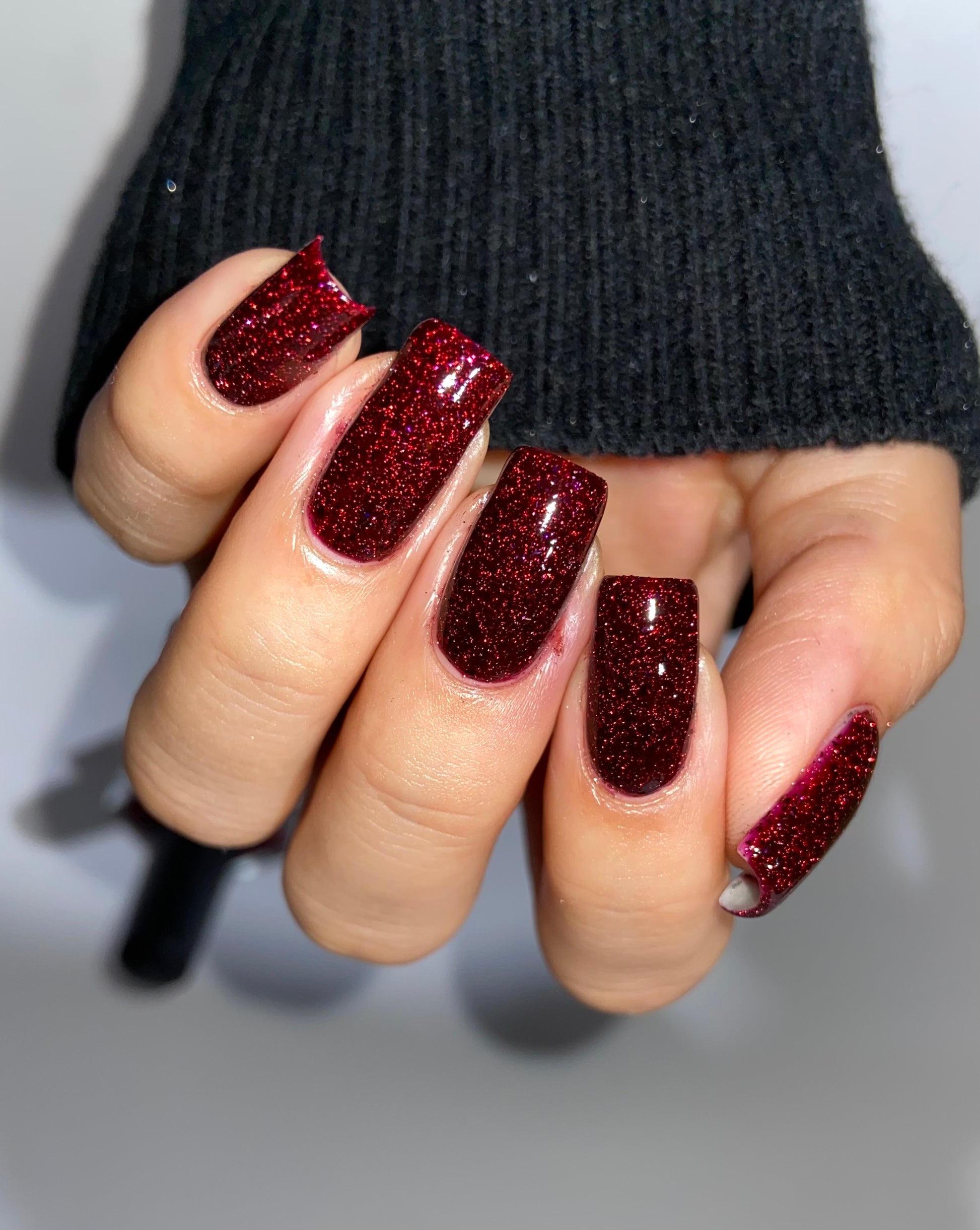 Please note: Reflective glitter polishes are textured and dry down with a gritty, sandpaper feeling. To make them look smooth and glossy, I recommend applying 2-3 coats of the polish, then applying one coat of a glitter smoother, followed by one coat of top coat.