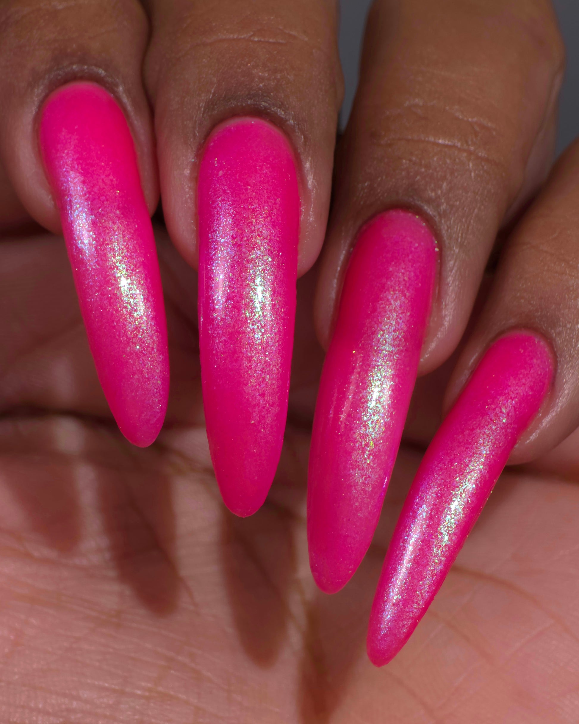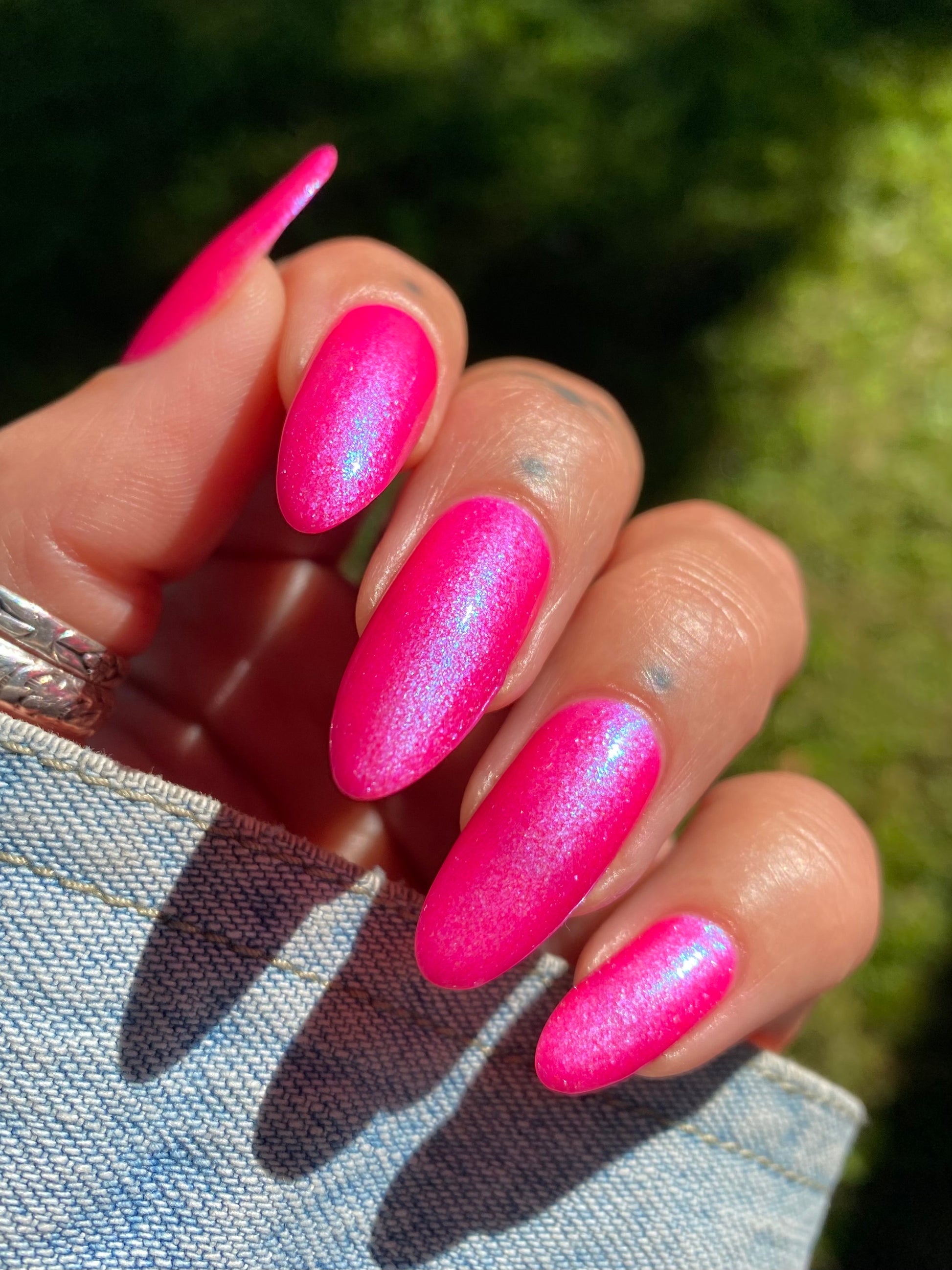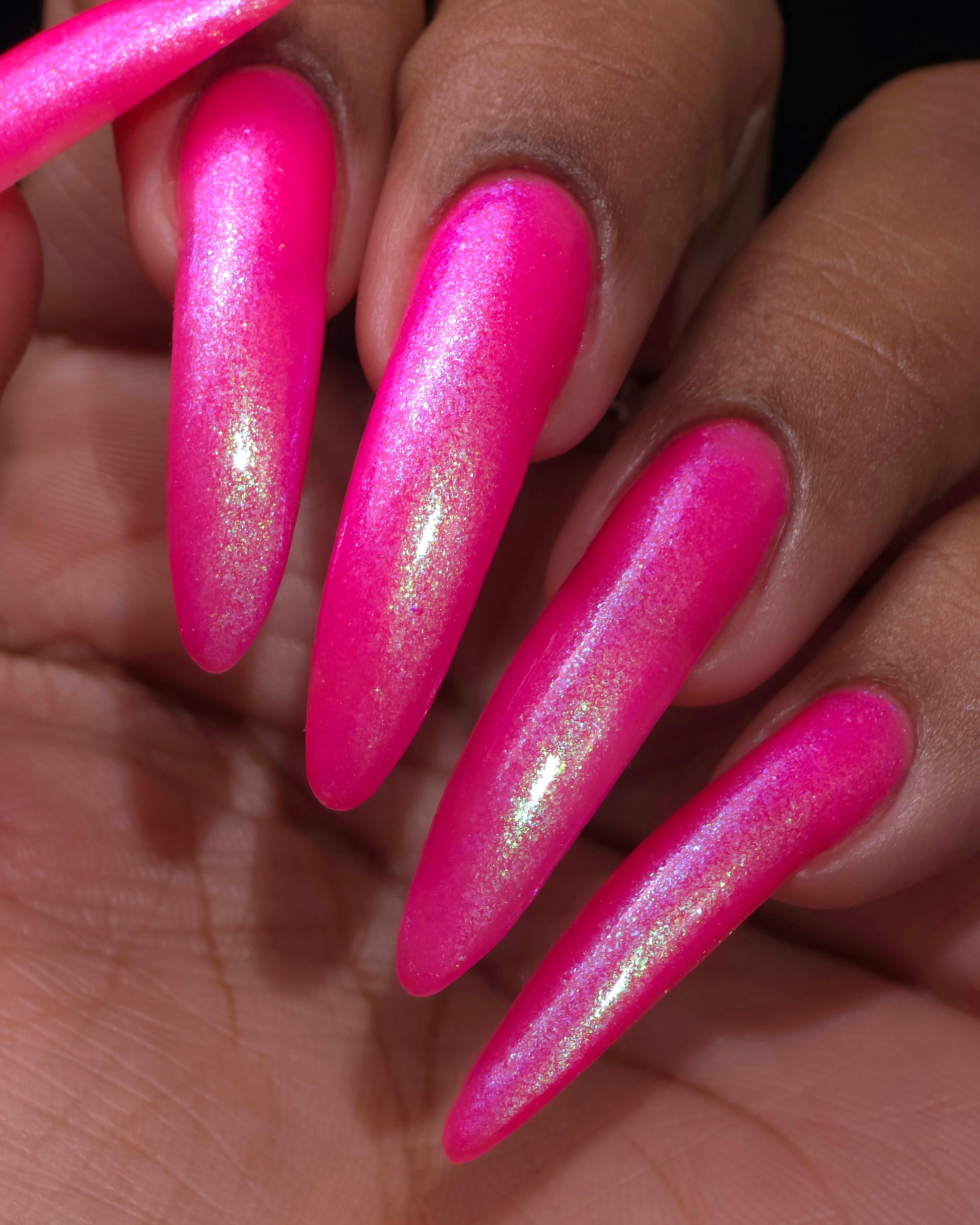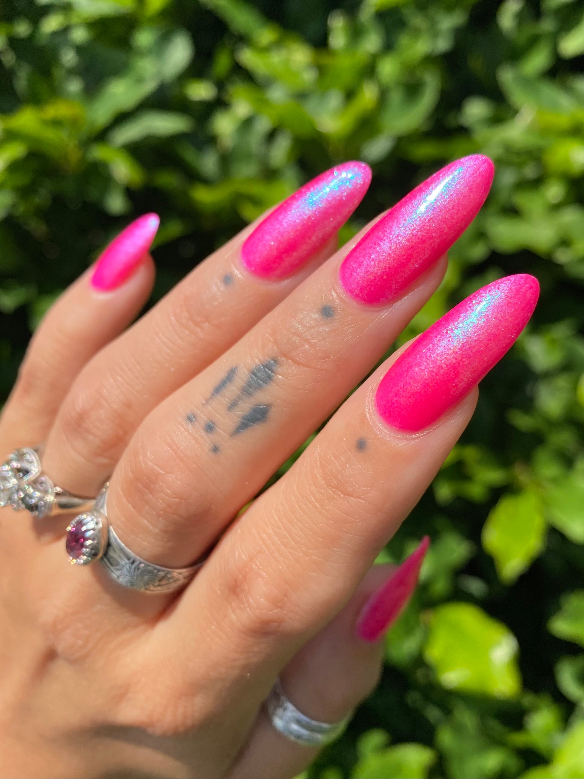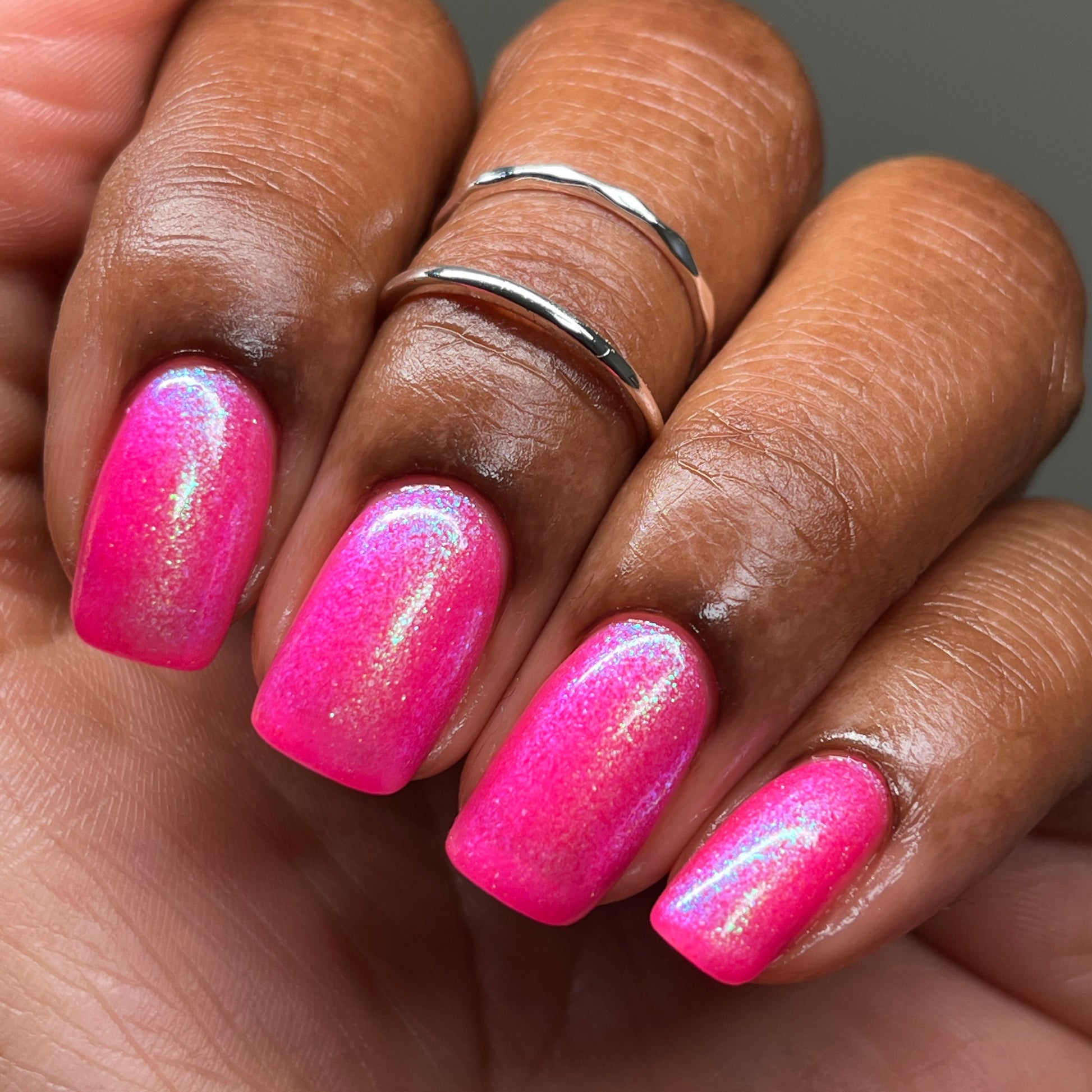 A neon magenta base with large particle aurora shimmer that shifts from green to blue