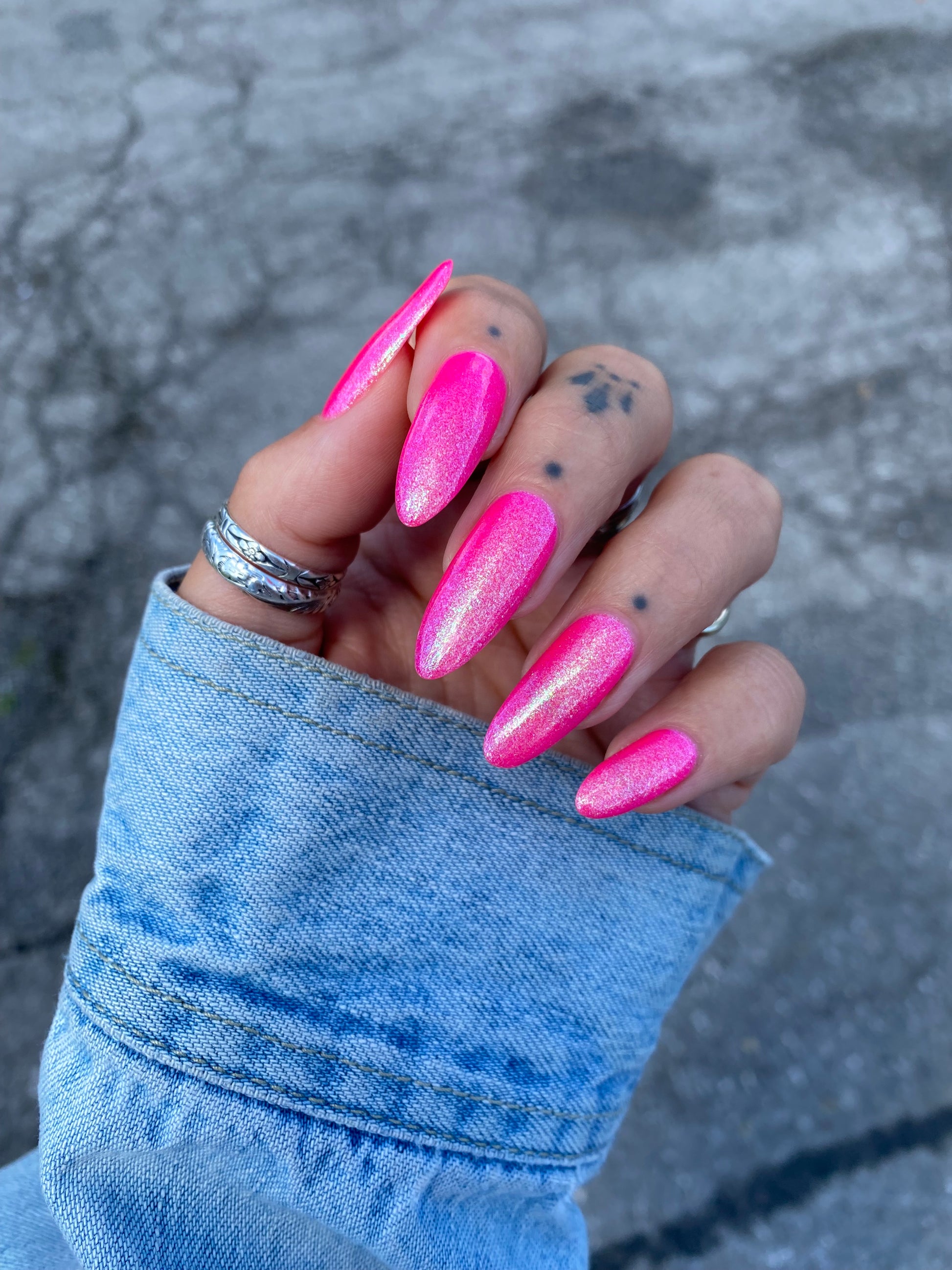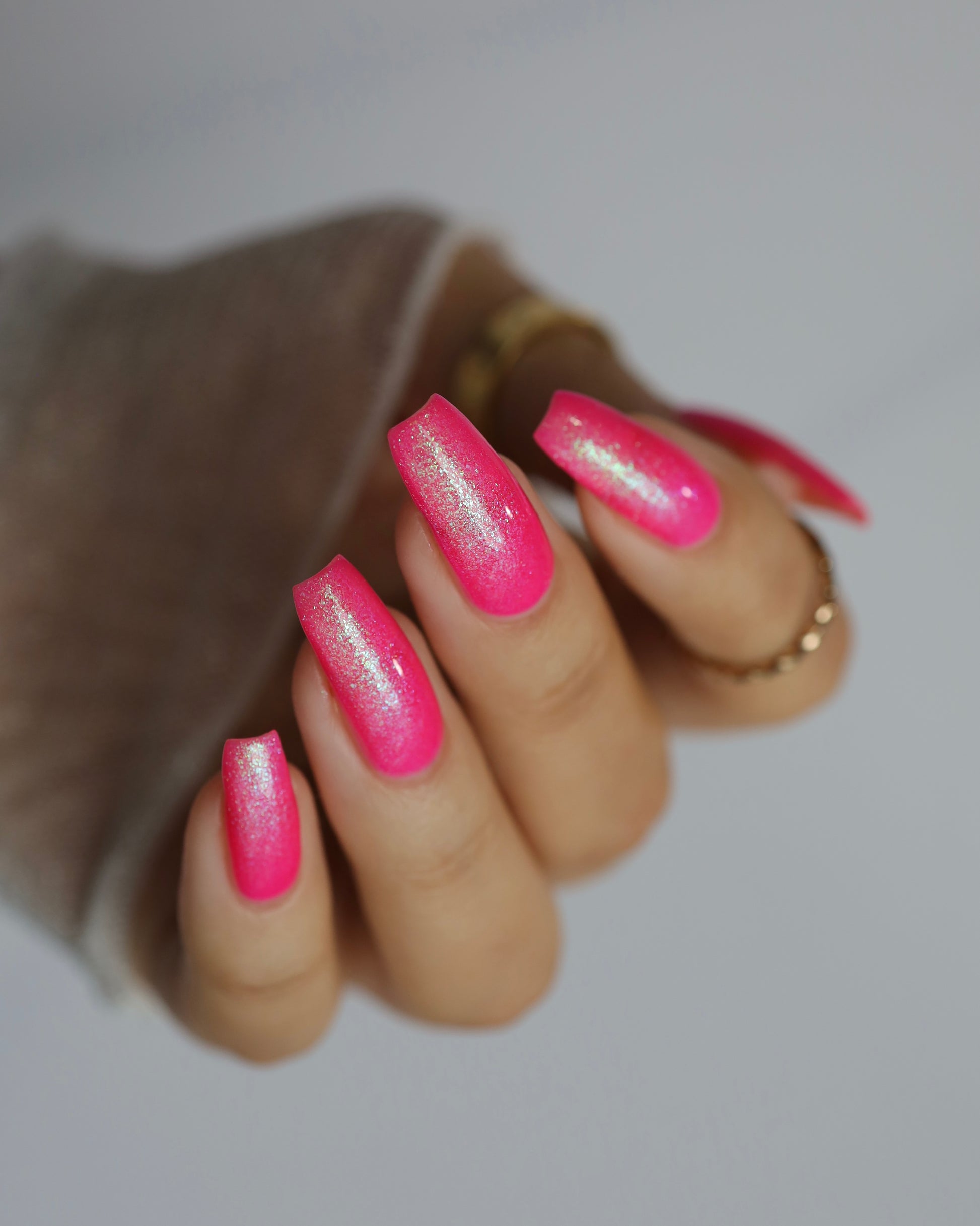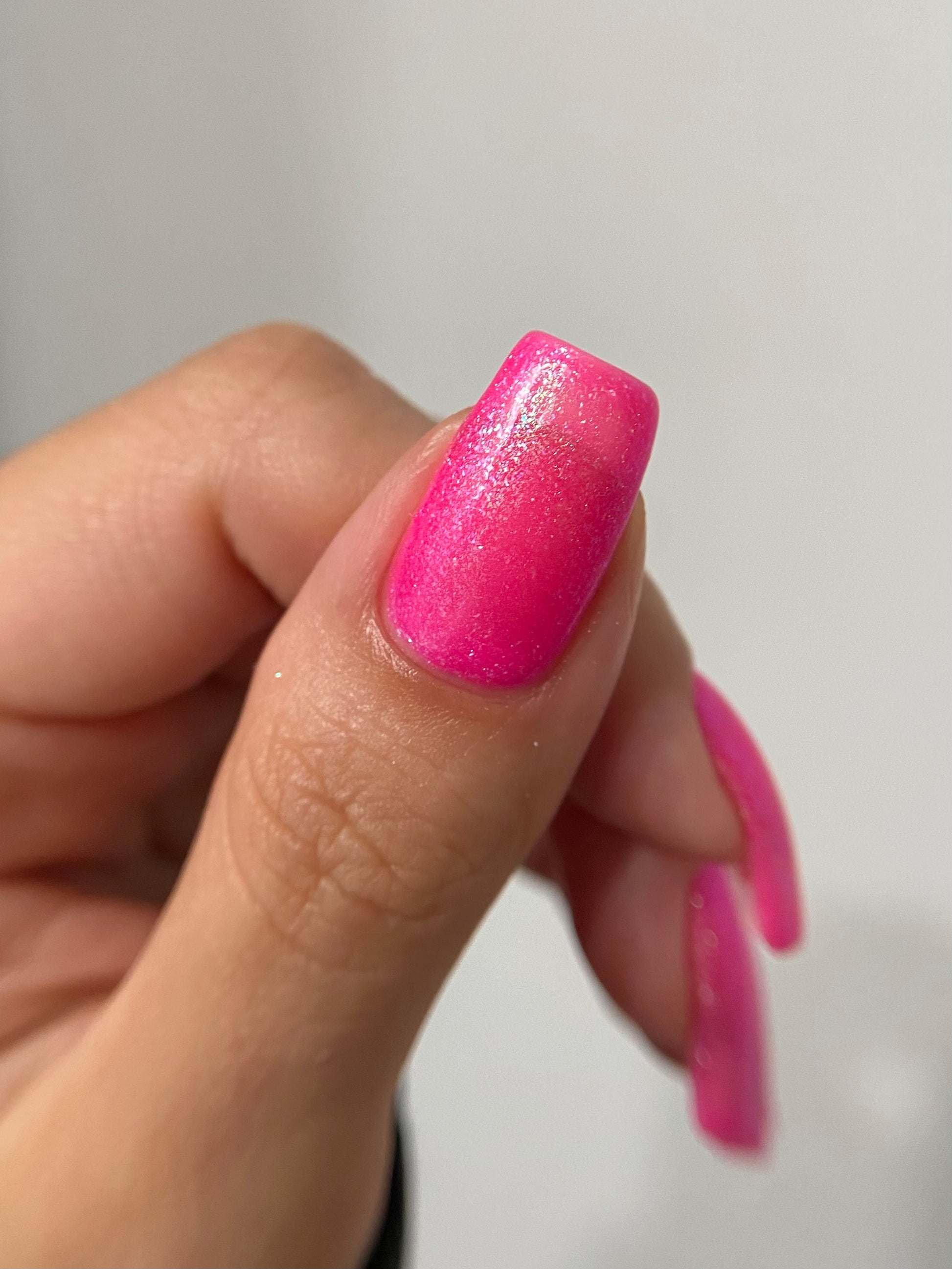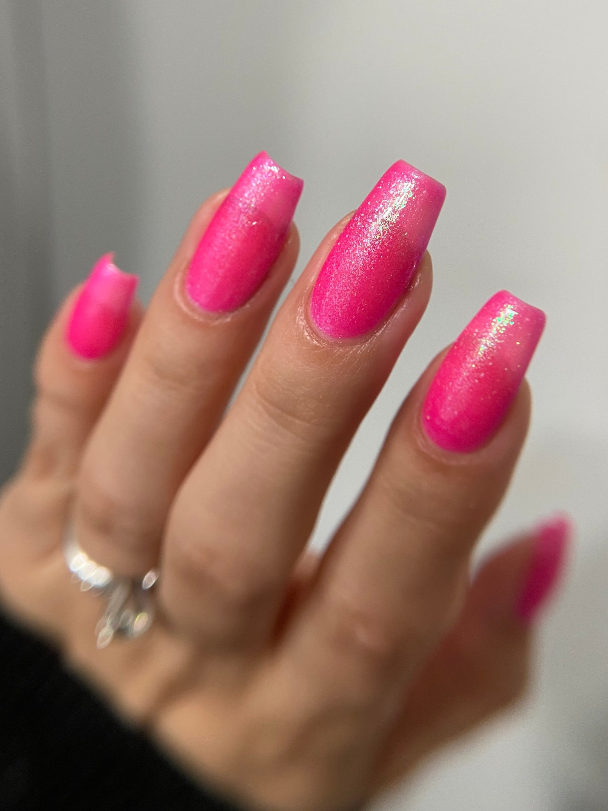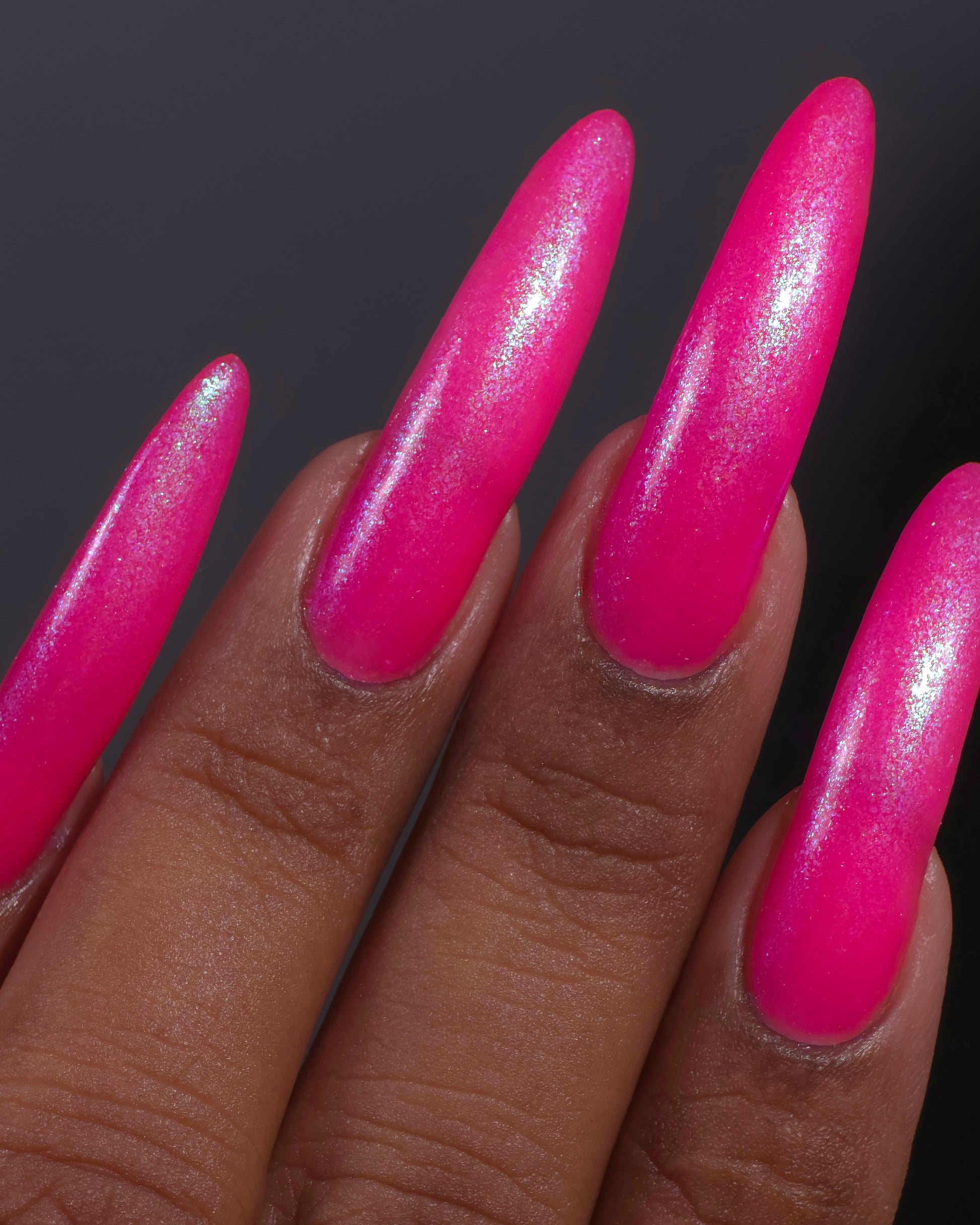 A neon magenta base with large particle aurora shimmer that shifts from green to blue