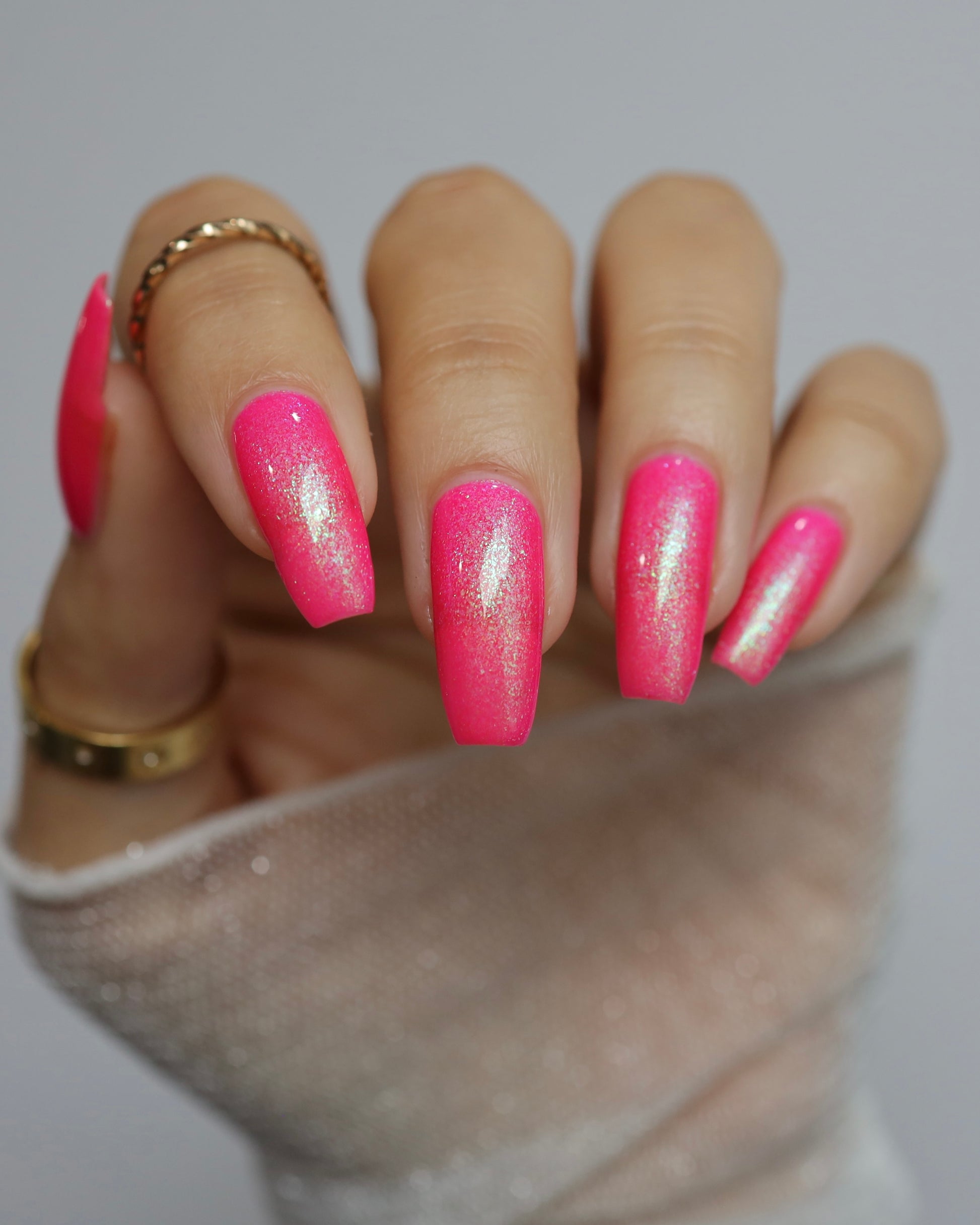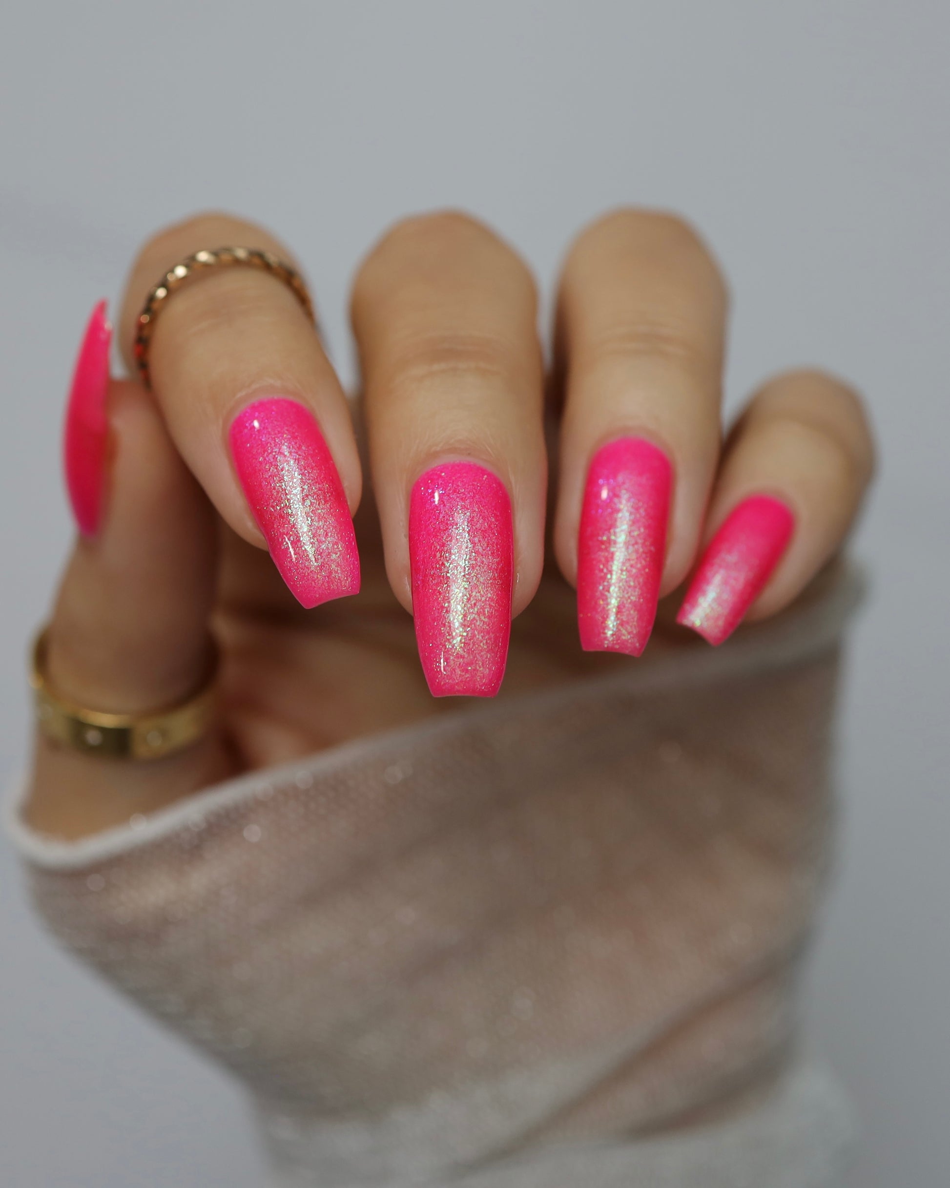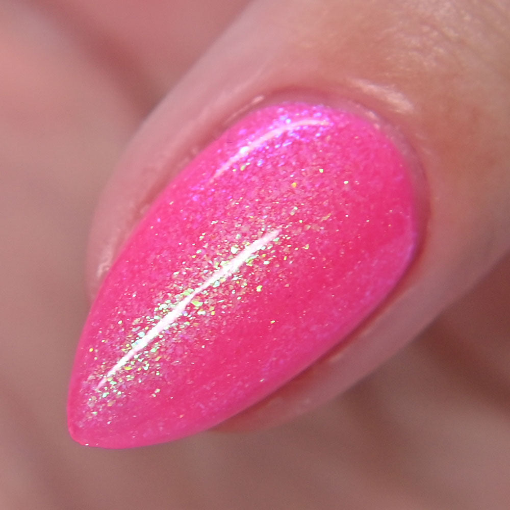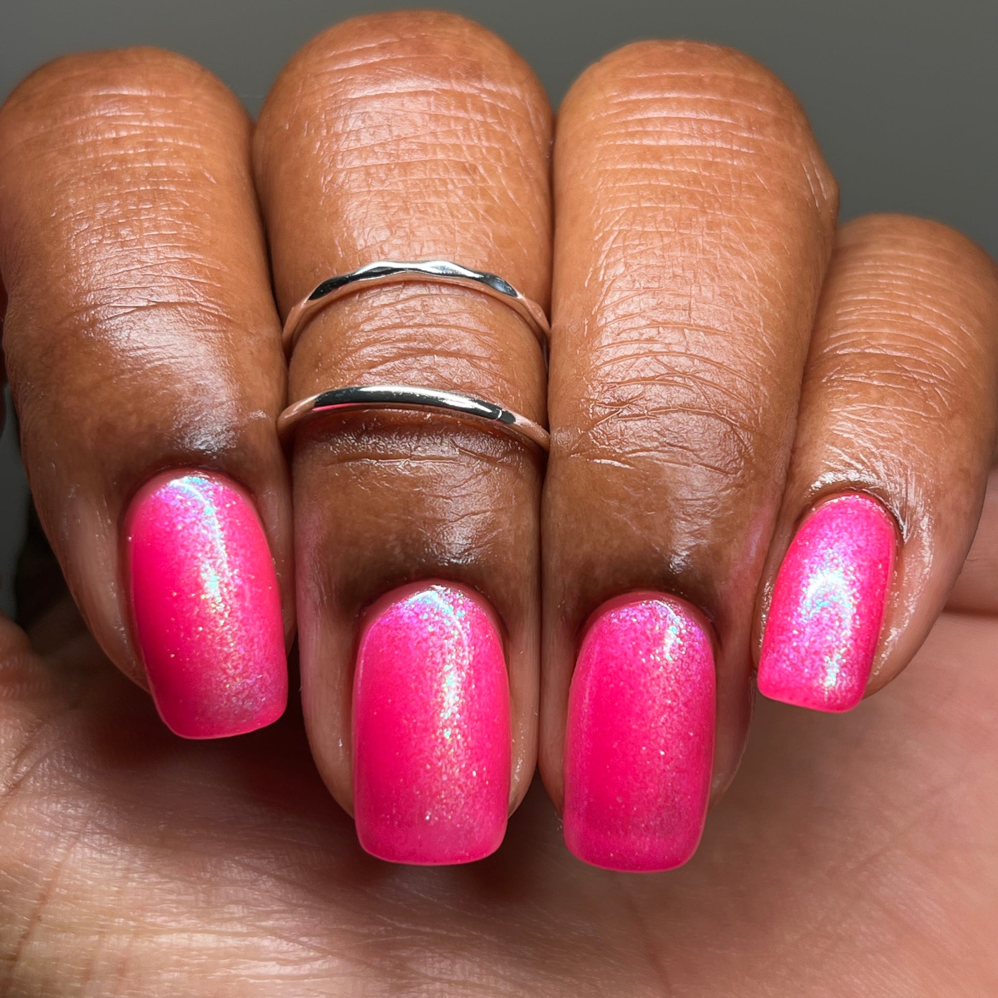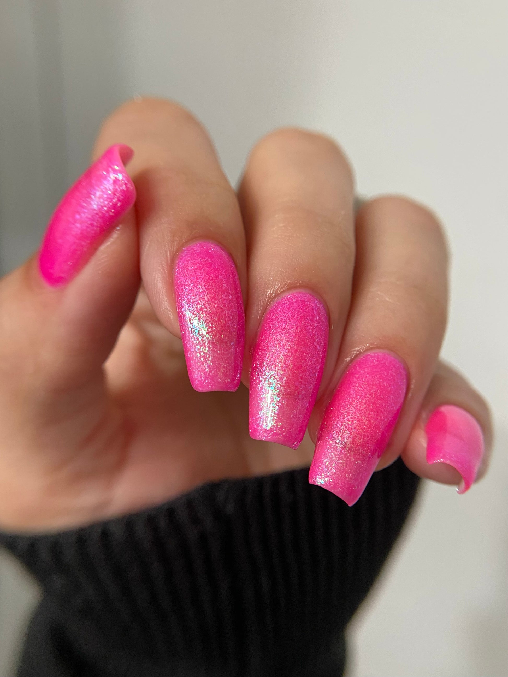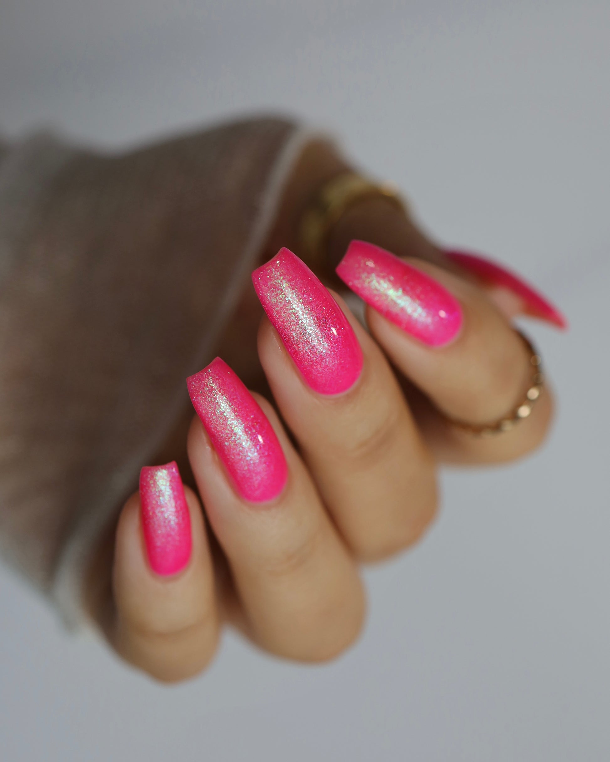 A neon magenta base with large particle aurora shimmer that shifts from green to blue