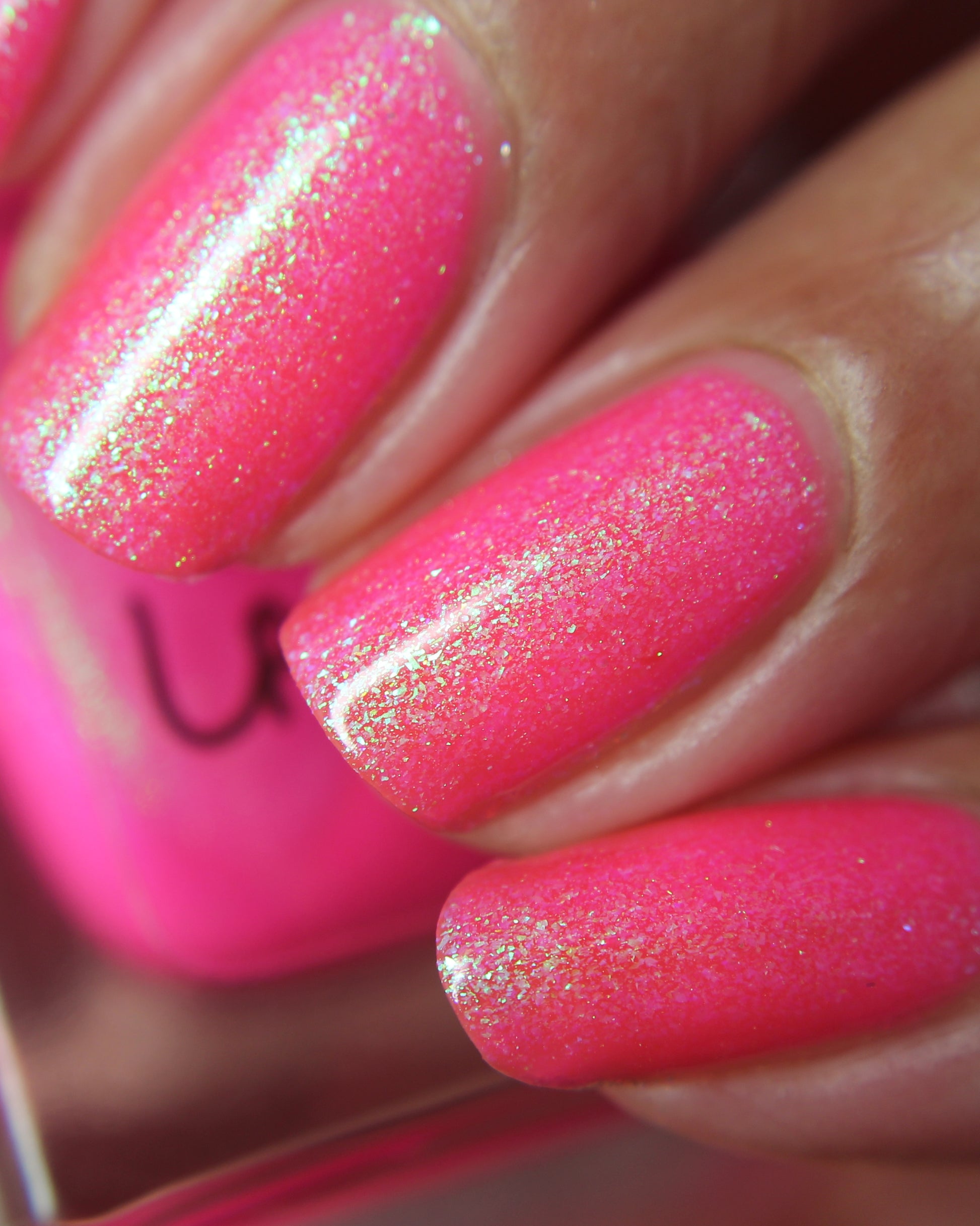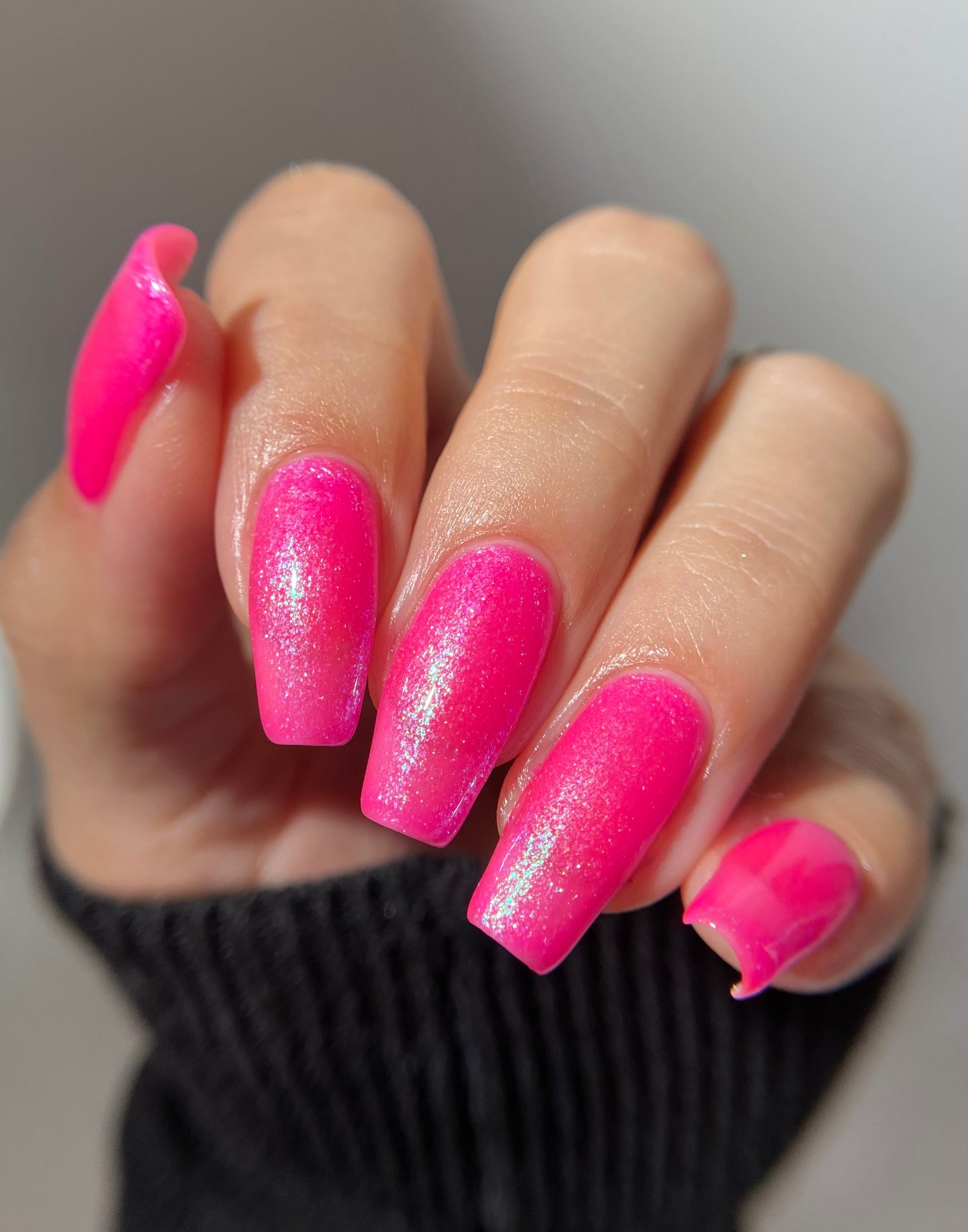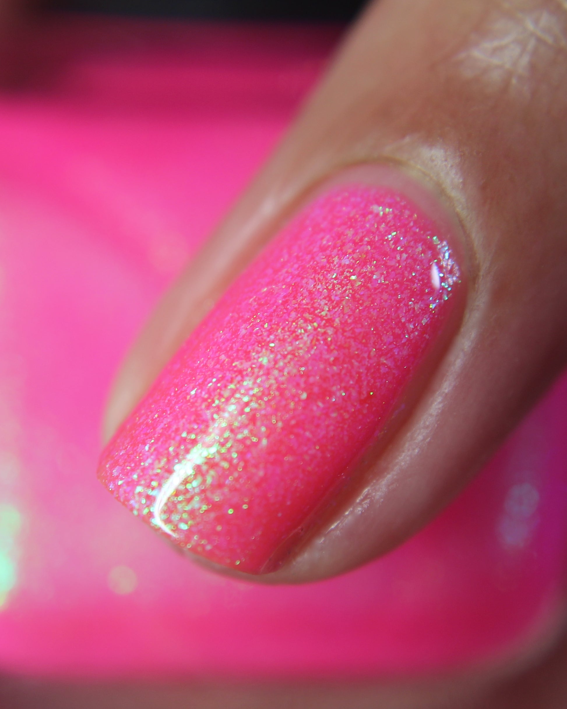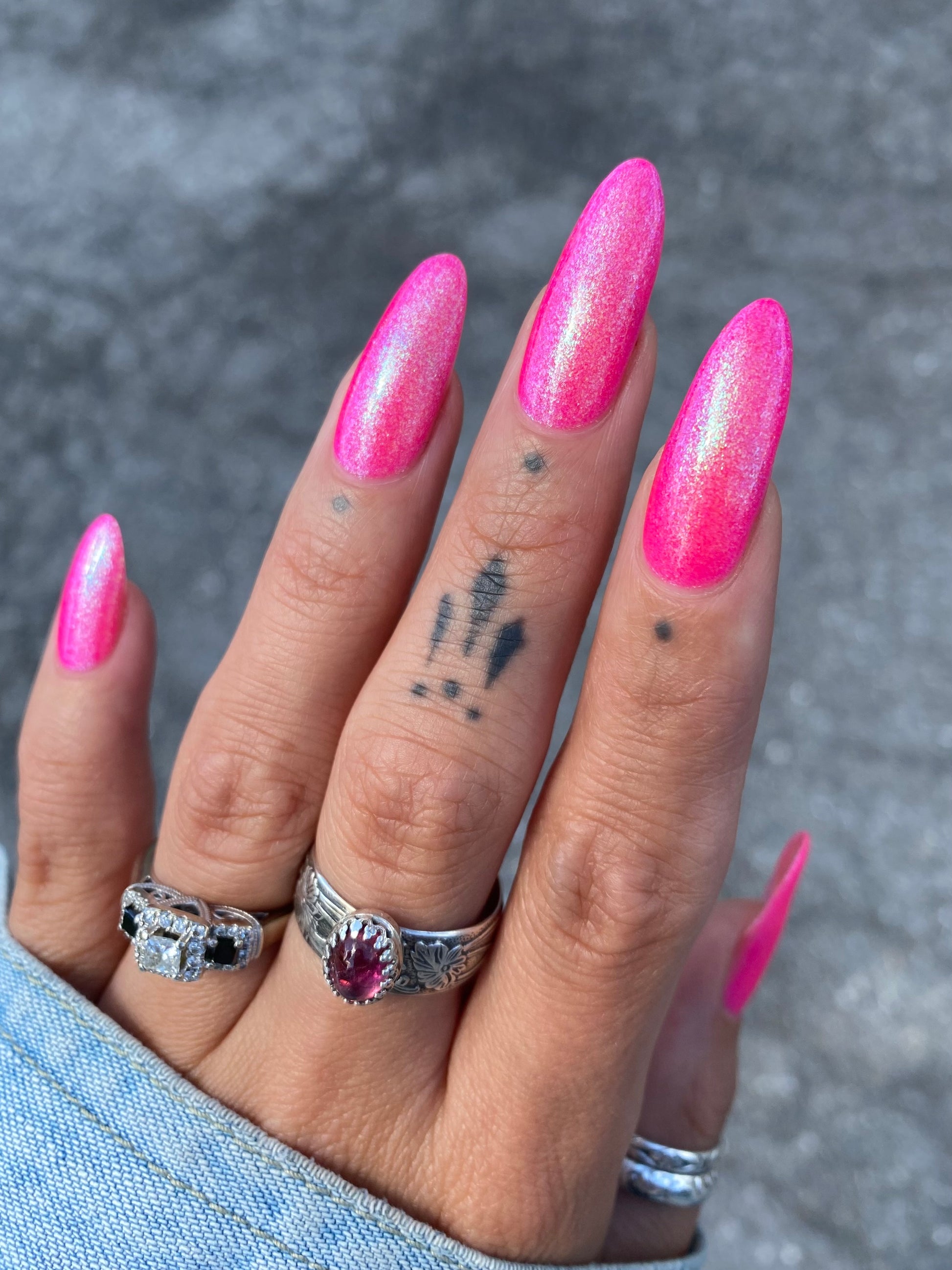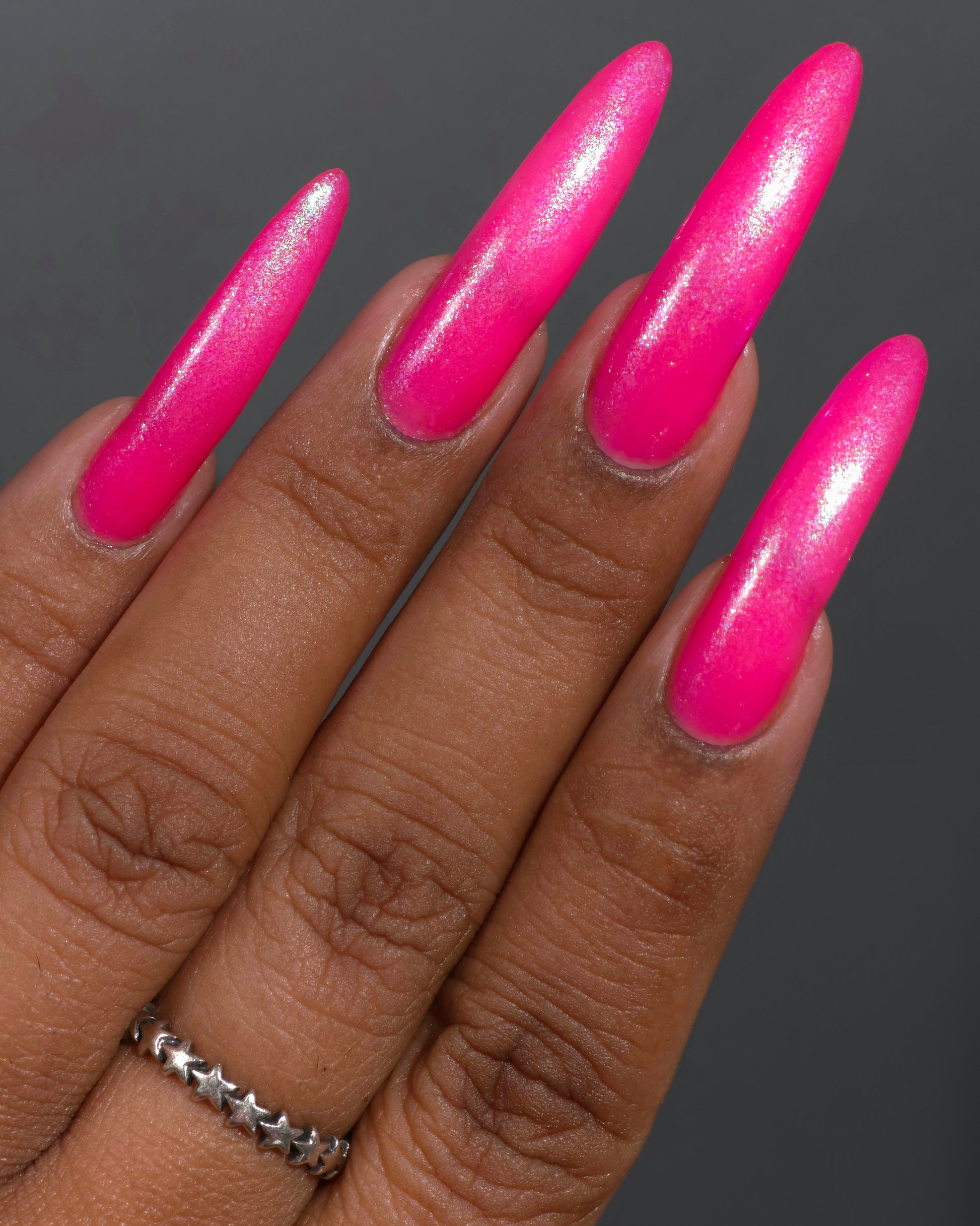 A neon magenta base with large particle aurora shimmer that shifts from green to blue