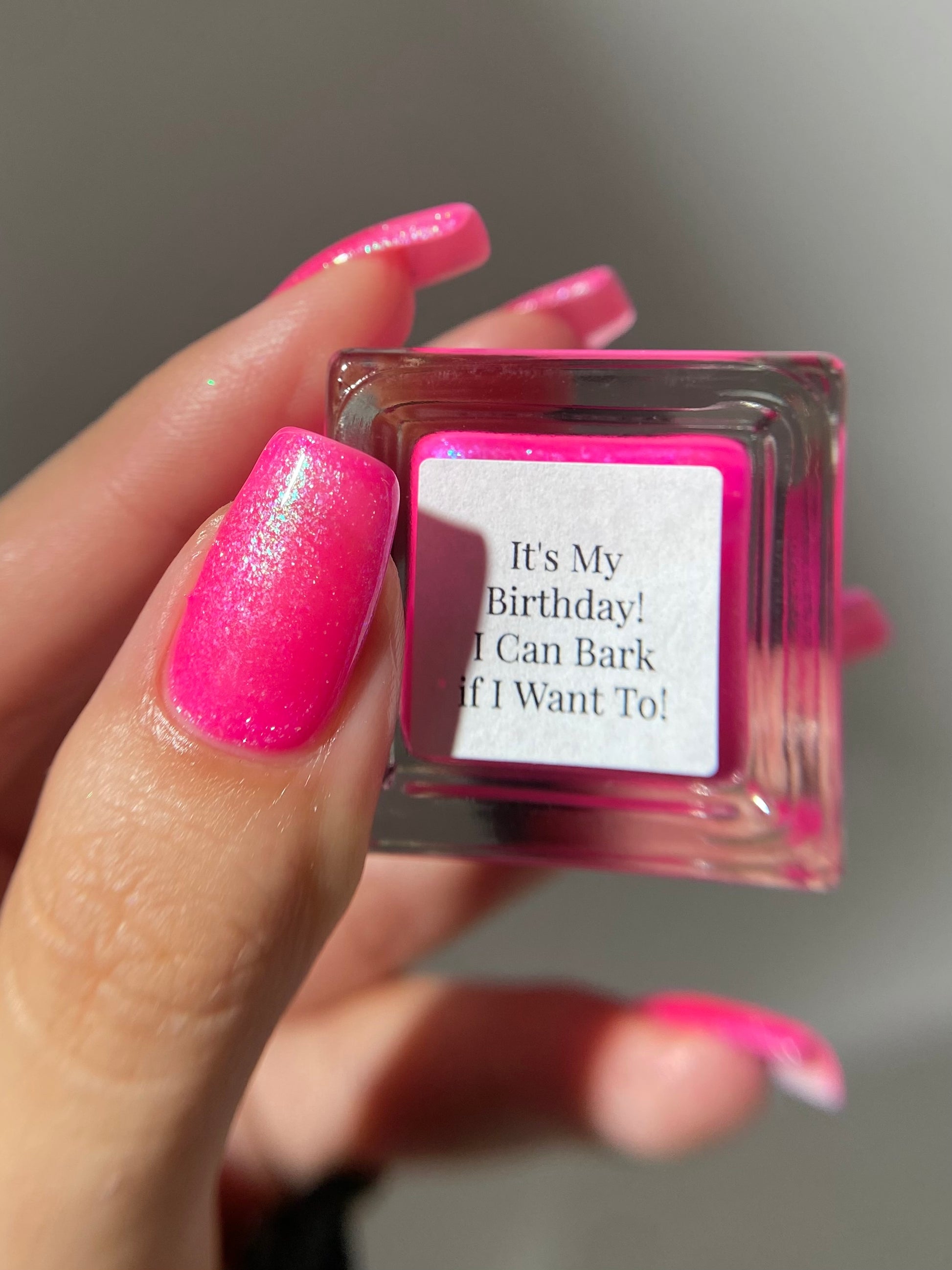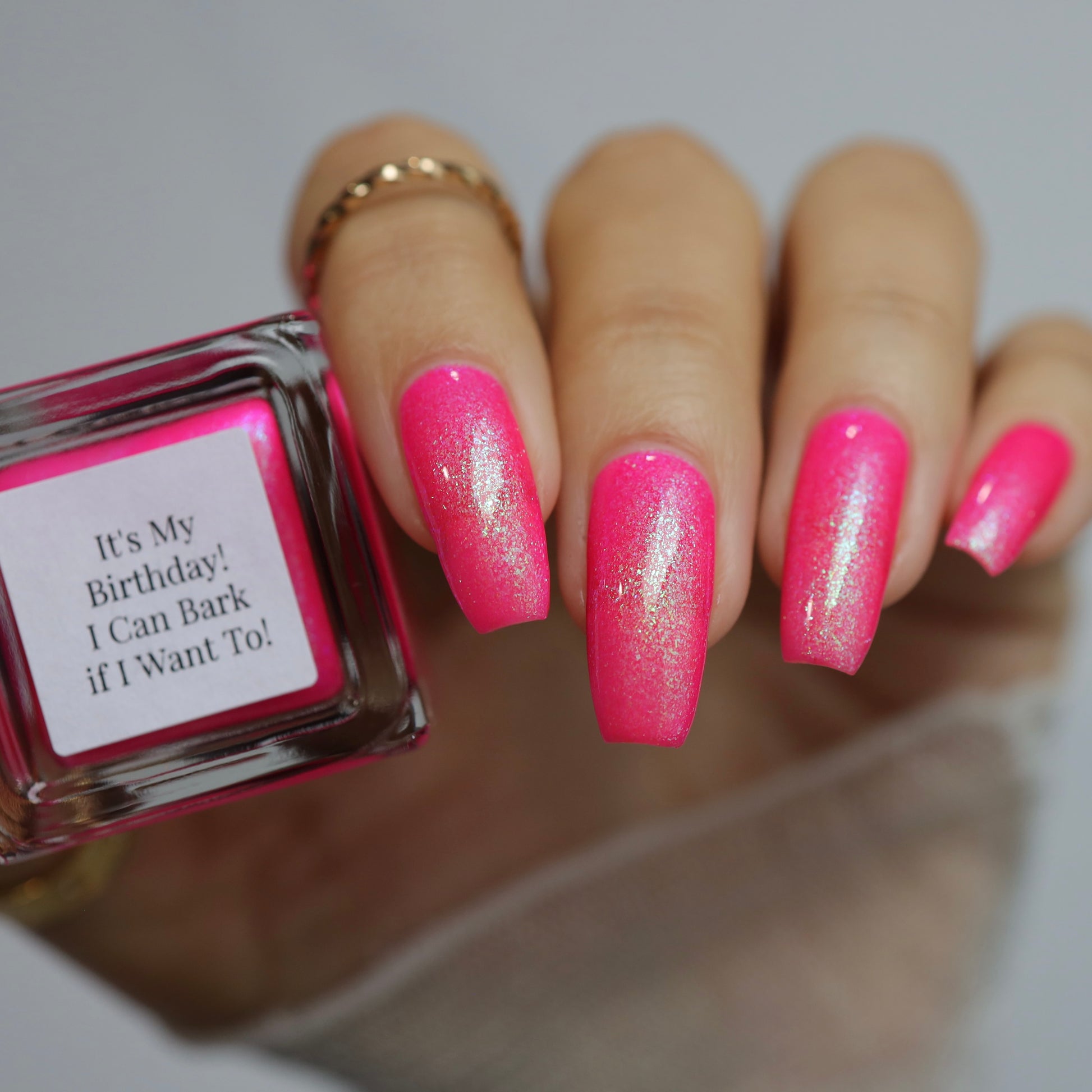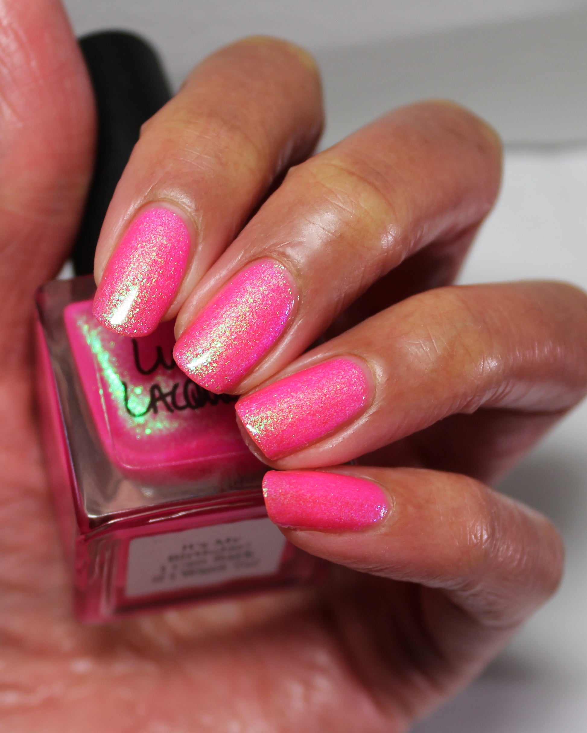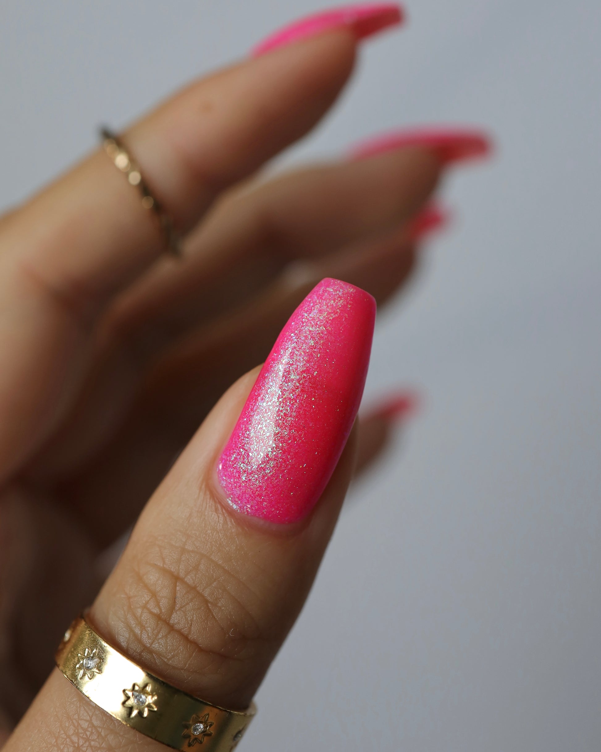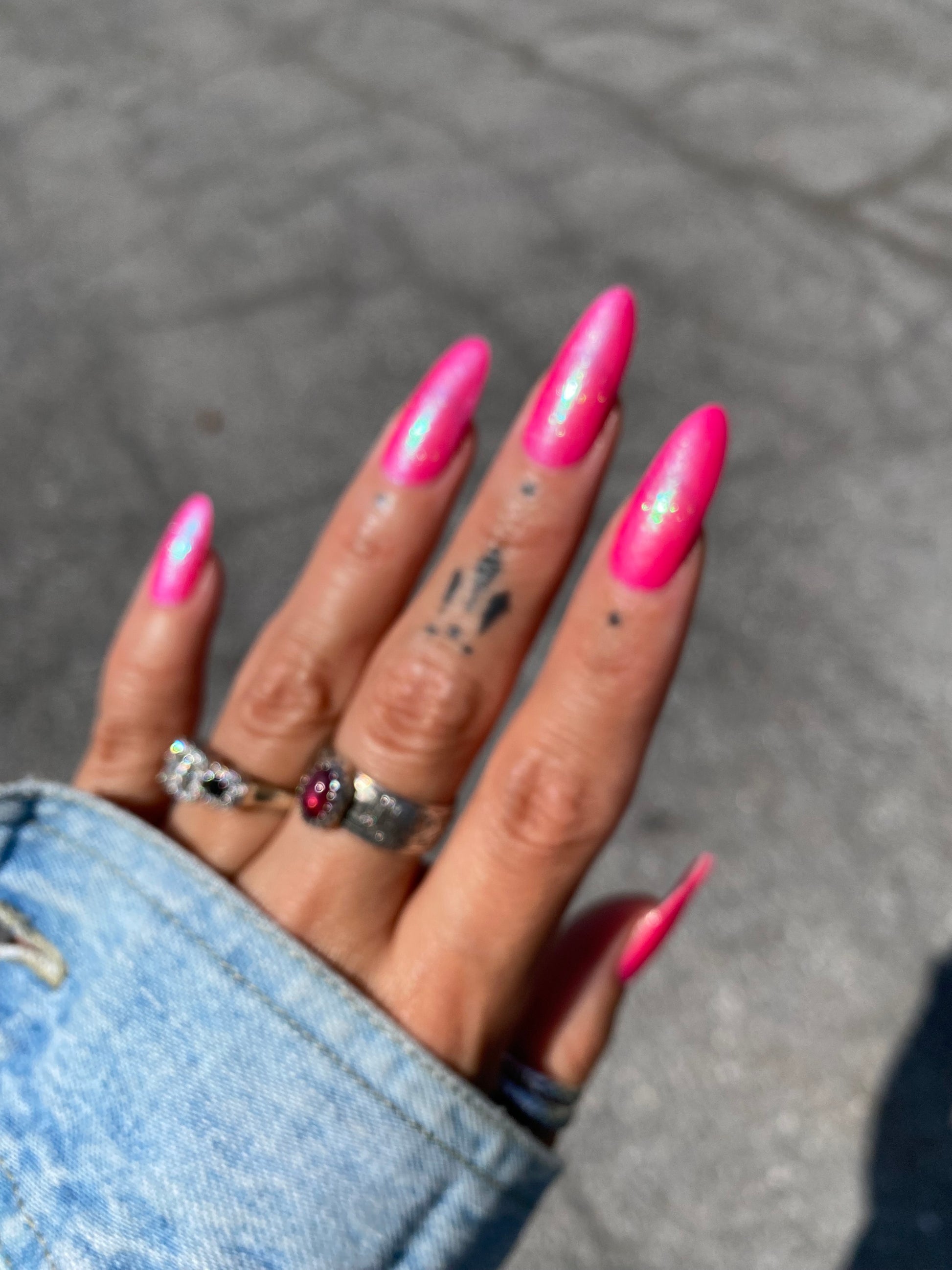 A neon magenta base with large particle aurora shimmer that shifts from green to blue