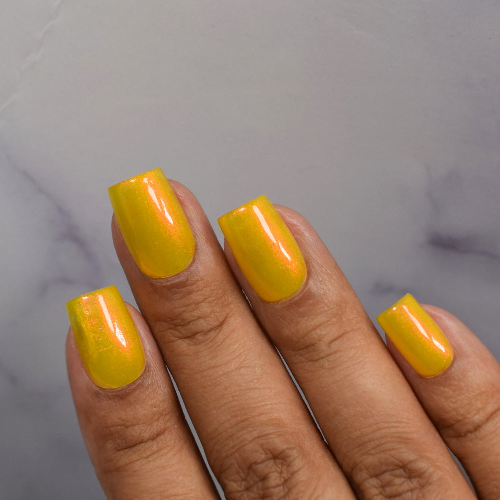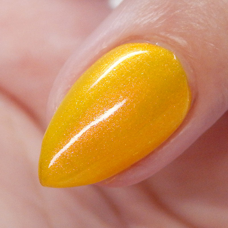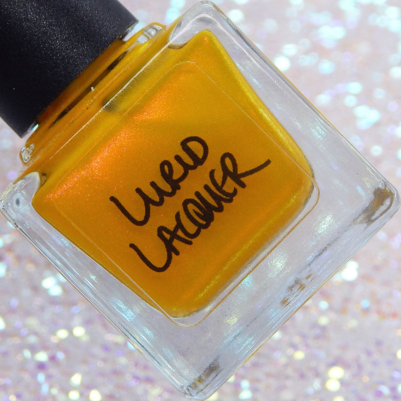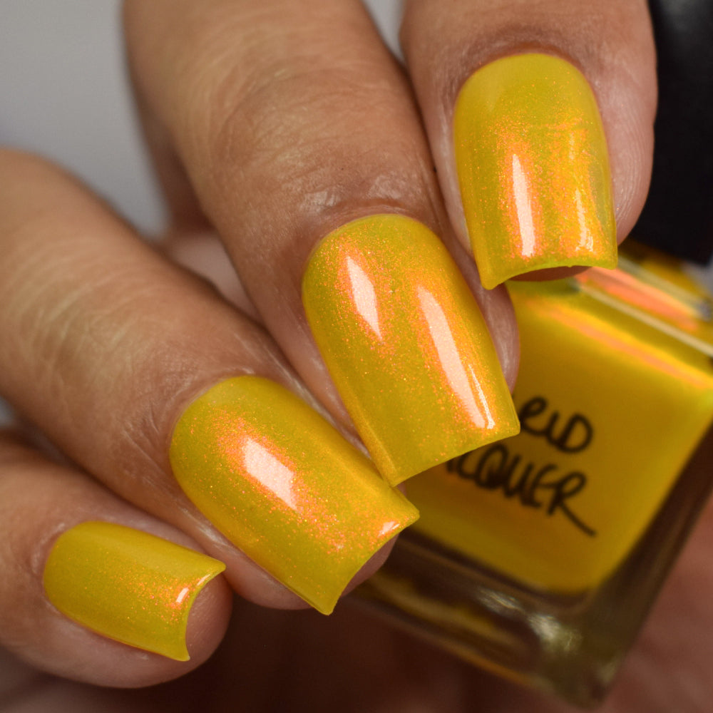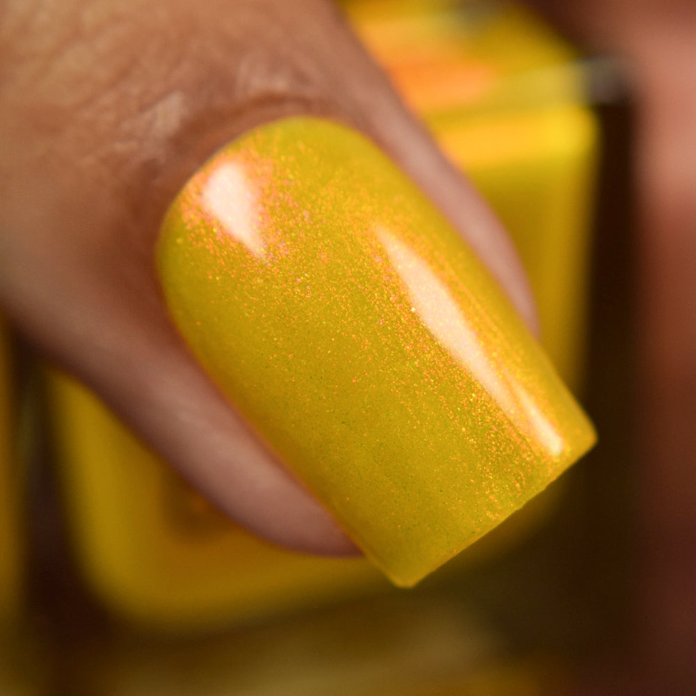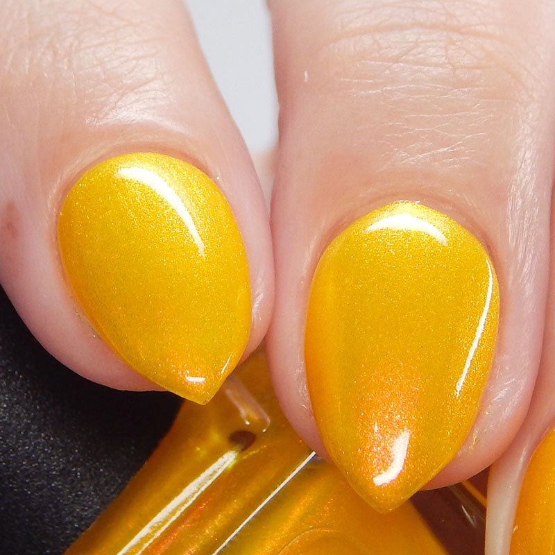 A yellow crelly base with red to orange shimmer that shifts to green at extremes