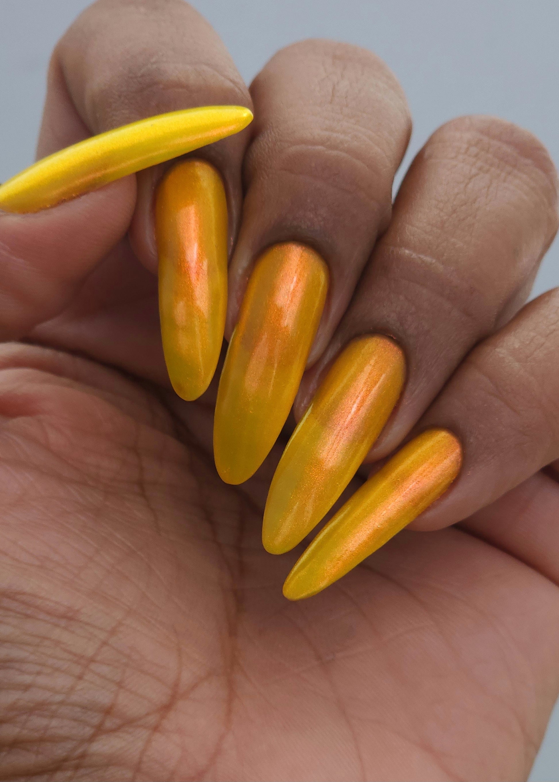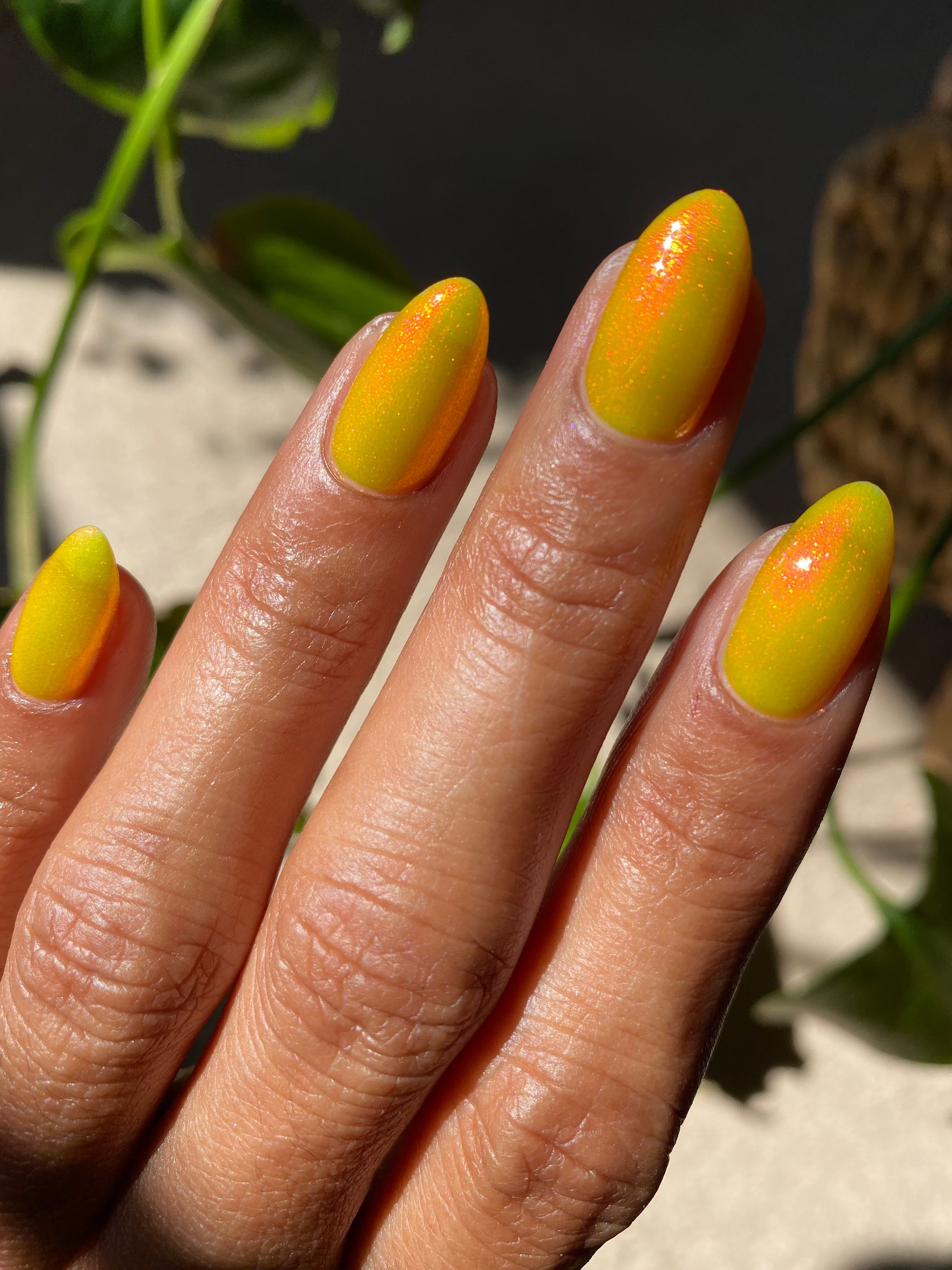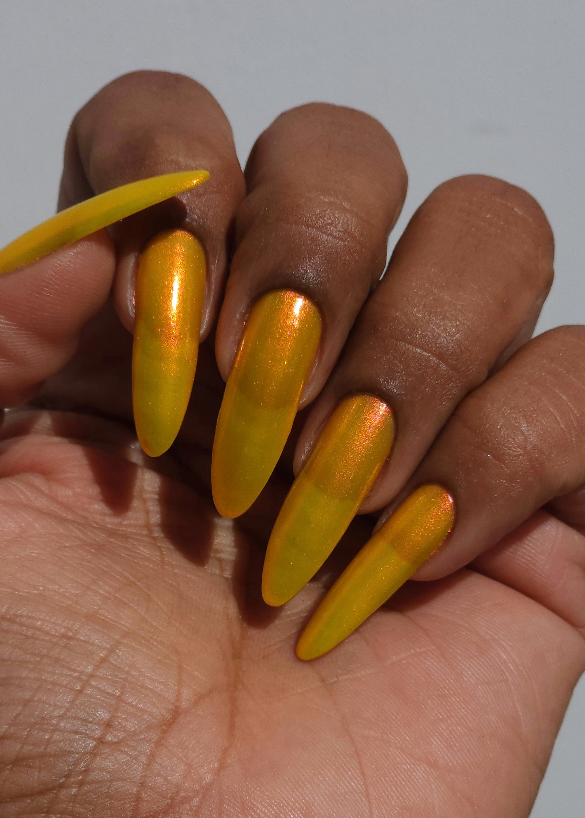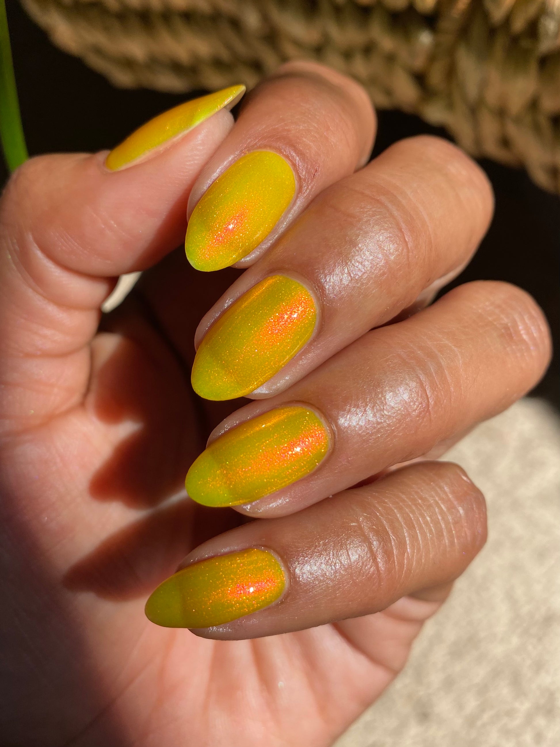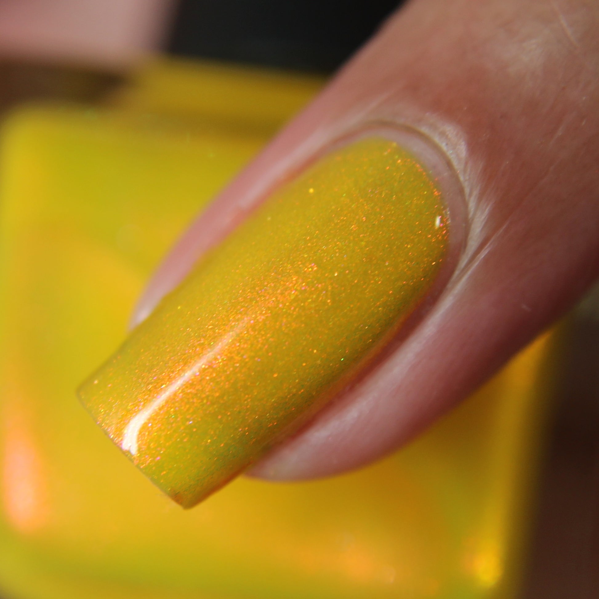 A yellow crelly base with red to orange shimmer that shifts to green at extremes