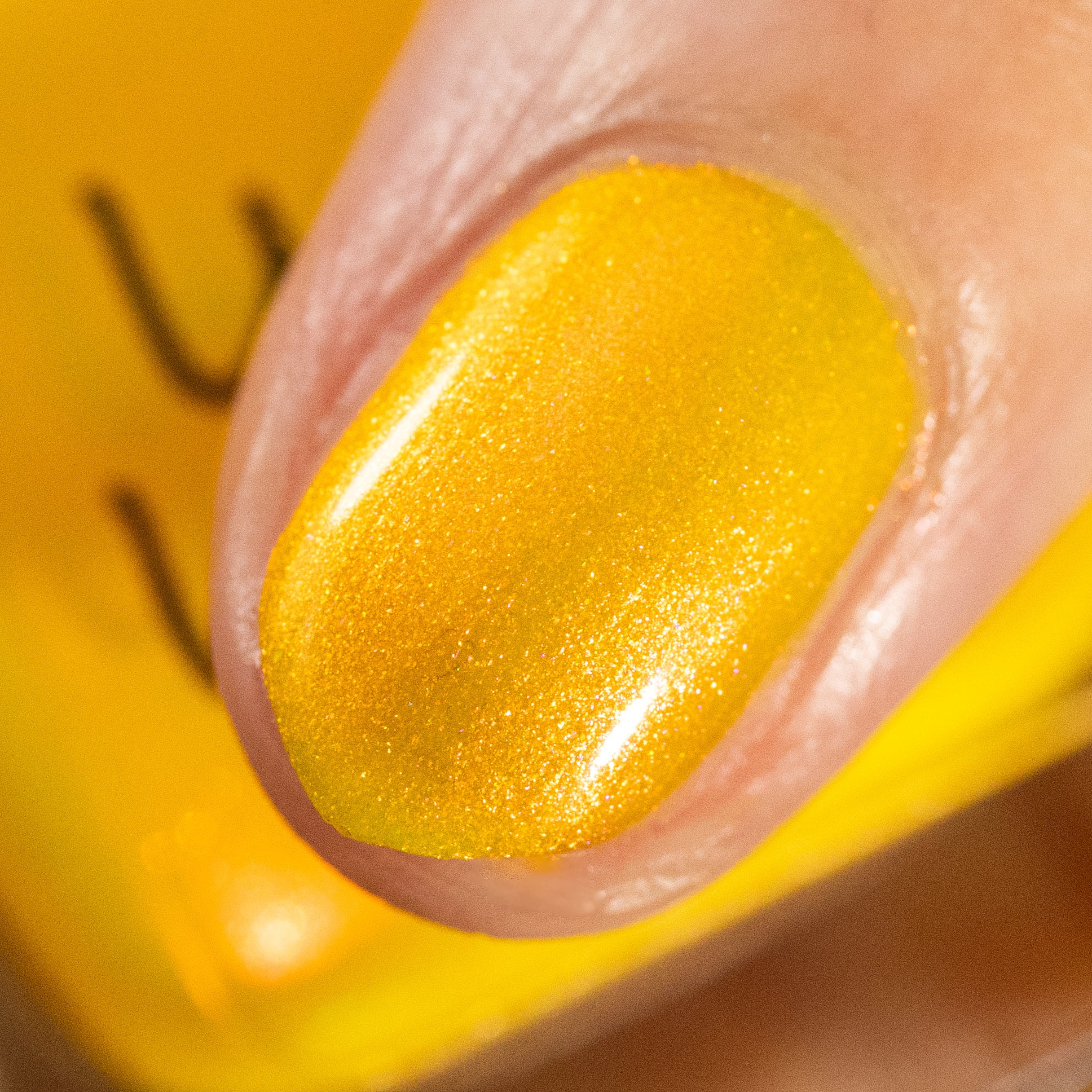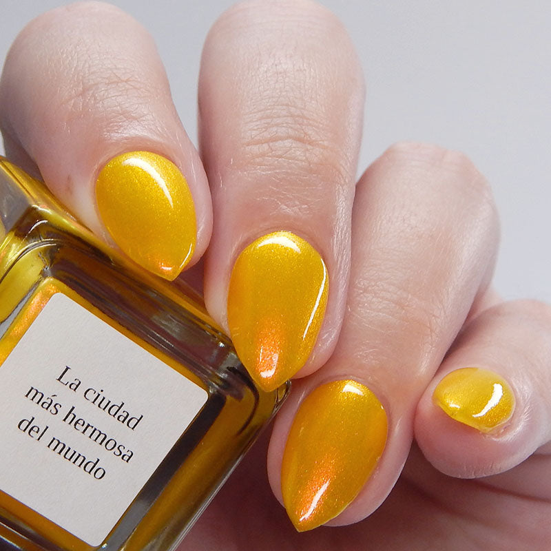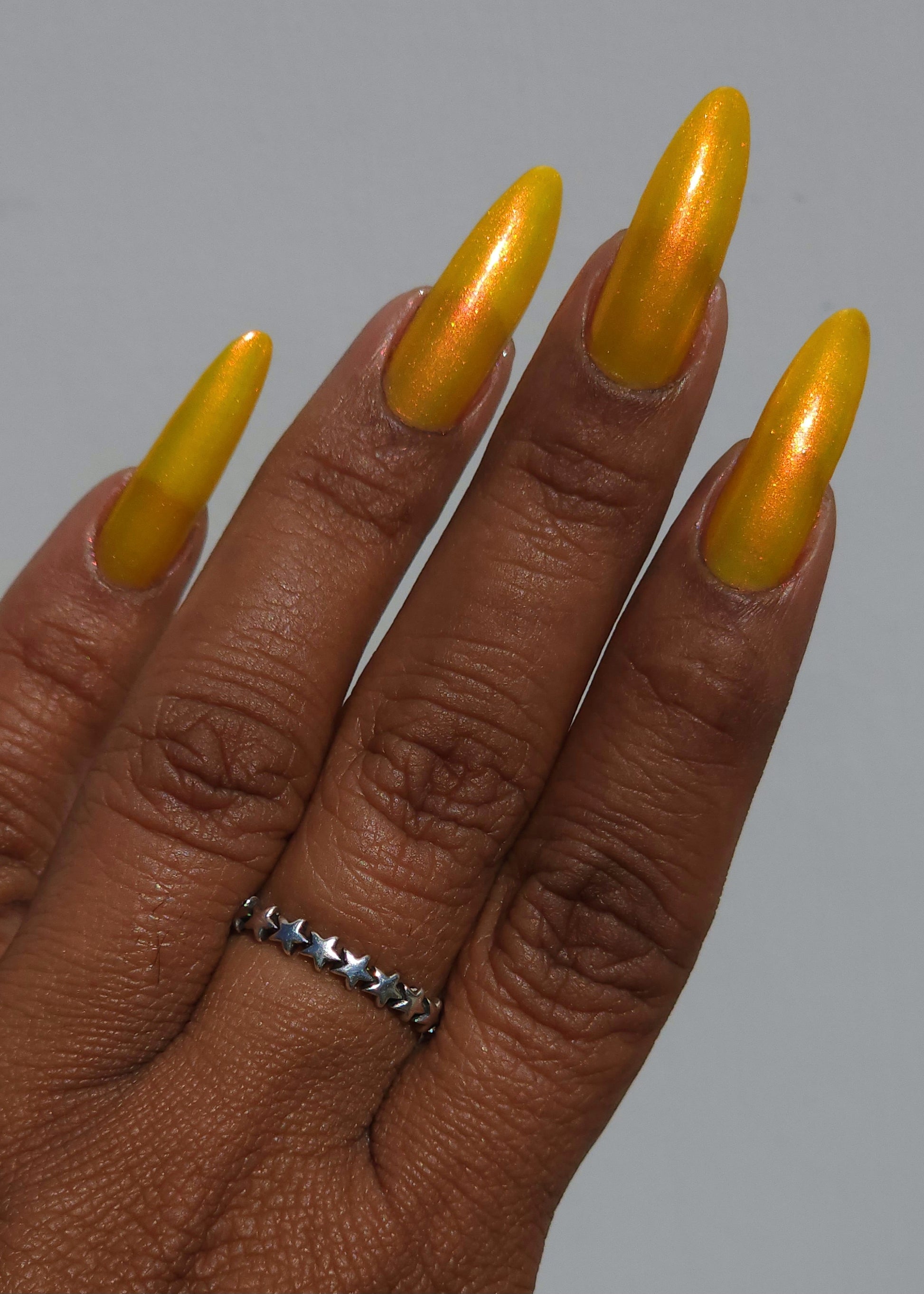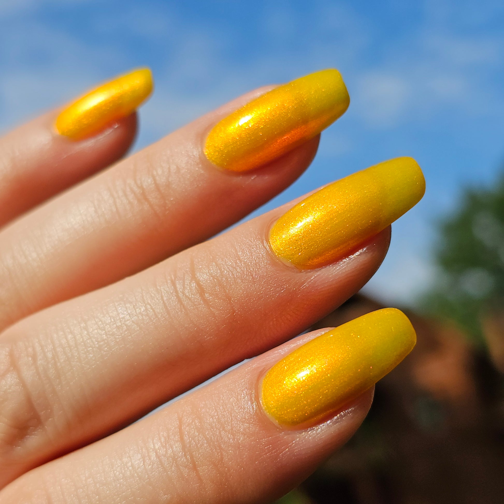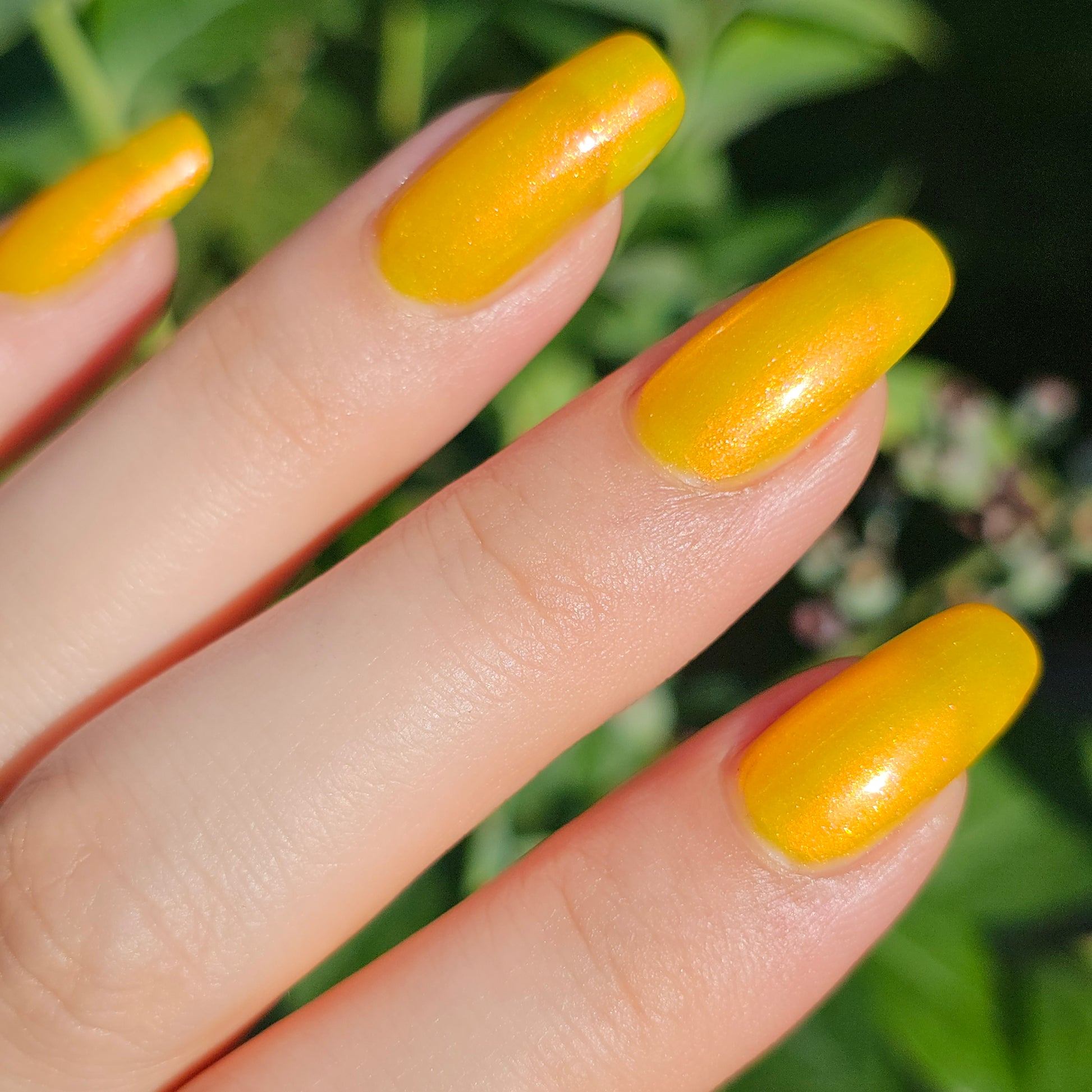 A yellow crelly base with red to orange shimmer that shifts to green at extremes