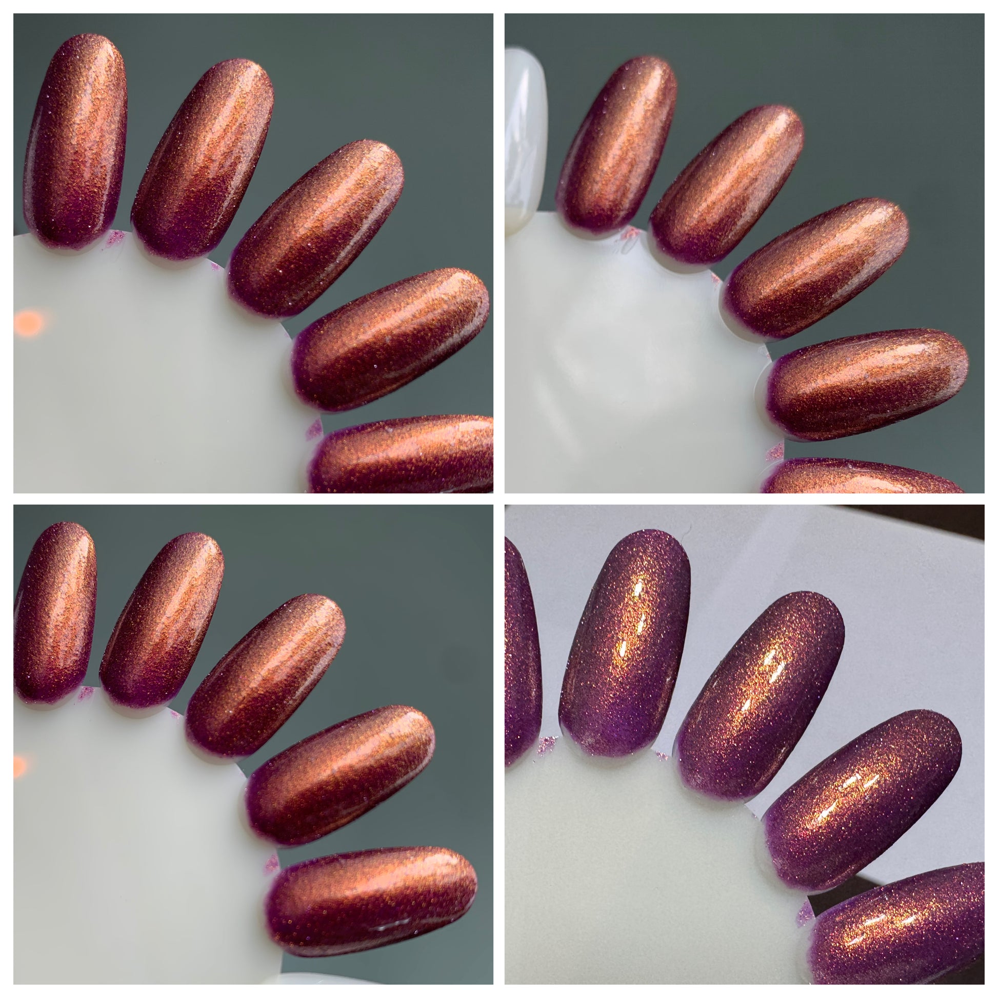 A purple jelly base with aurora shimmer that shifts from copper to gold and bronze light reflective glitter