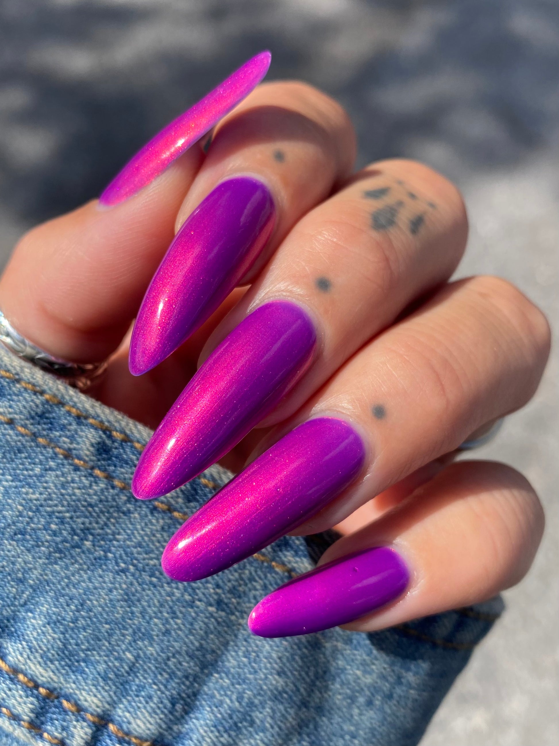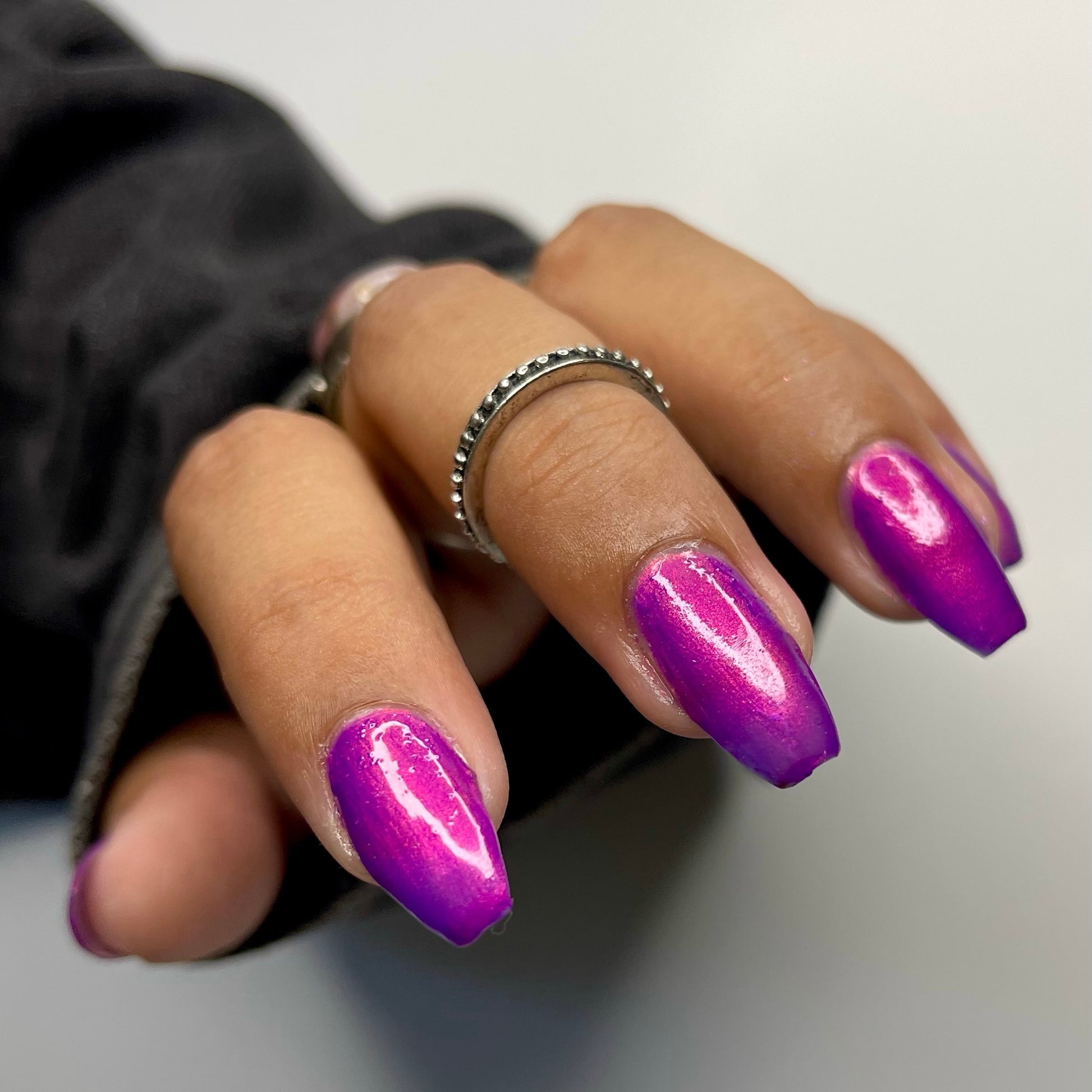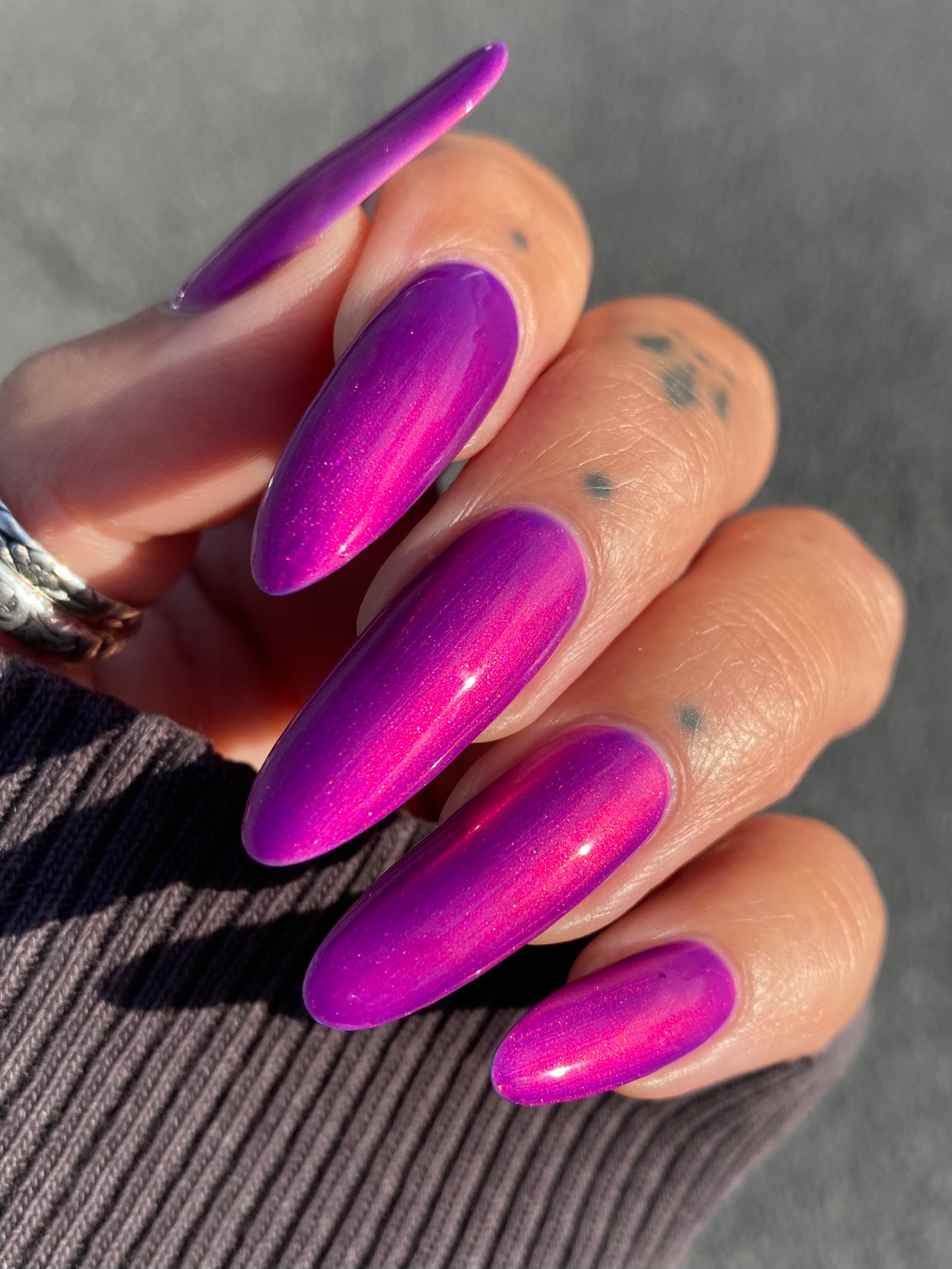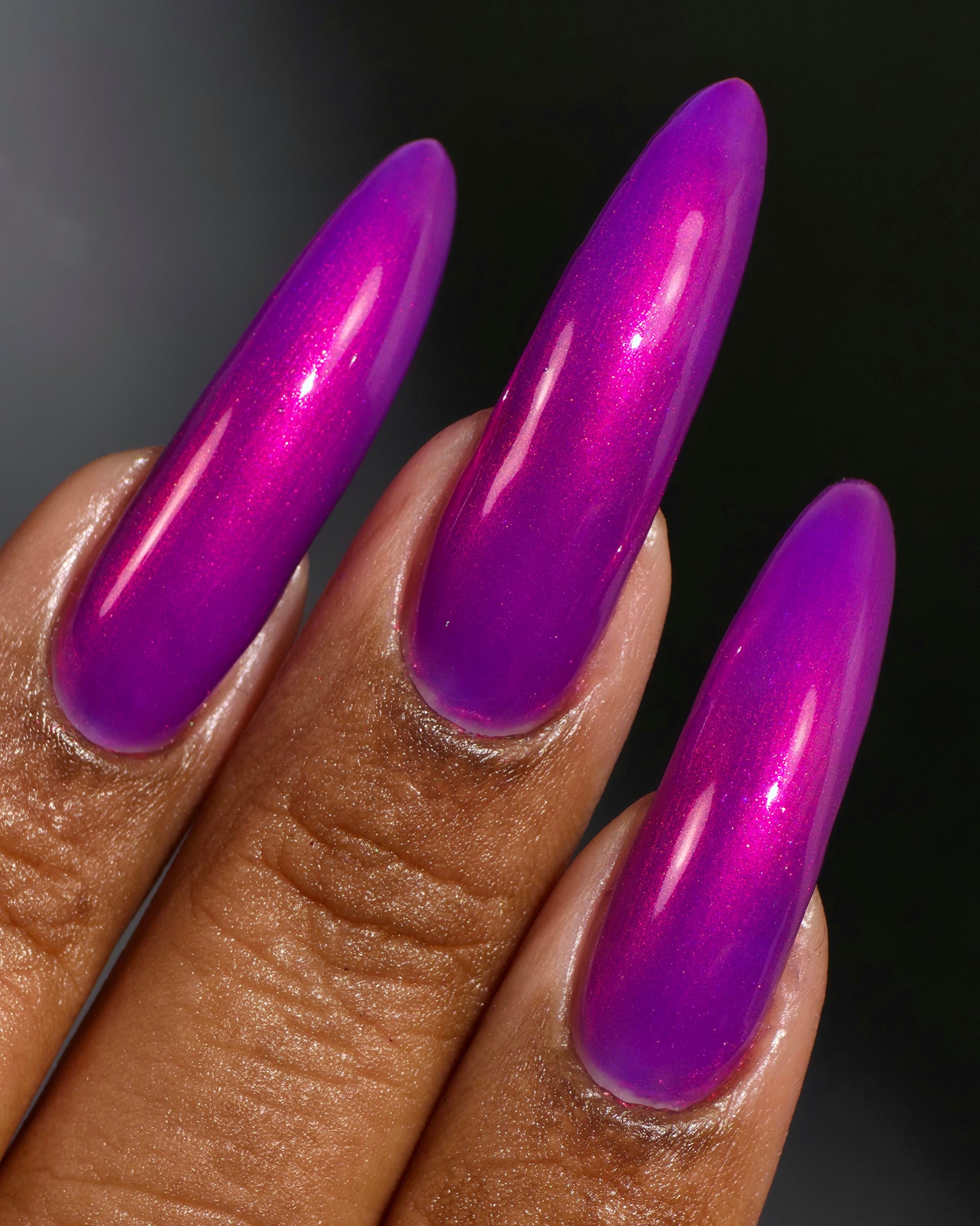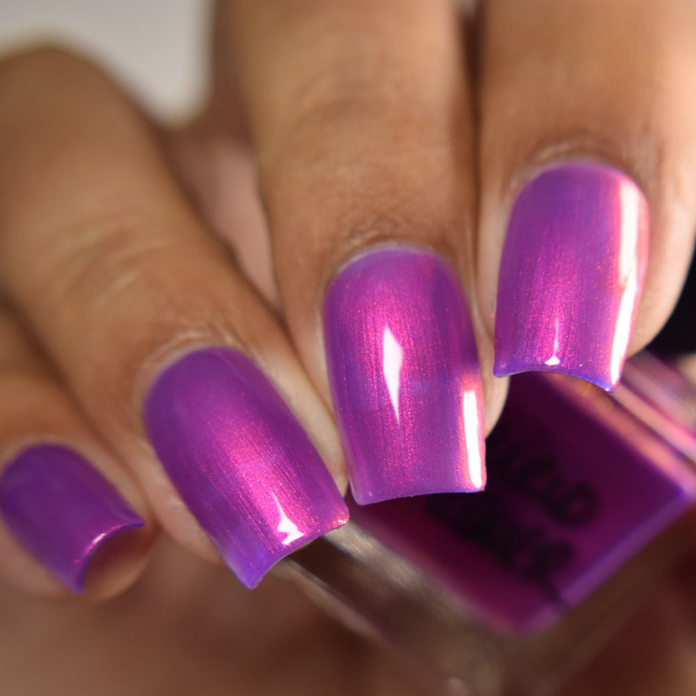 A neon pinkish purple with glowy reddish pink shimmer