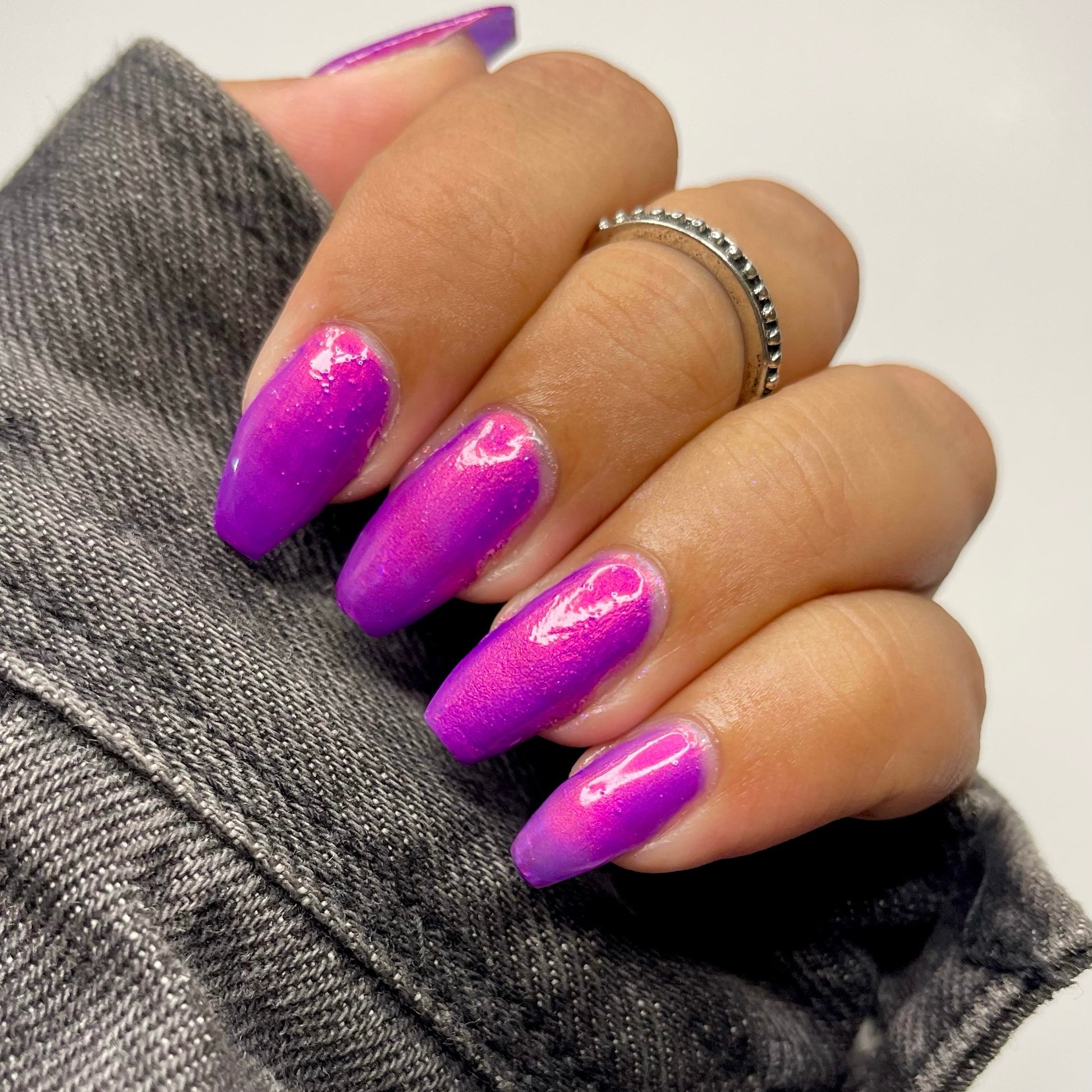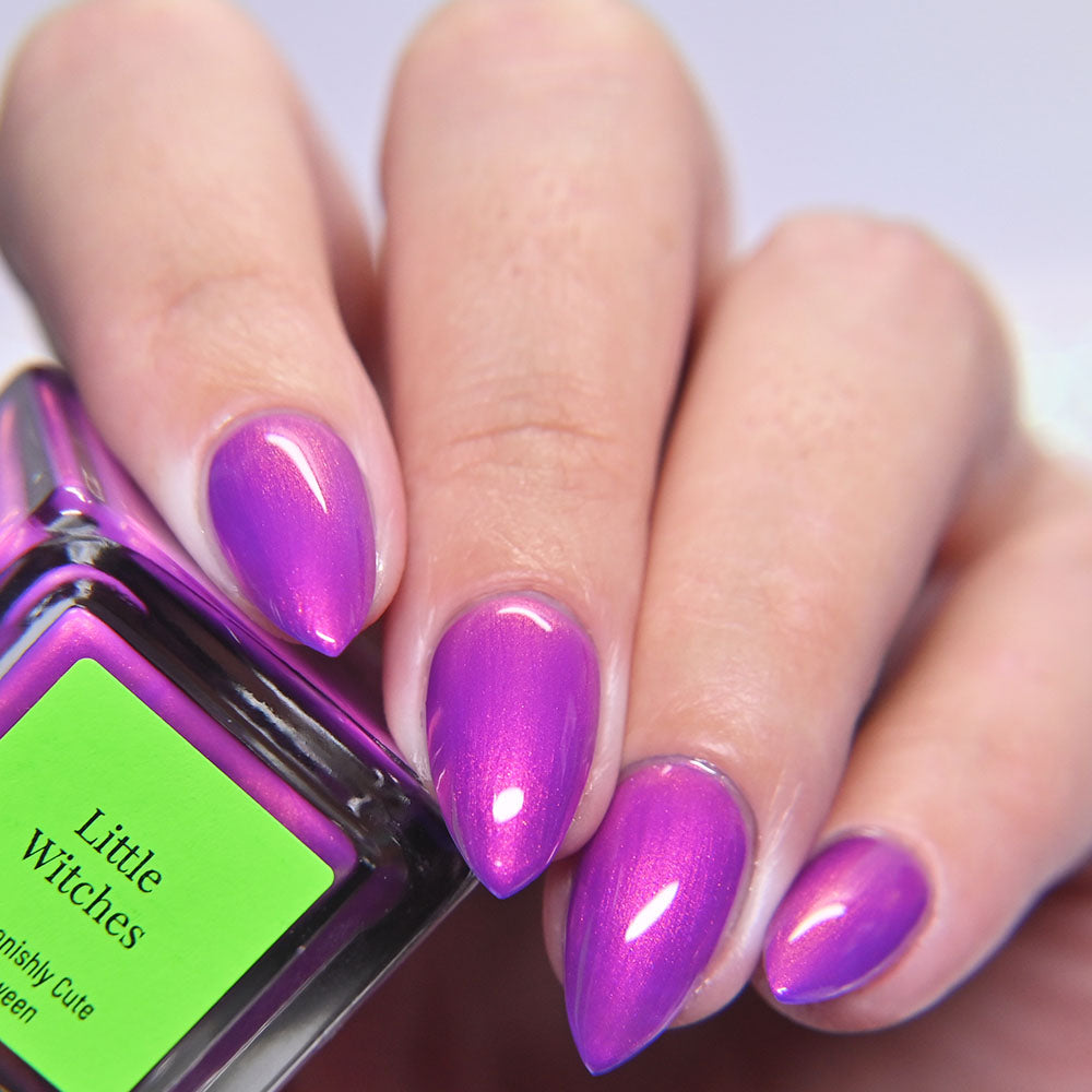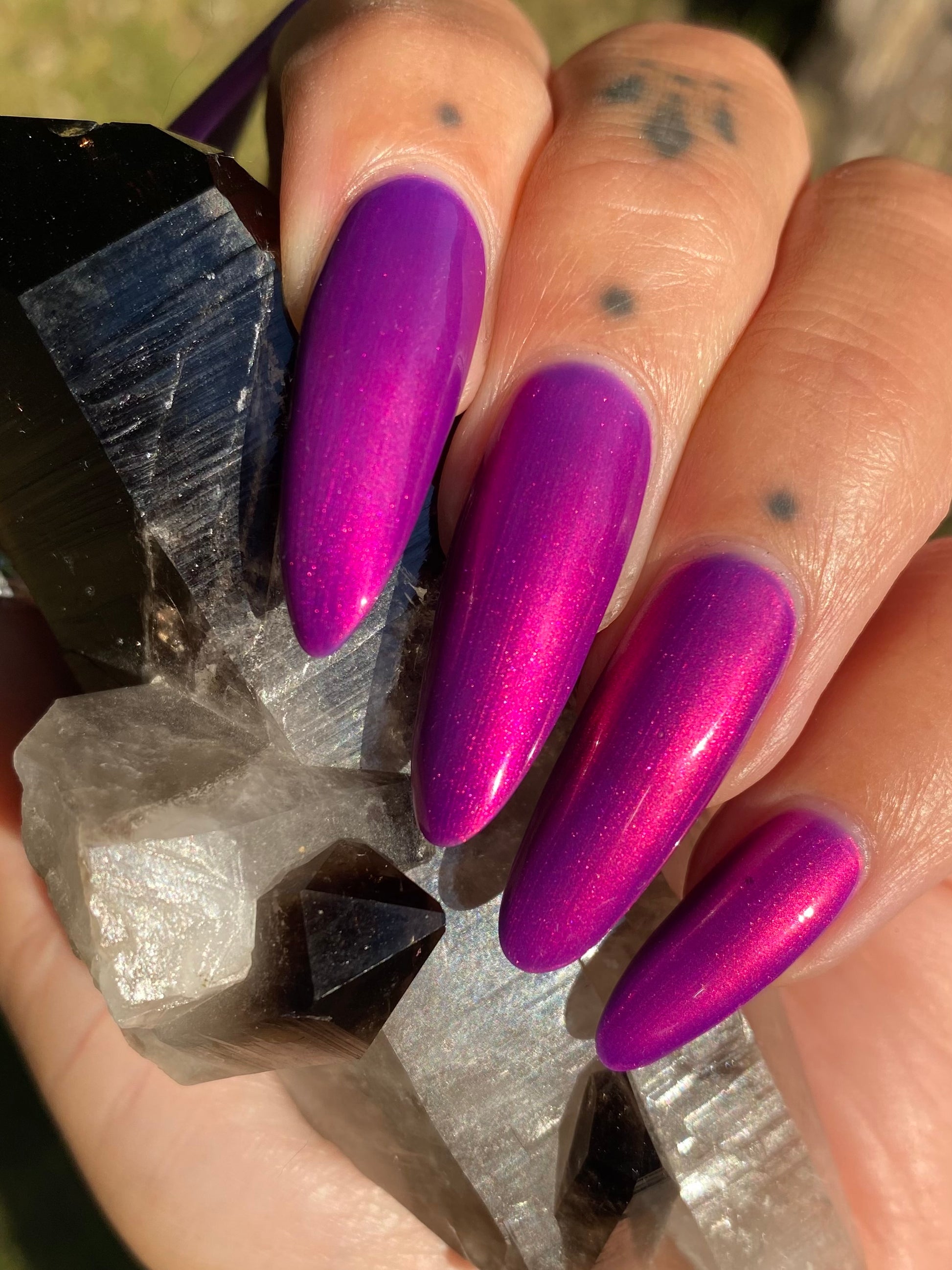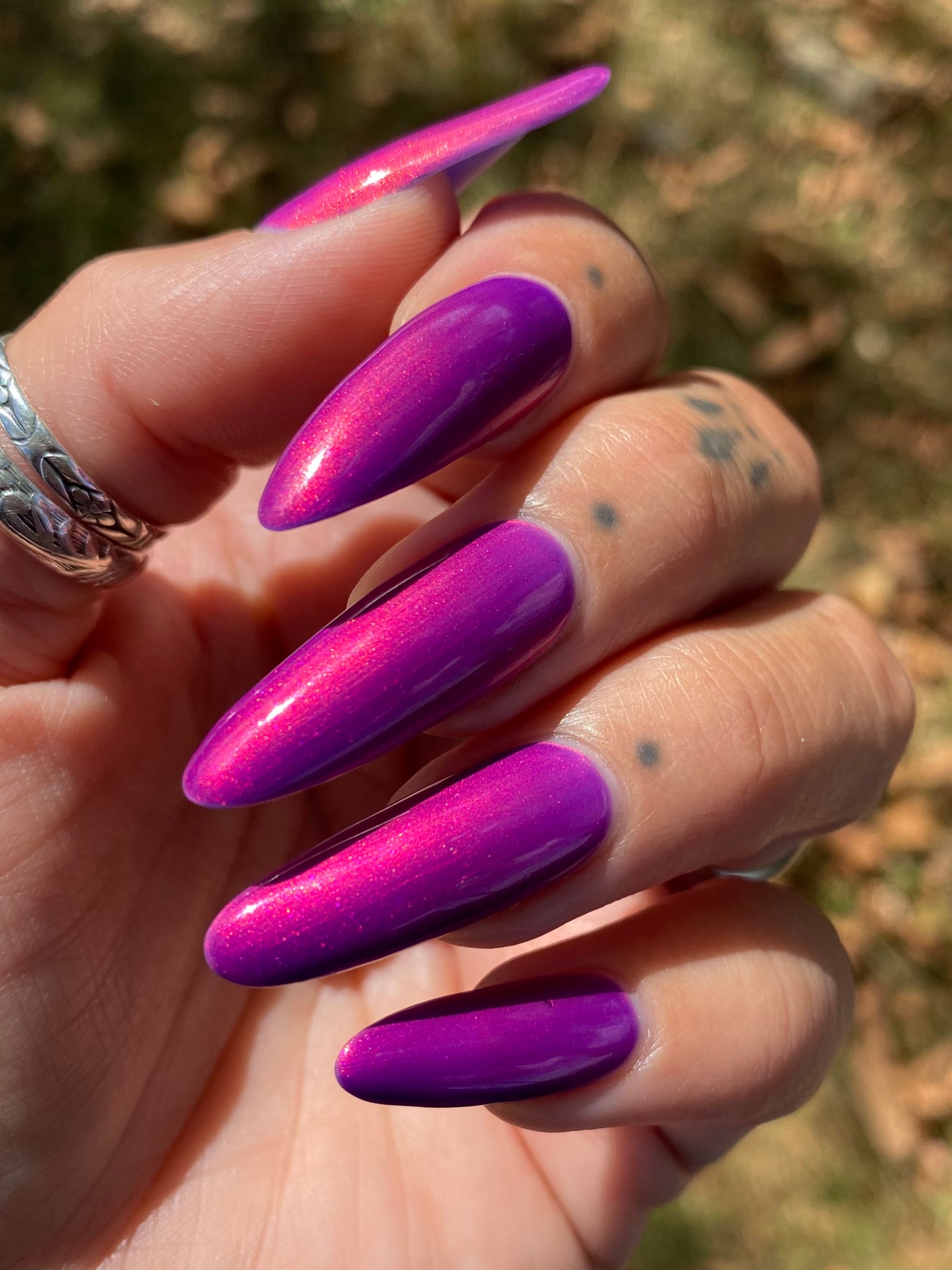 A neon pinkish purple with glowy reddish pink shimmer