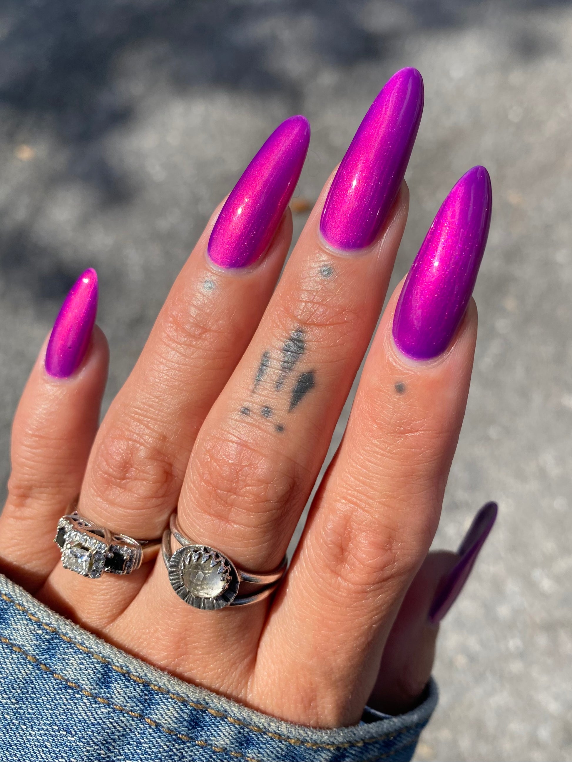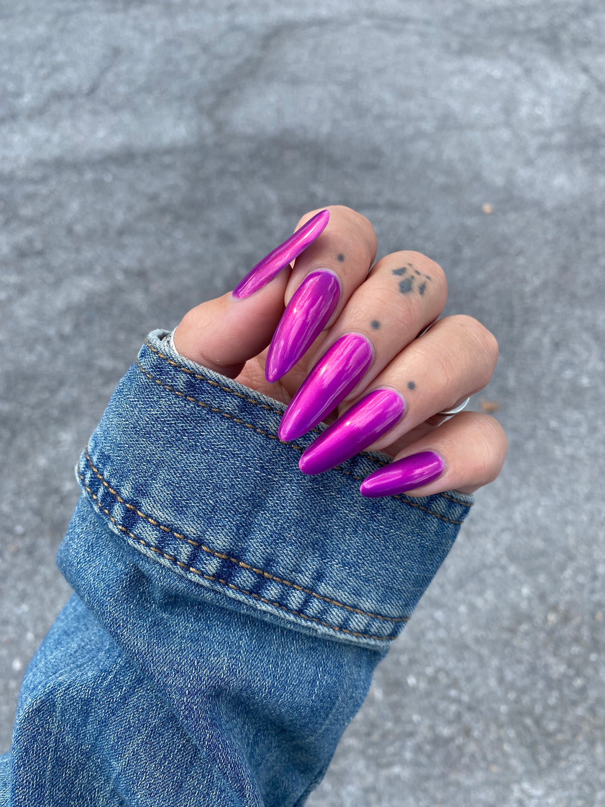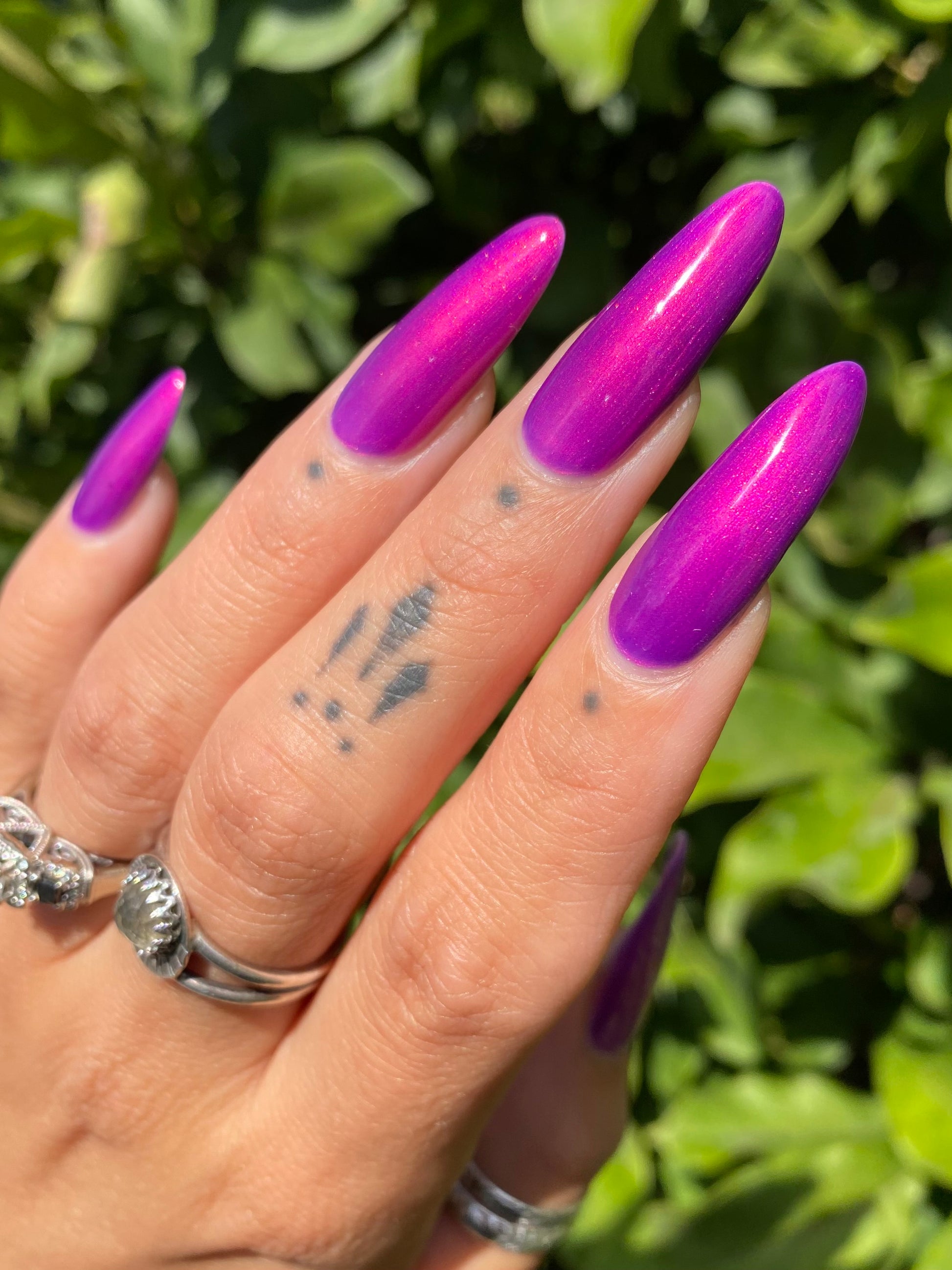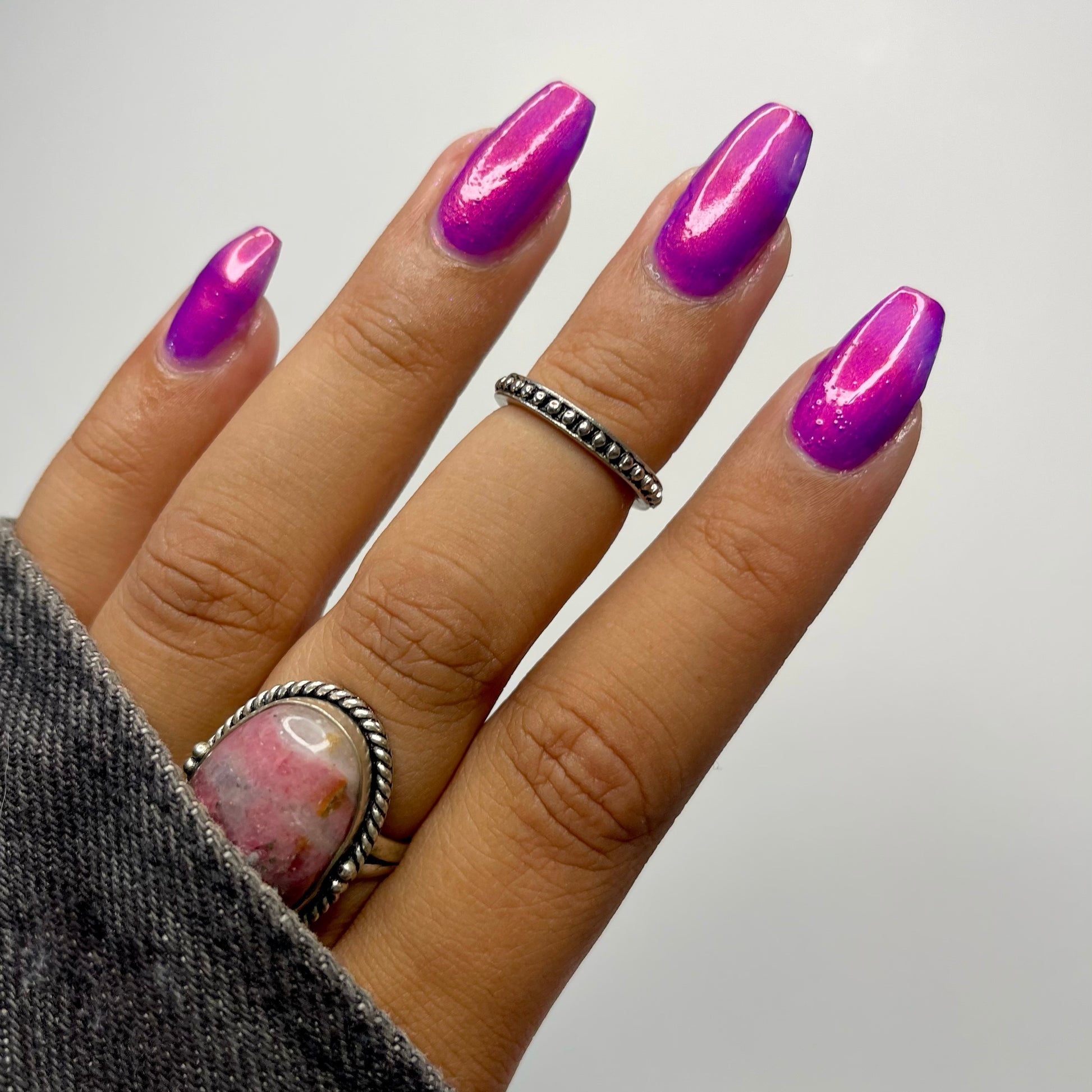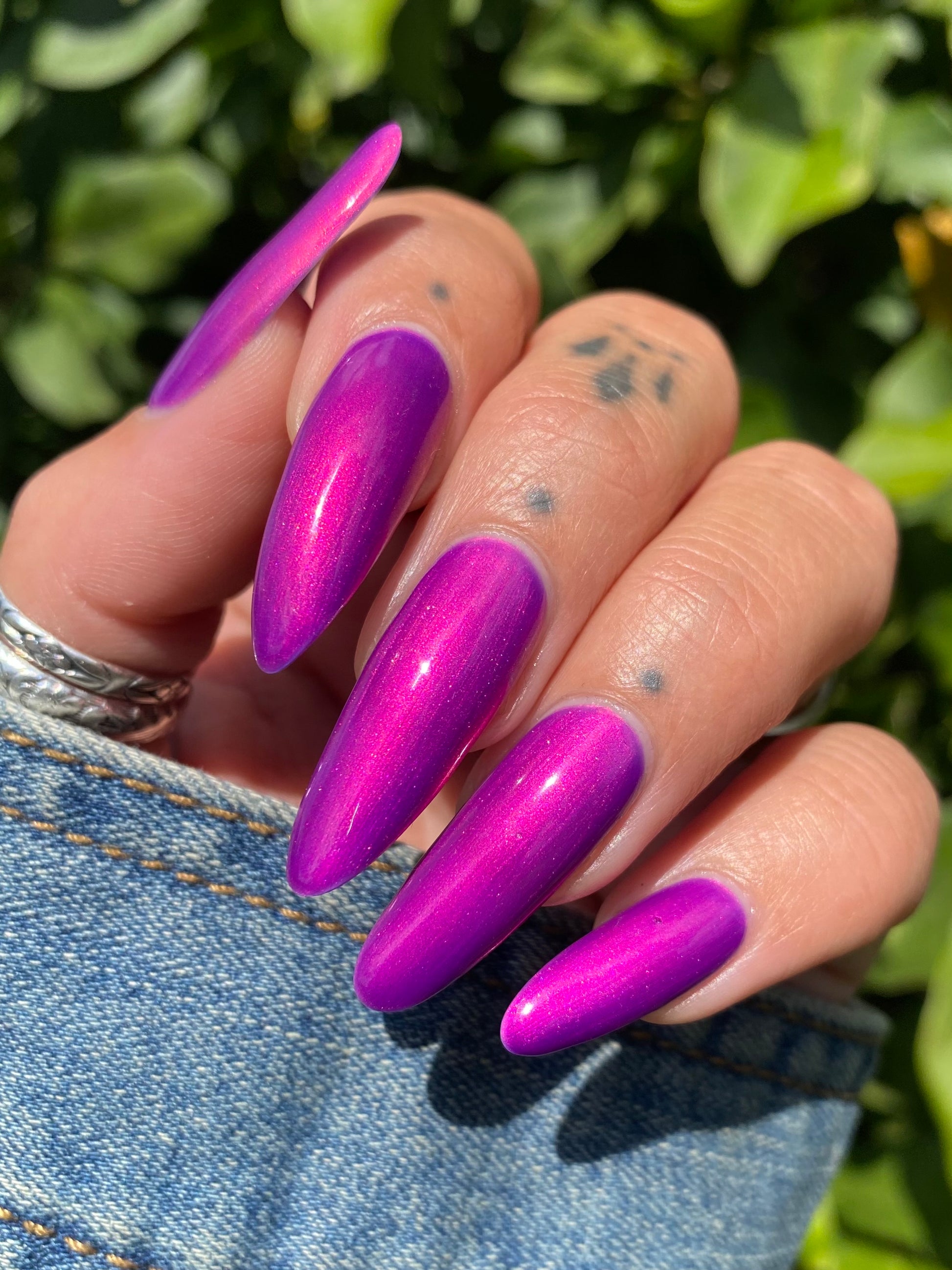 A neon pinkish purple with glowy reddish pink shimmer