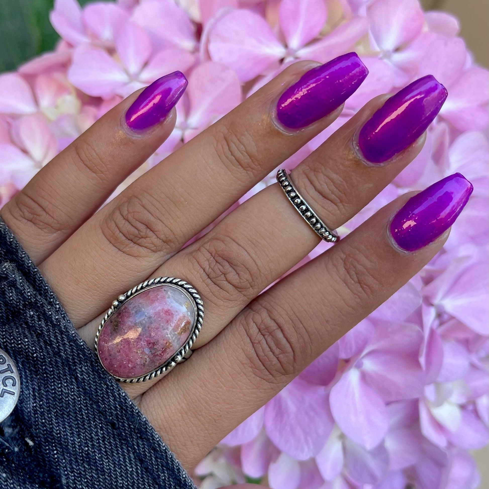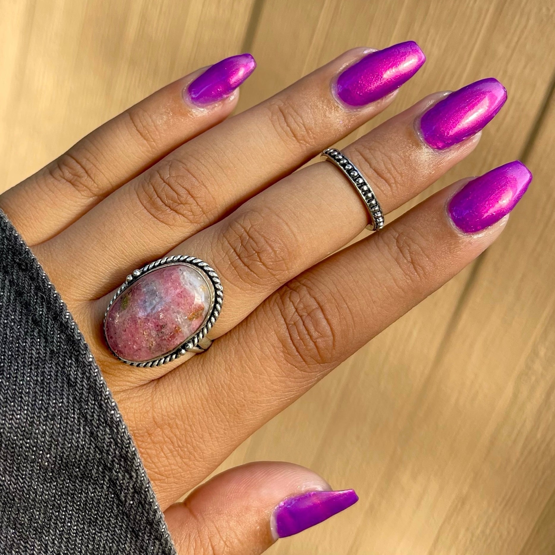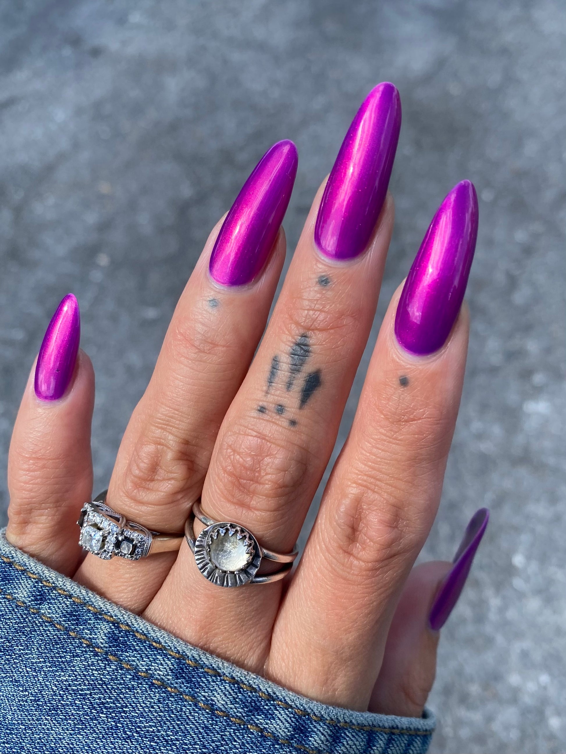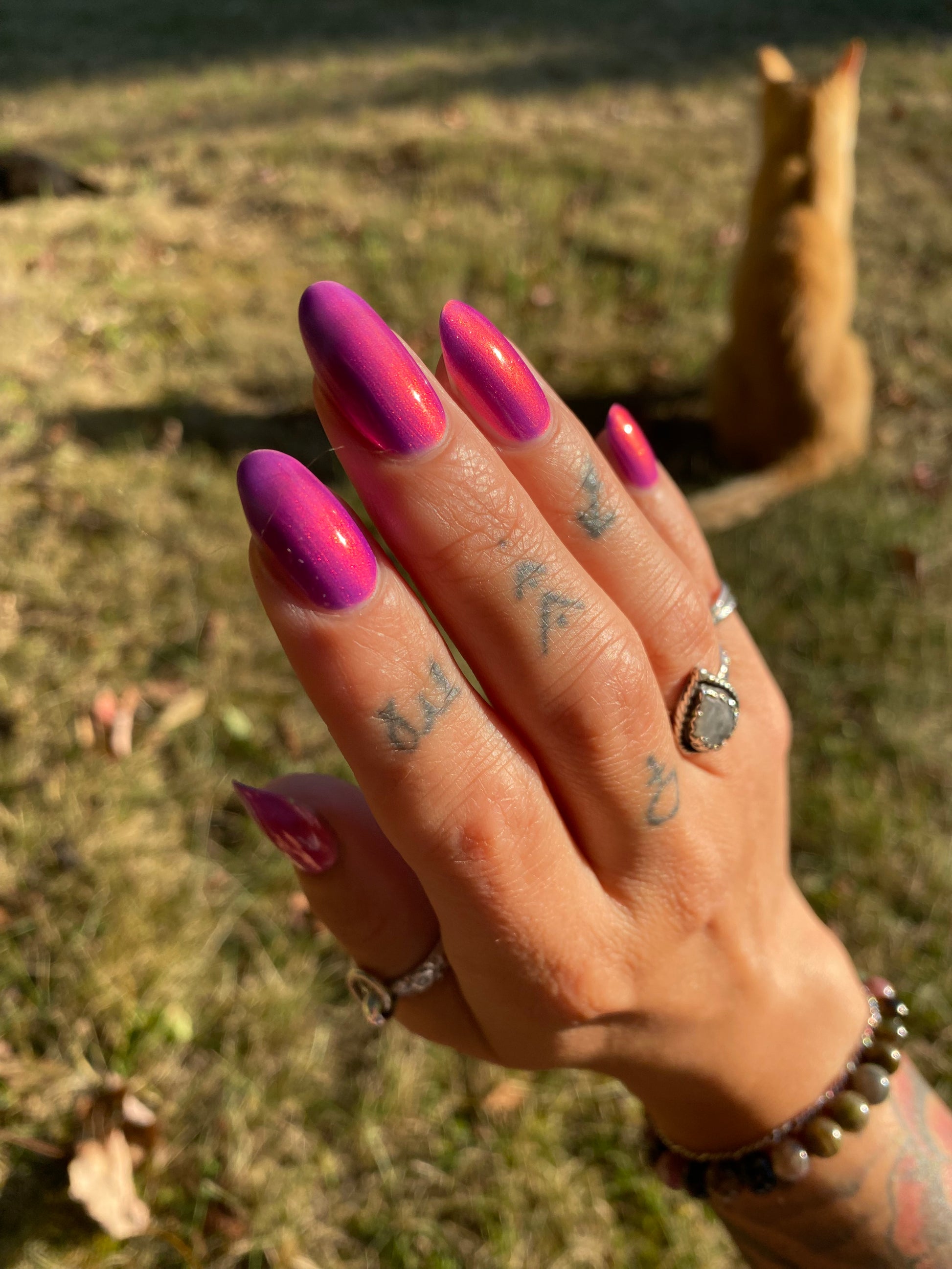 A neon pinkish purple with glowy reddish pink shimmer