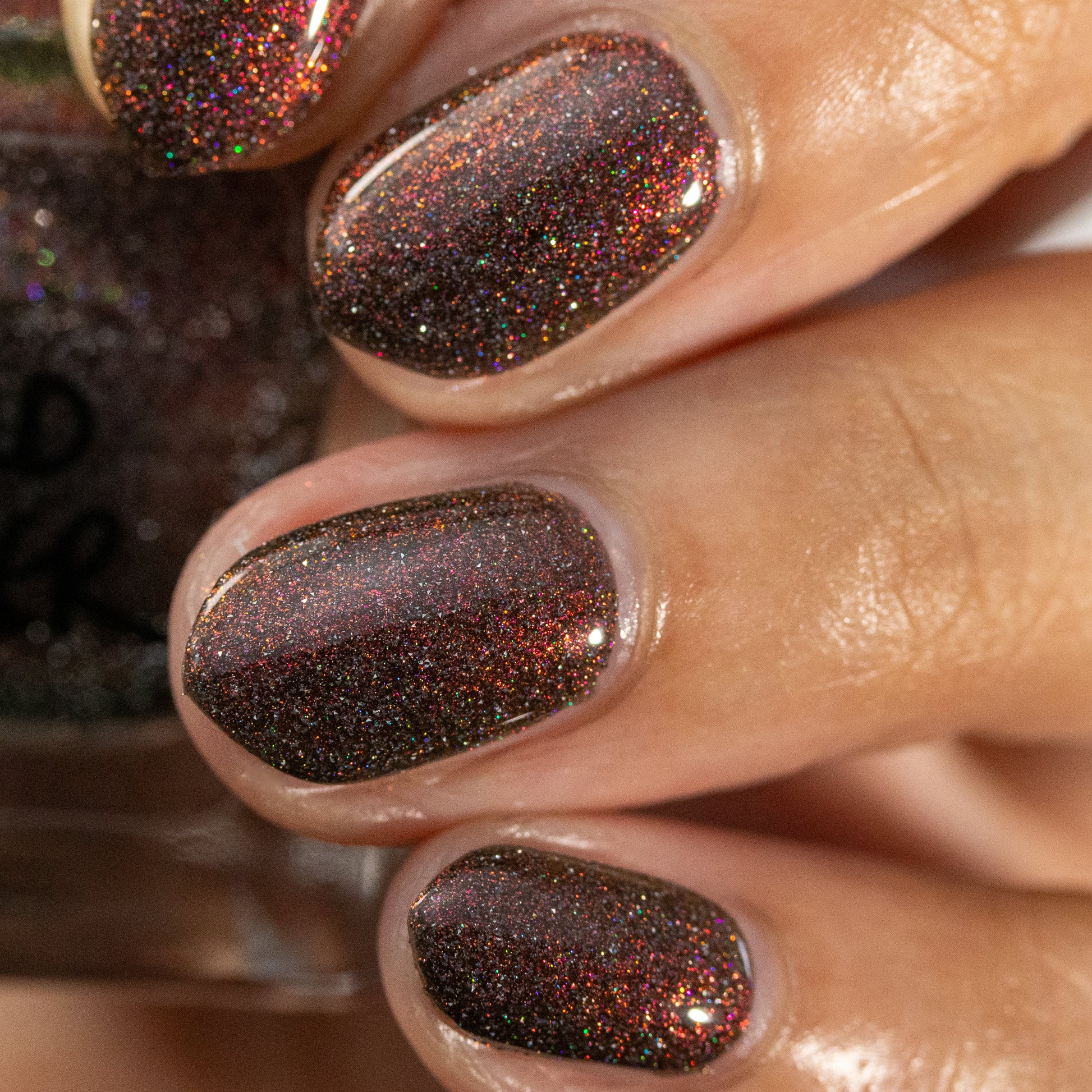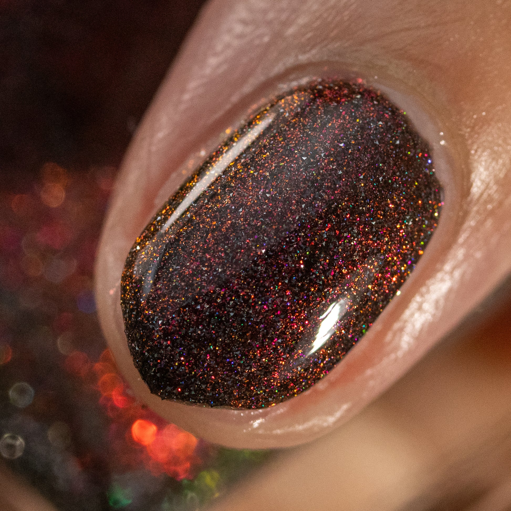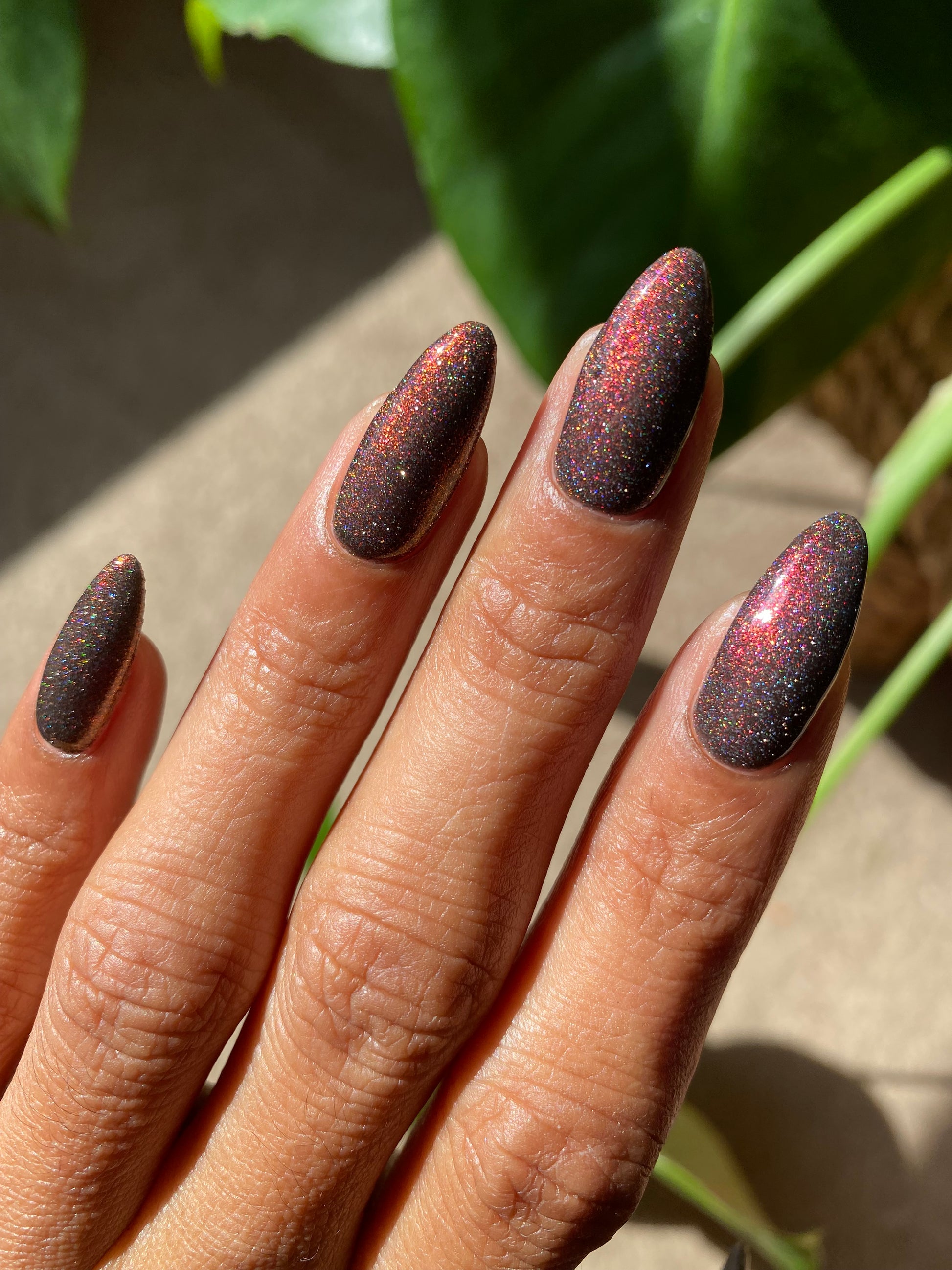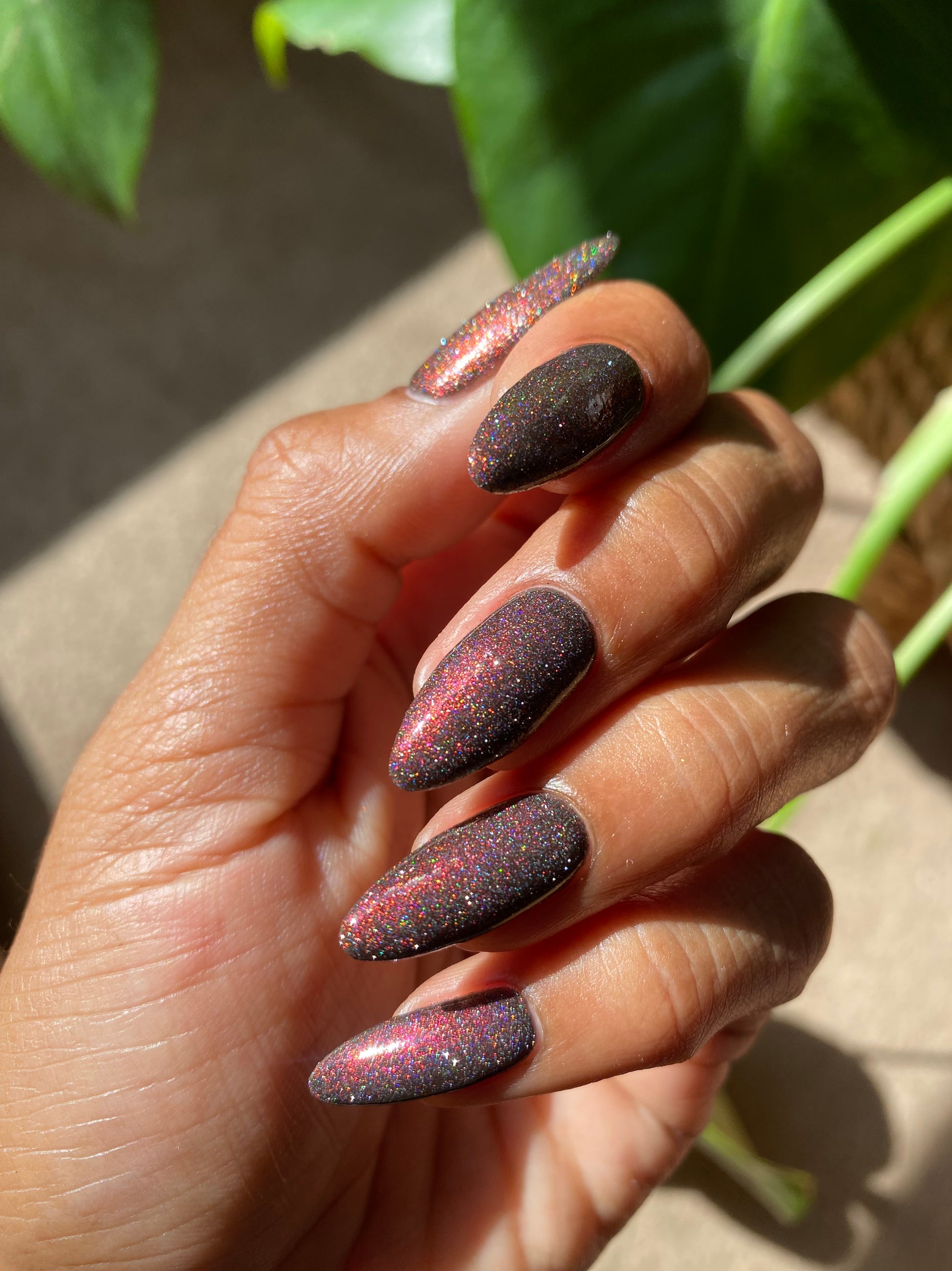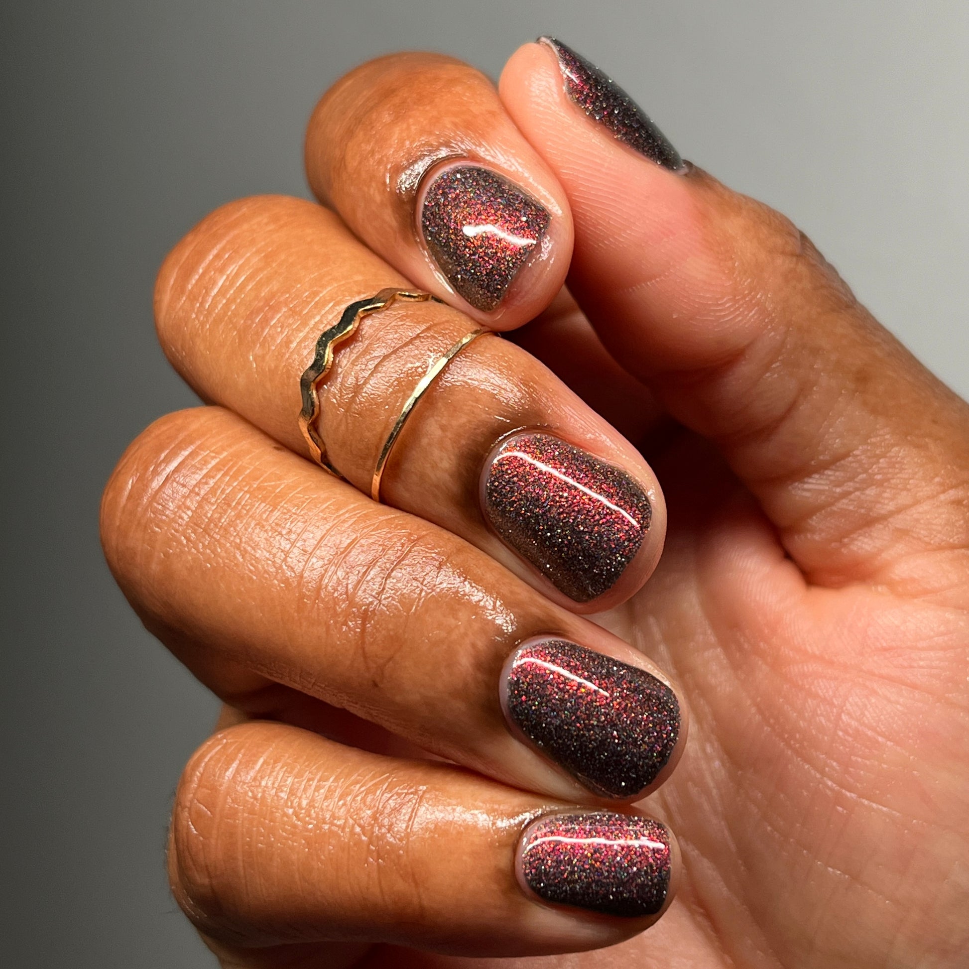 A deep cool, blackened brown jelly base with aurora shimmer that shifts from red to orange to gold, holographic pigment, and silver light reflective glitter