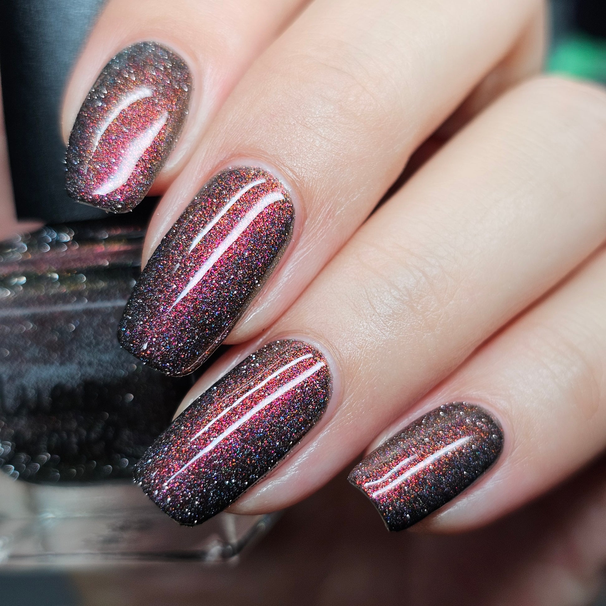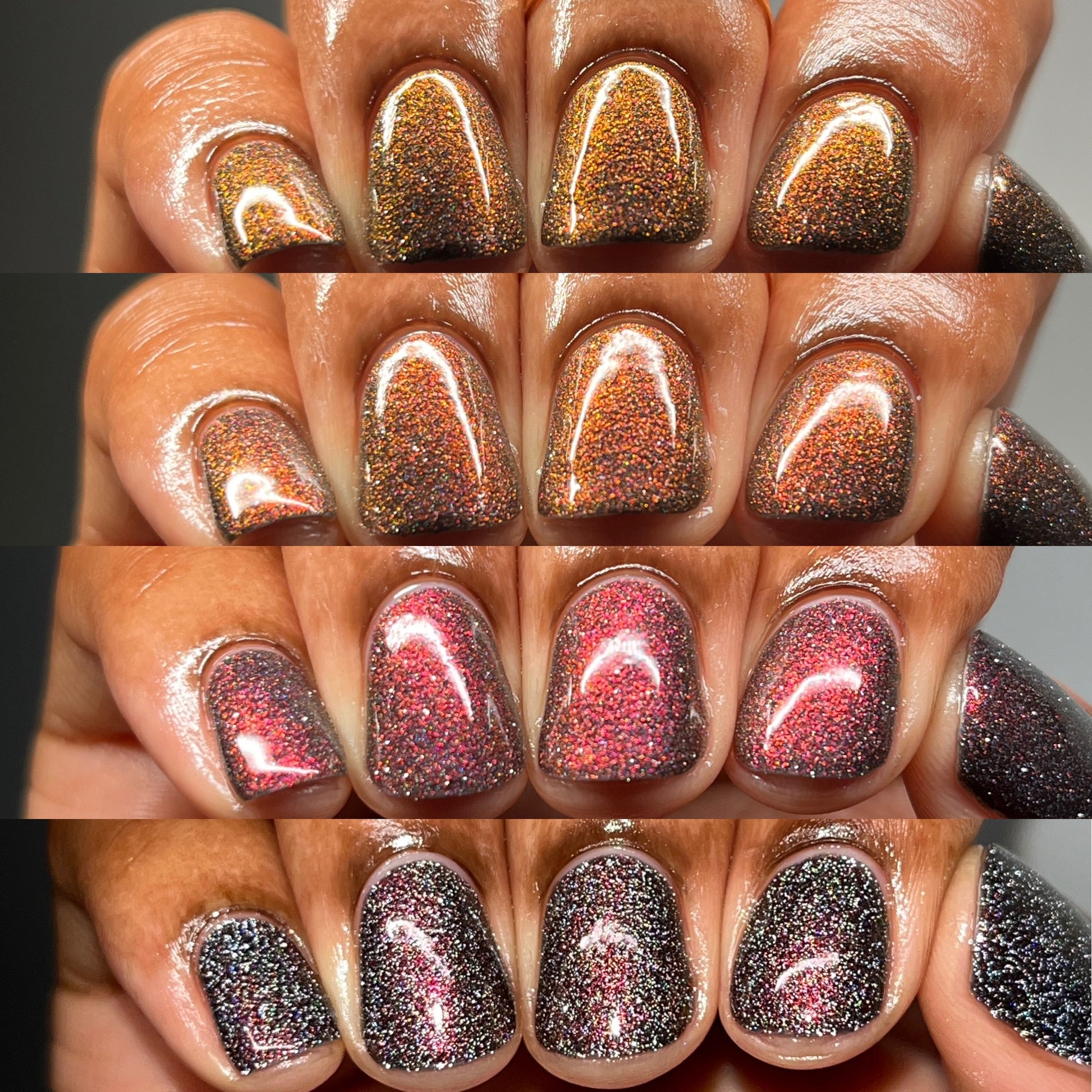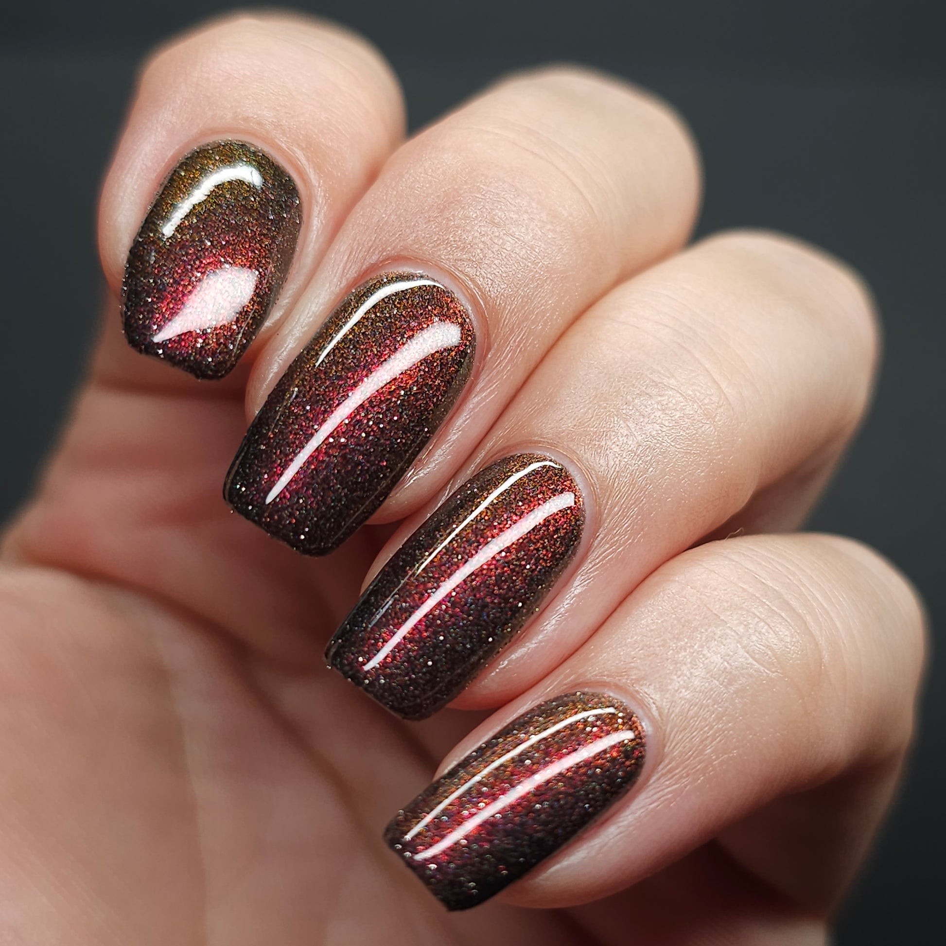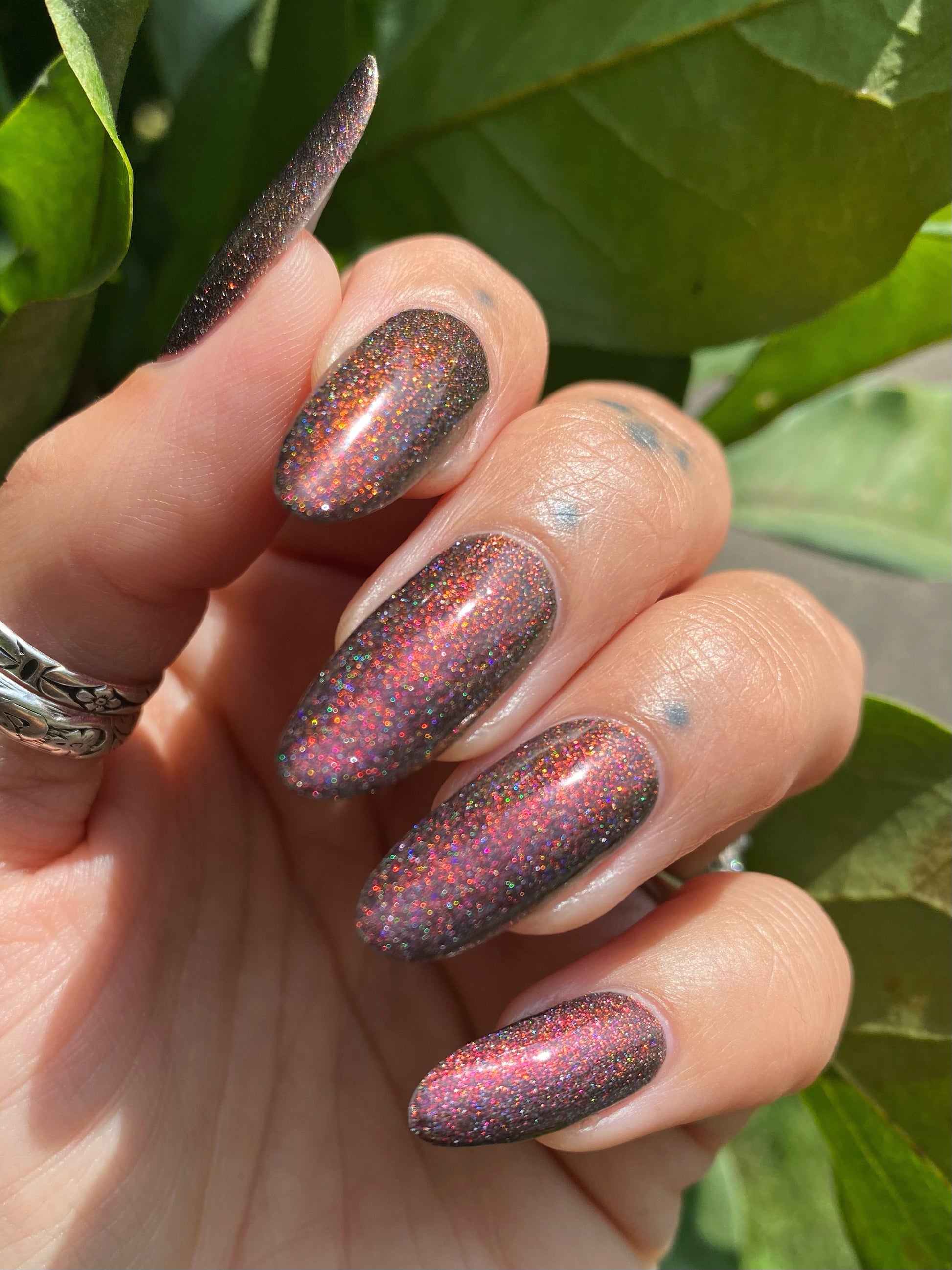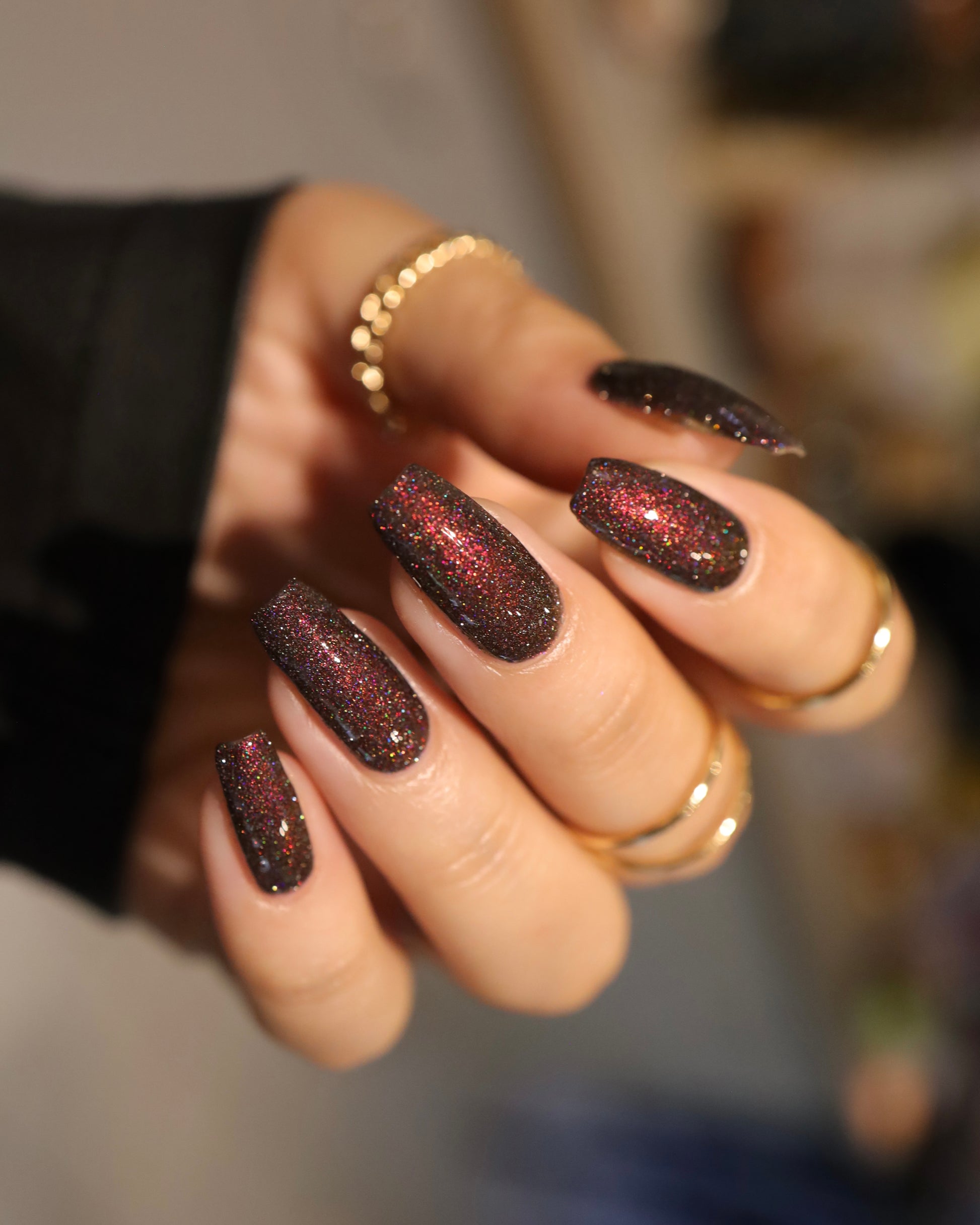 A deep cool, blackened brown jelly base with aurora shimmer that shifts from red to orange to gold, holographic pigment, and silver light reflective glitter