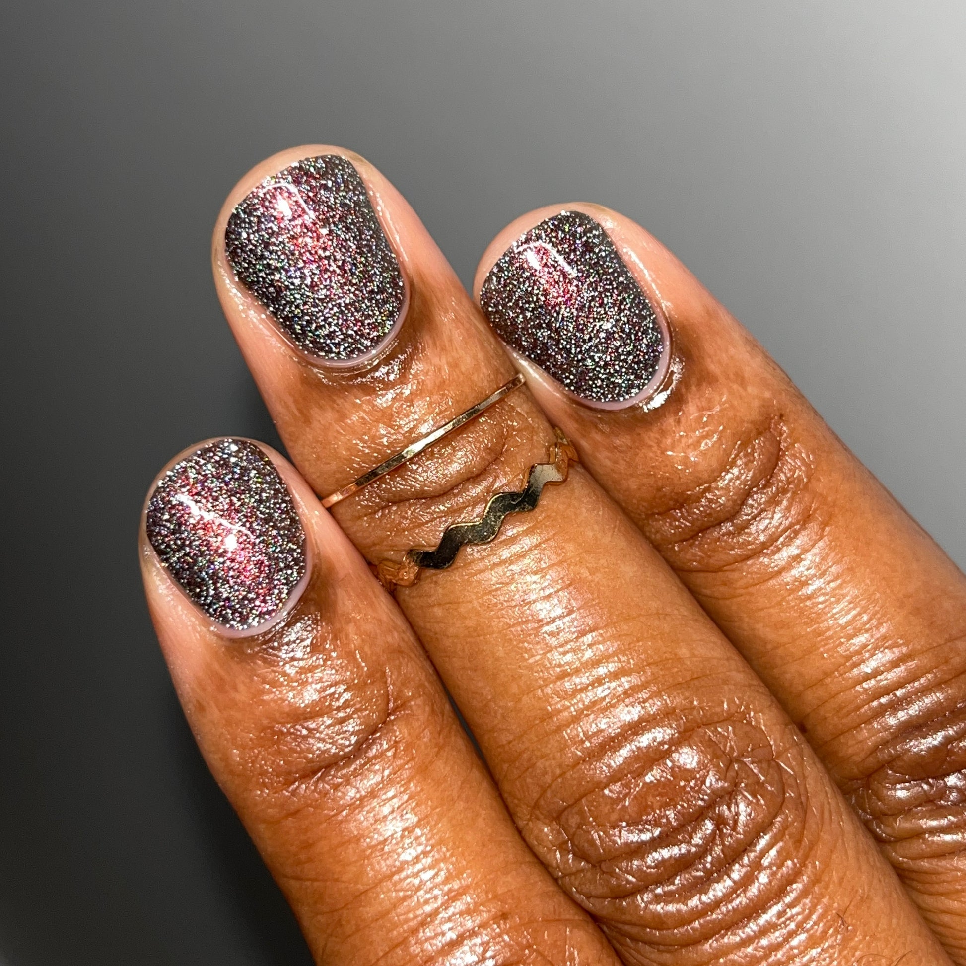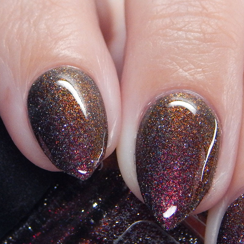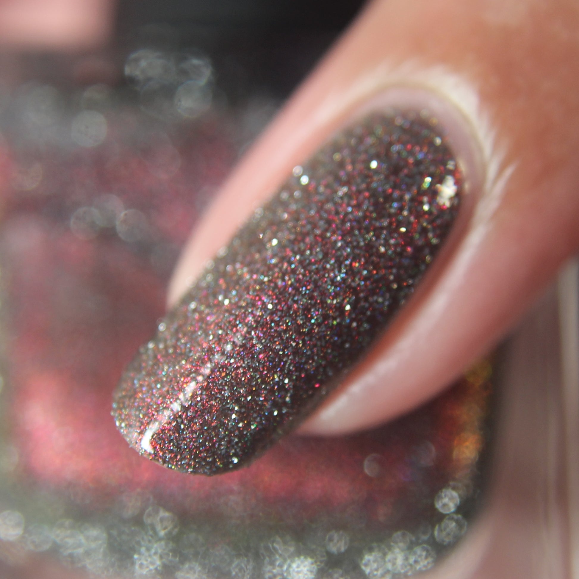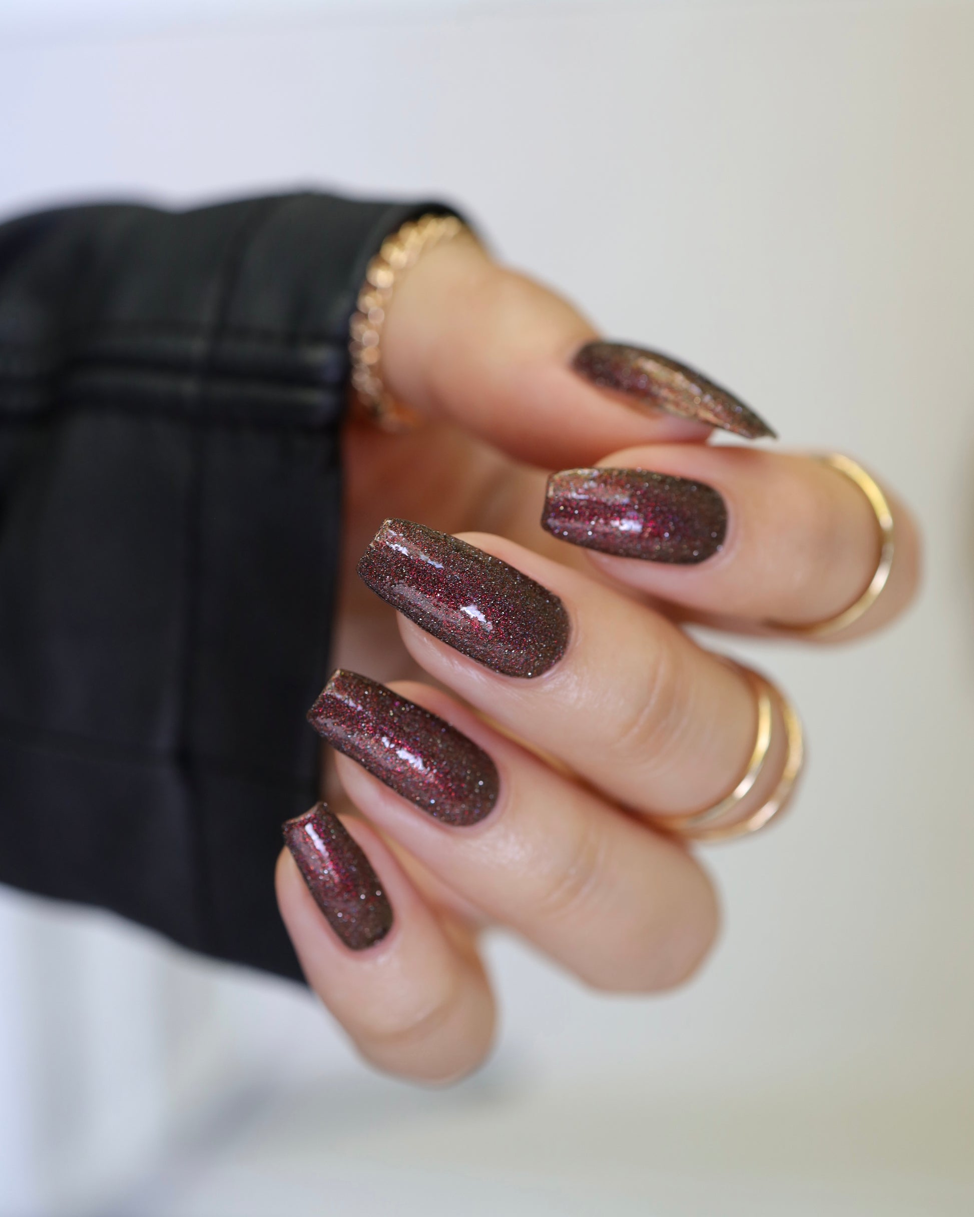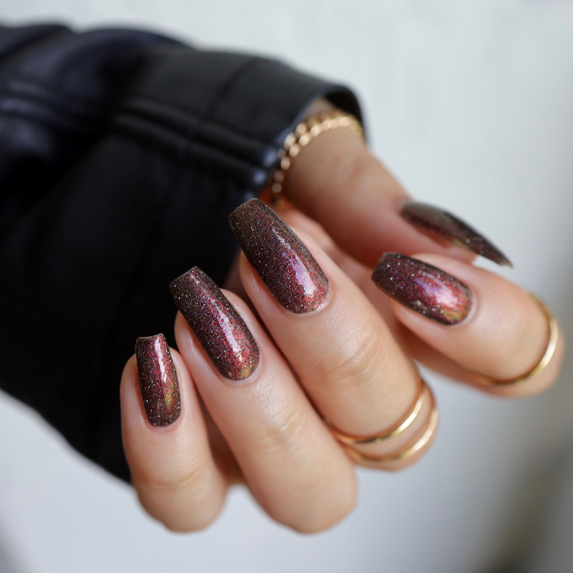 A deep cool, blackened brown jelly base with aurora shimmer that shifts from red to orange to gold, holographic pigment, and silver light reflective glitter