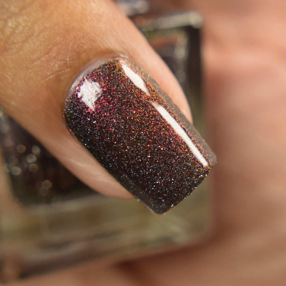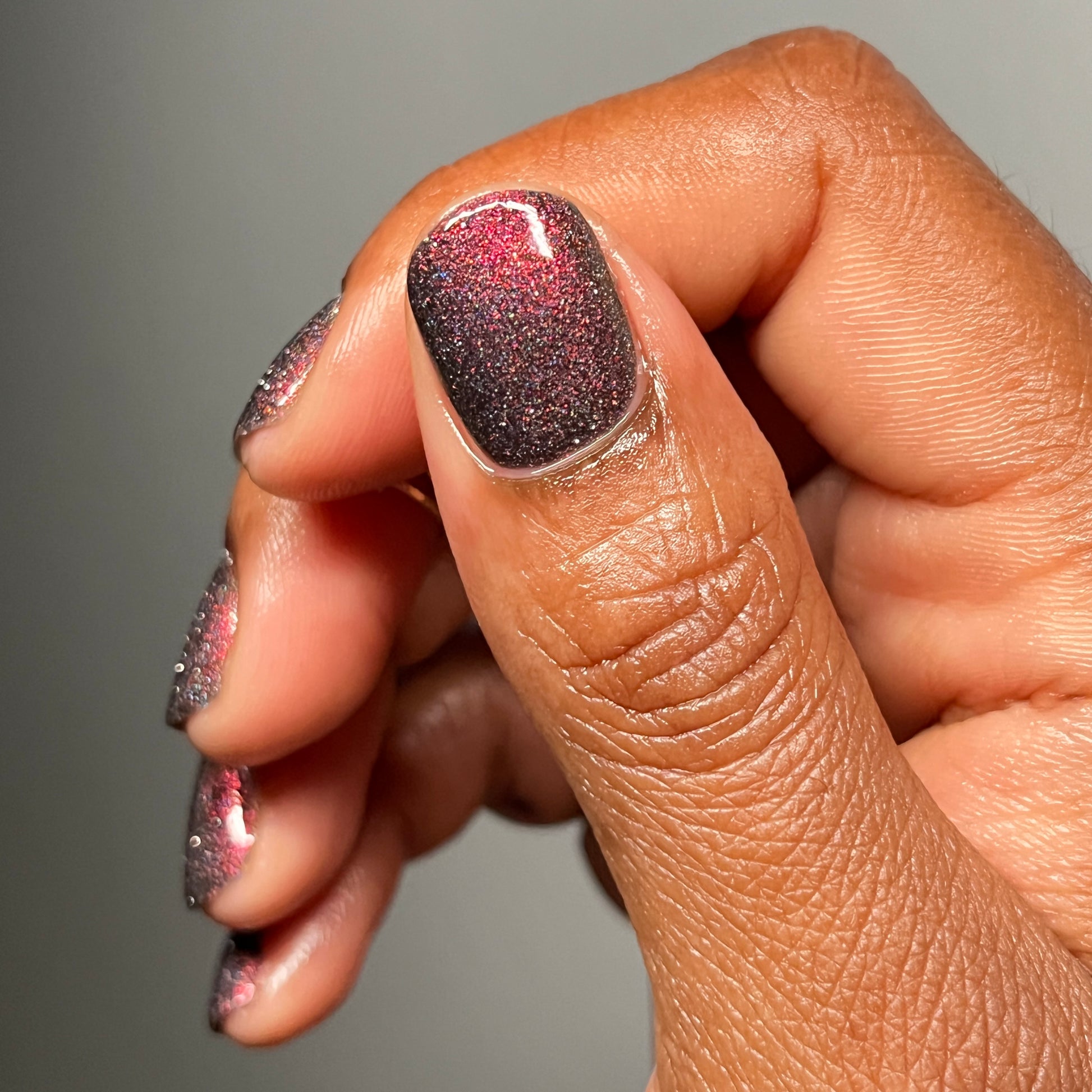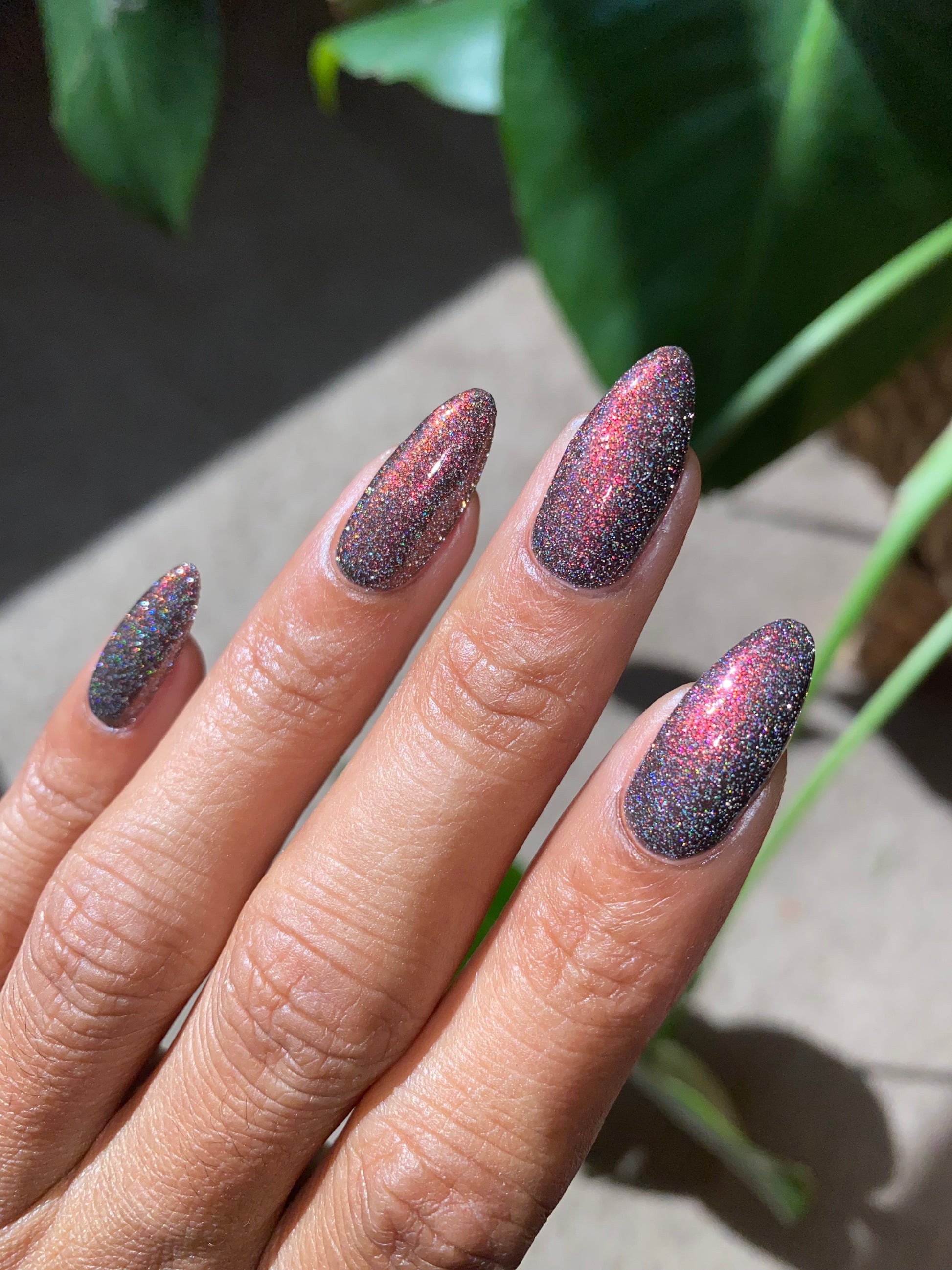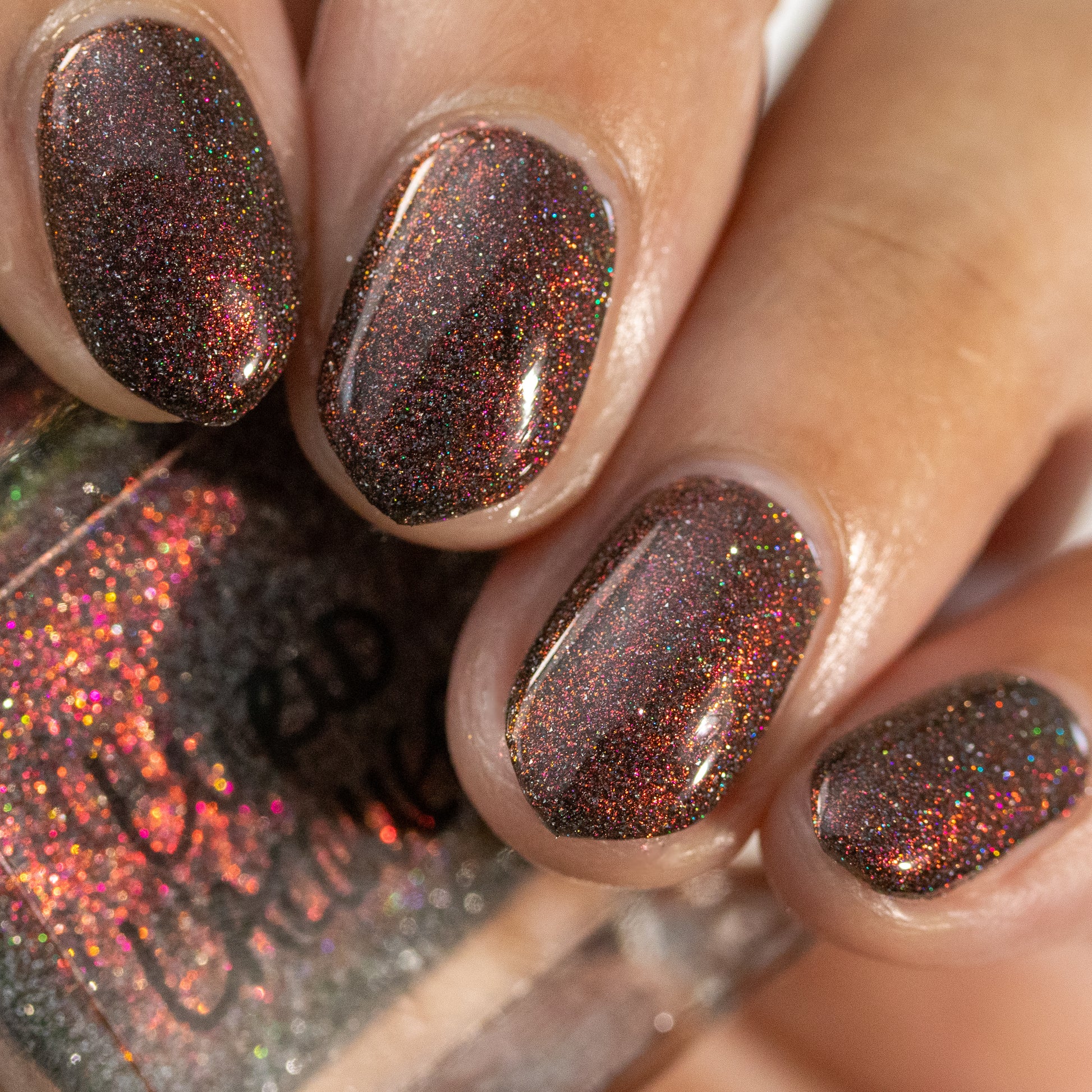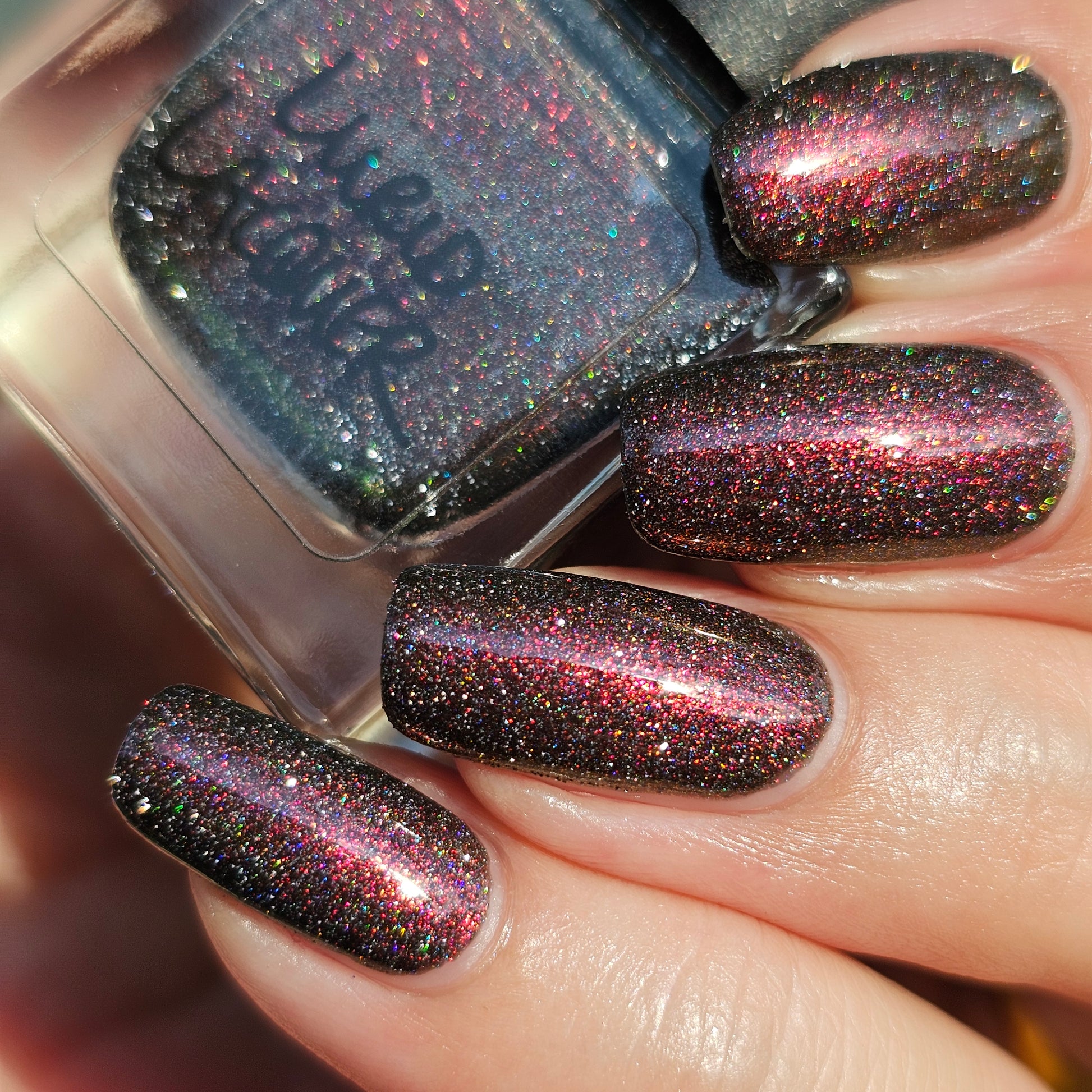 A deep cool, blackened brown jelly base with aurora shimmer that shifts from red to orange to gold, holographic pigment, and silver light reflective glitter