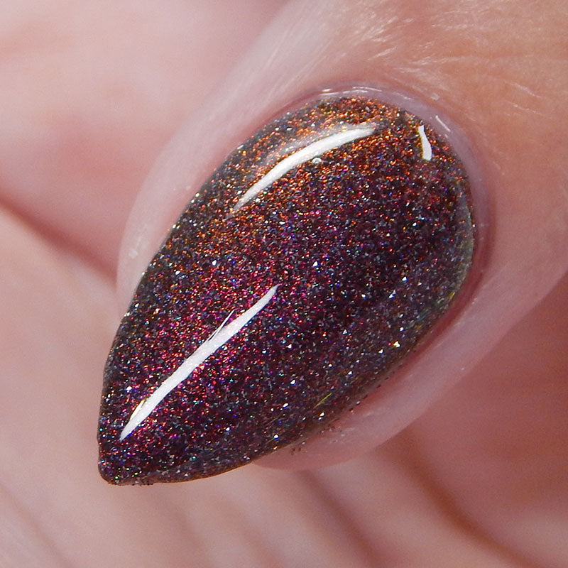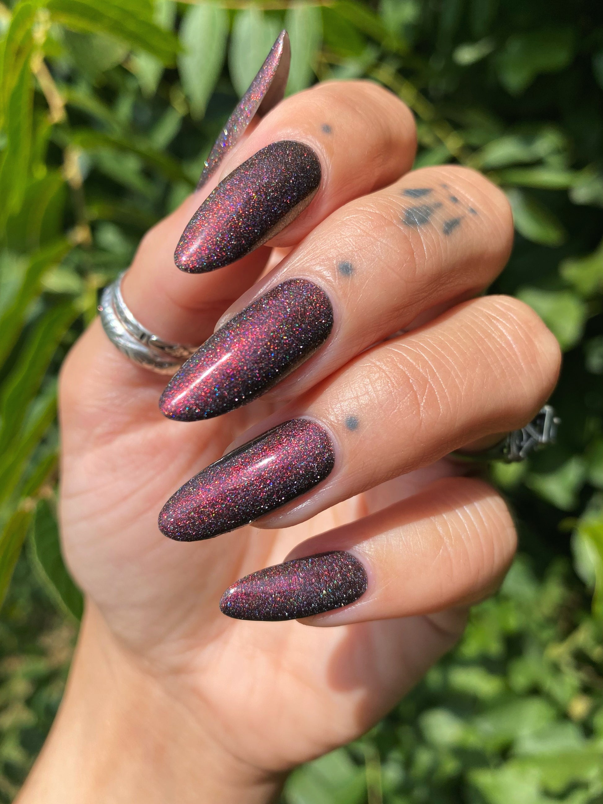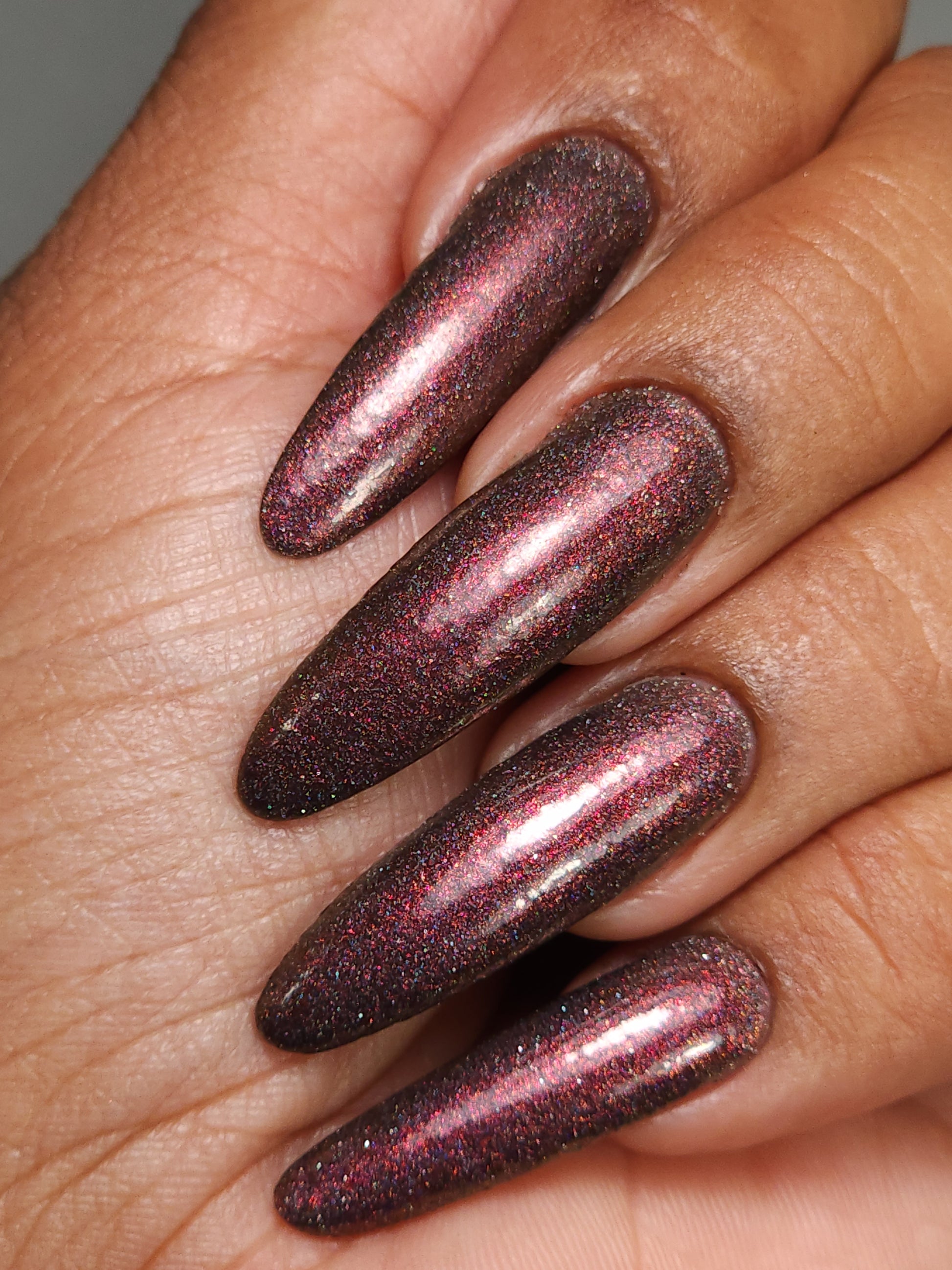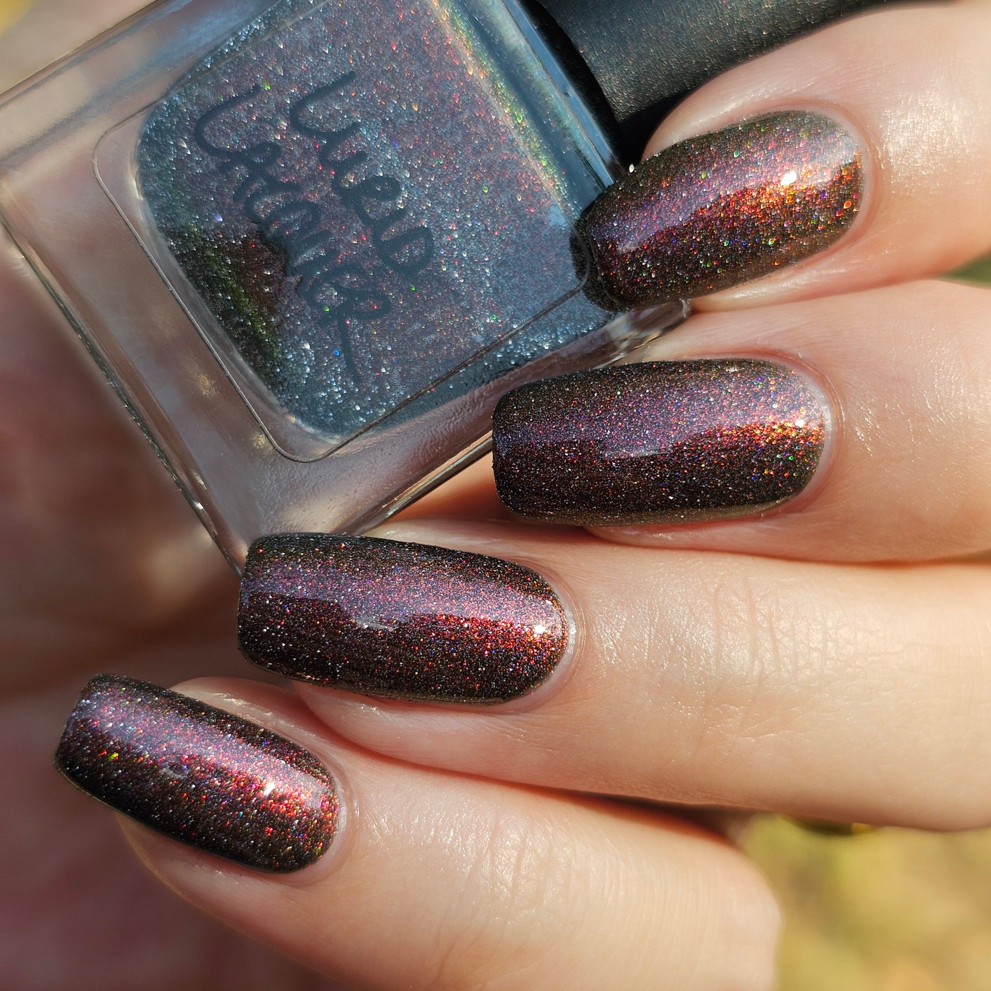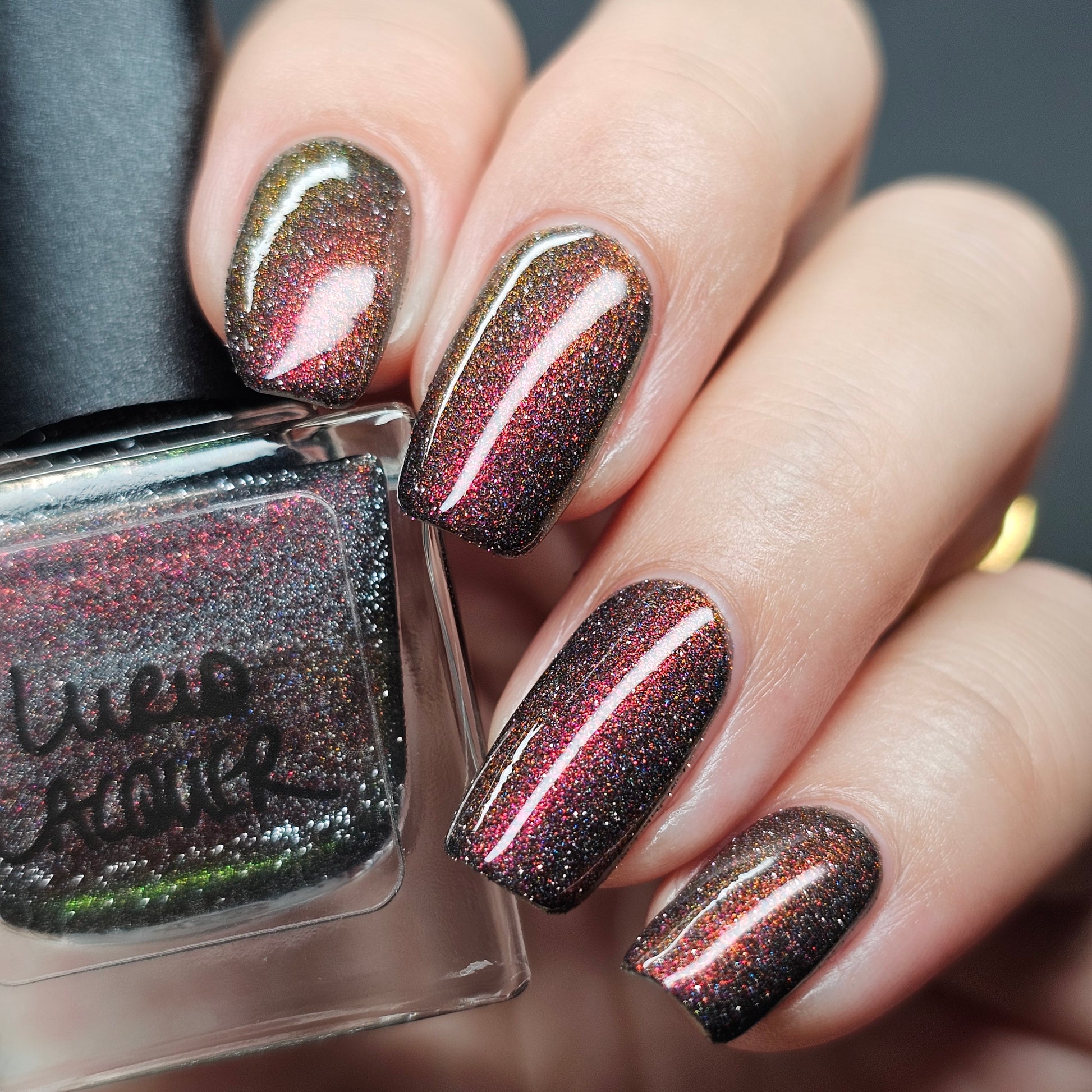 A deep cool, blackened brown jelly base with aurora shimmer that shifts from red to orange to gold, holographic pigment, and silver light reflective glitter