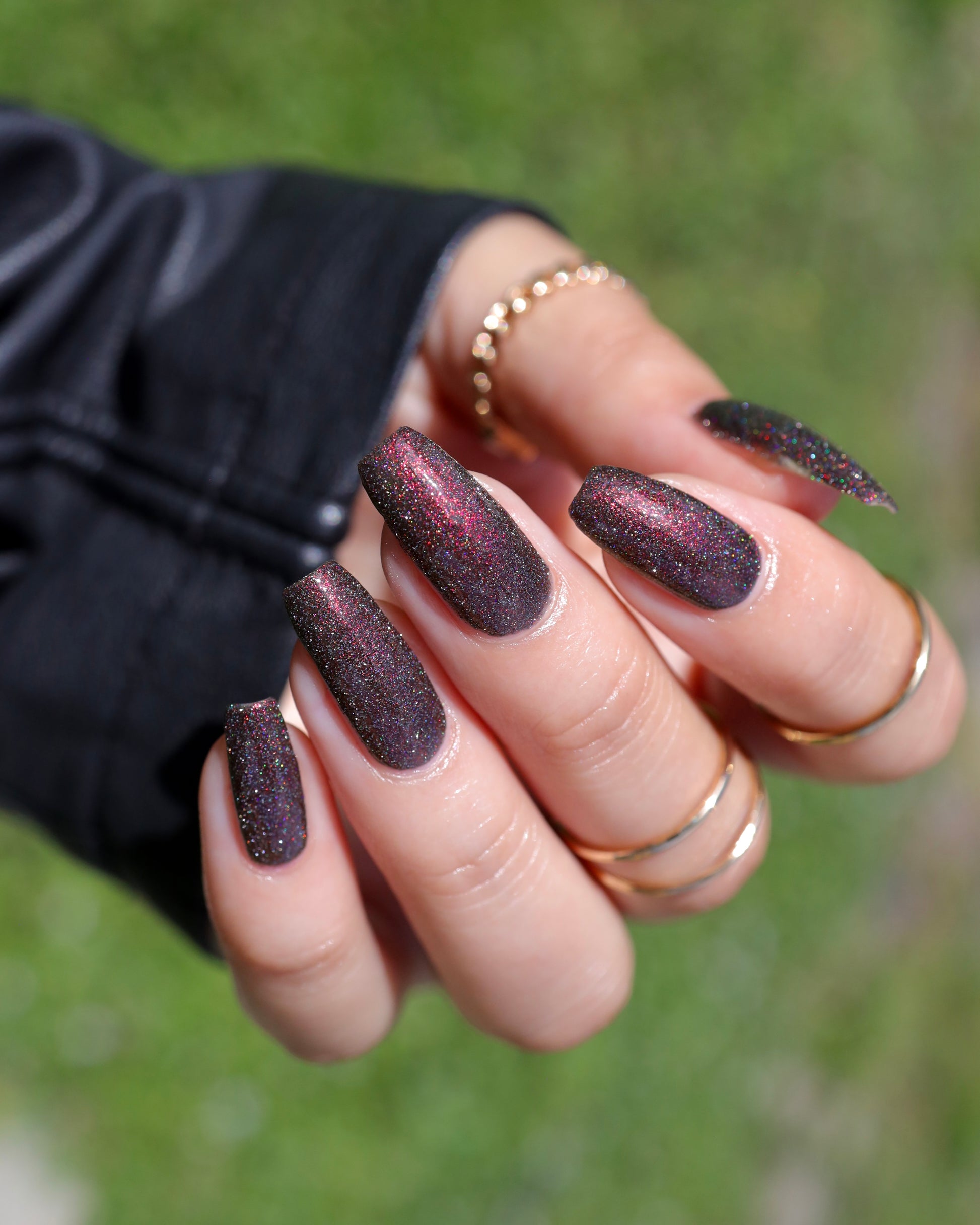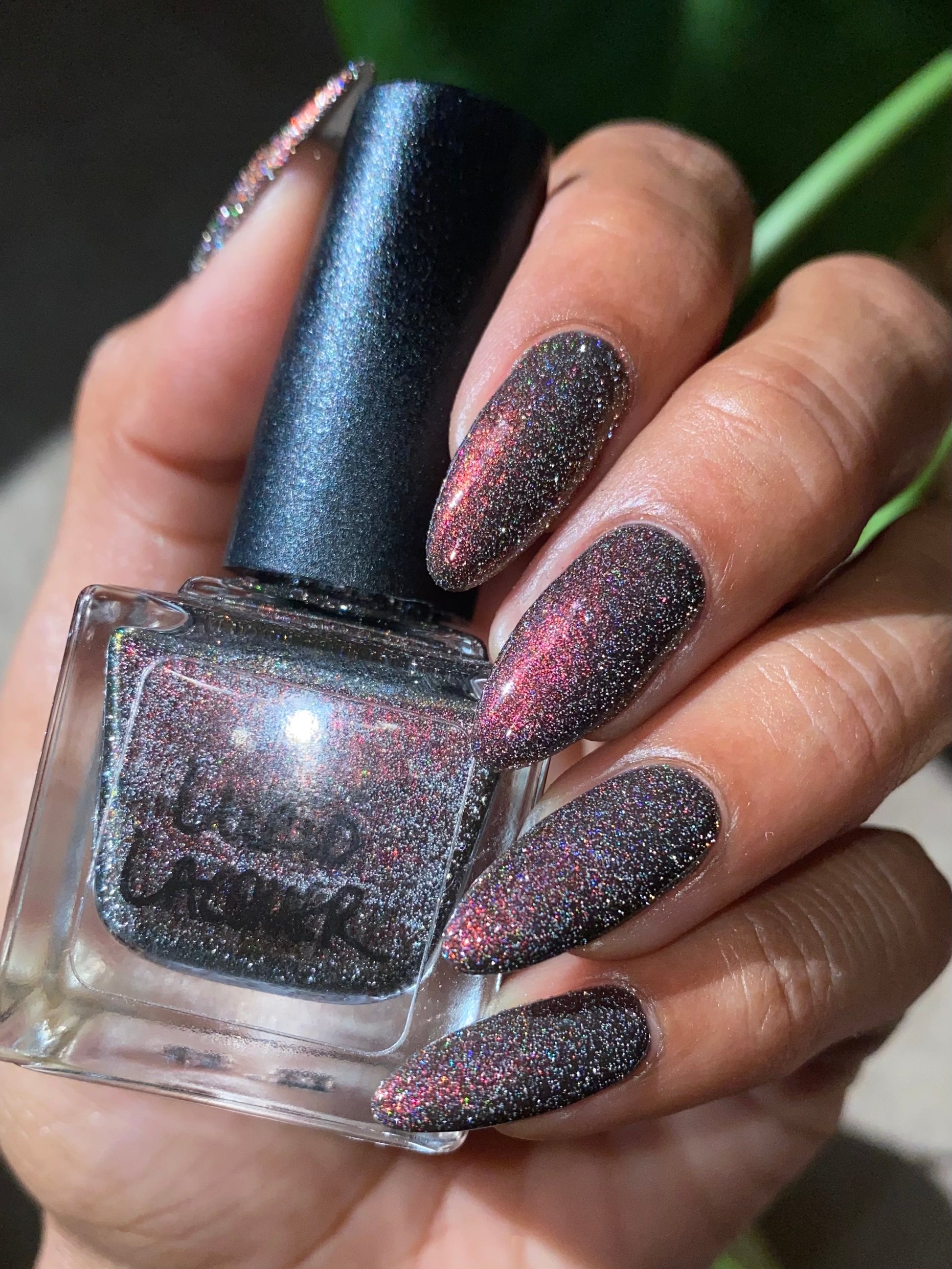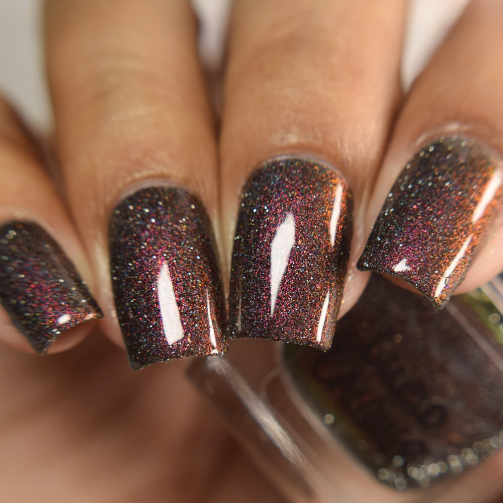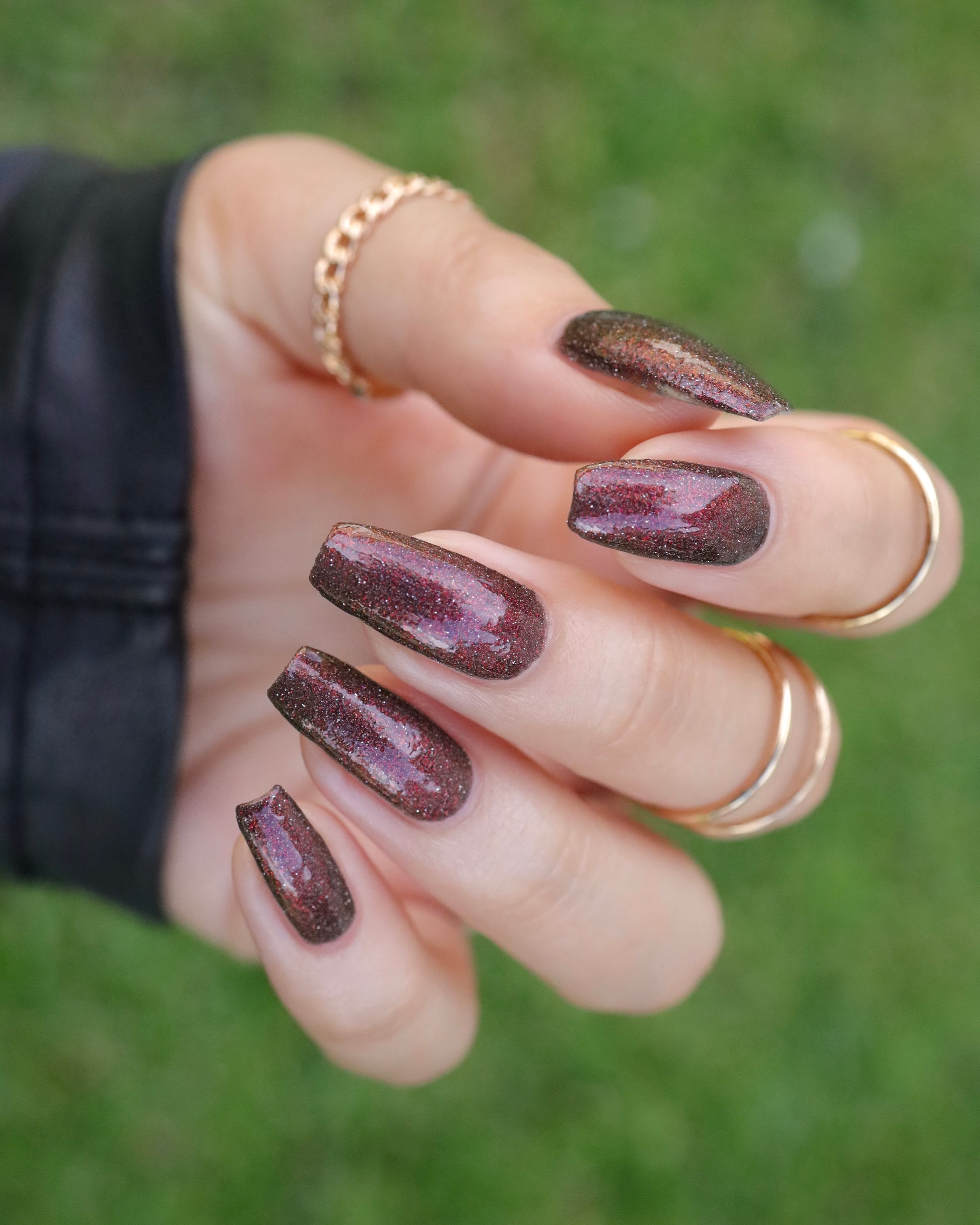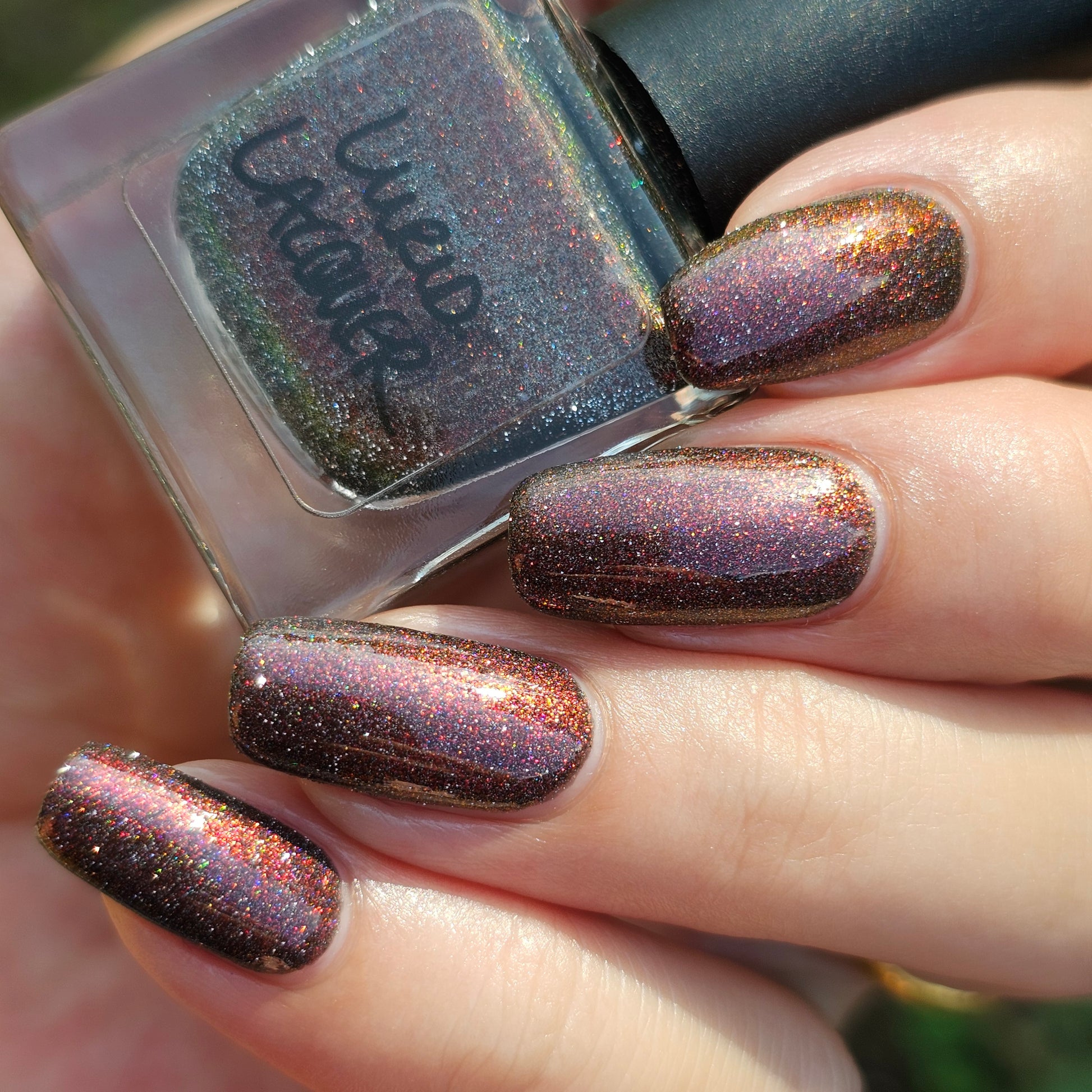 A deep cool, blackened brown jelly base with aurora shimmer that shifts from red to orange to gold, holographic pigment, and silver light reflective glitter