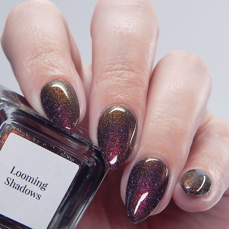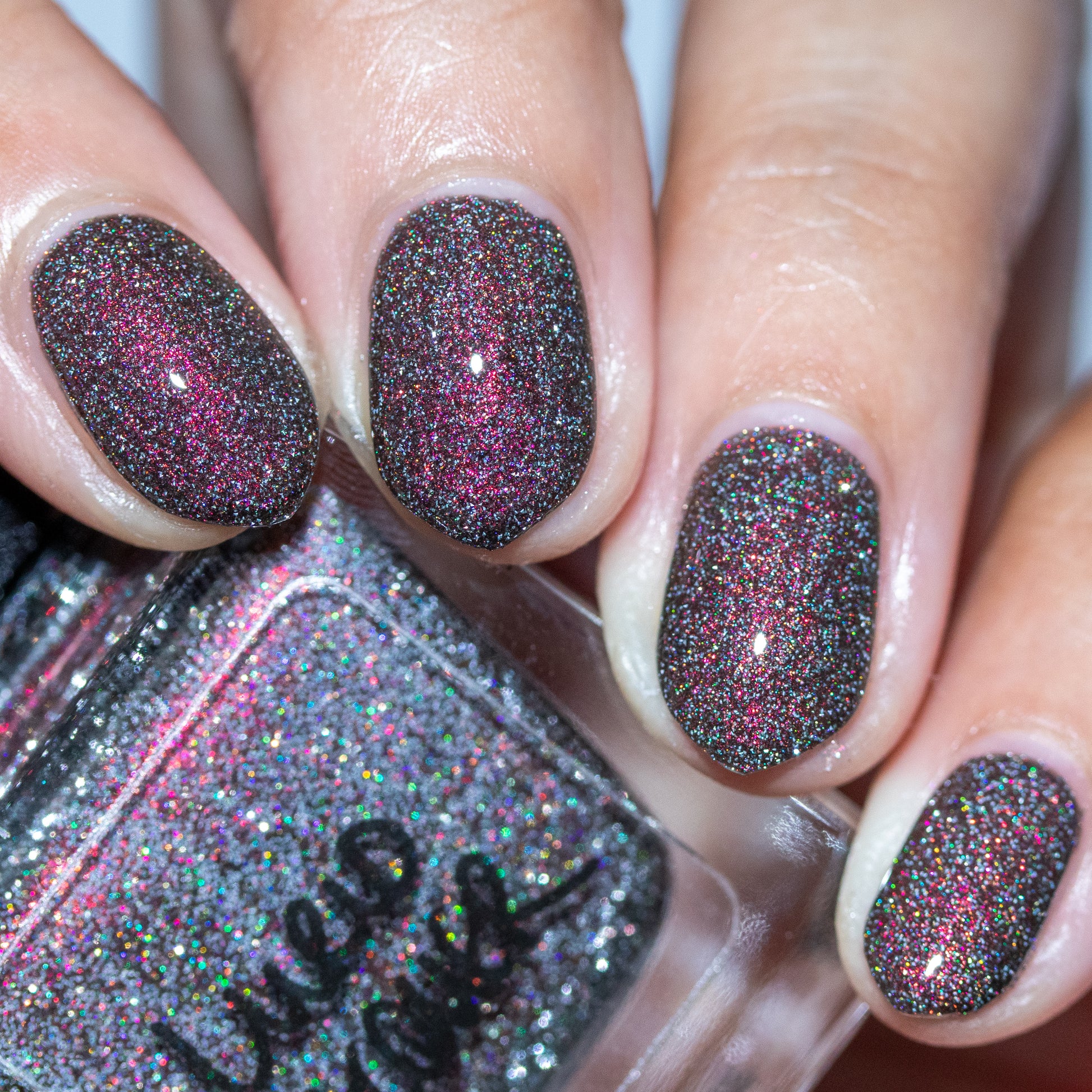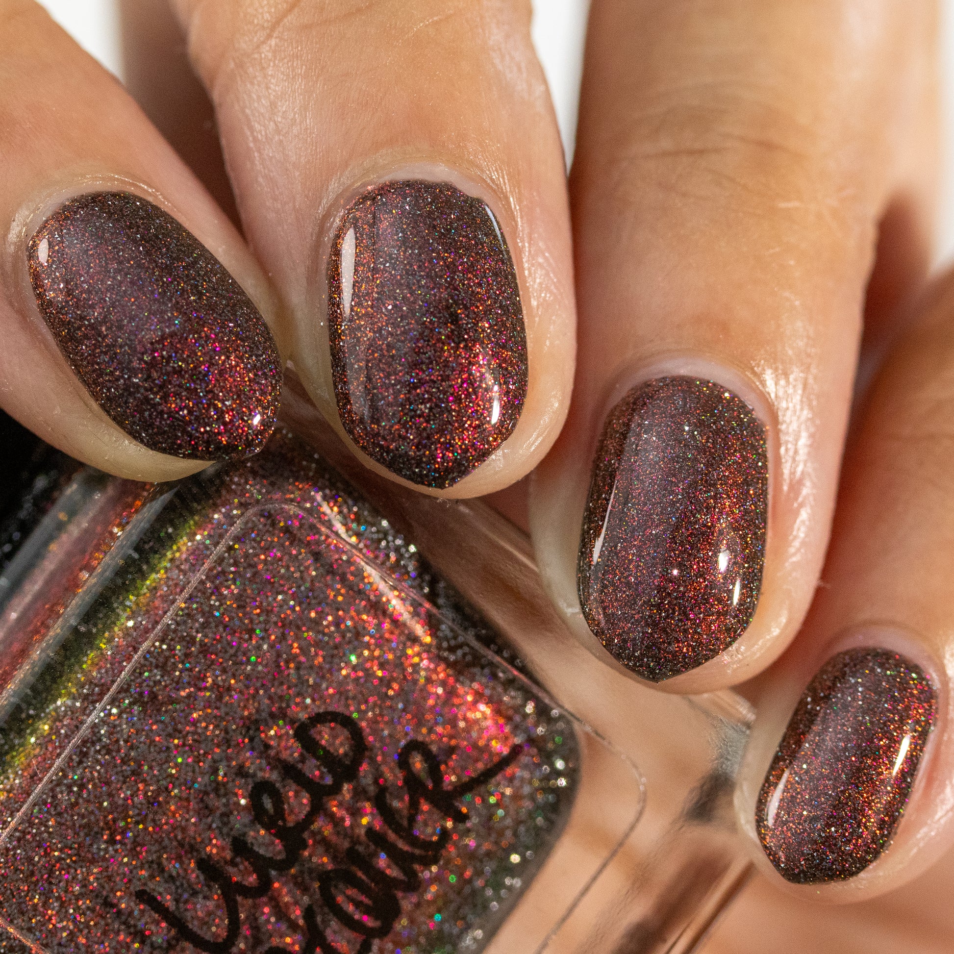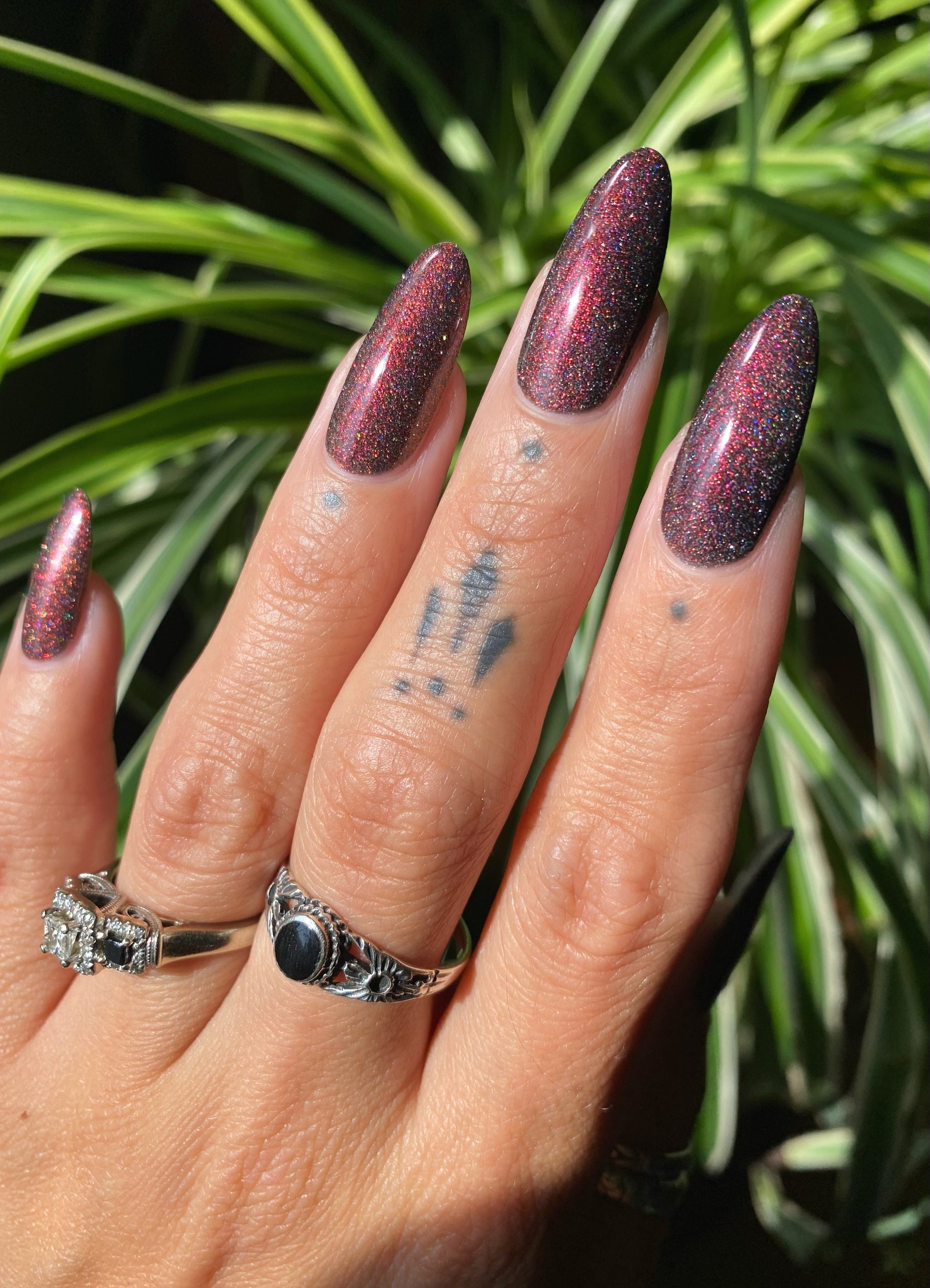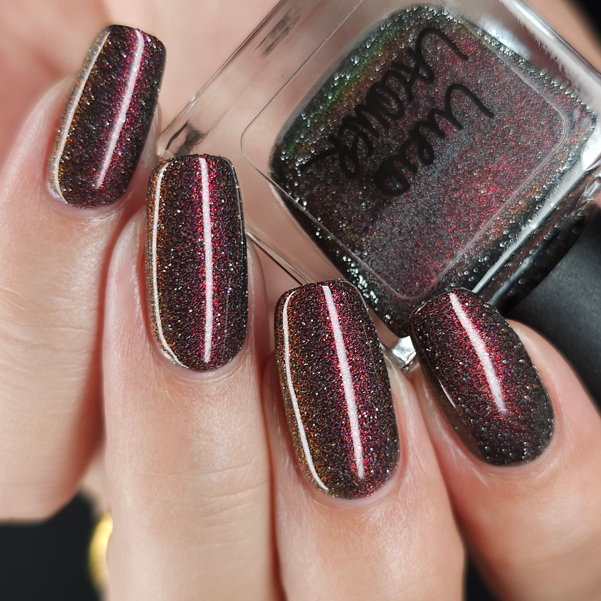 A deep cool, blackened brown jelly base with aurora shimmer that shifts from red to orange to gold, holographic pigment, and silver light reflective glitter