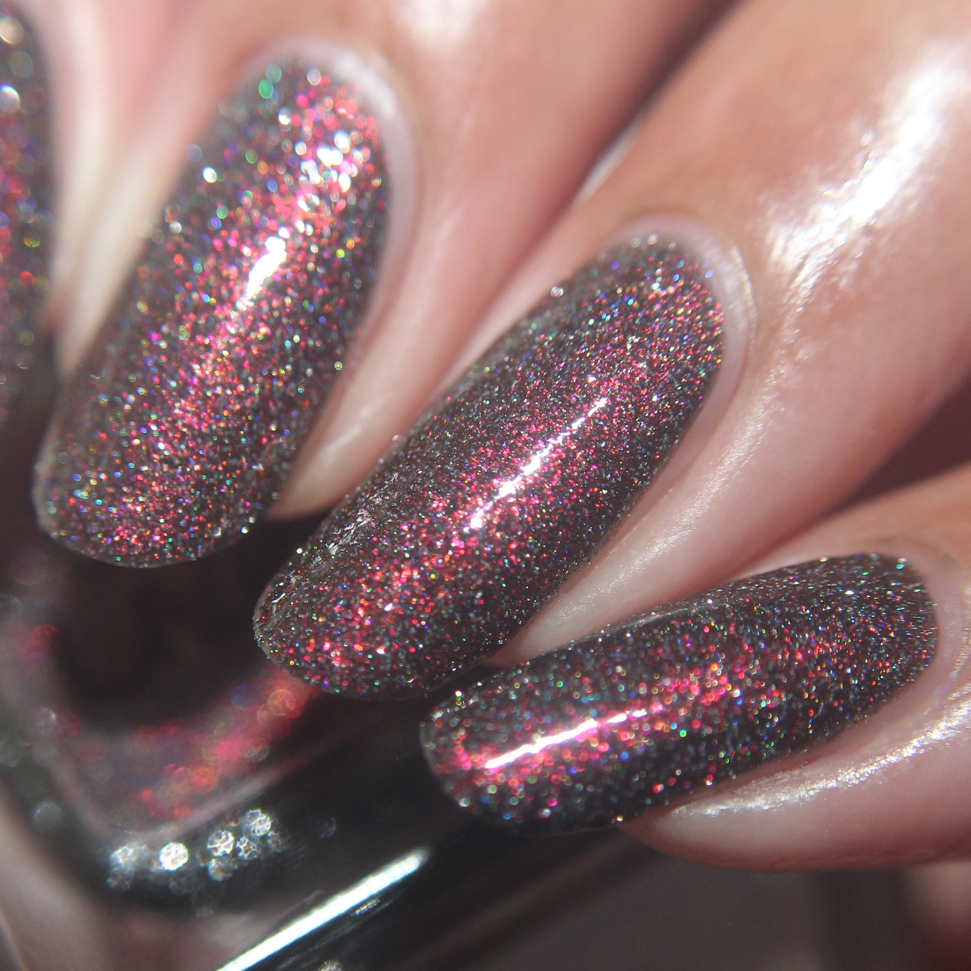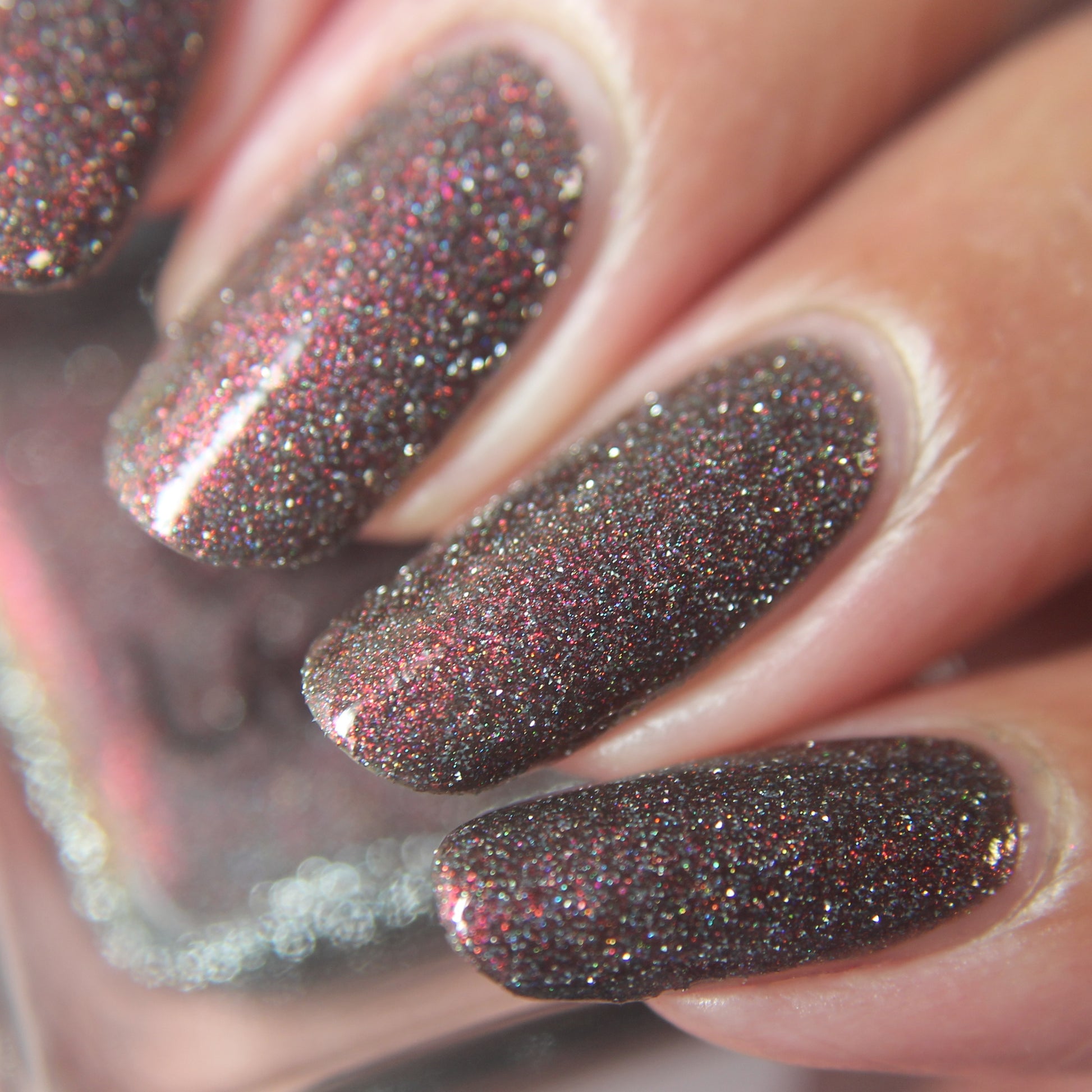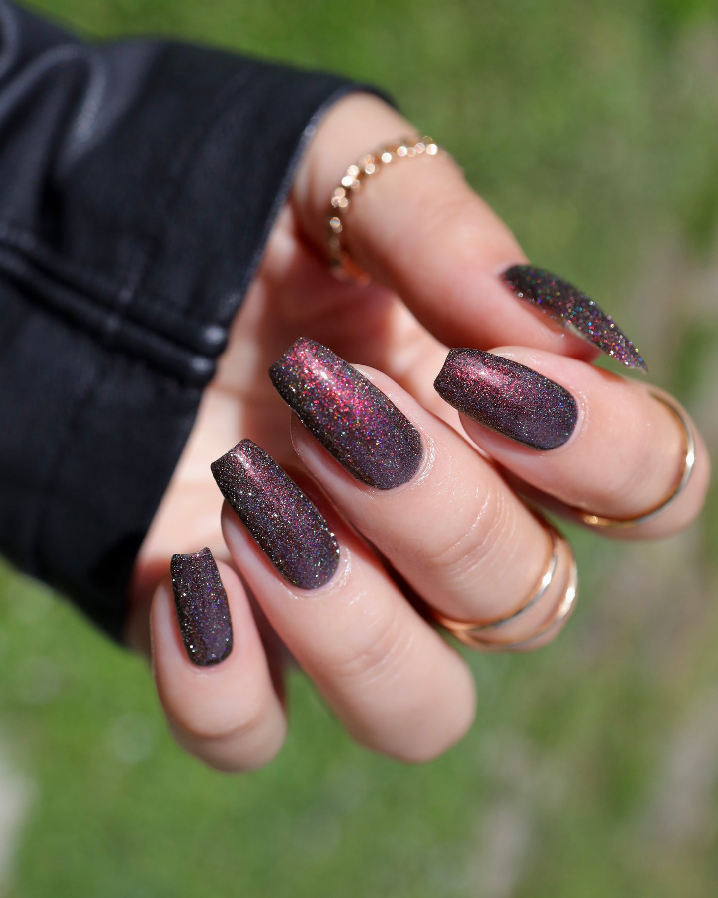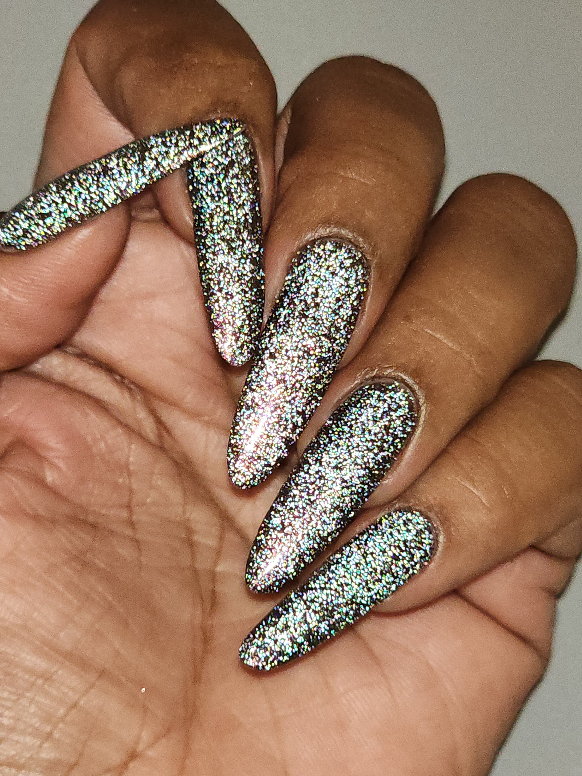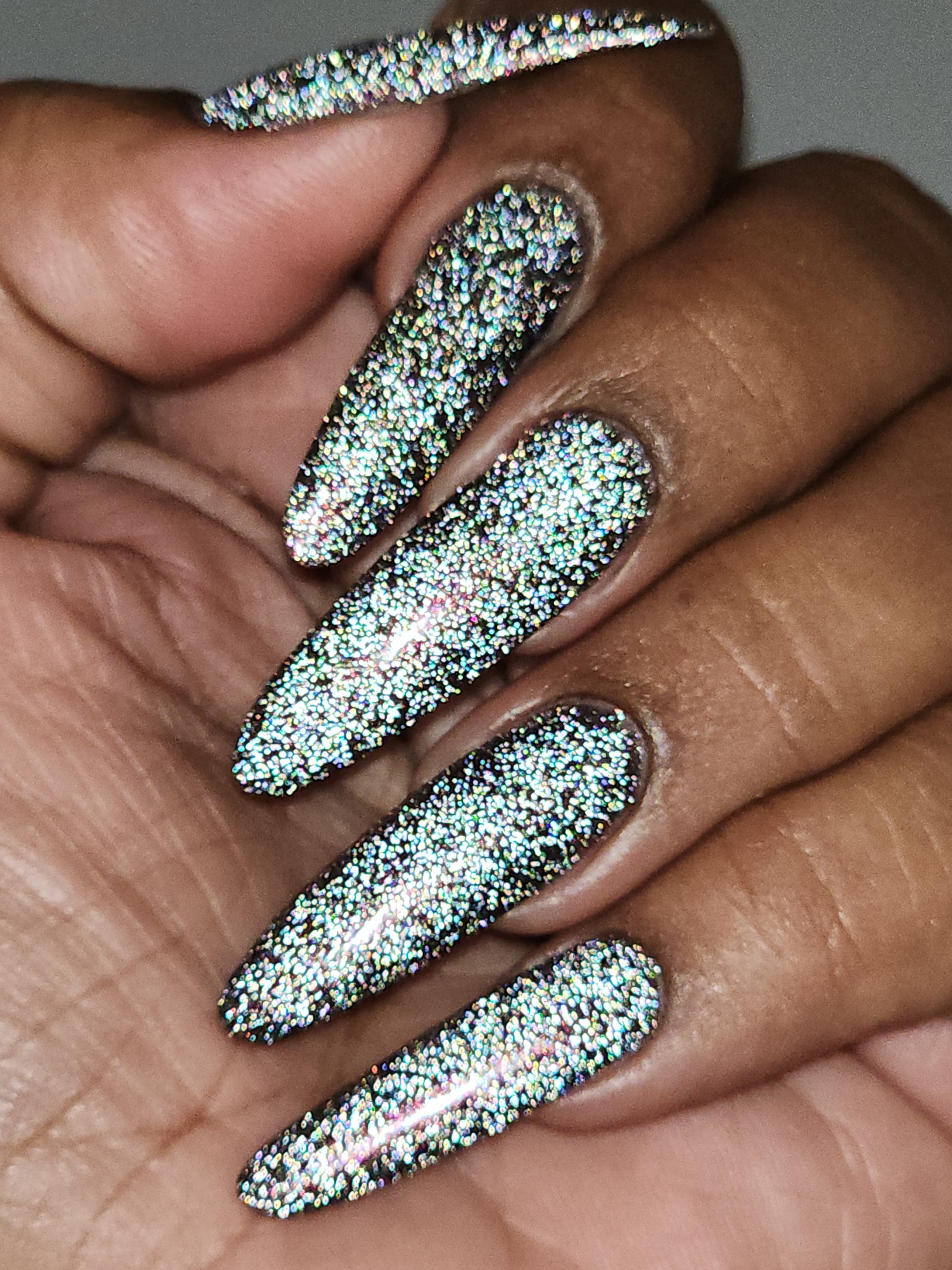 Please note: Reflective glitter polishes are textured and dry down with a gritty, sandpaper feeling. To make them look smooth and glossy, I recommend applying 2-3 coats of the polish, then applying one coat of a glitter smoother, followed by one coat of top coat.