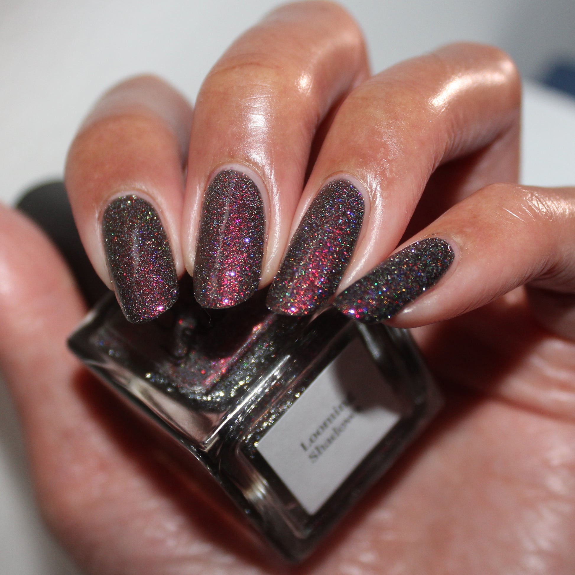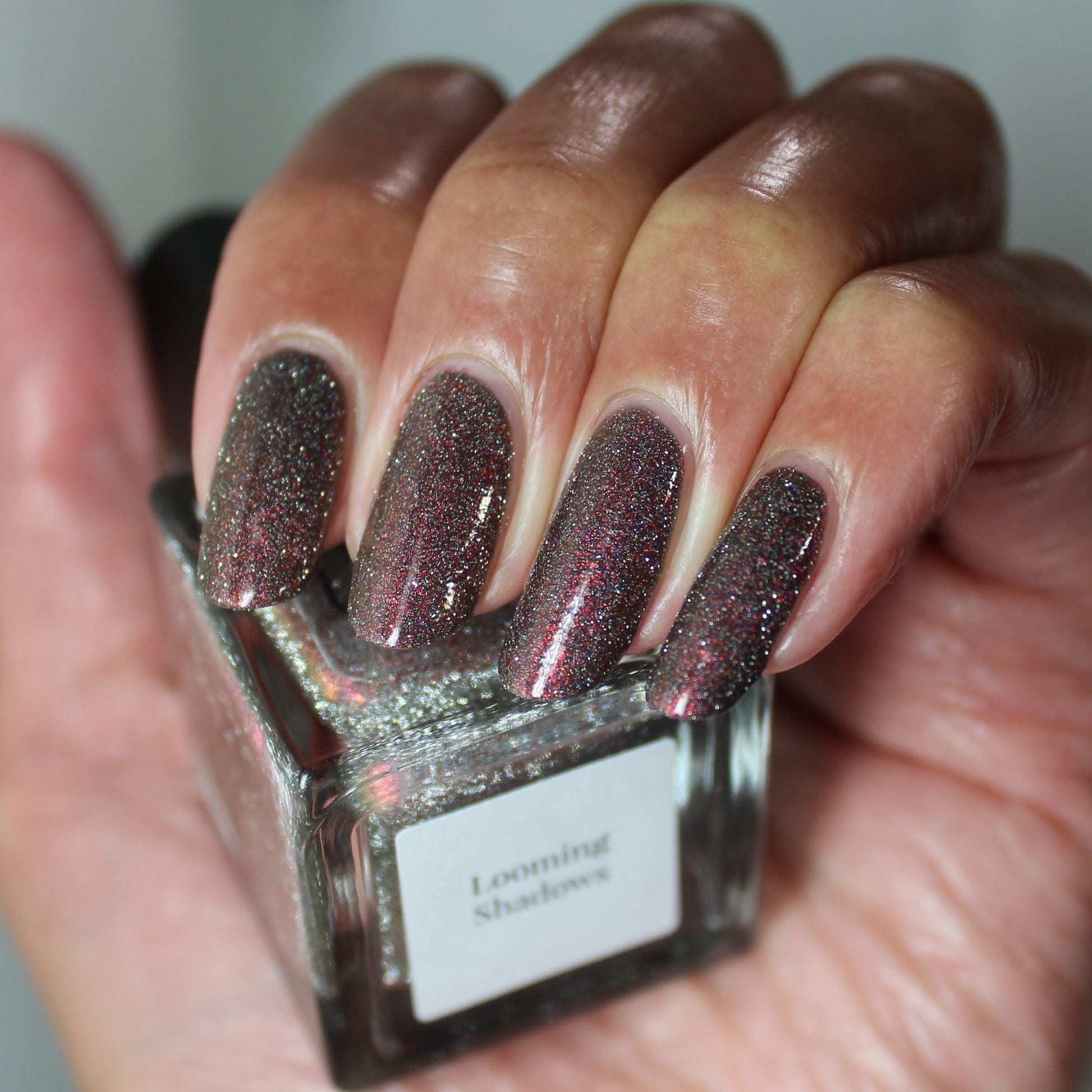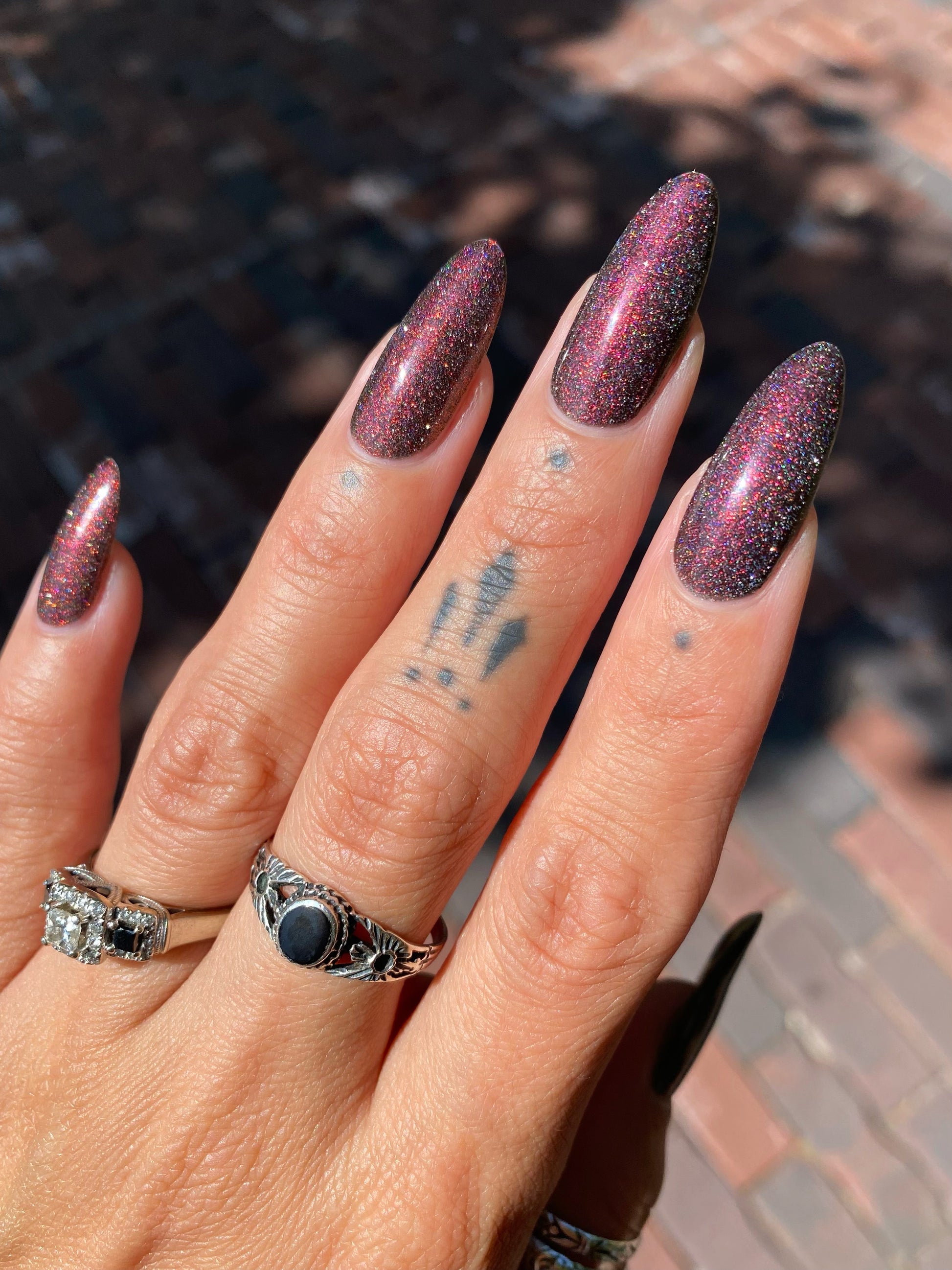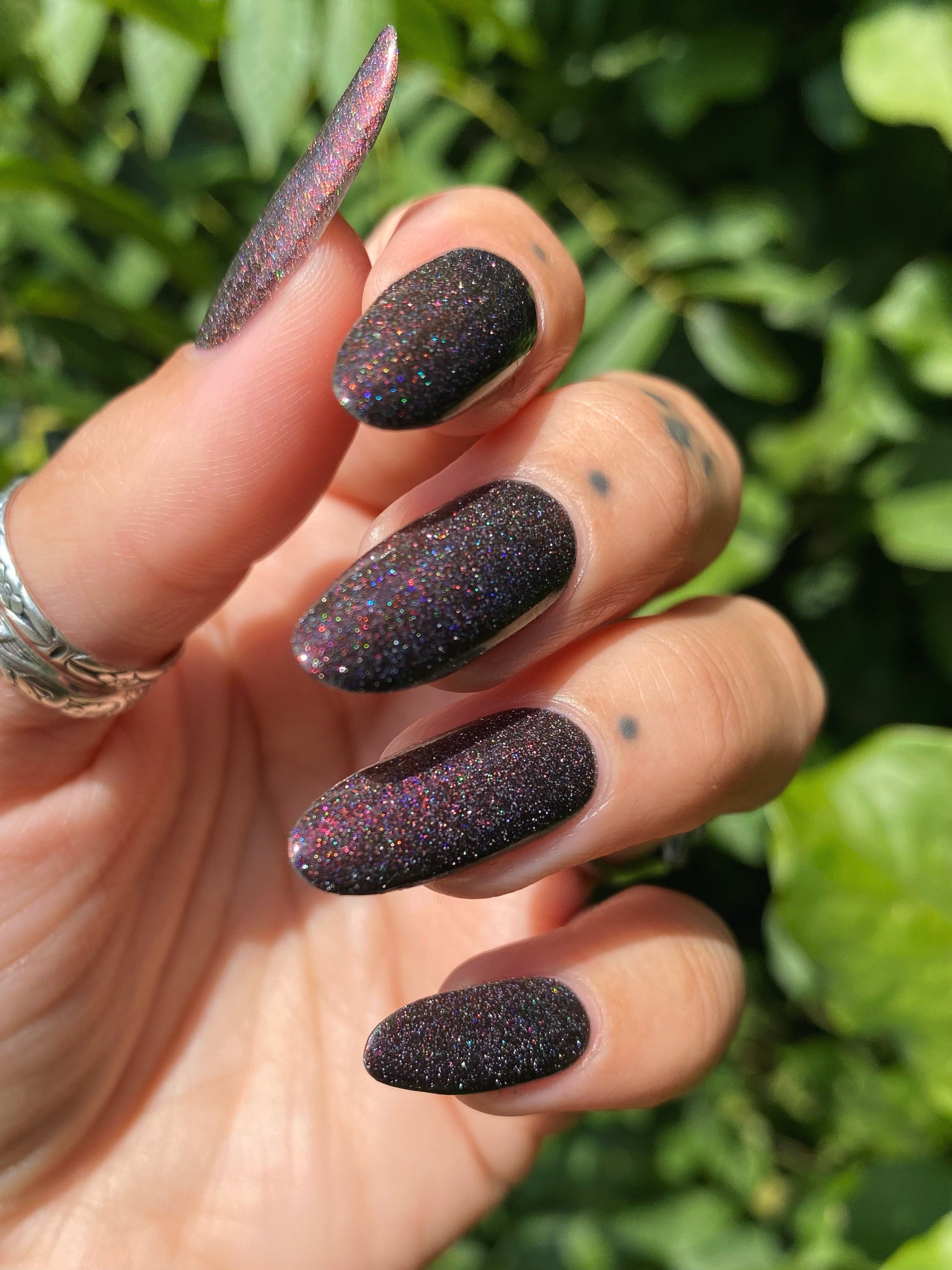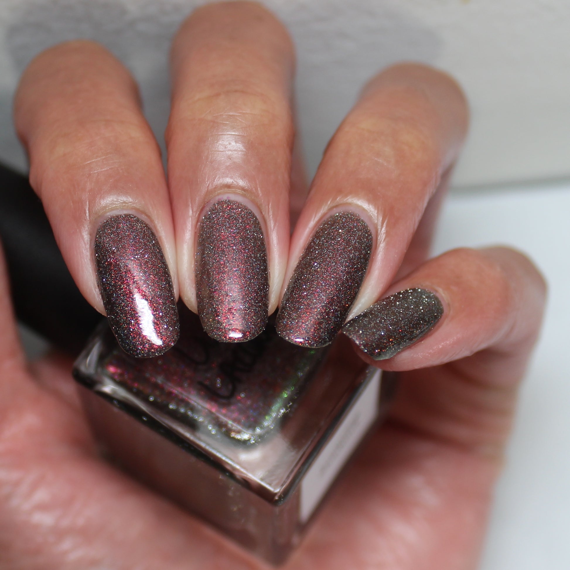 Please note: Reflective glitter polishes are textured and dry down with a gritty, sandpaper feeling. To make them look smooth and glossy, I recommend applying 2-3 coats of the polish, then applying one coat of a glitter smoother, followed by one coat of top coat.