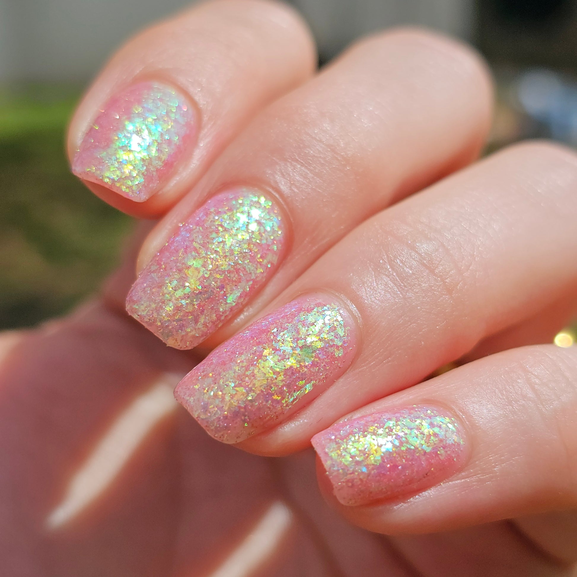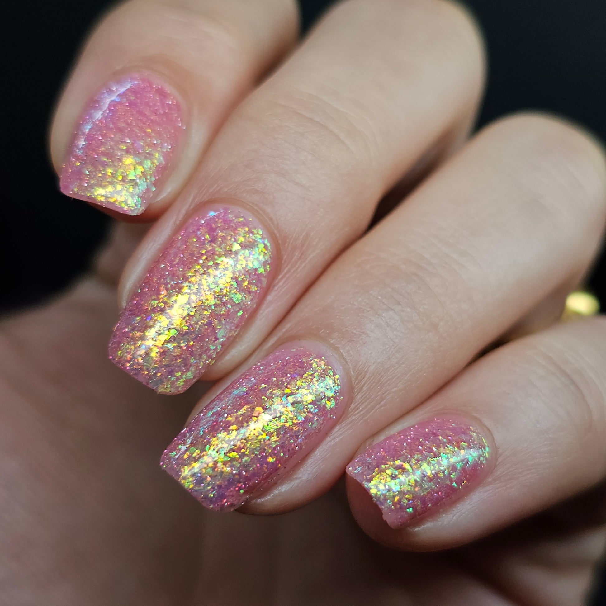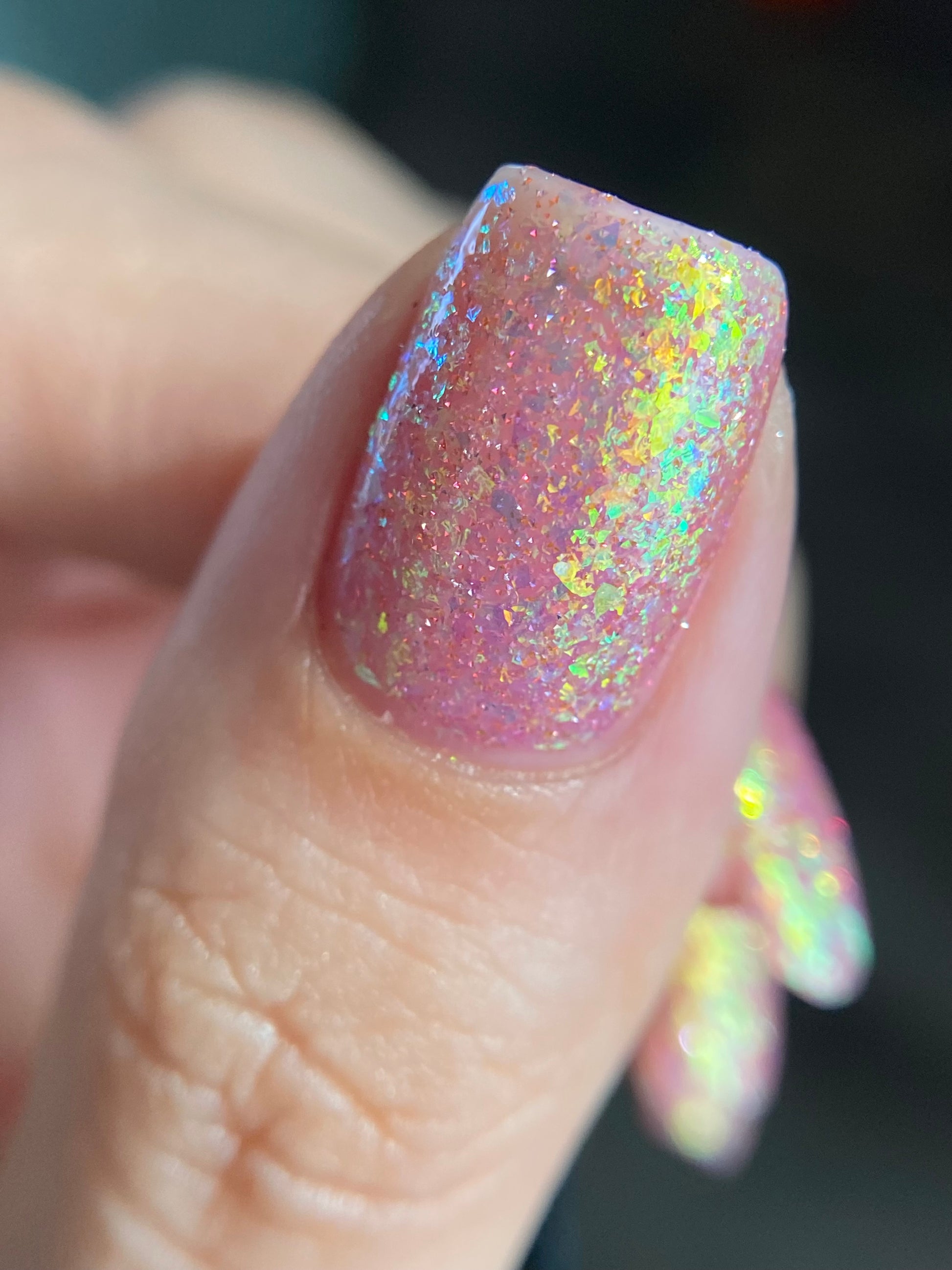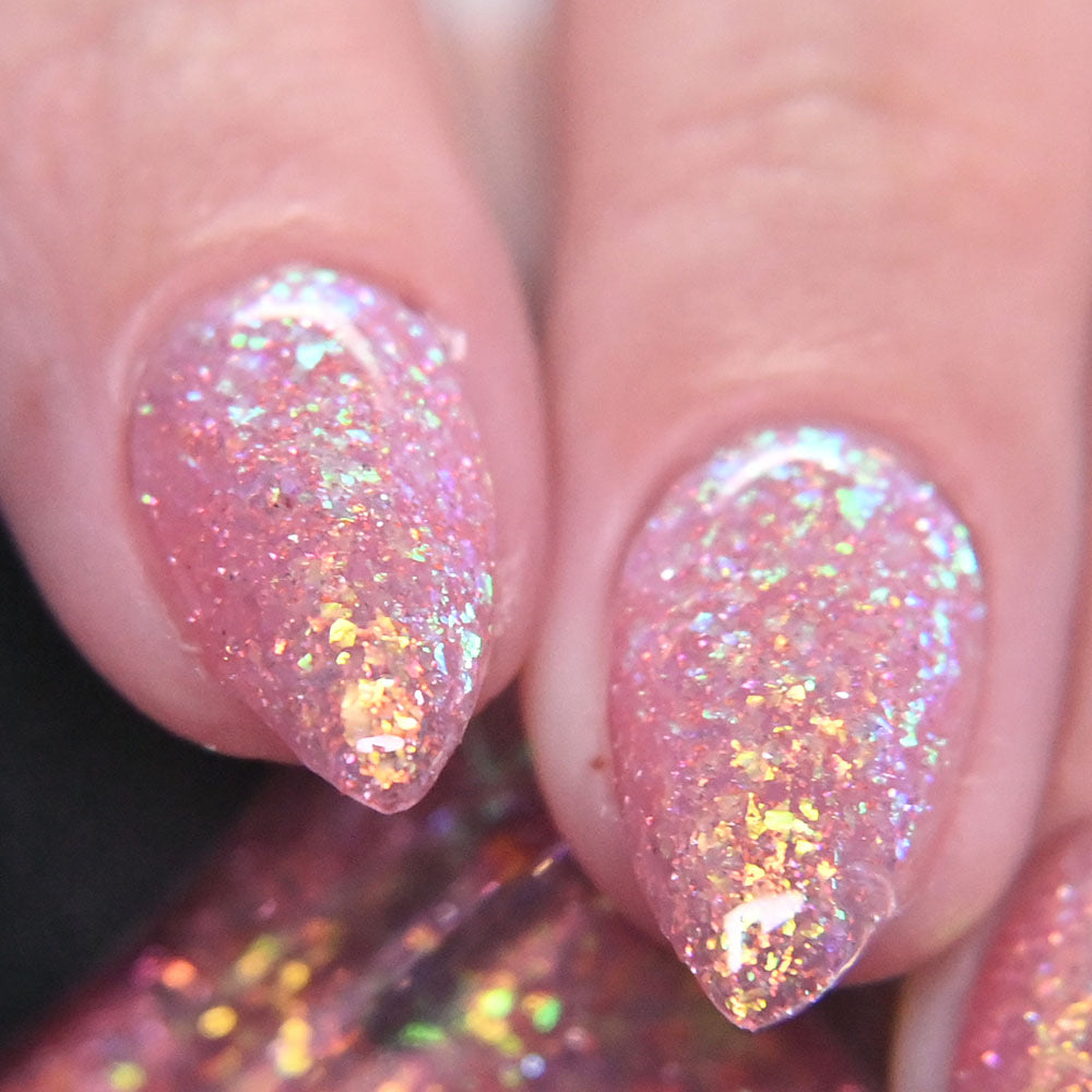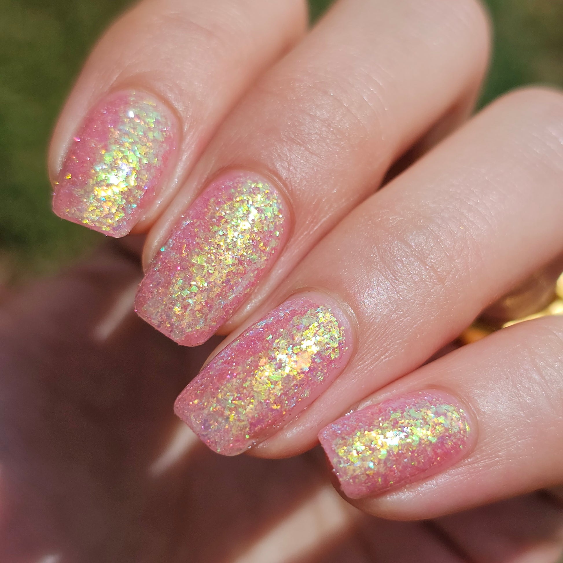 A lightly tinted pink crelly base with pink light reflective glitter and iridescent flakies that shift from orange to gold to green and from gold to green (and to blue at extremes)