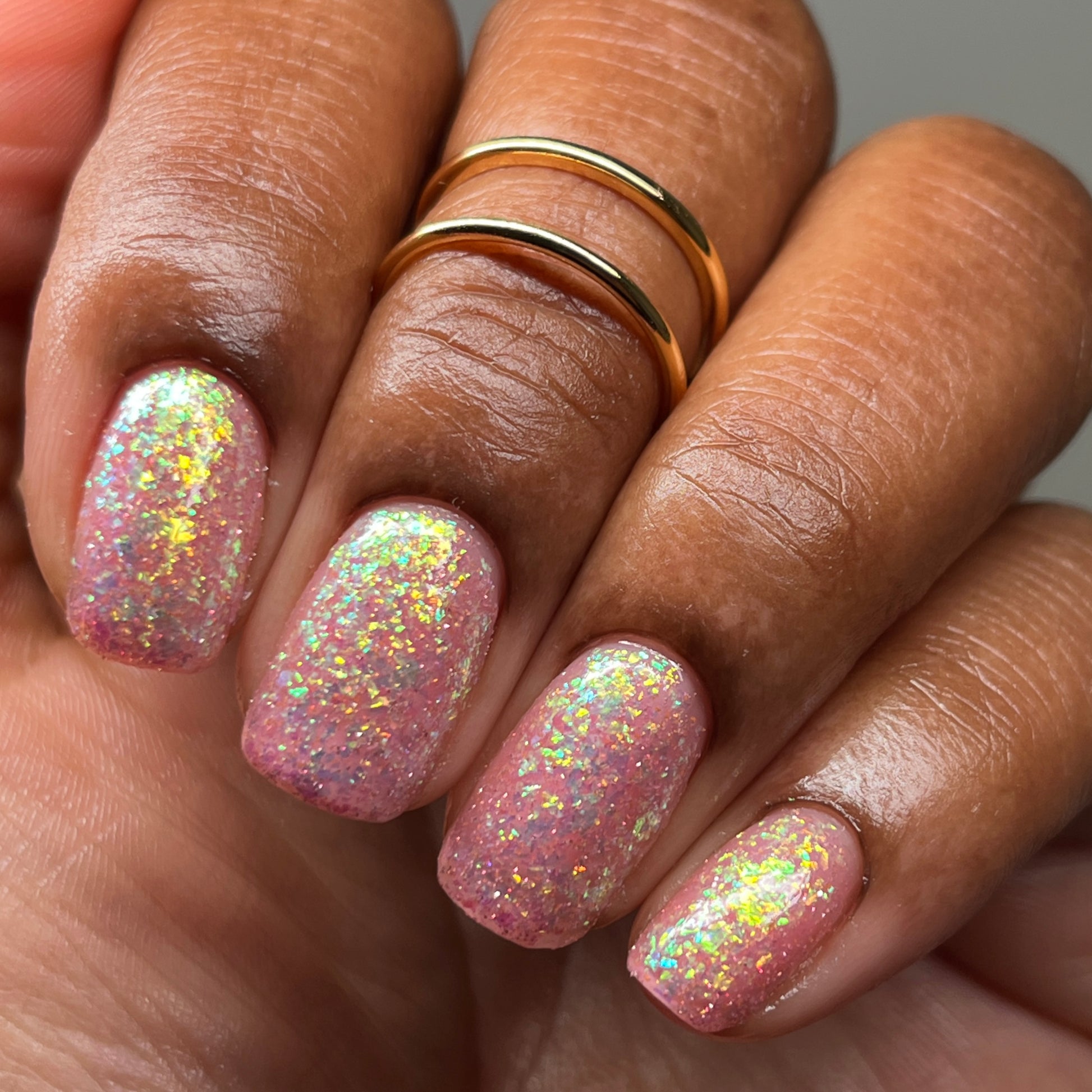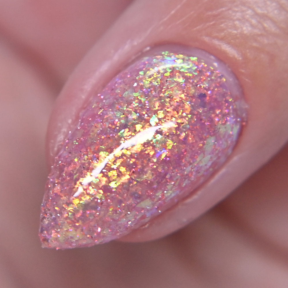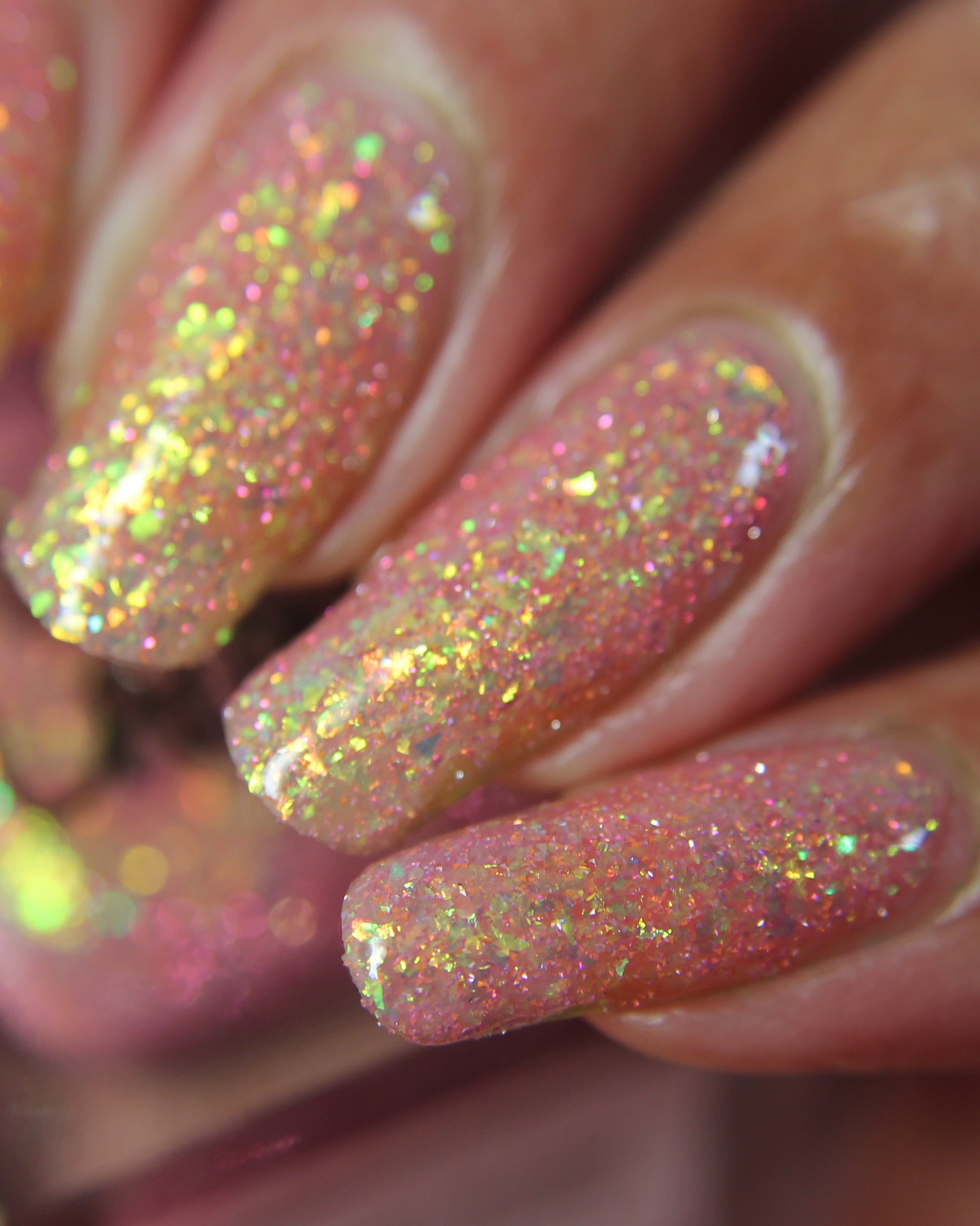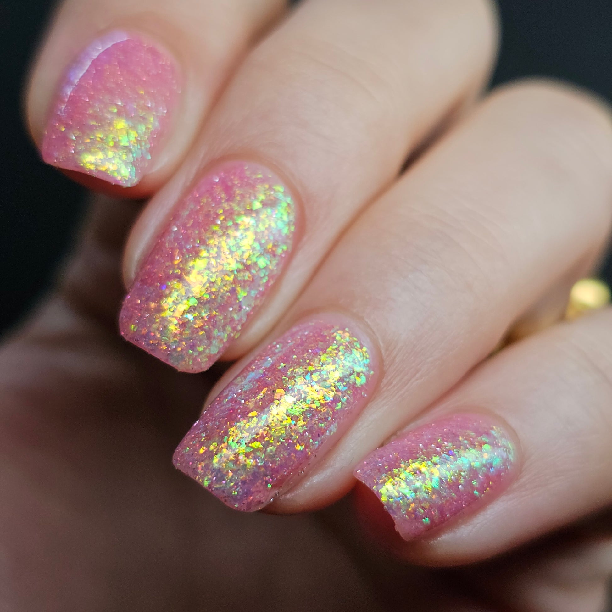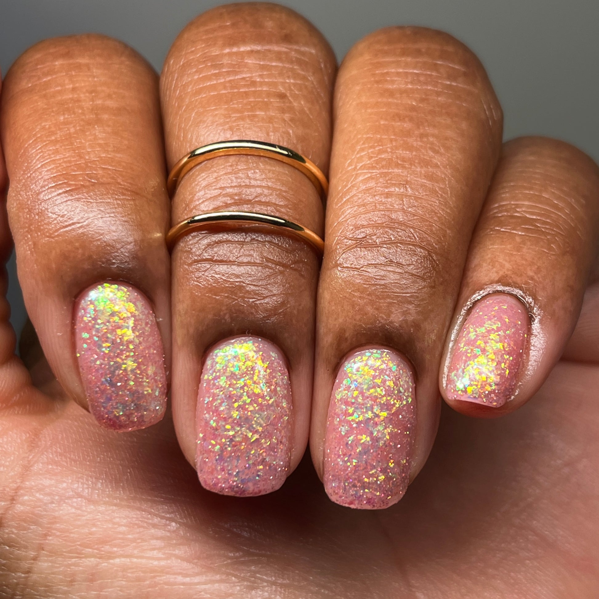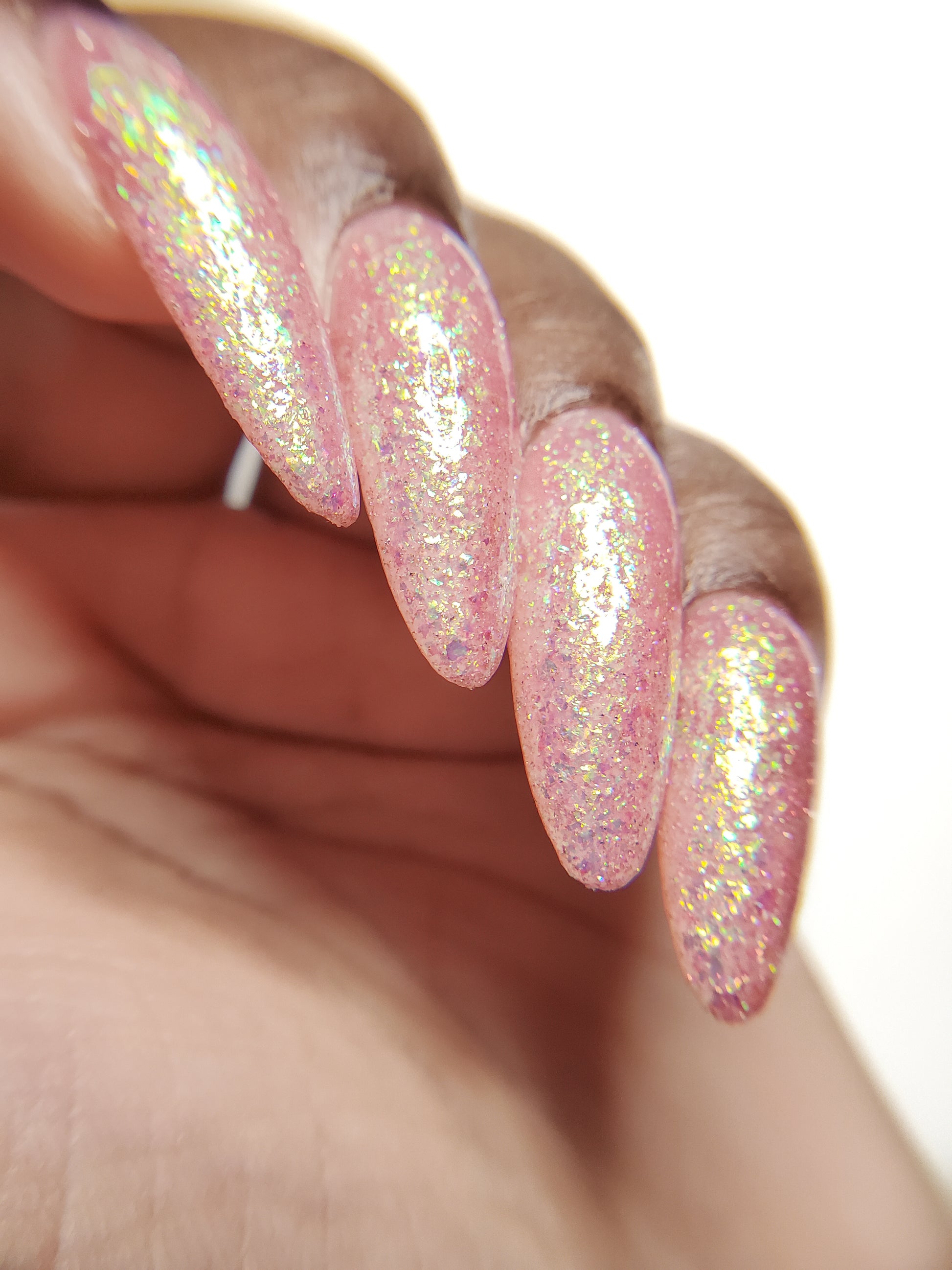 A lightly tinted pink crelly base with pink light reflective glitter and iridescent flakies that shift from orange to gold to green and from gold to green (and to blue at extremes)