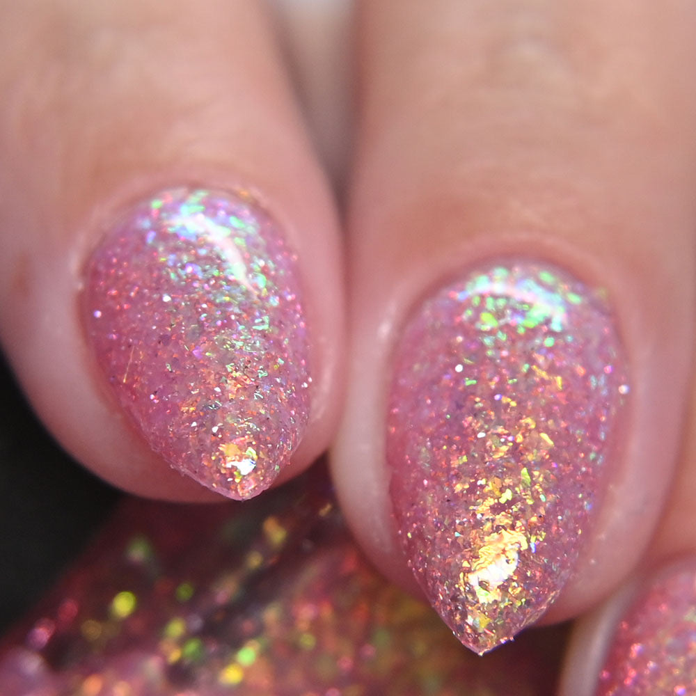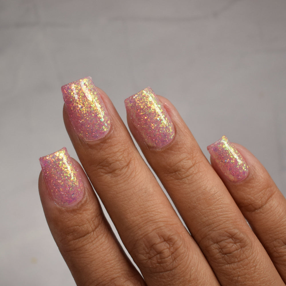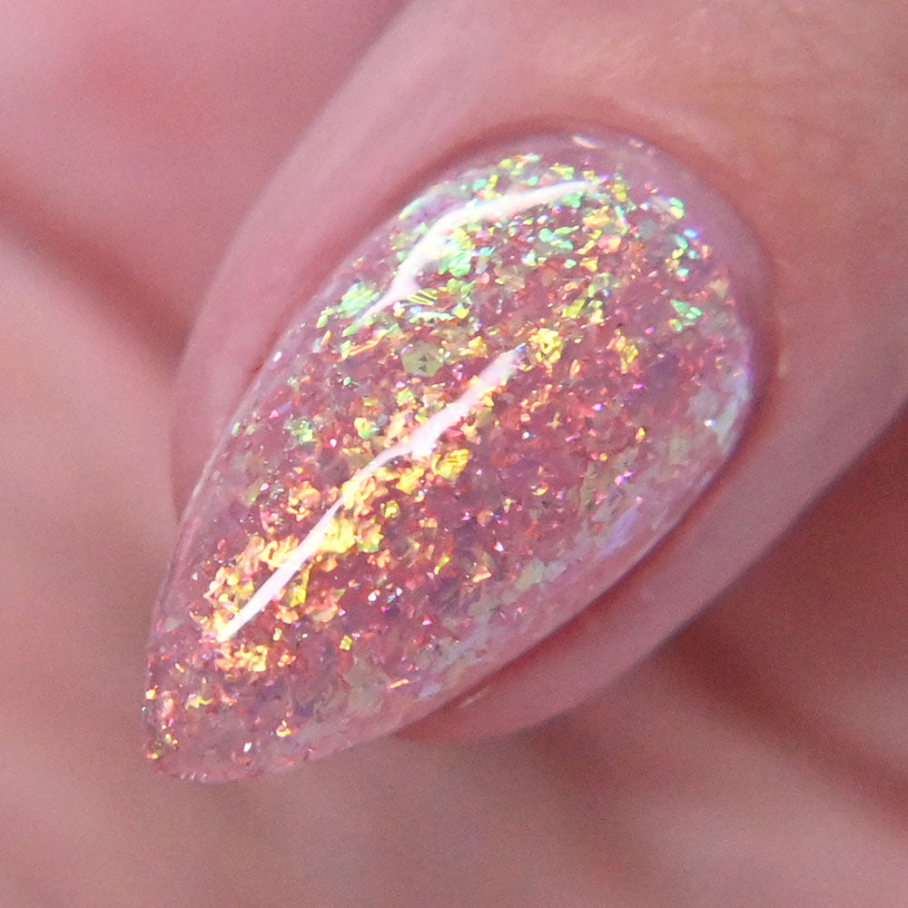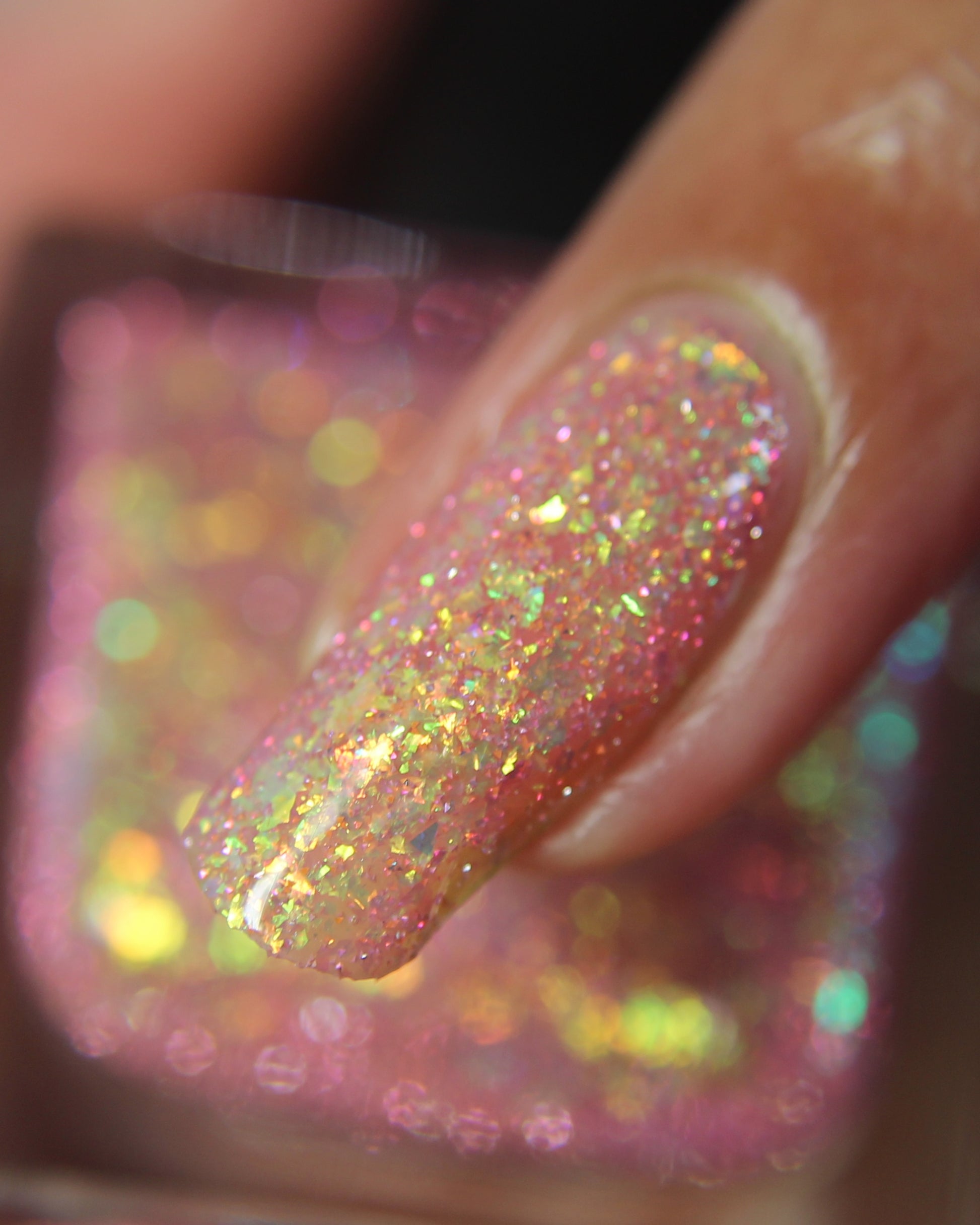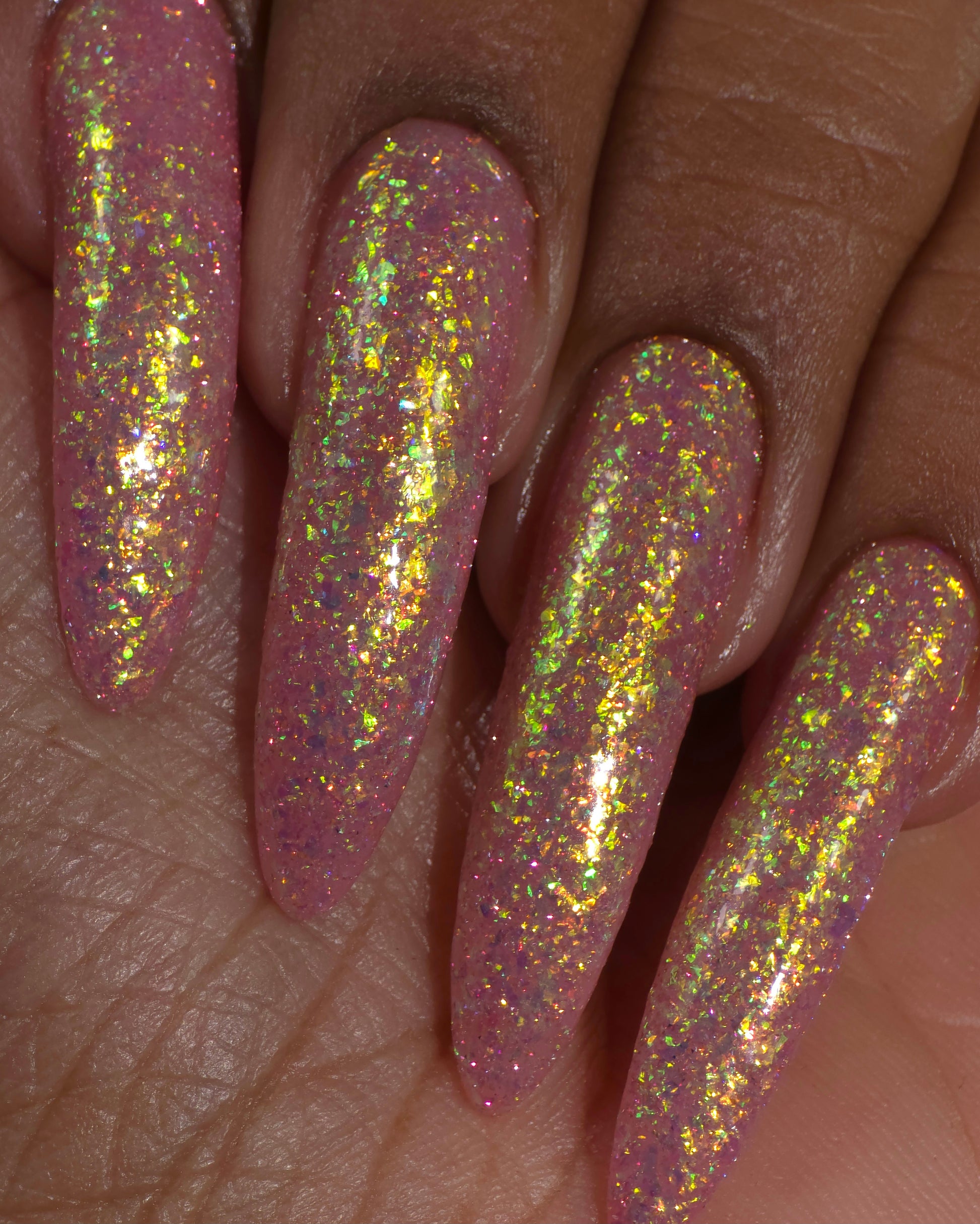 A lightly tinted pink crelly base with pink light reflective glitter and iridescent flakies that shift from orange to gold to green and from gold to green (and to blue at extremes)