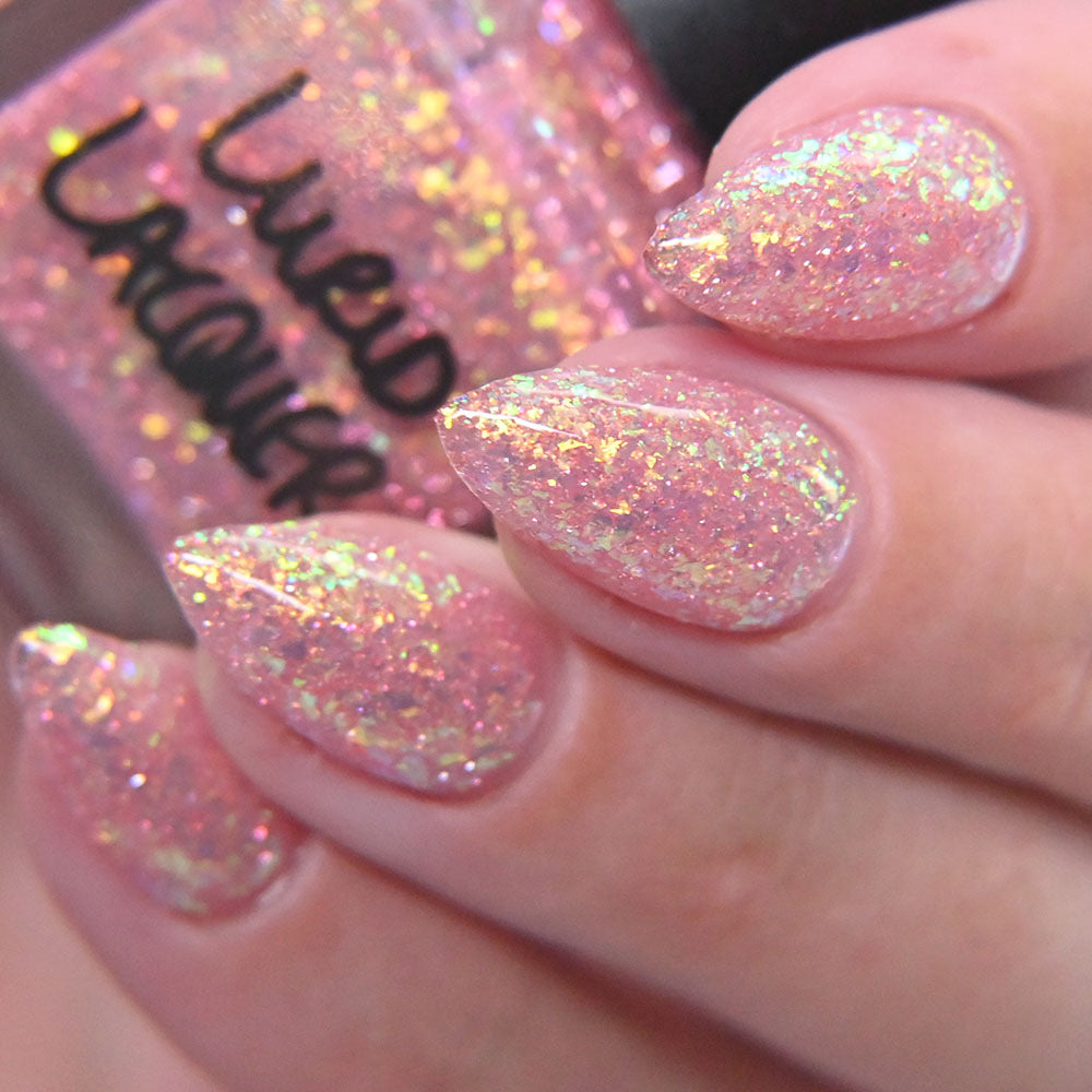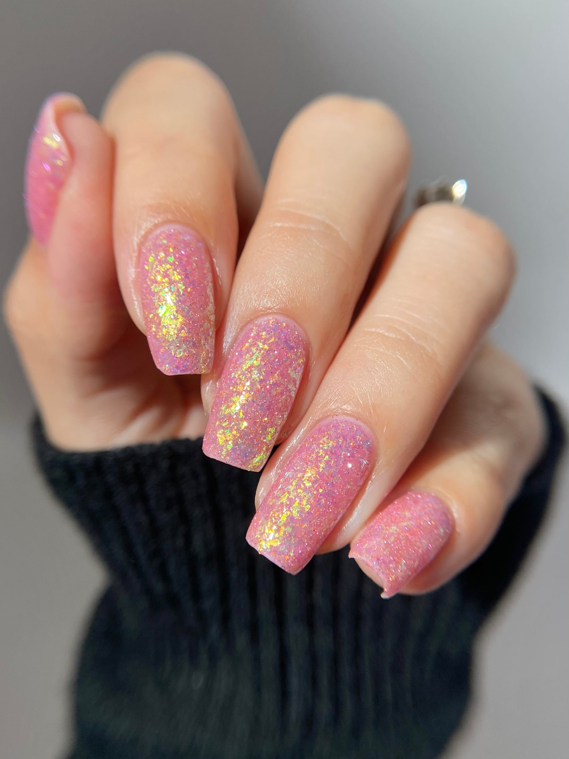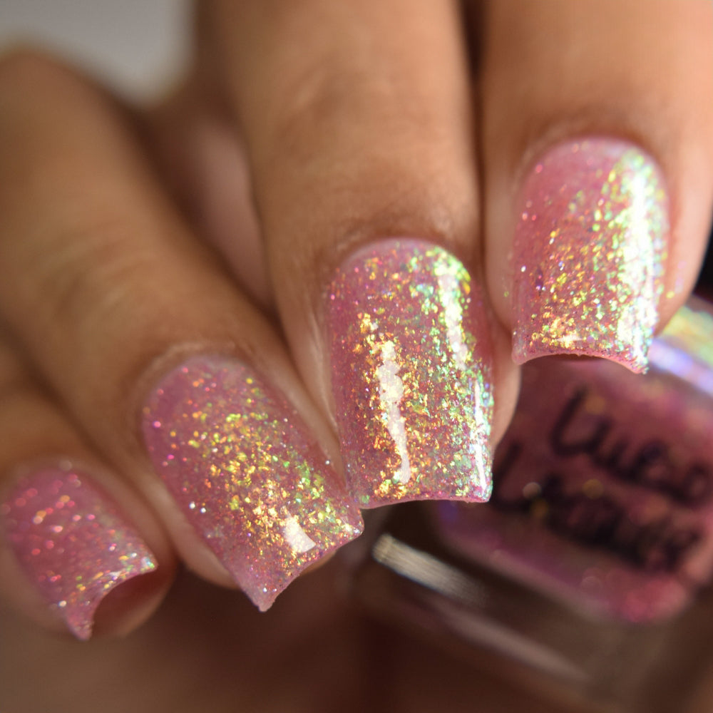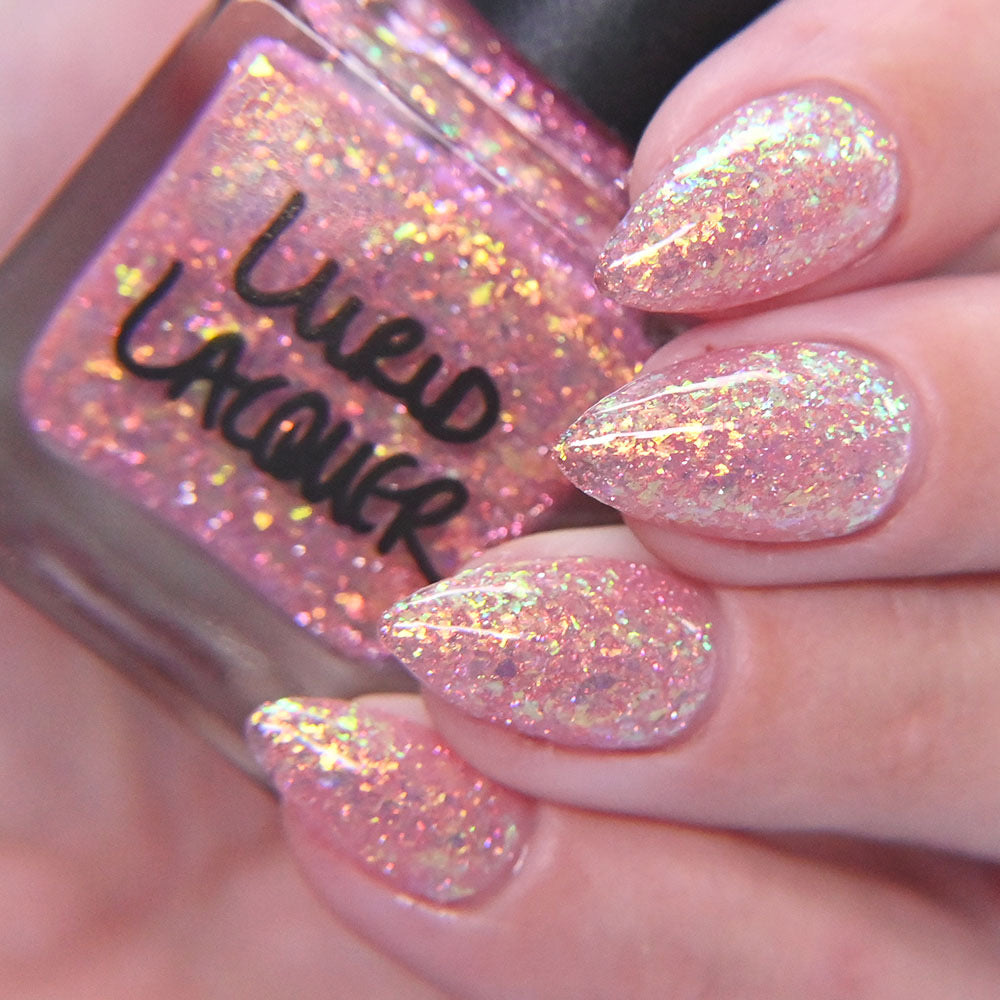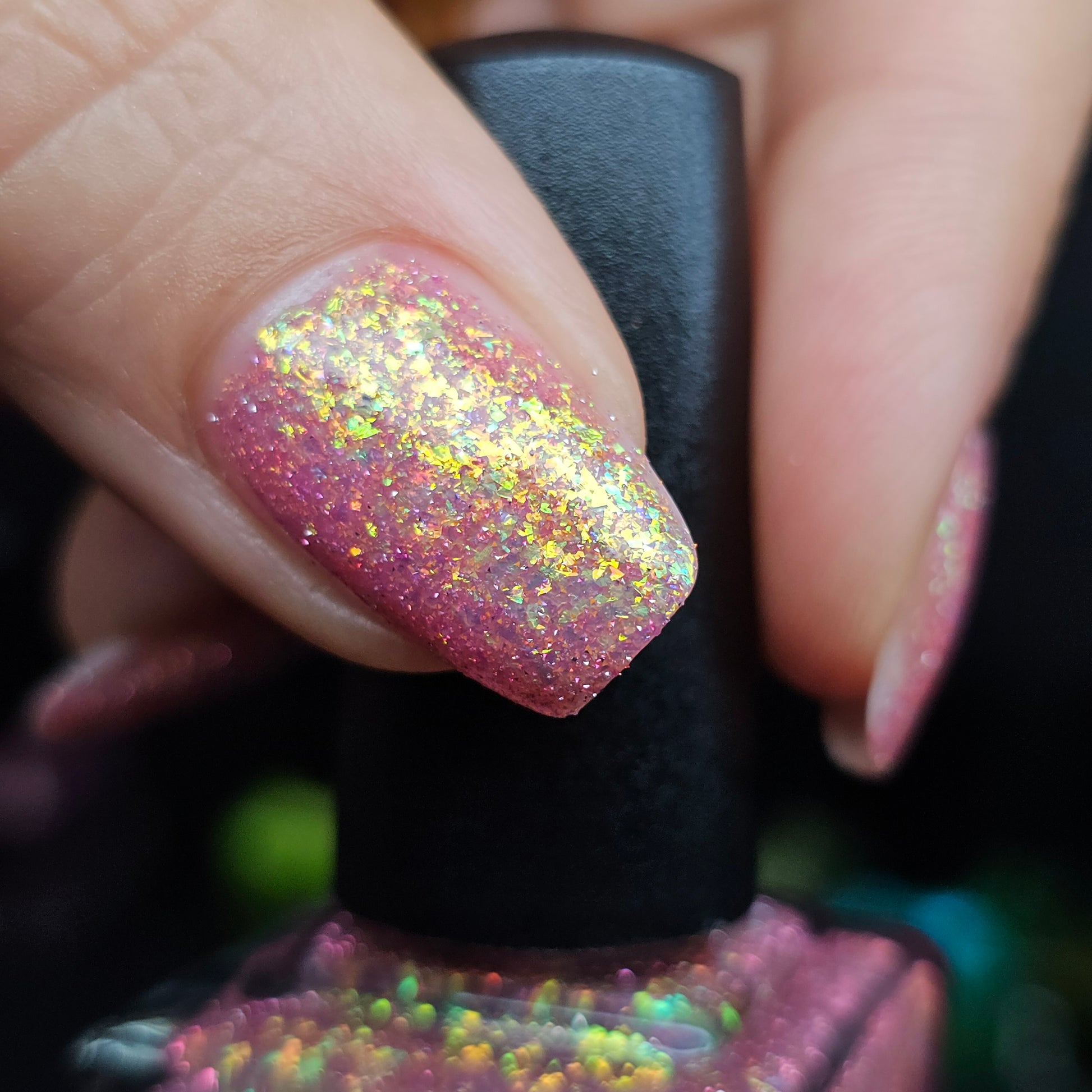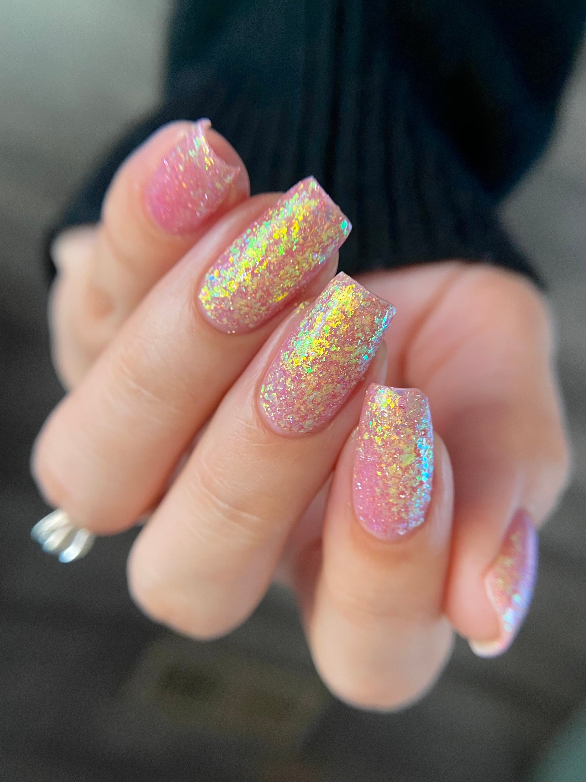 A lightly tinted pink crelly base with pink light reflective glitter and iridescent flakies that shift from orange to gold to green and from gold to green (and to blue at extremes)