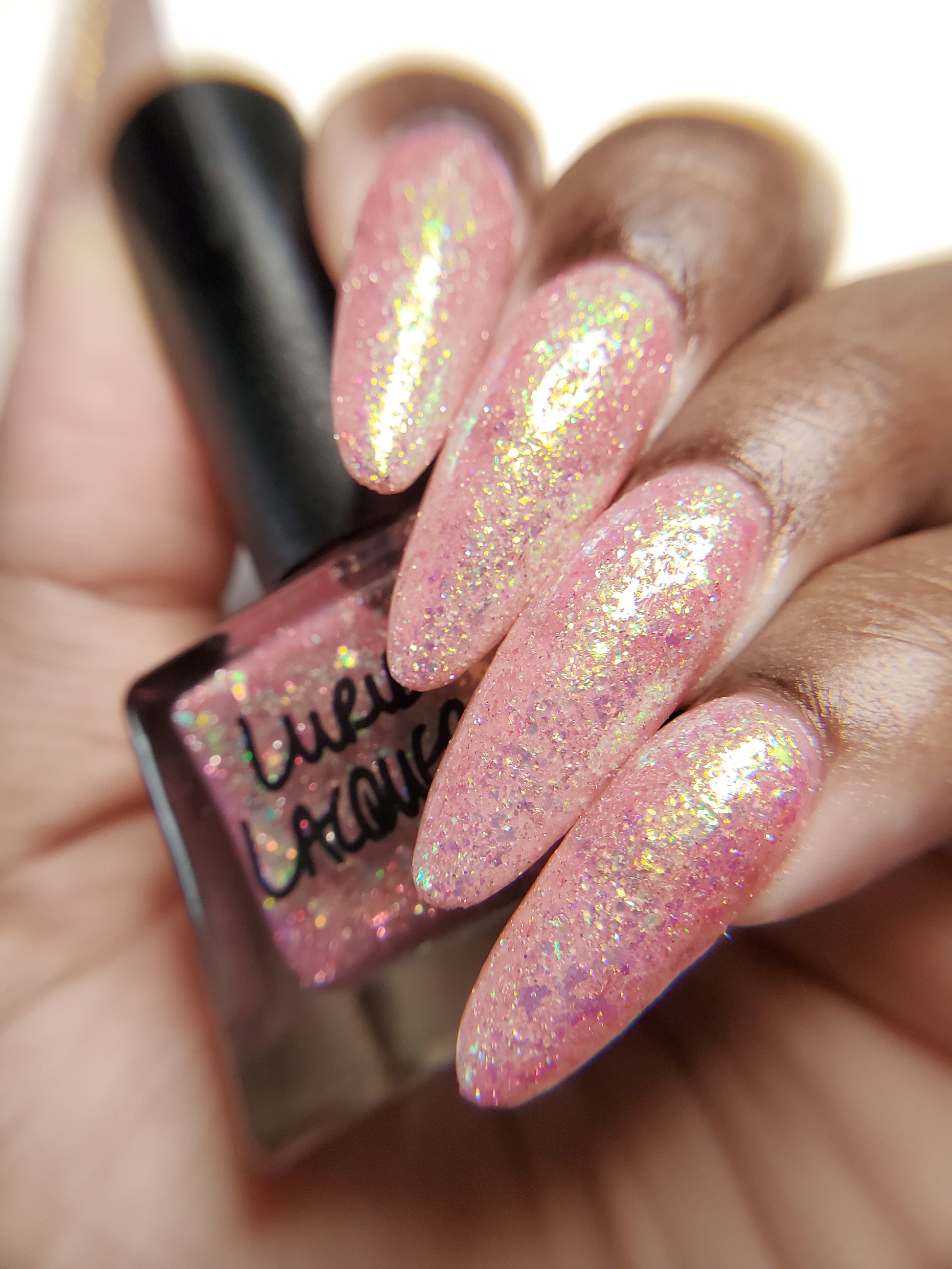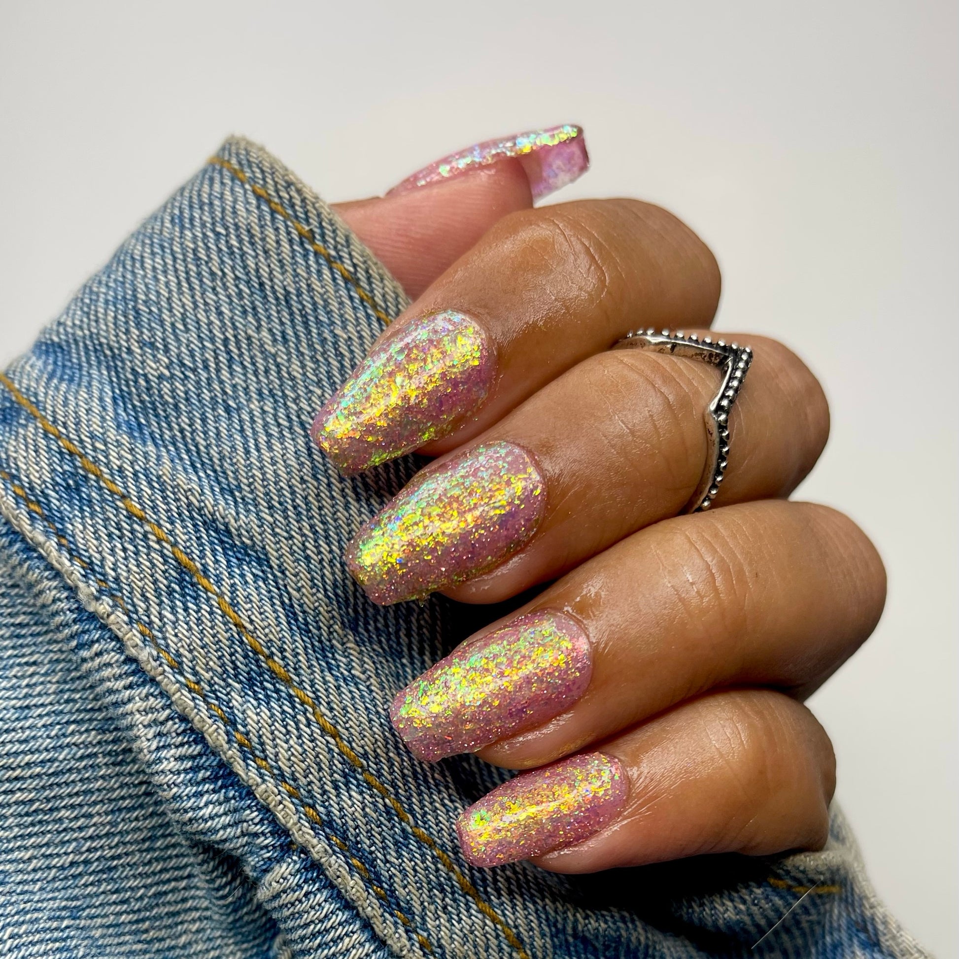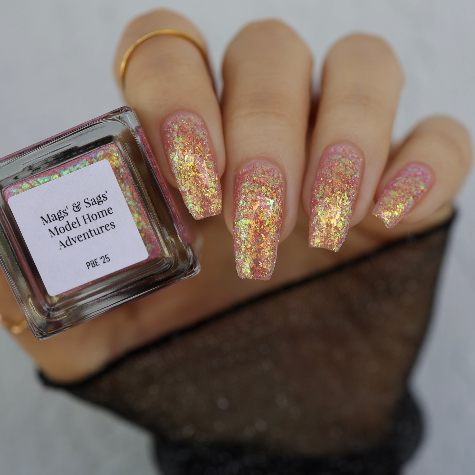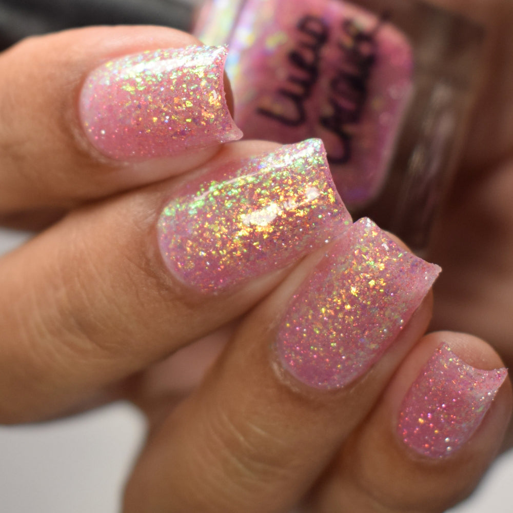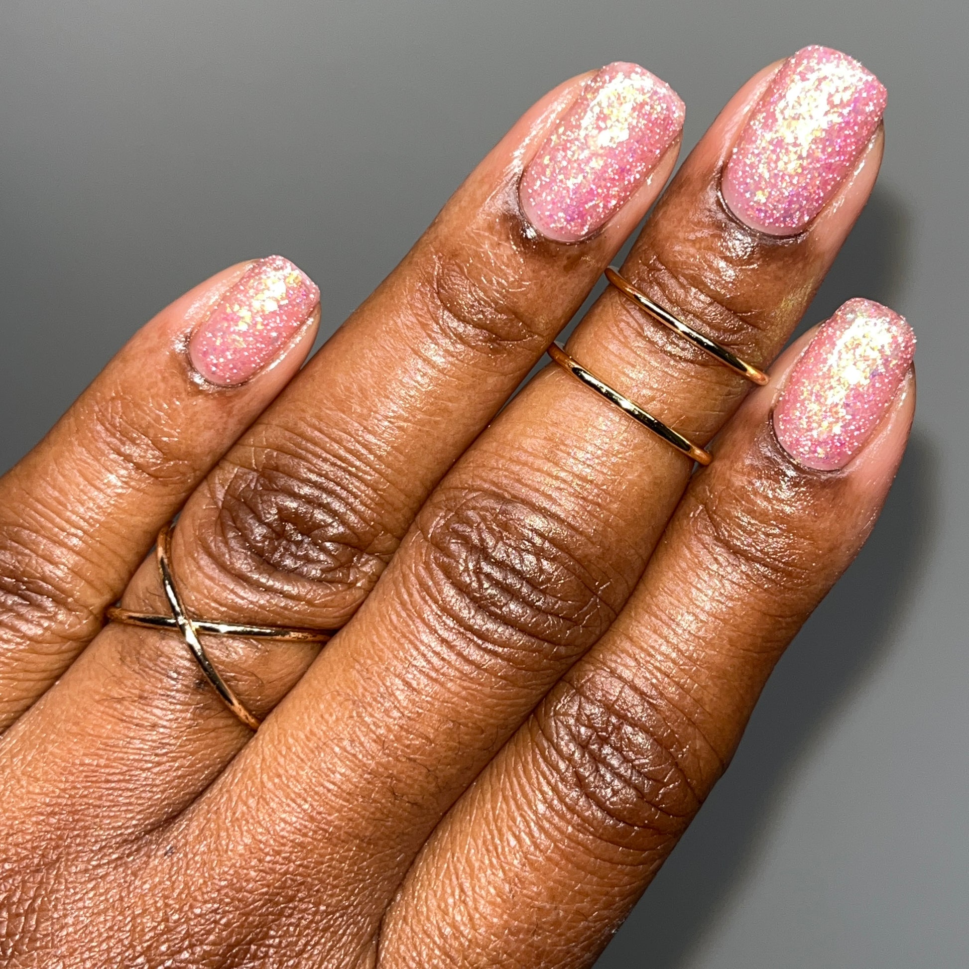 A lightly tinted pink crelly base with pink light reflective glitter and iridescent flakies that shift from orange to gold to green and from gold to green (and to blue at extremes)