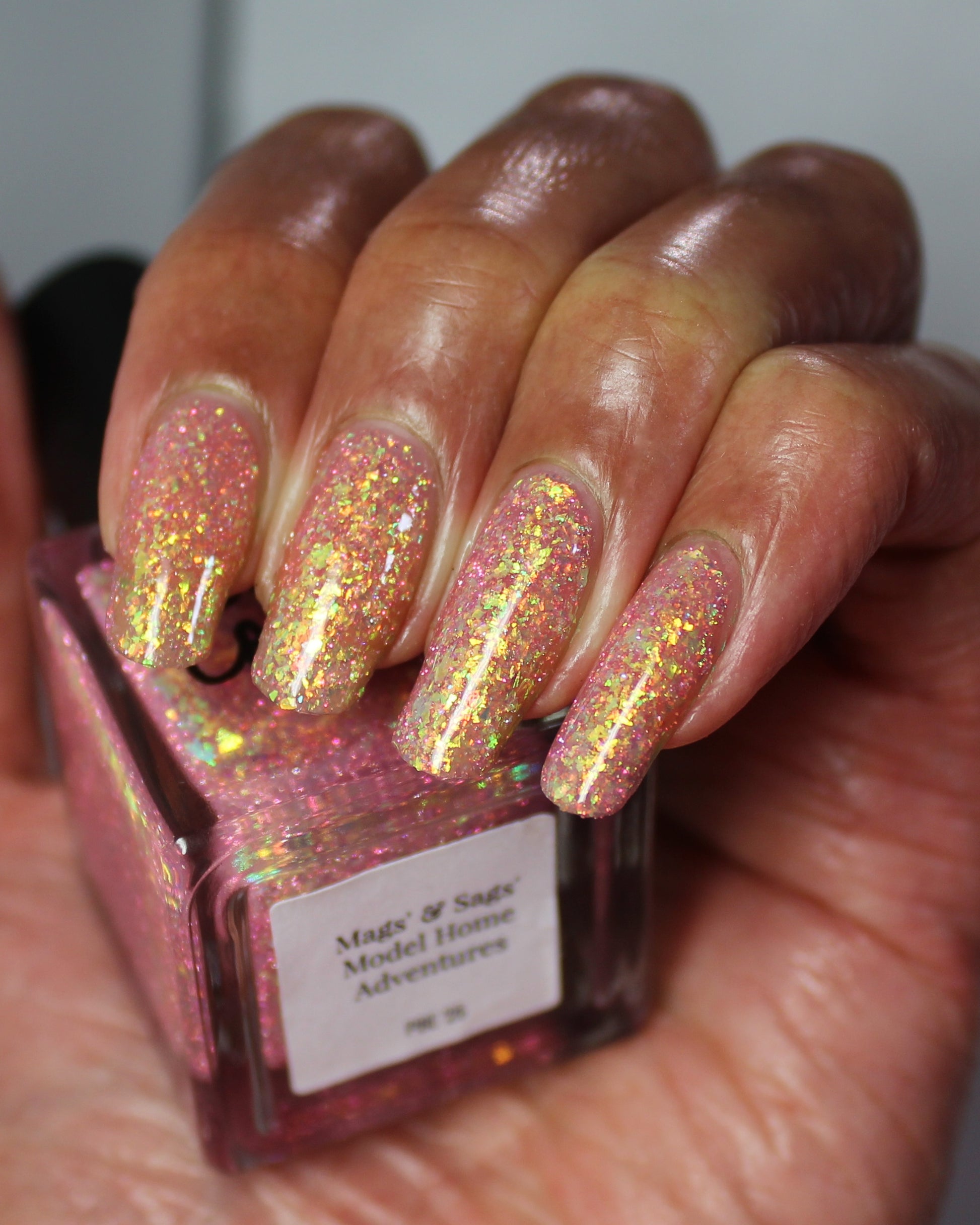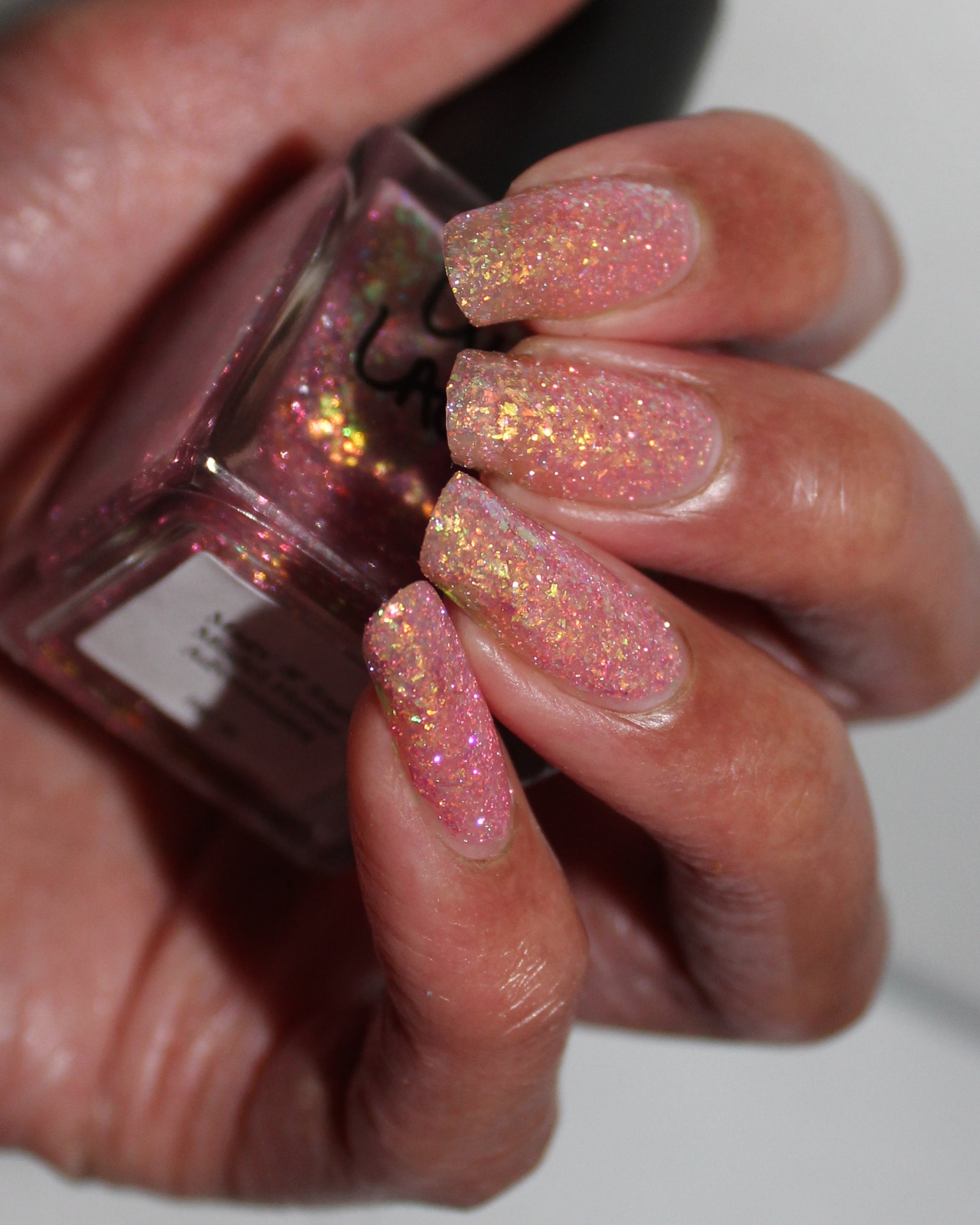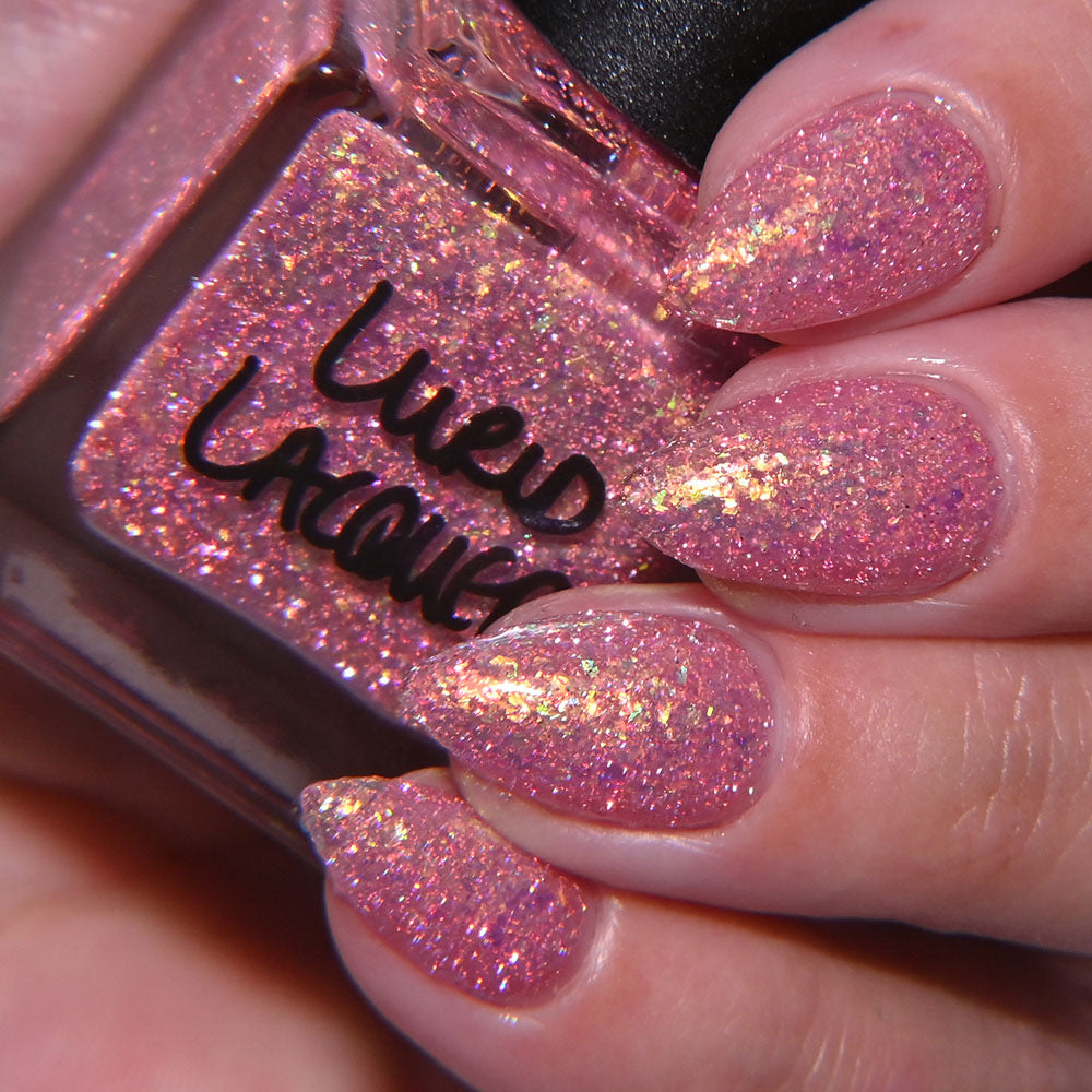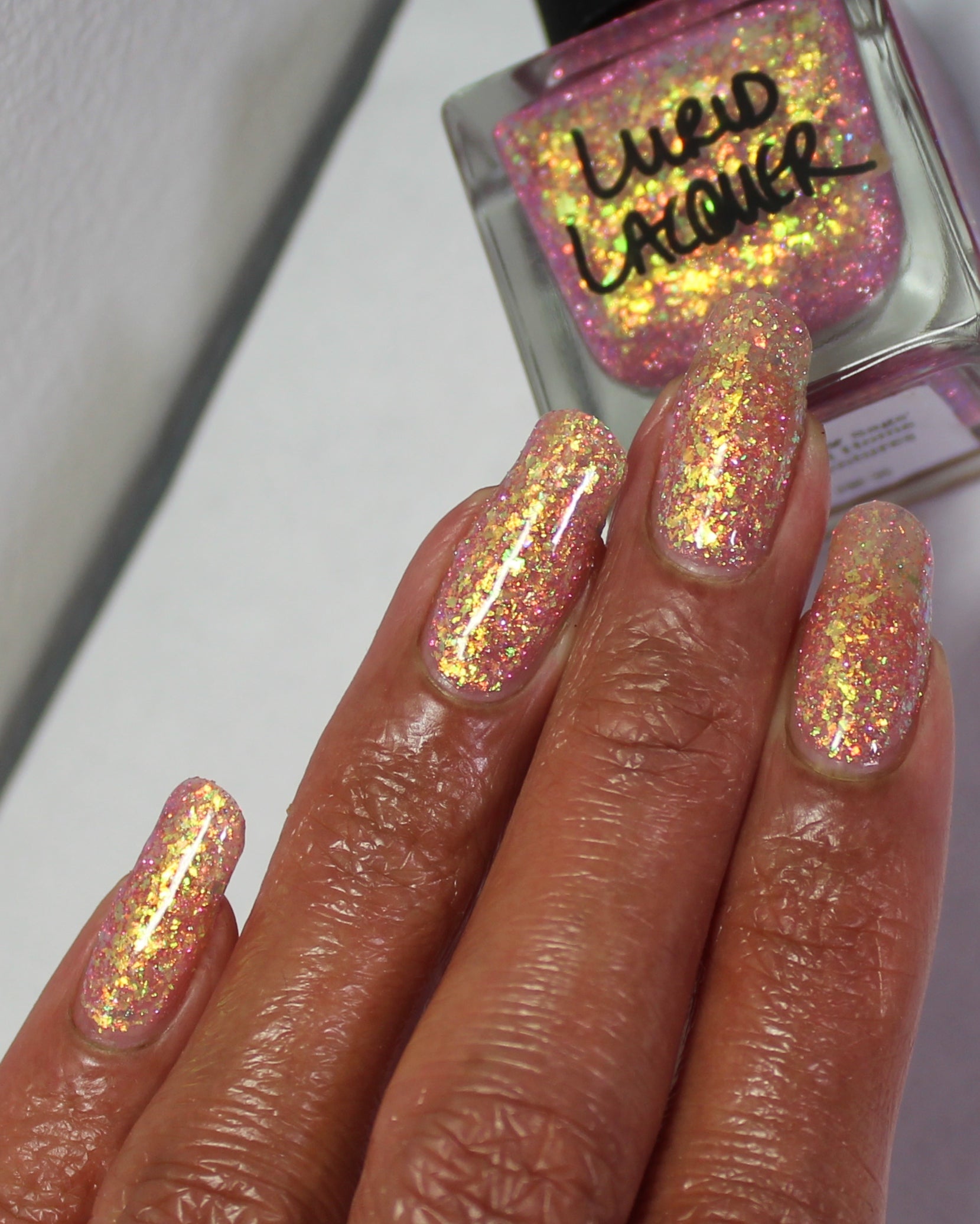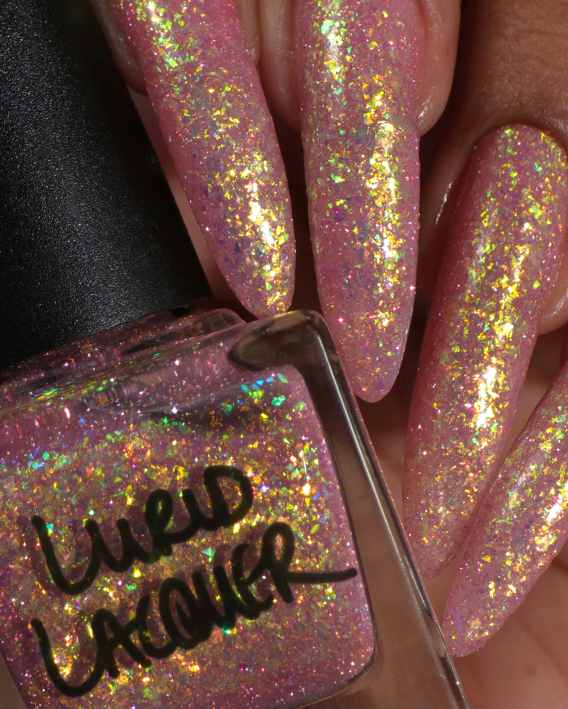 A lightly tinted pink crelly base with pink light reflective glitter and iridescent flakies that shift from orange to gold to green and from gold to green (and to blue at extremes)