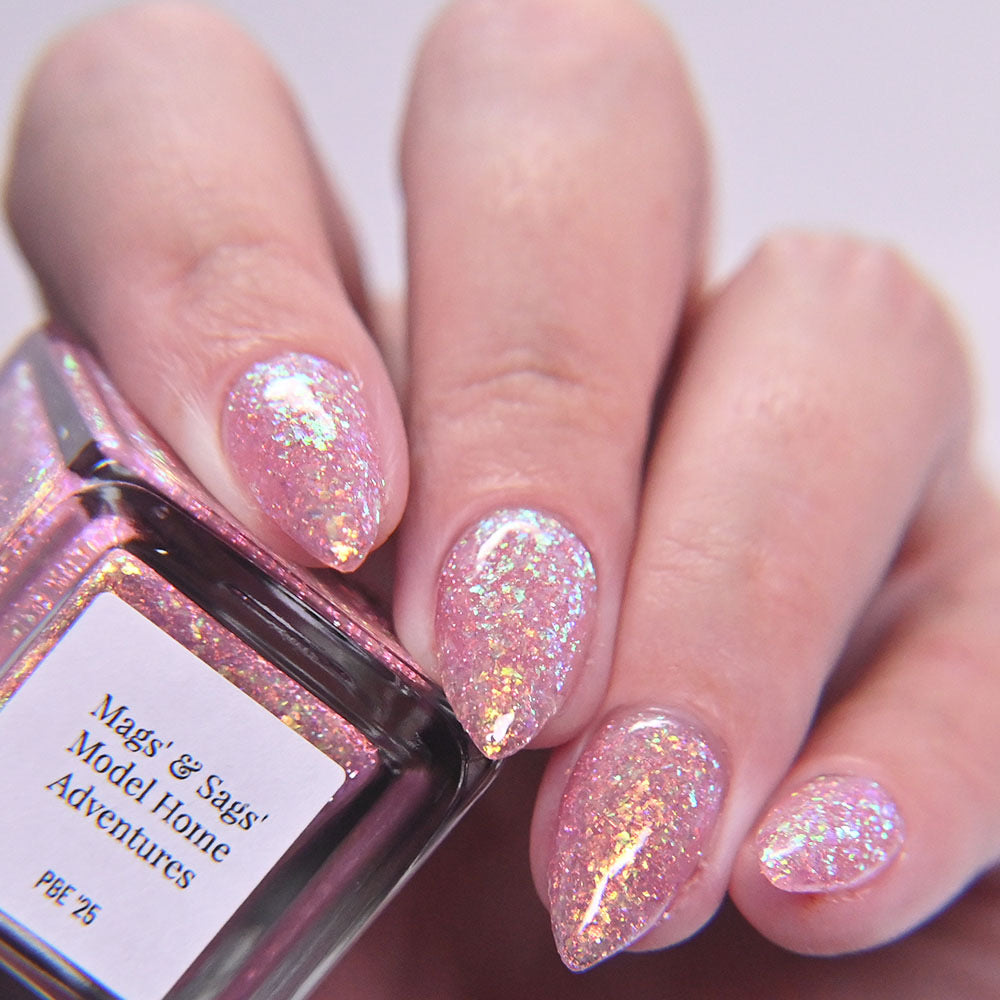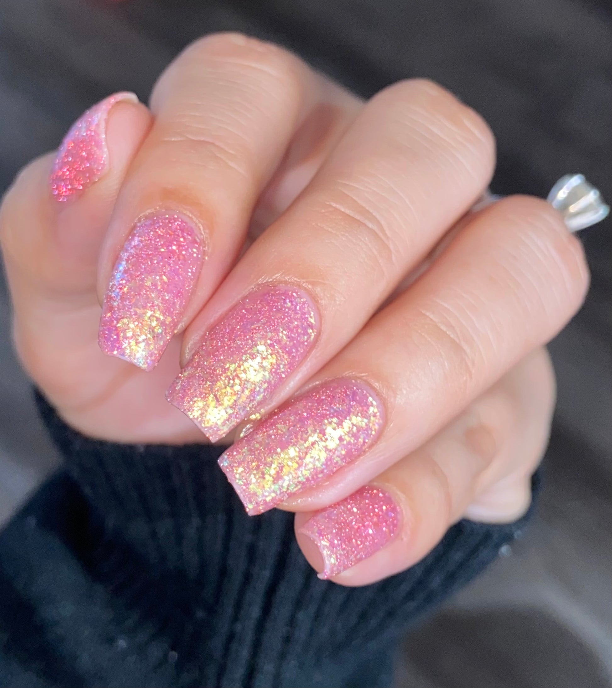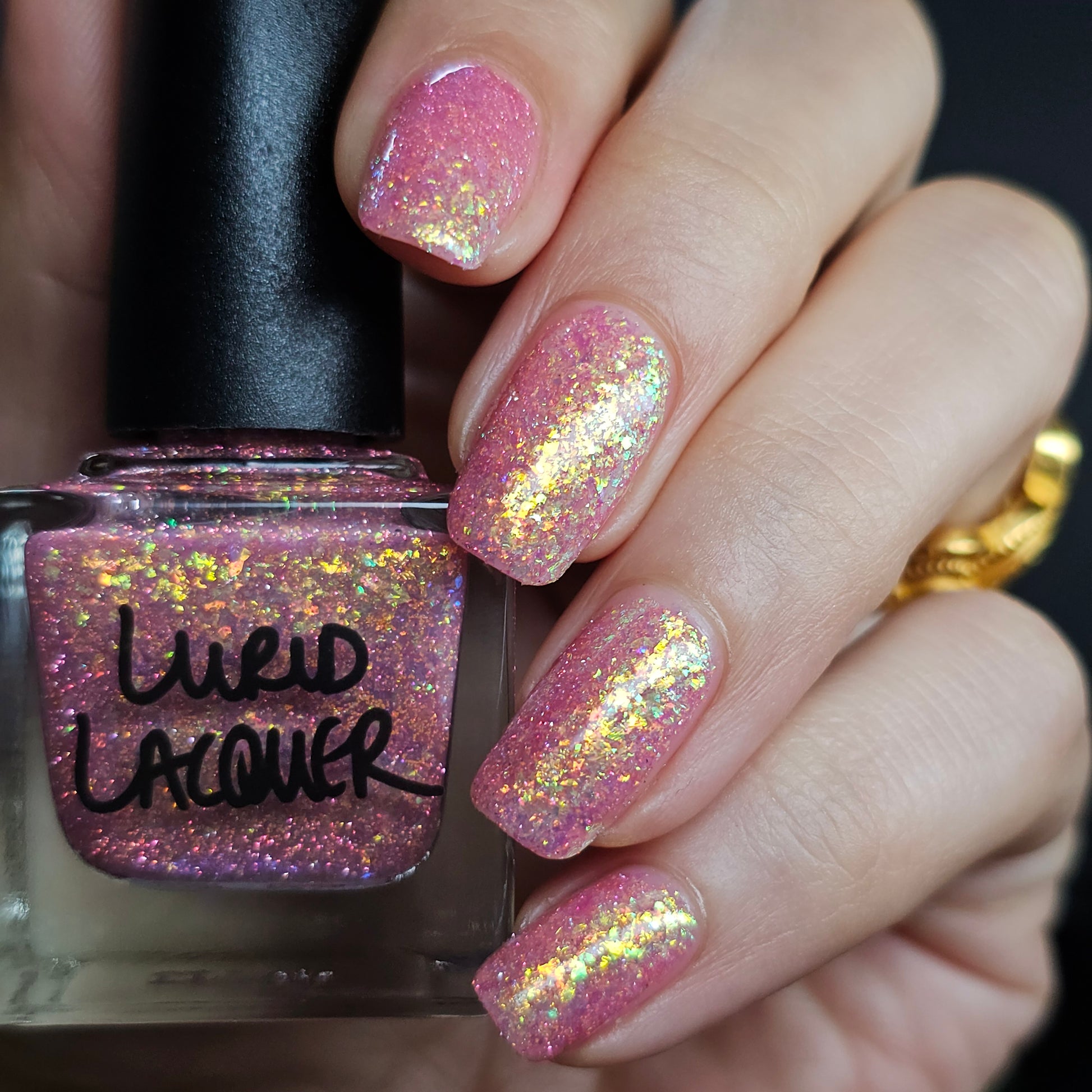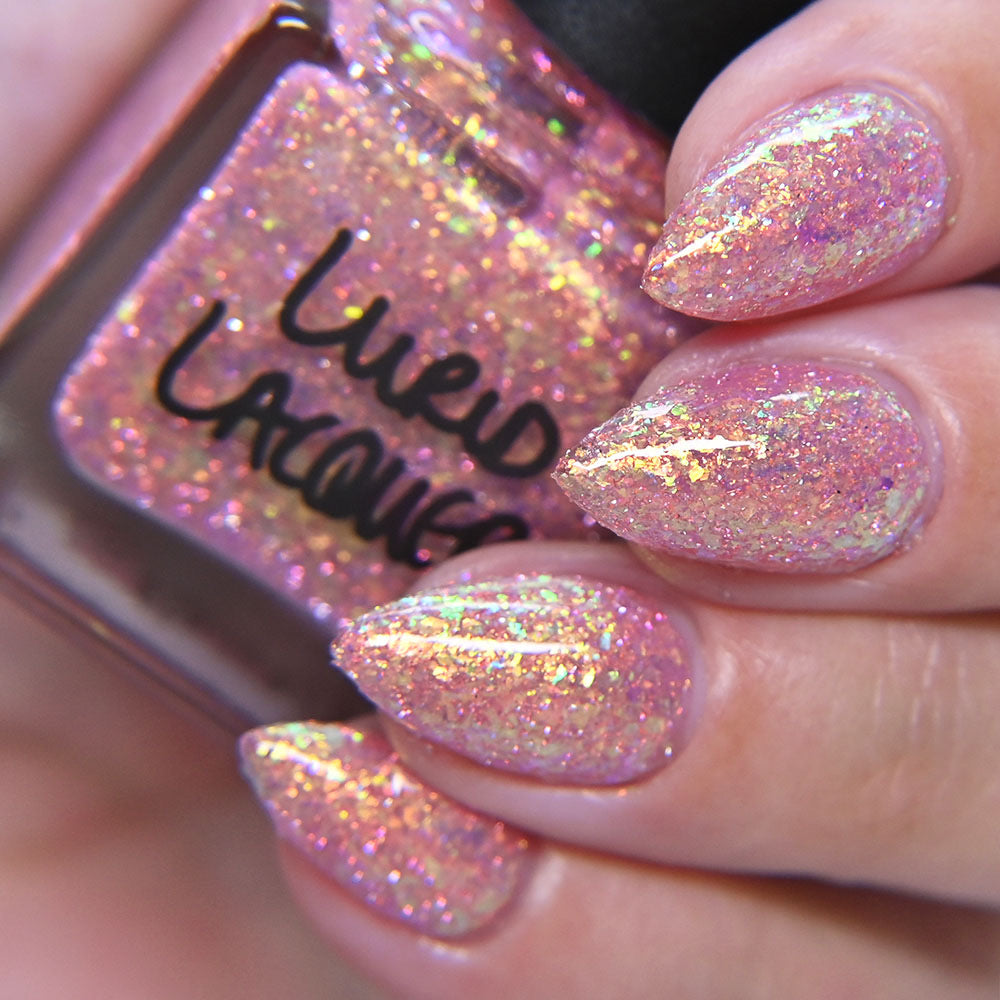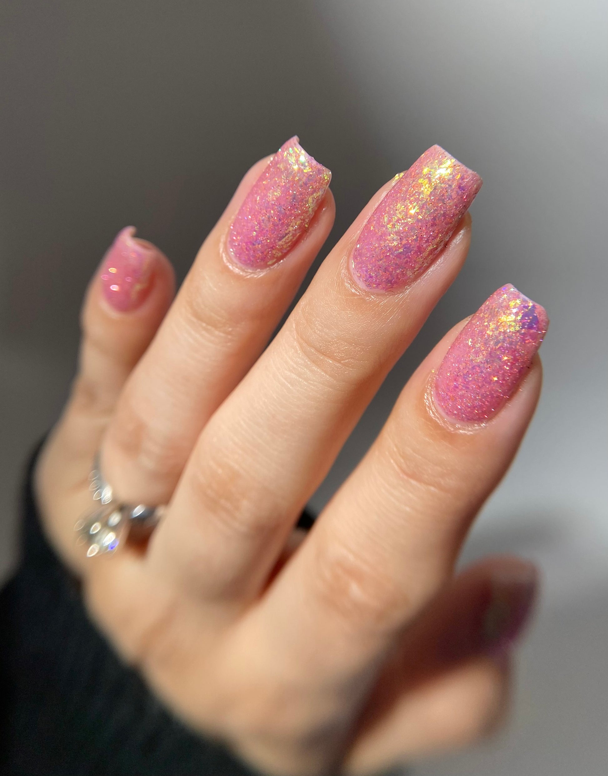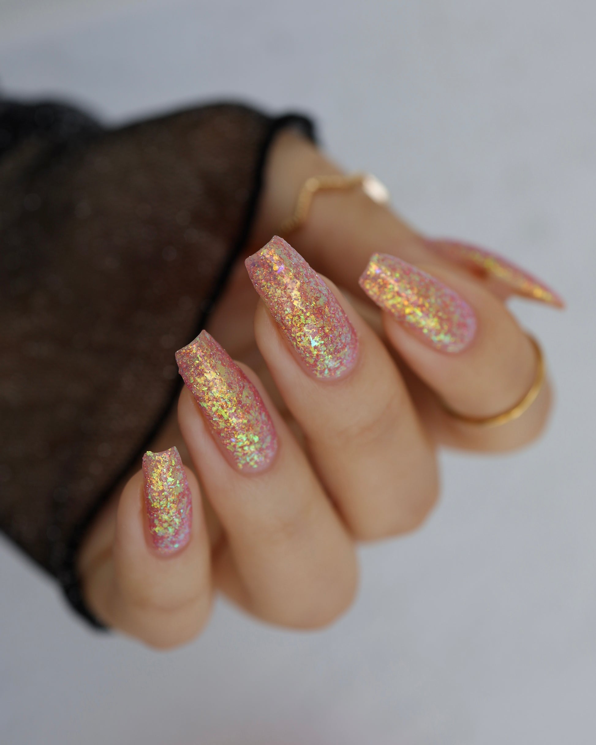 A lightly tinted pink crelly base with pink light reflective glitter and iridescent flakies that shift from orange to gold to green and from gold to green (and to blue at extremes)