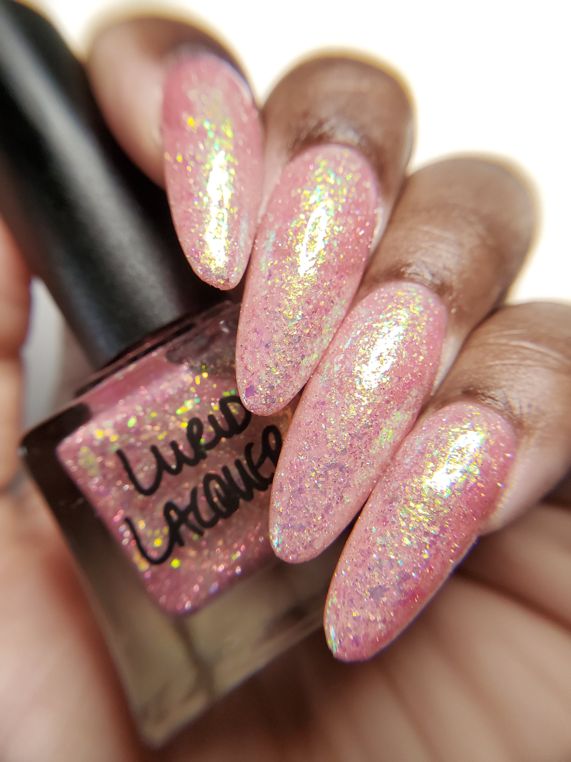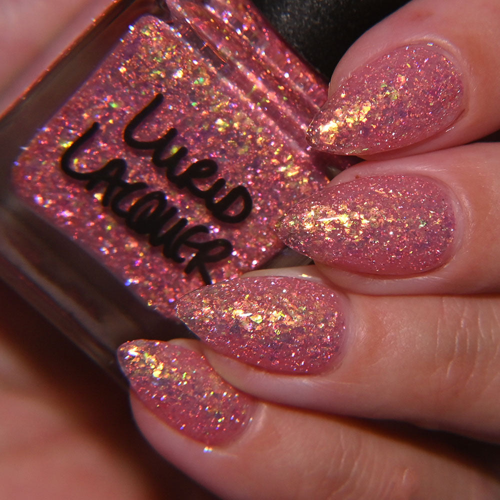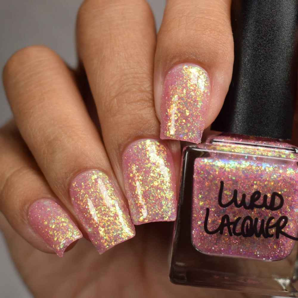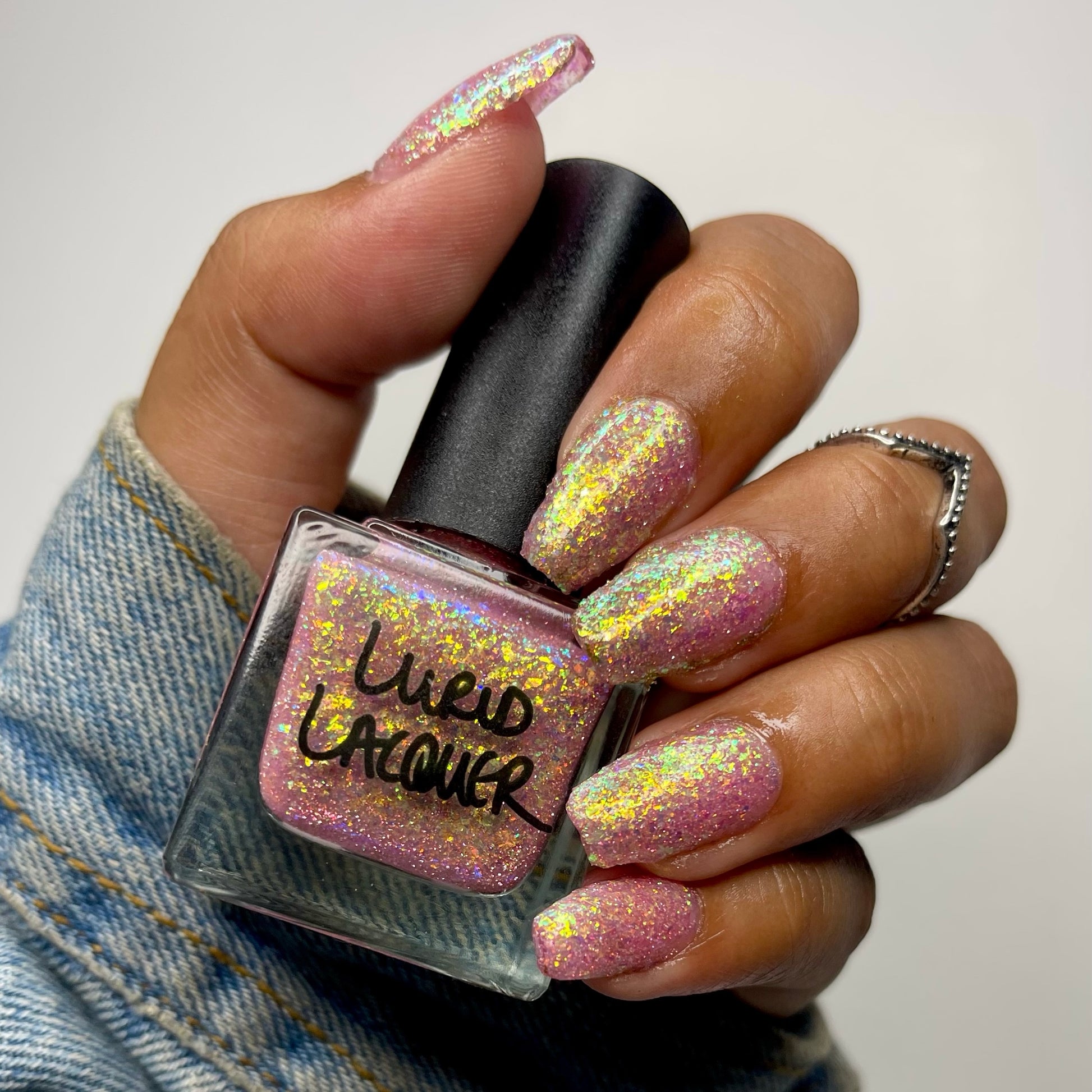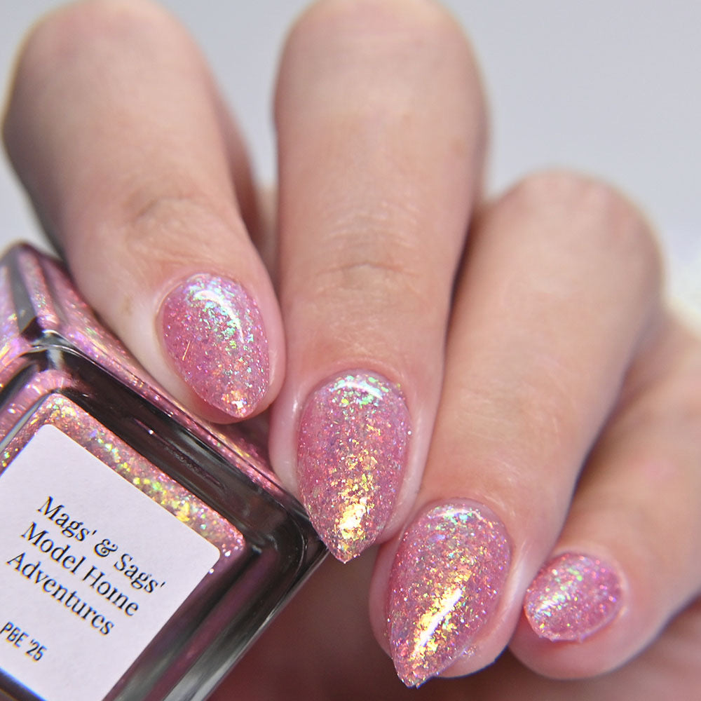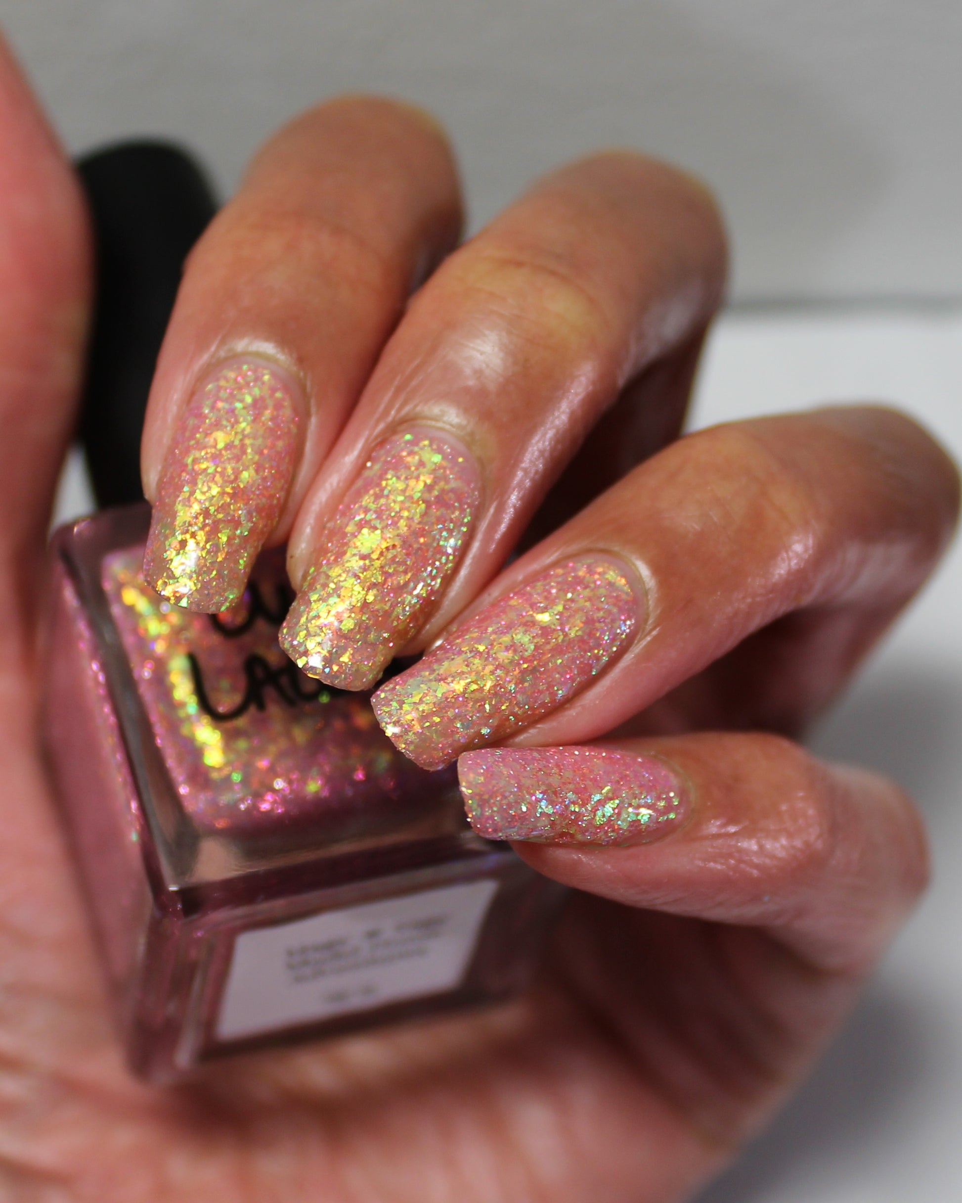A lightly tinted pink crelly base with pink light reflective glitter and iridescent flakies that shift from orange to gold to green and from gold to green (and to blue at extremes)