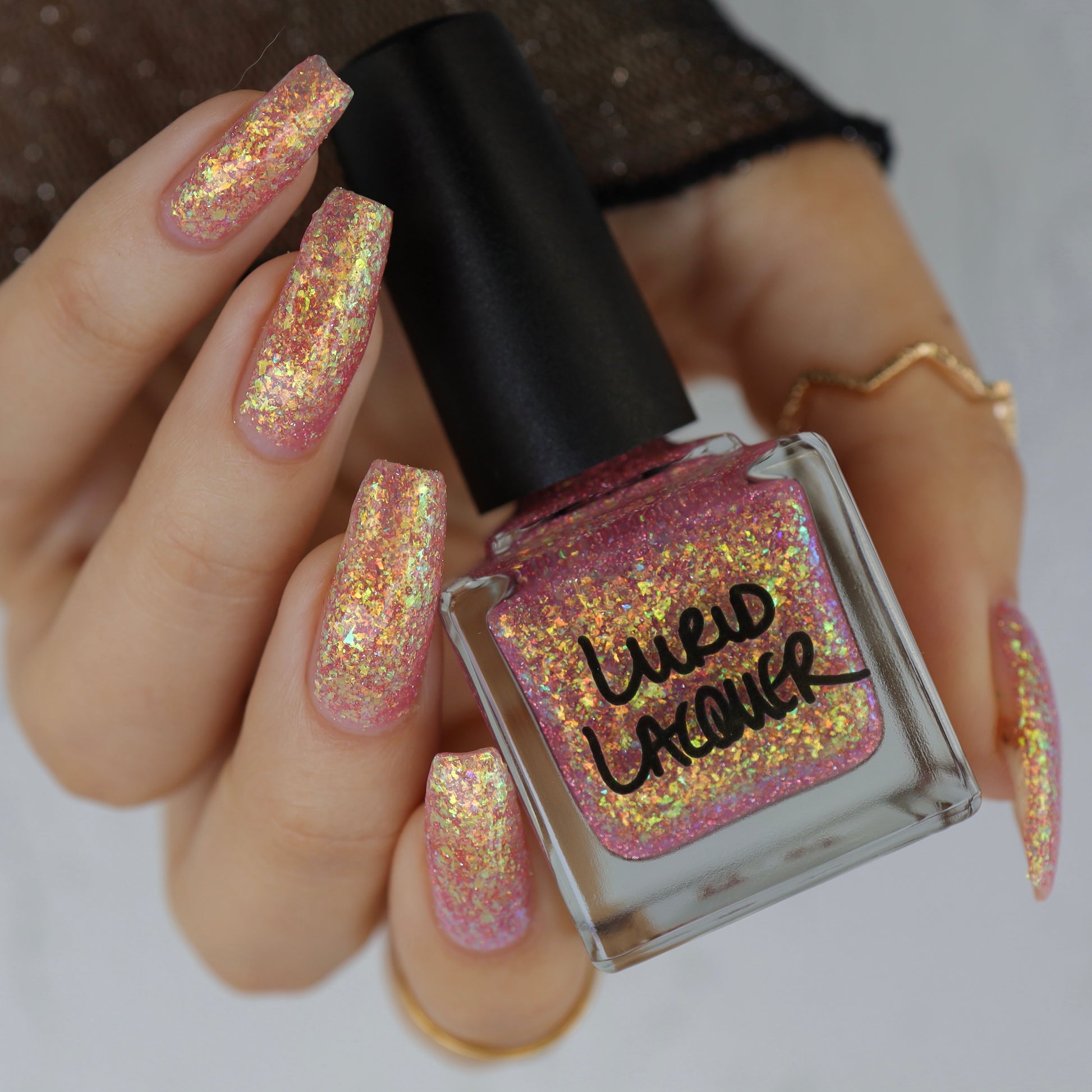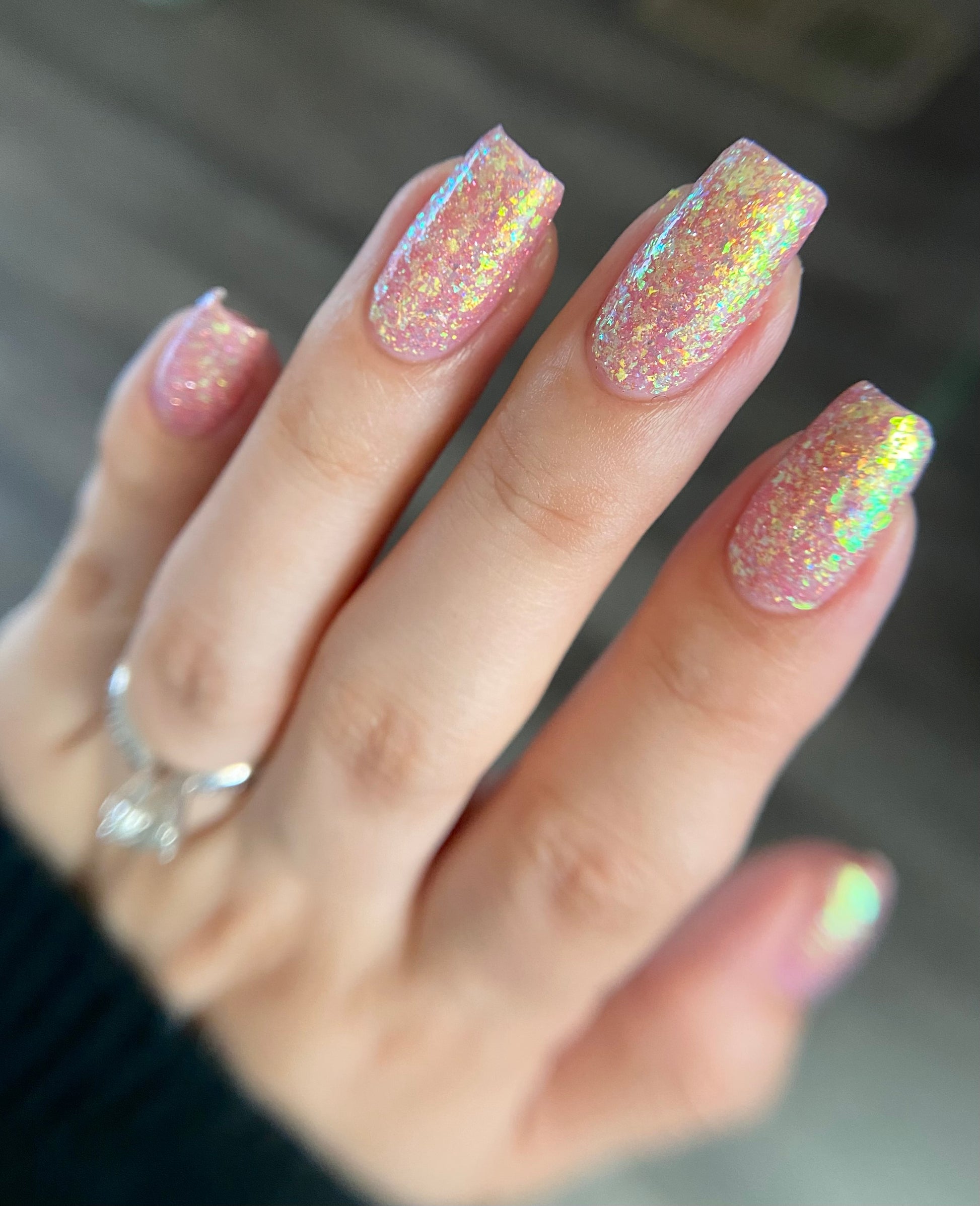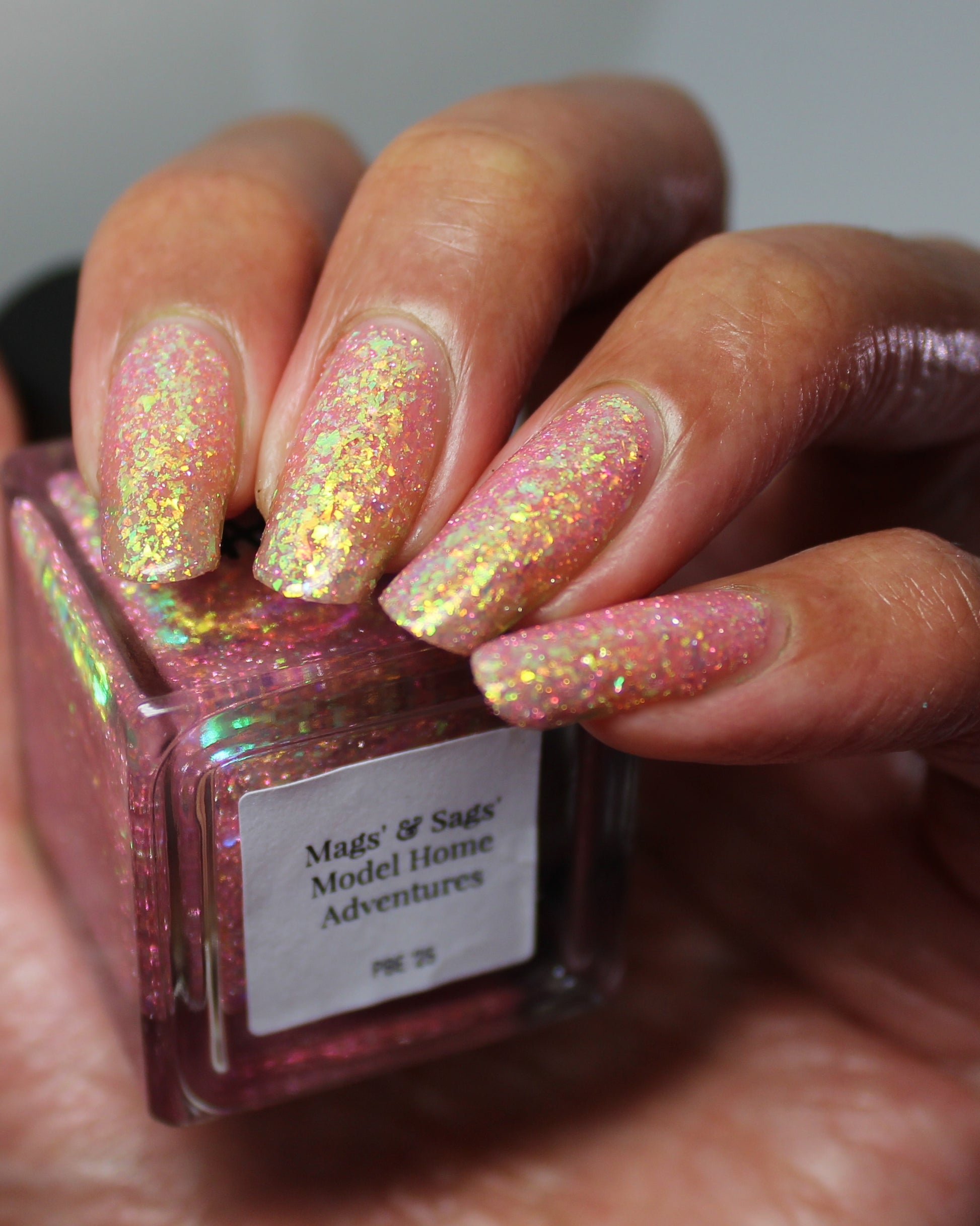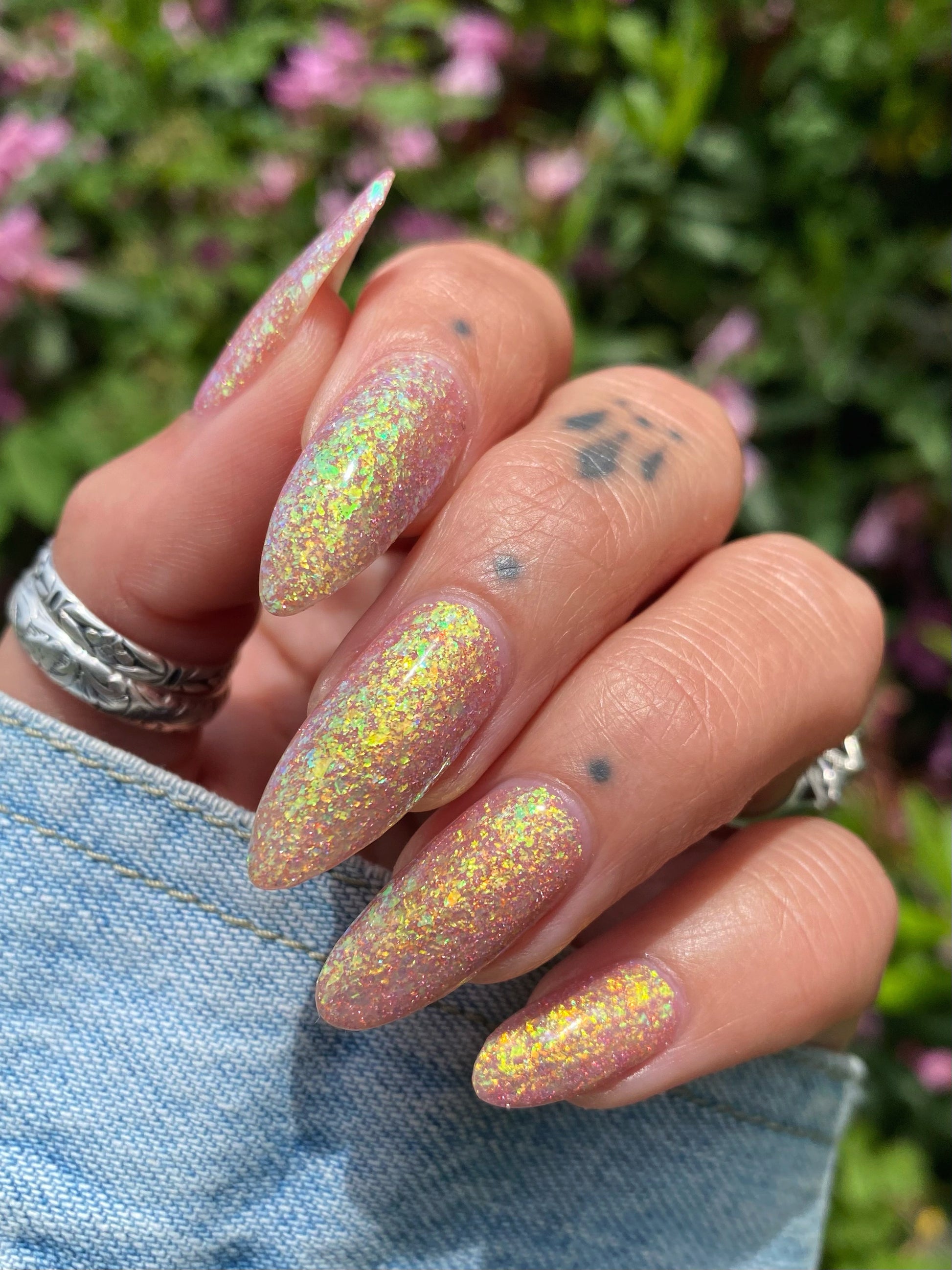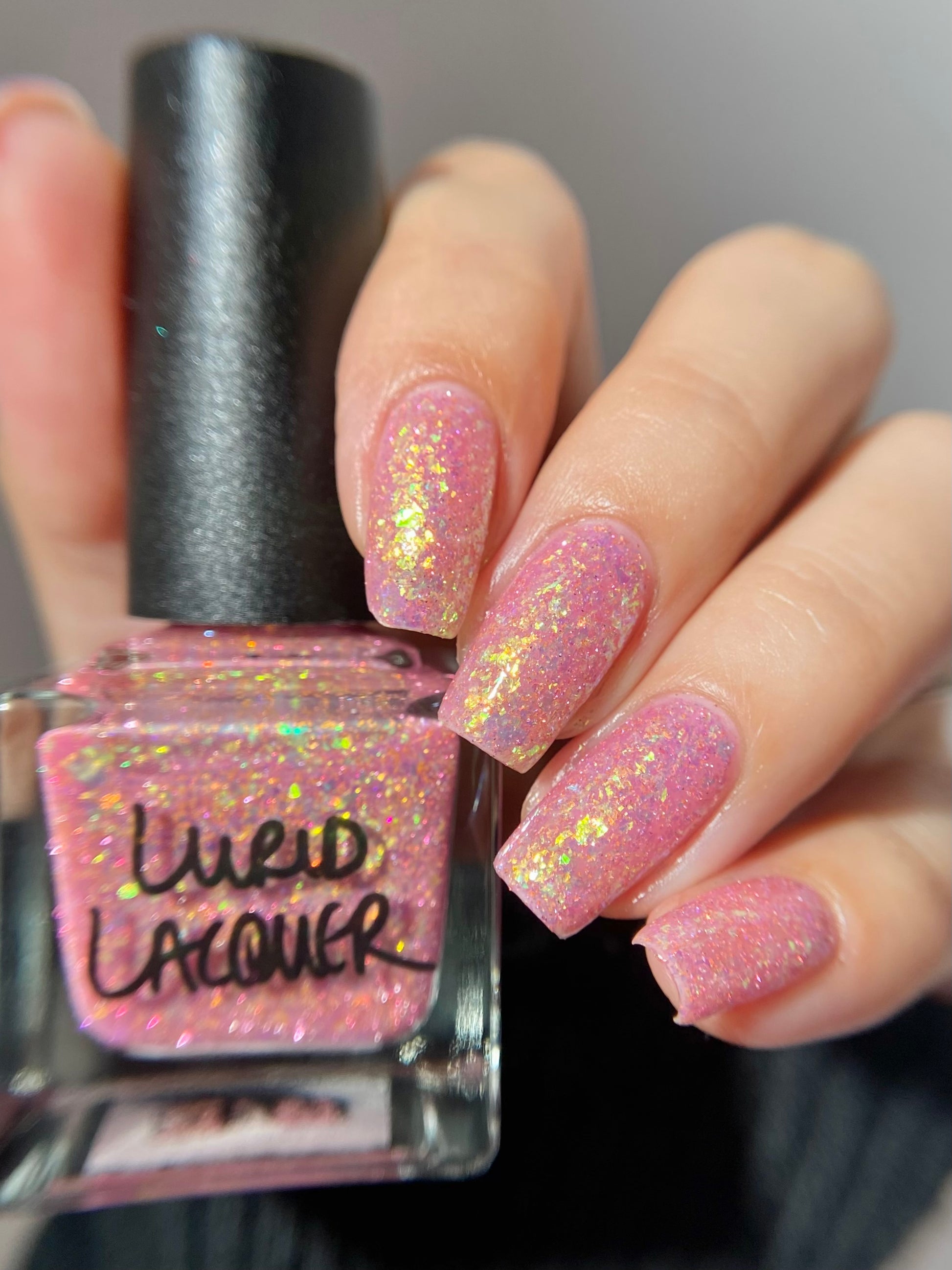 A lightly tinted pink crelly base with pink light reflective glitter and iridescent flakies that shift from orange to gold to green and from gold to green (and to blue at extremes)