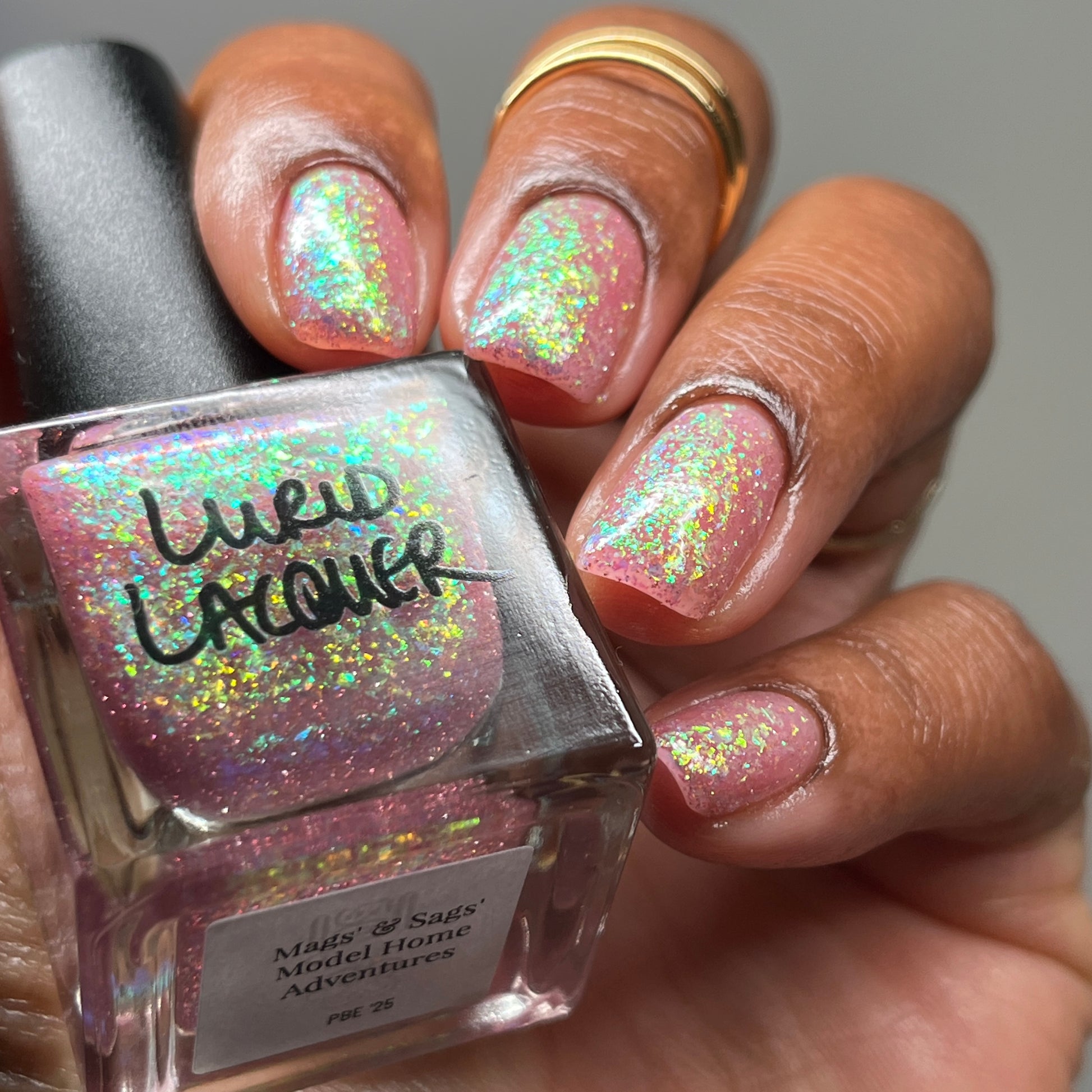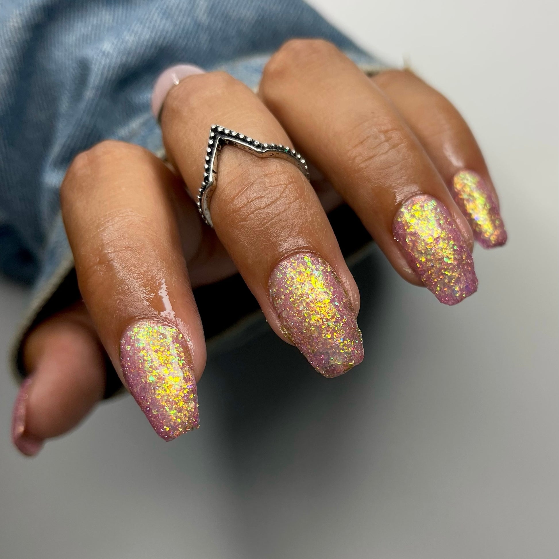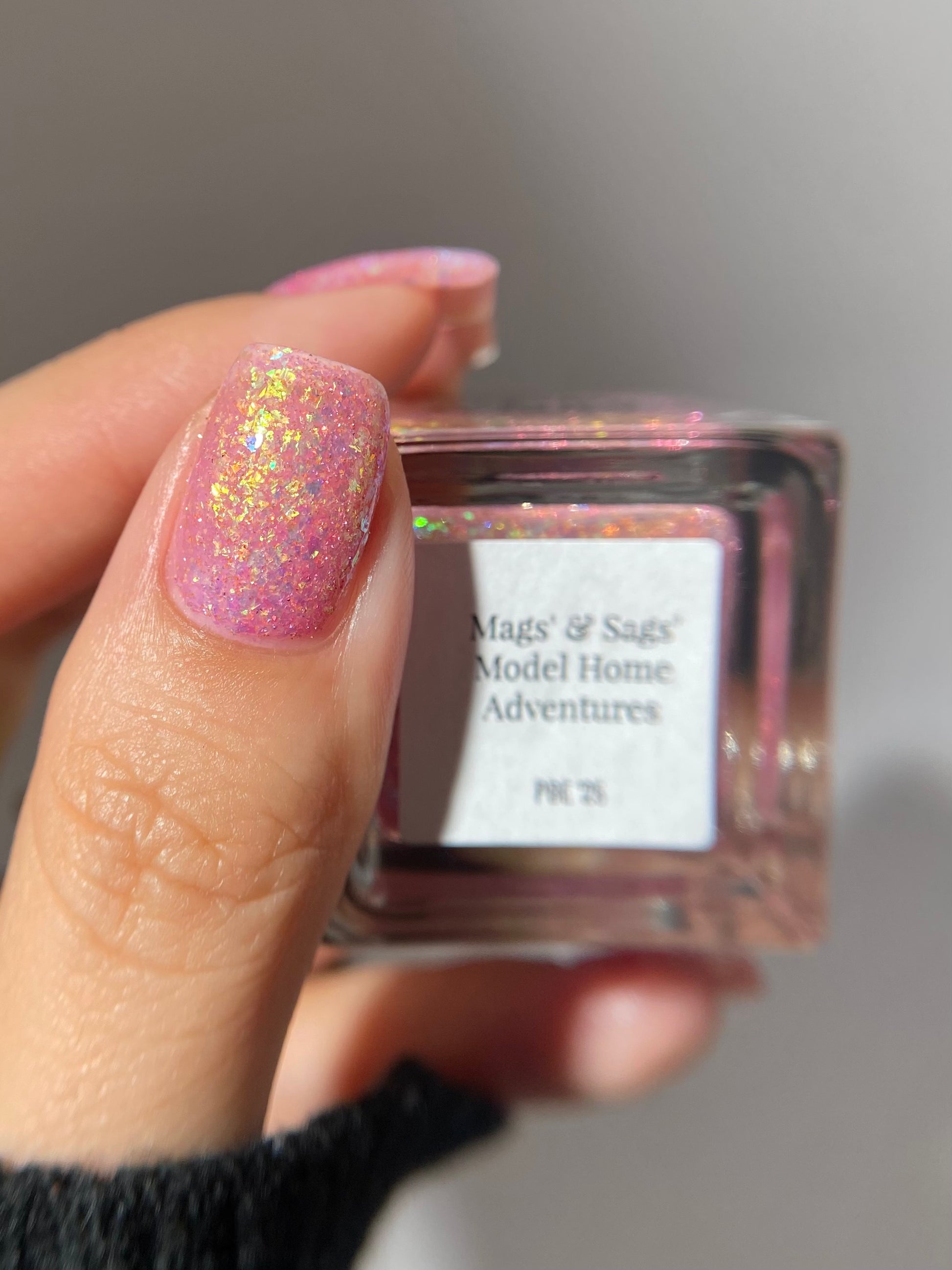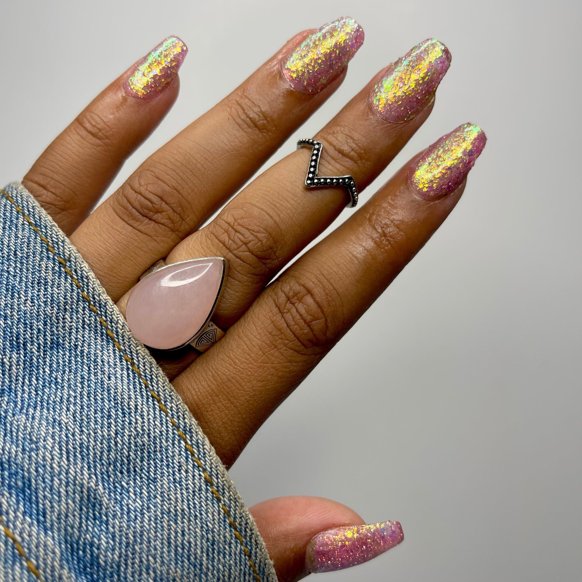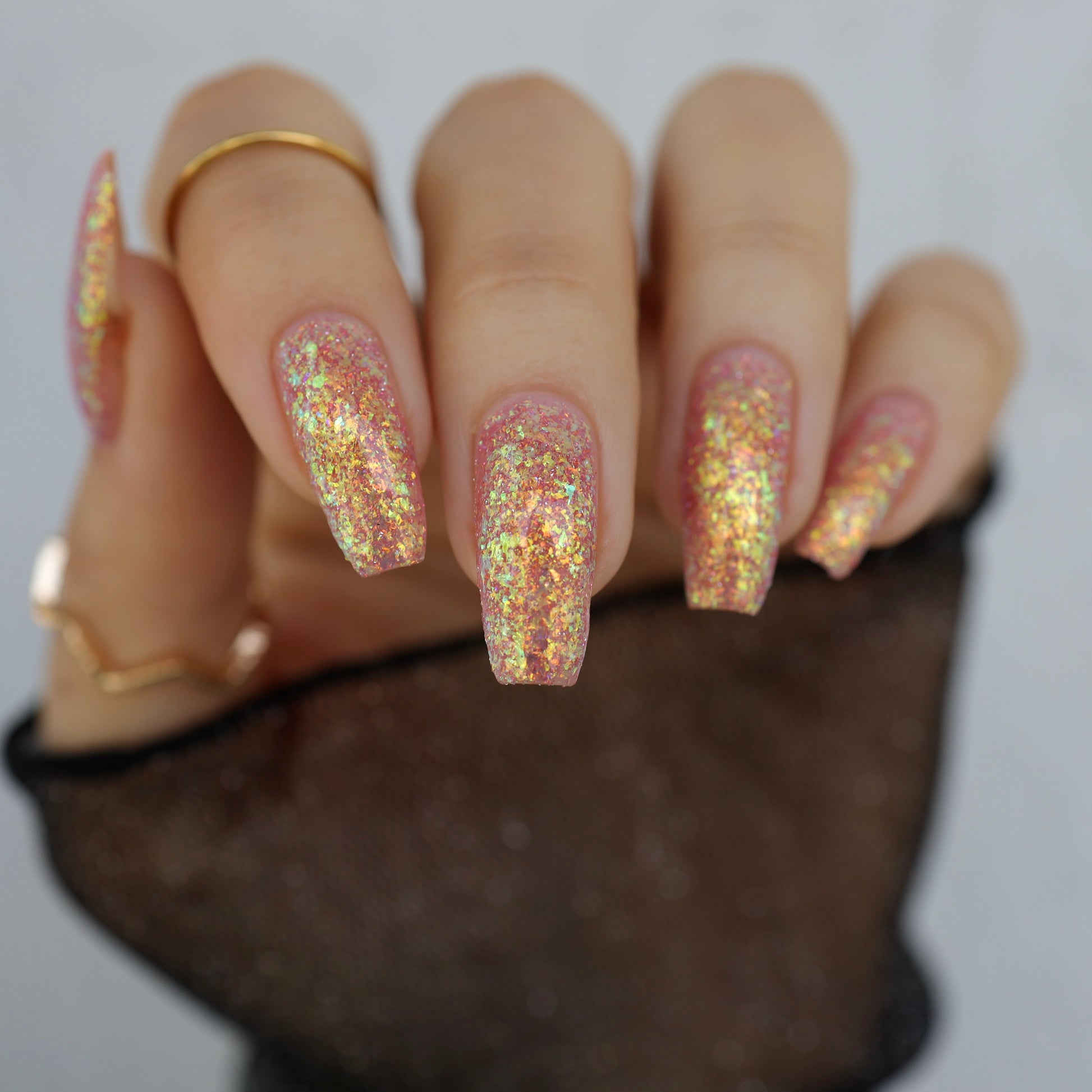 A lightly tinted pink crelly base with pink light reflective glitter and iridescent flakies that shift from orange to gold to green and from gold to green (and to blue at extremes)