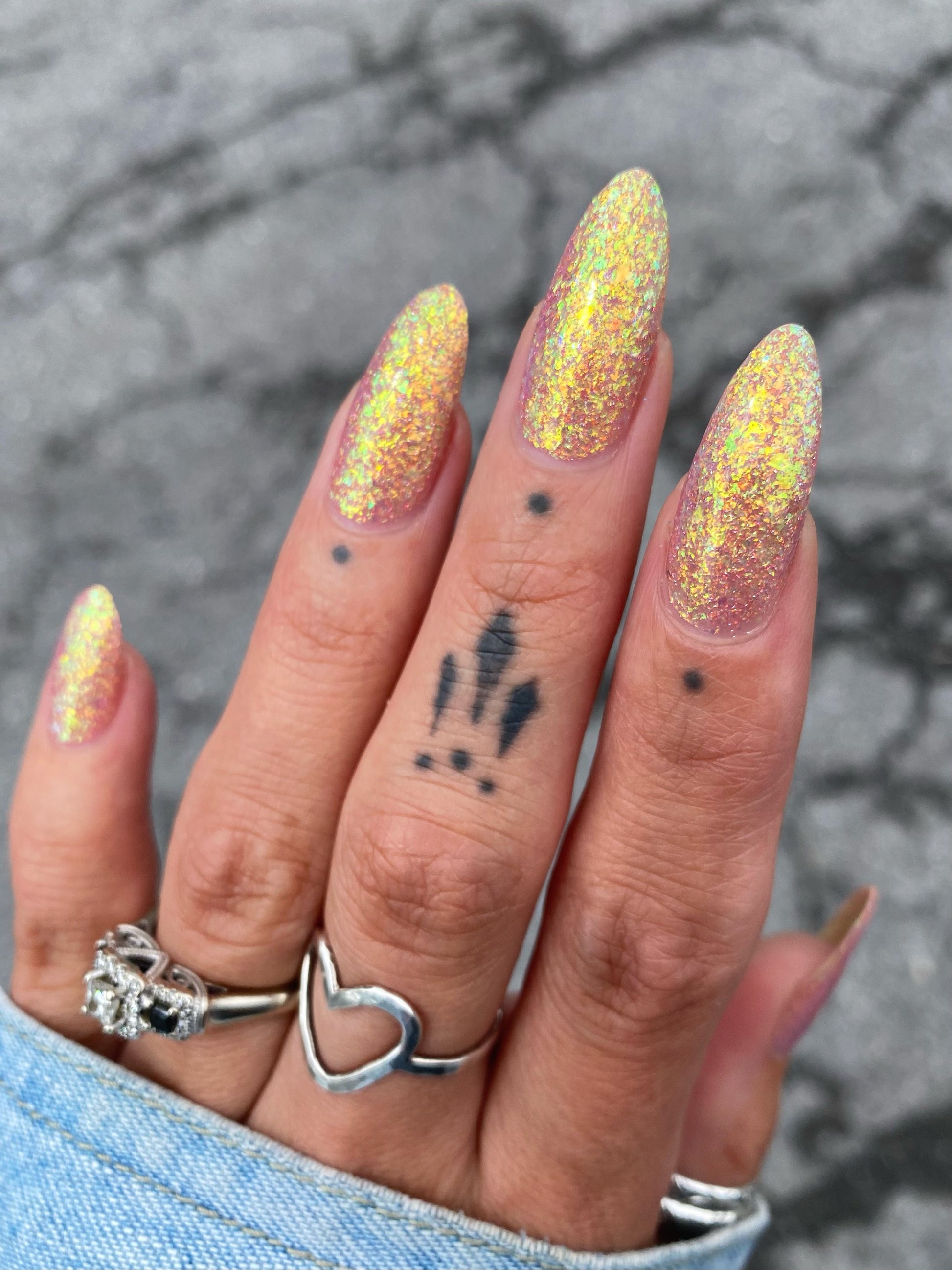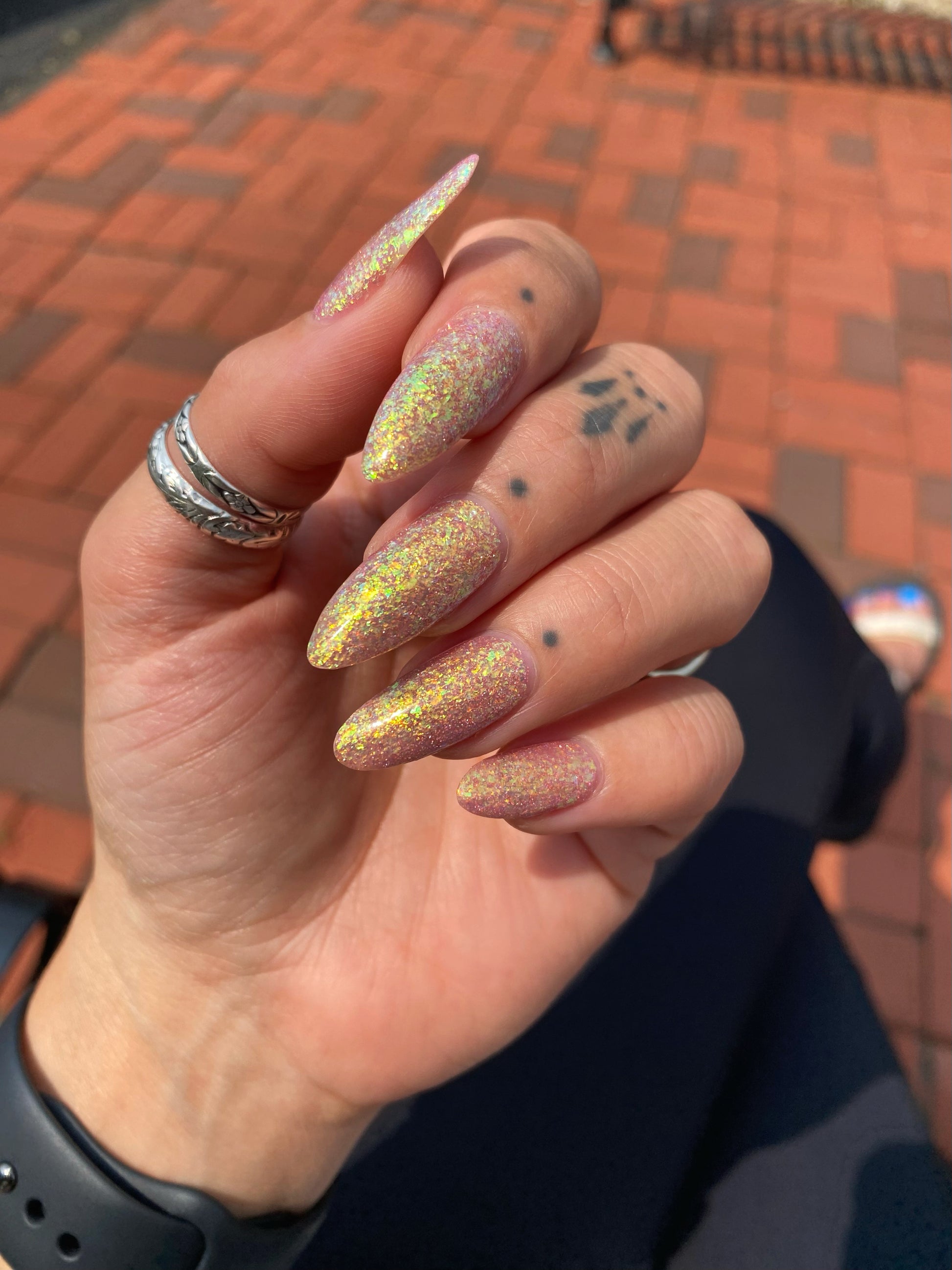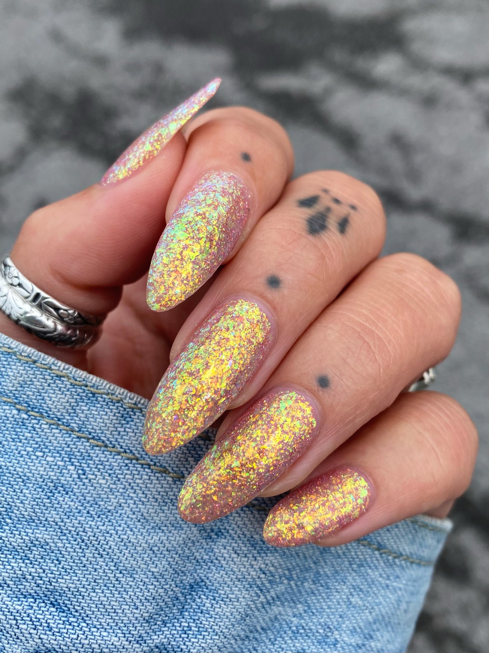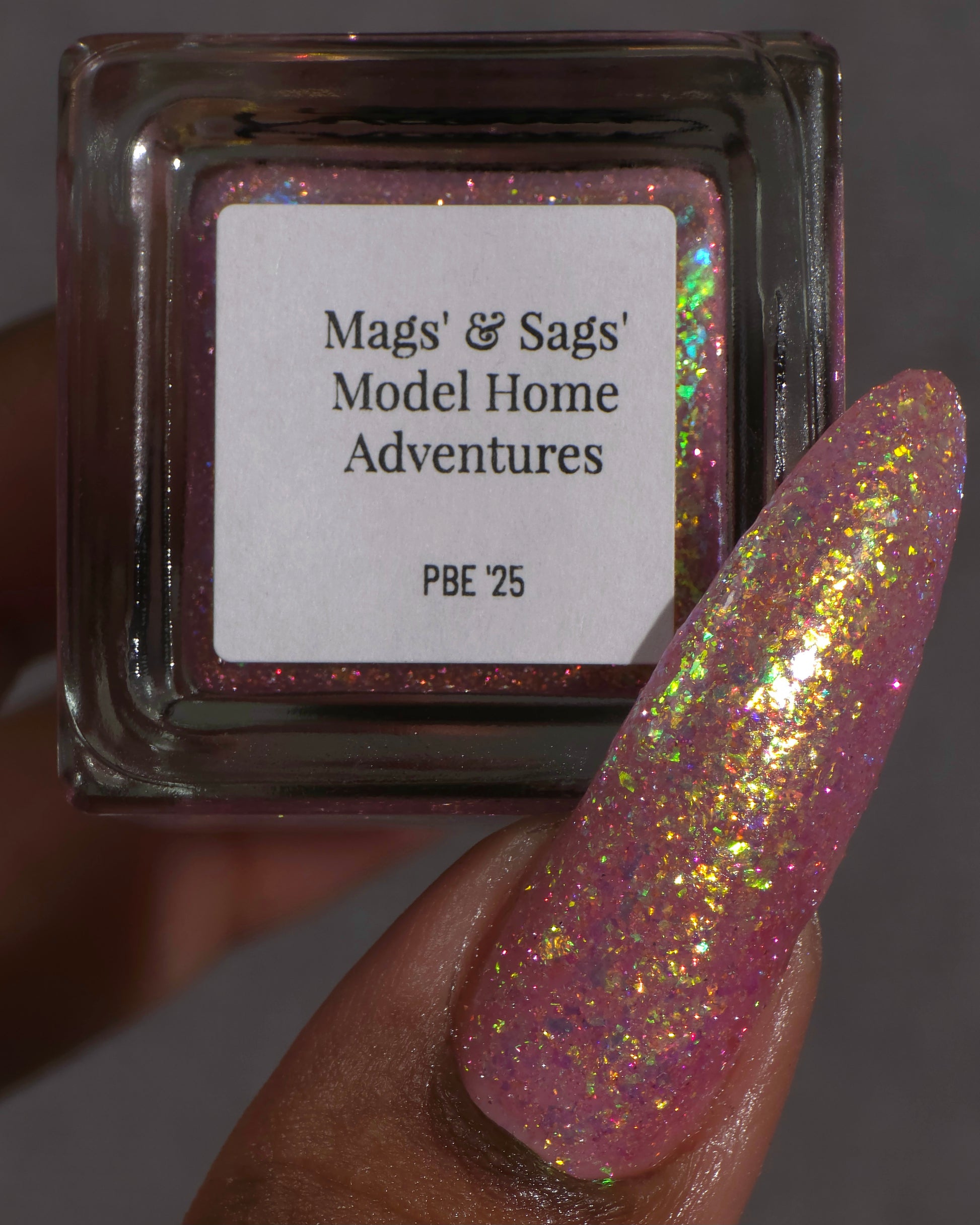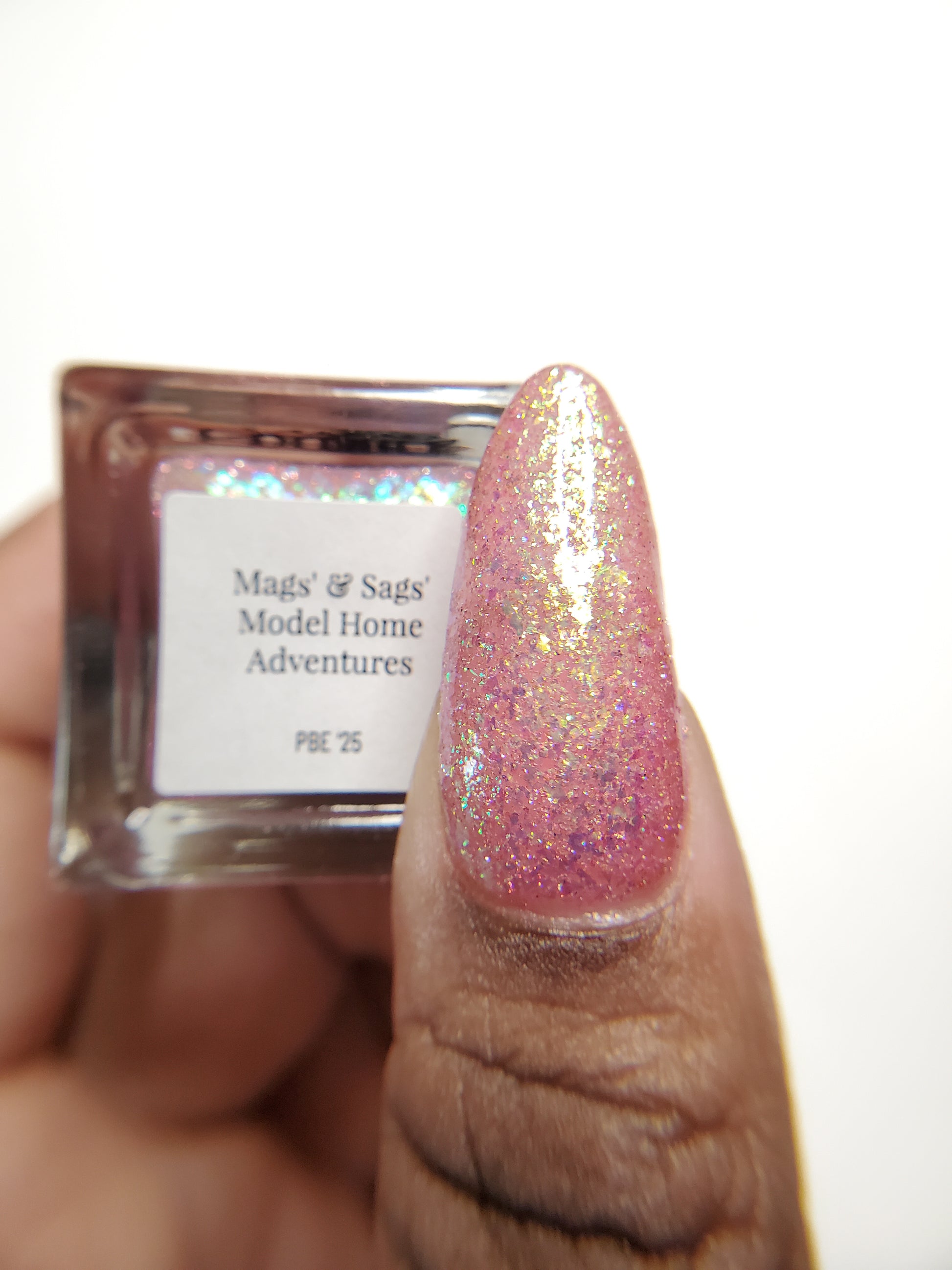 A lightly tinted pink crelly base with pink light reflective glitter and iridescent flakies that shift from orange to gold to green and from gold to green (and to blue at extremes)