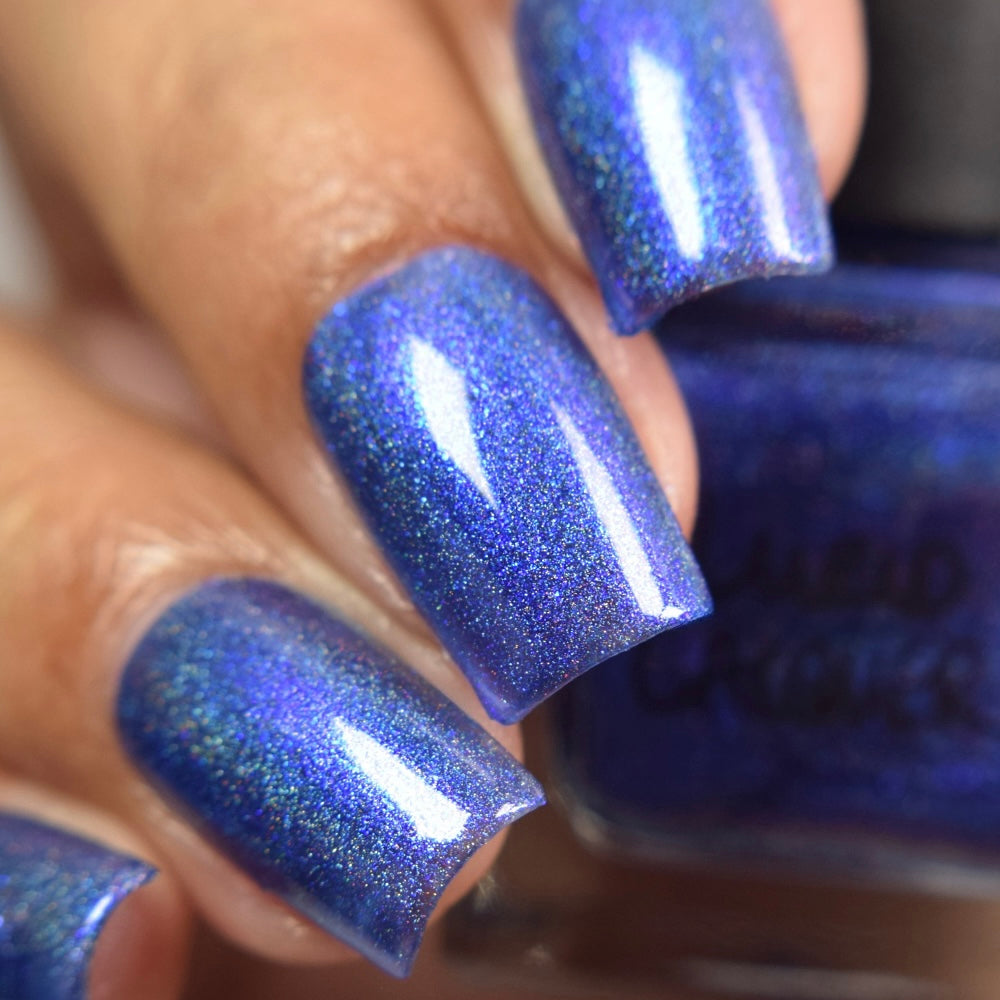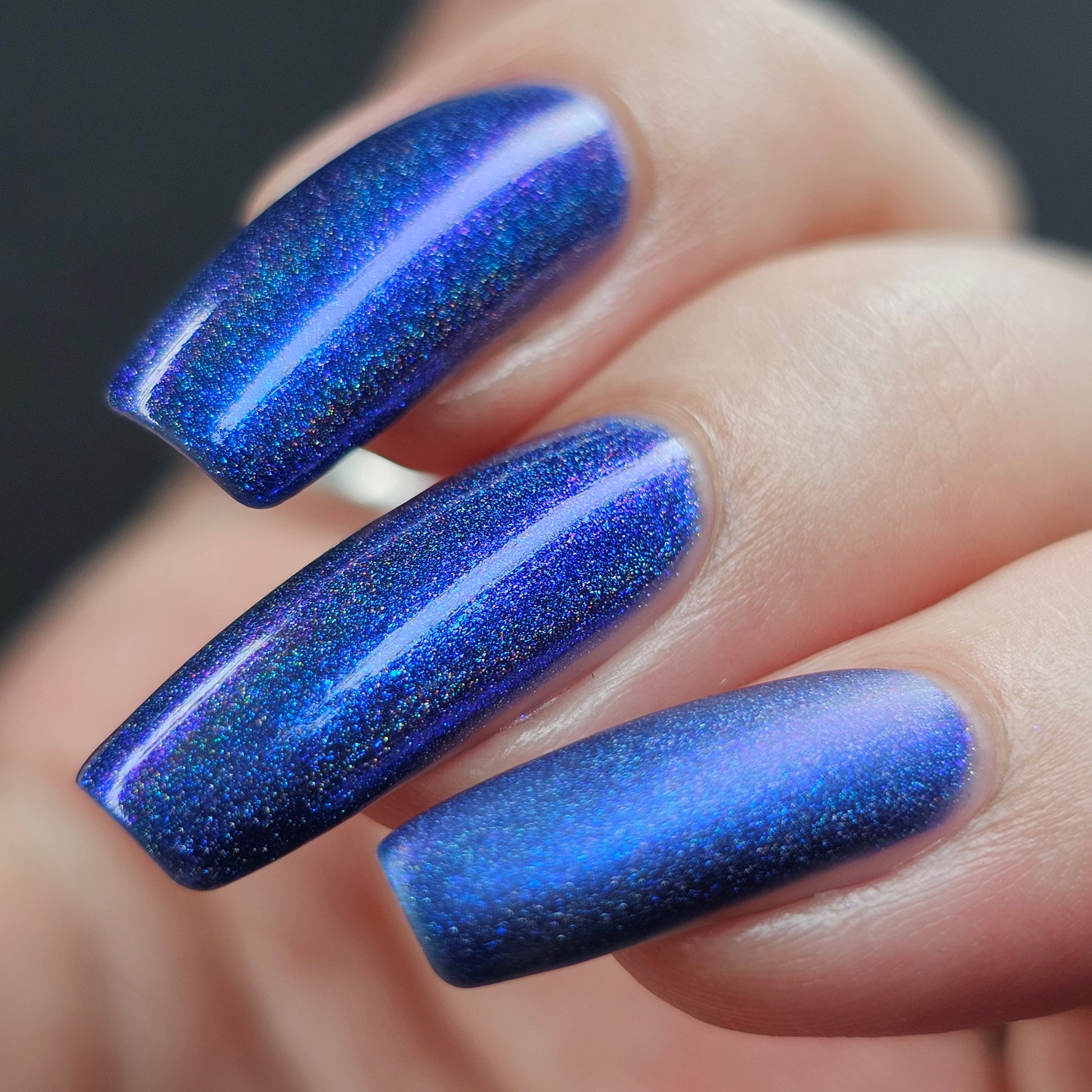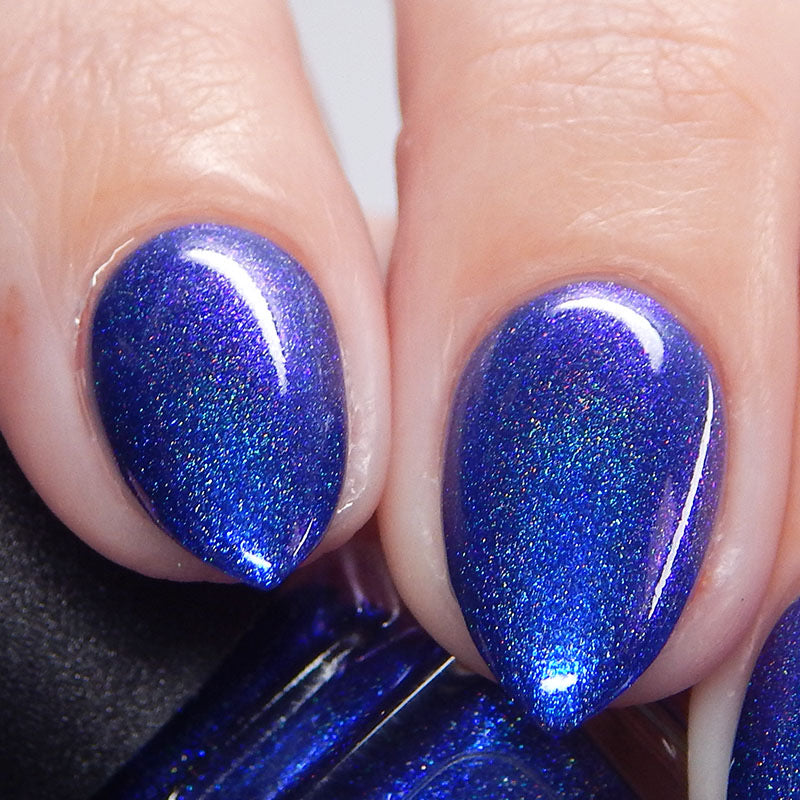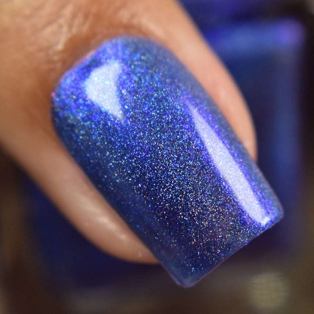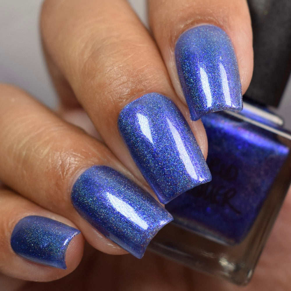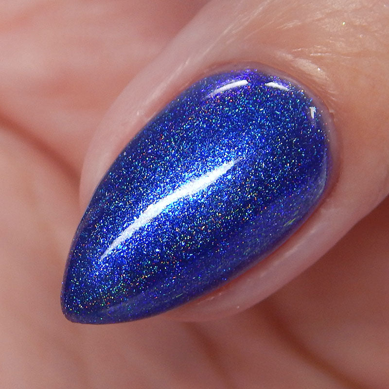 An indigo jelly base with subtle blue to purple aurora shimmer and linear holographic pigment