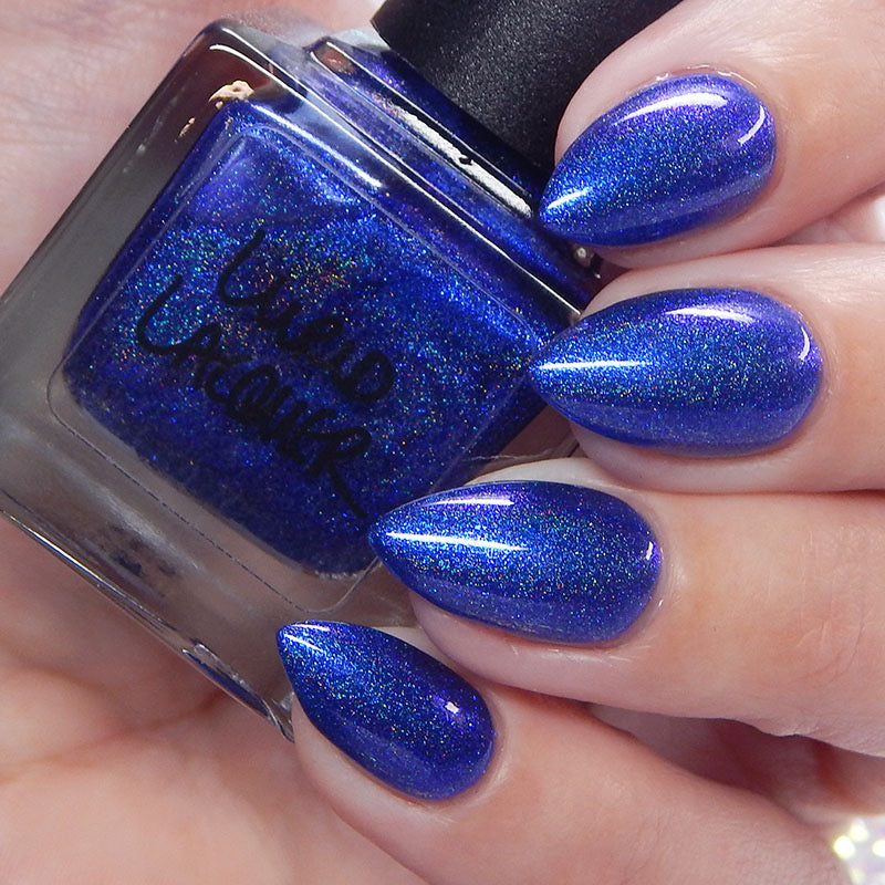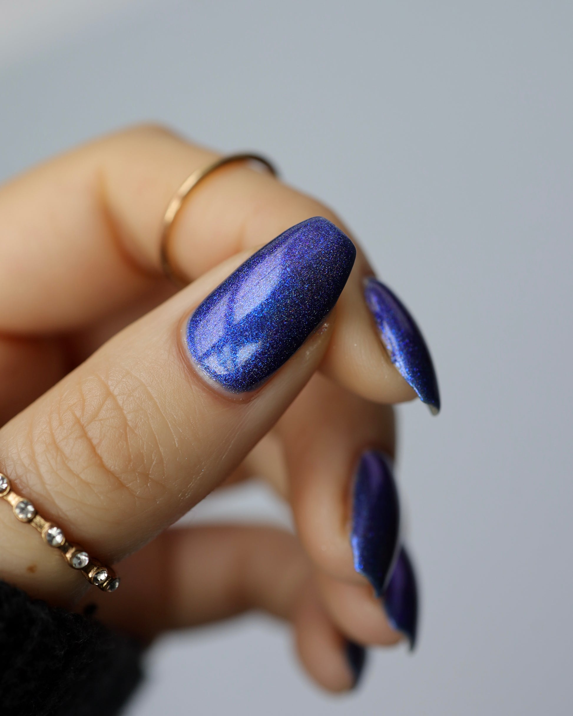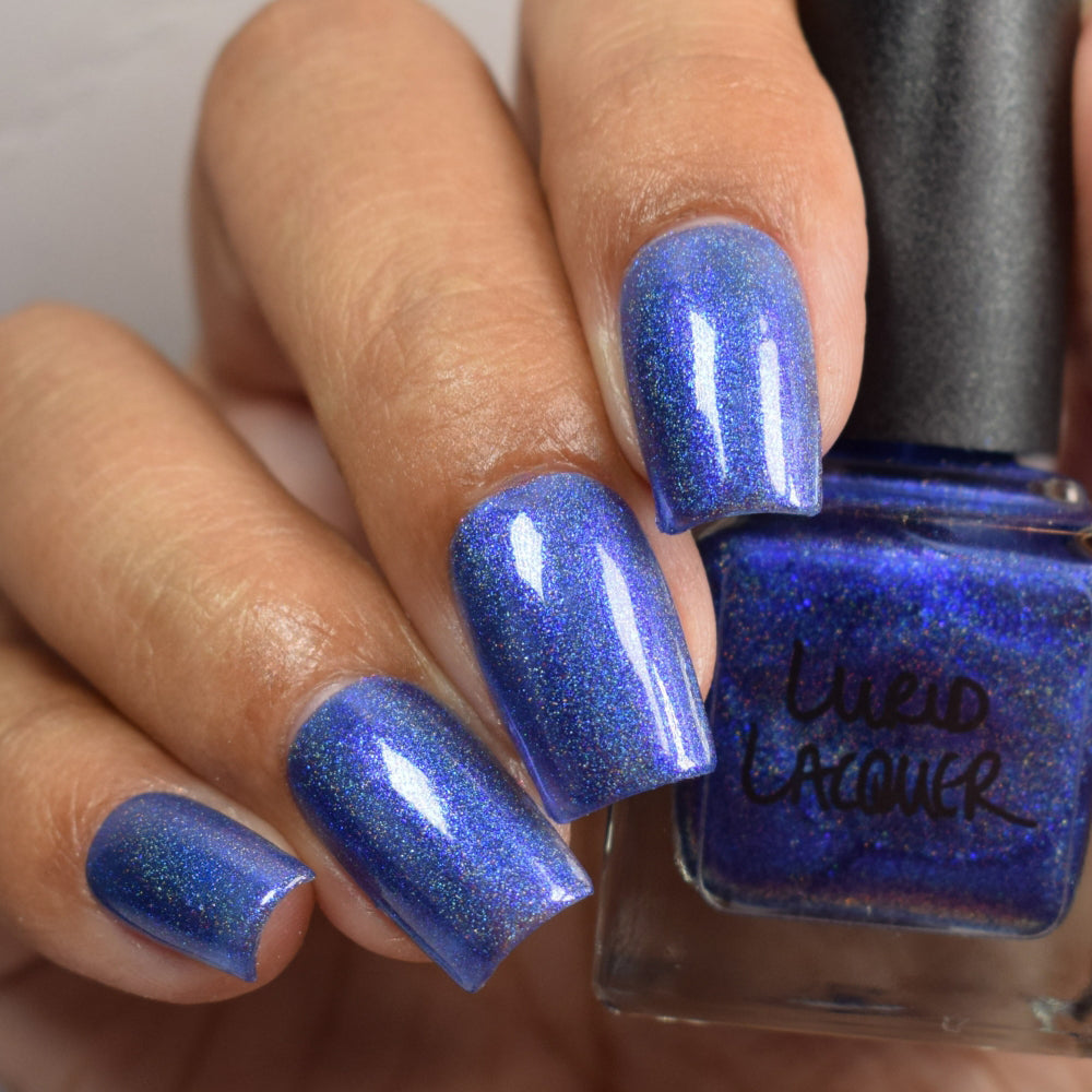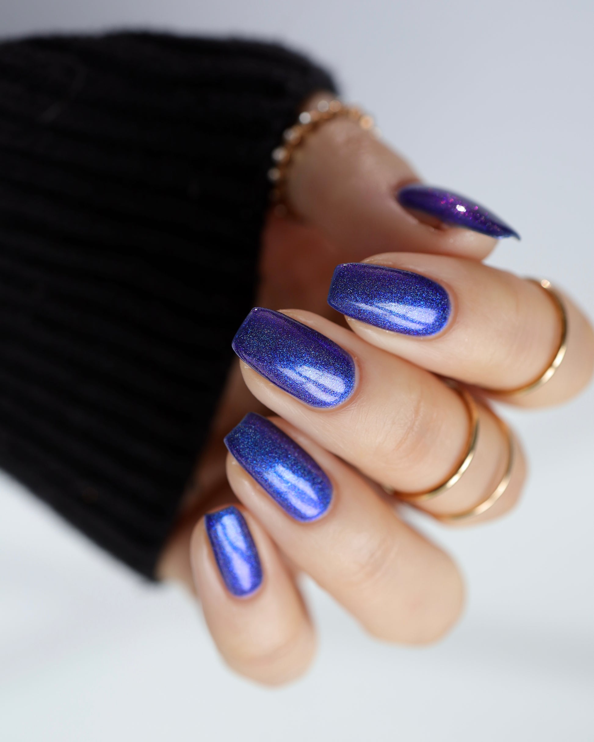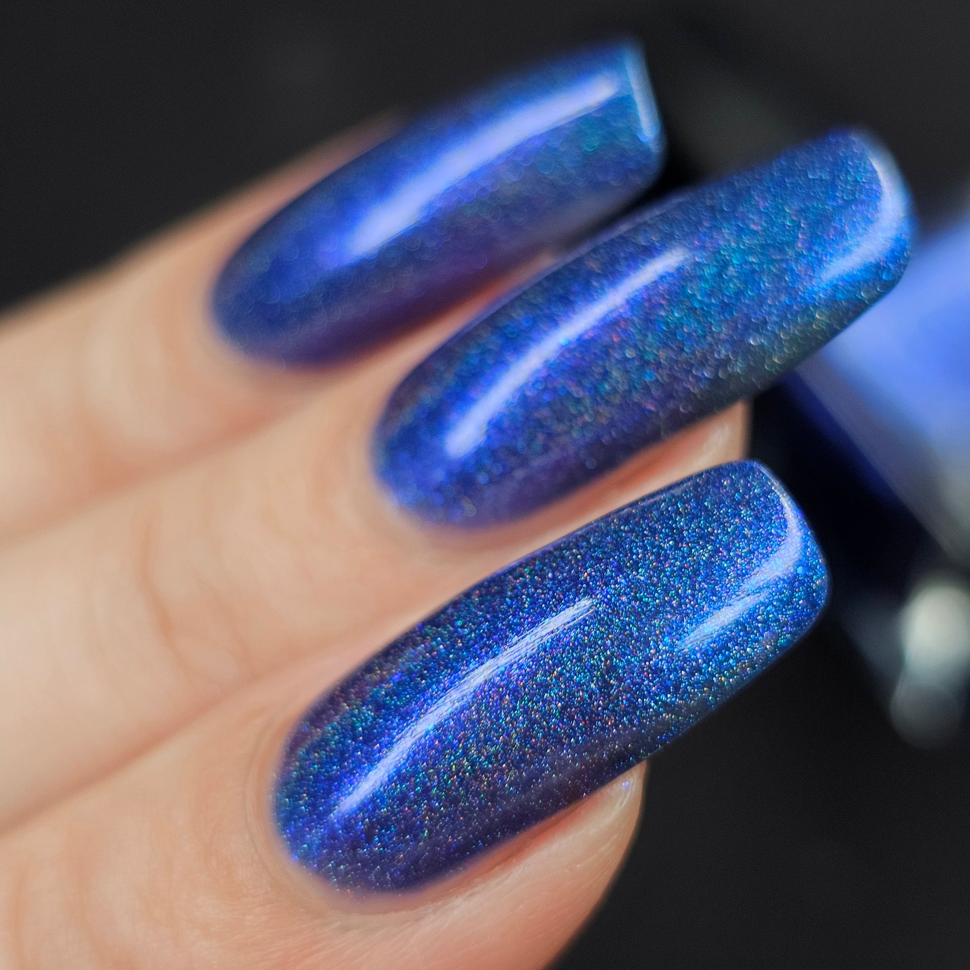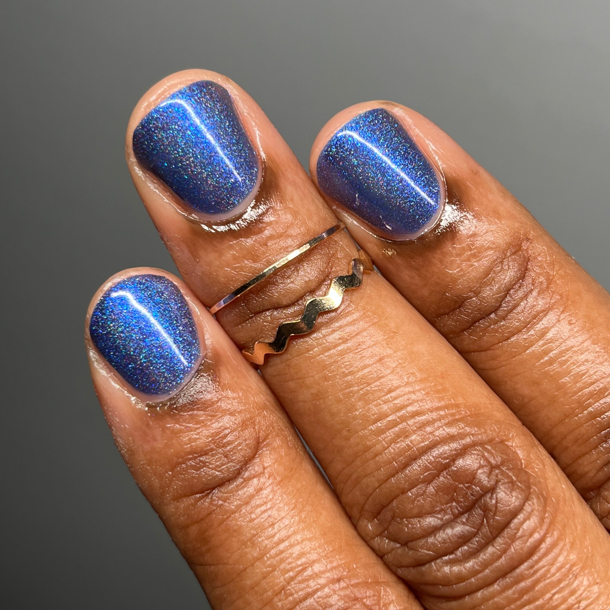 An indigo jelly base with subtle blue to purple aurora shimmer and linear holographic pigment