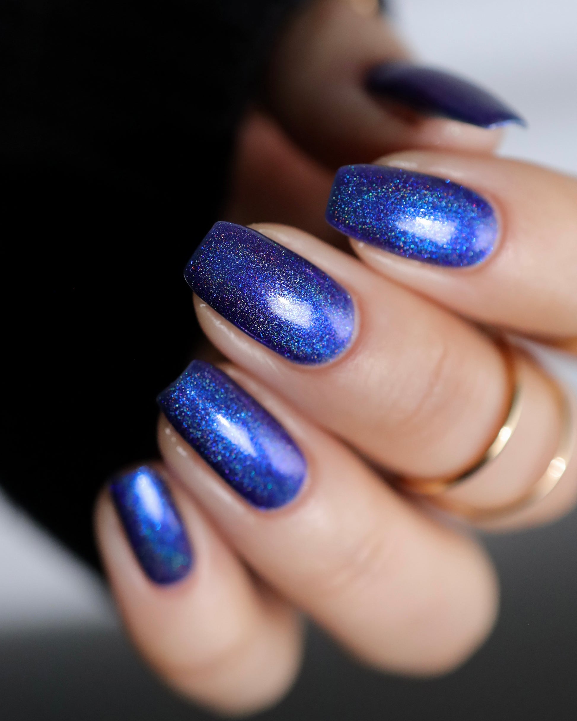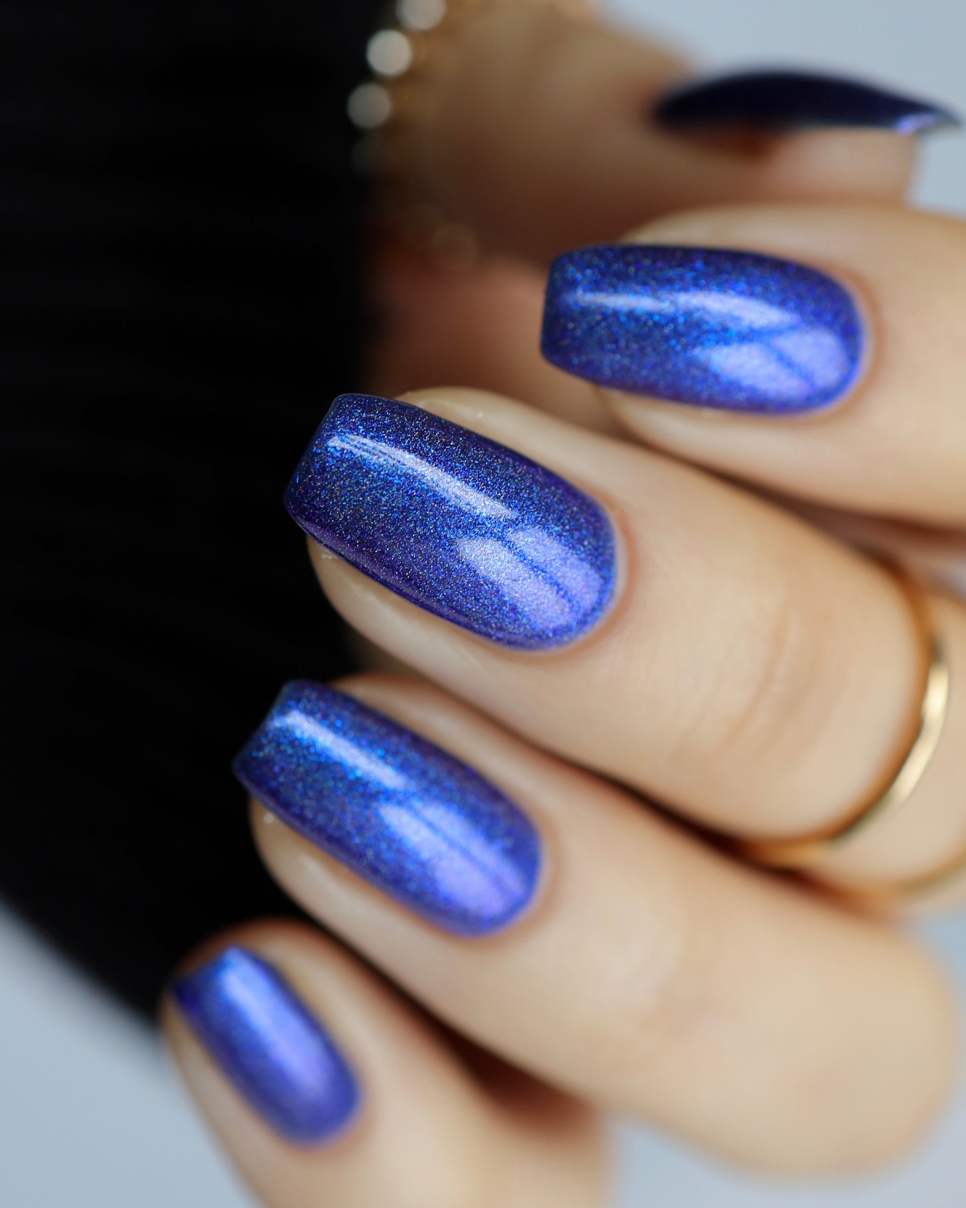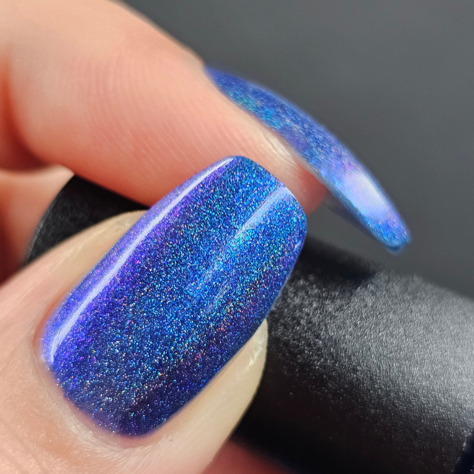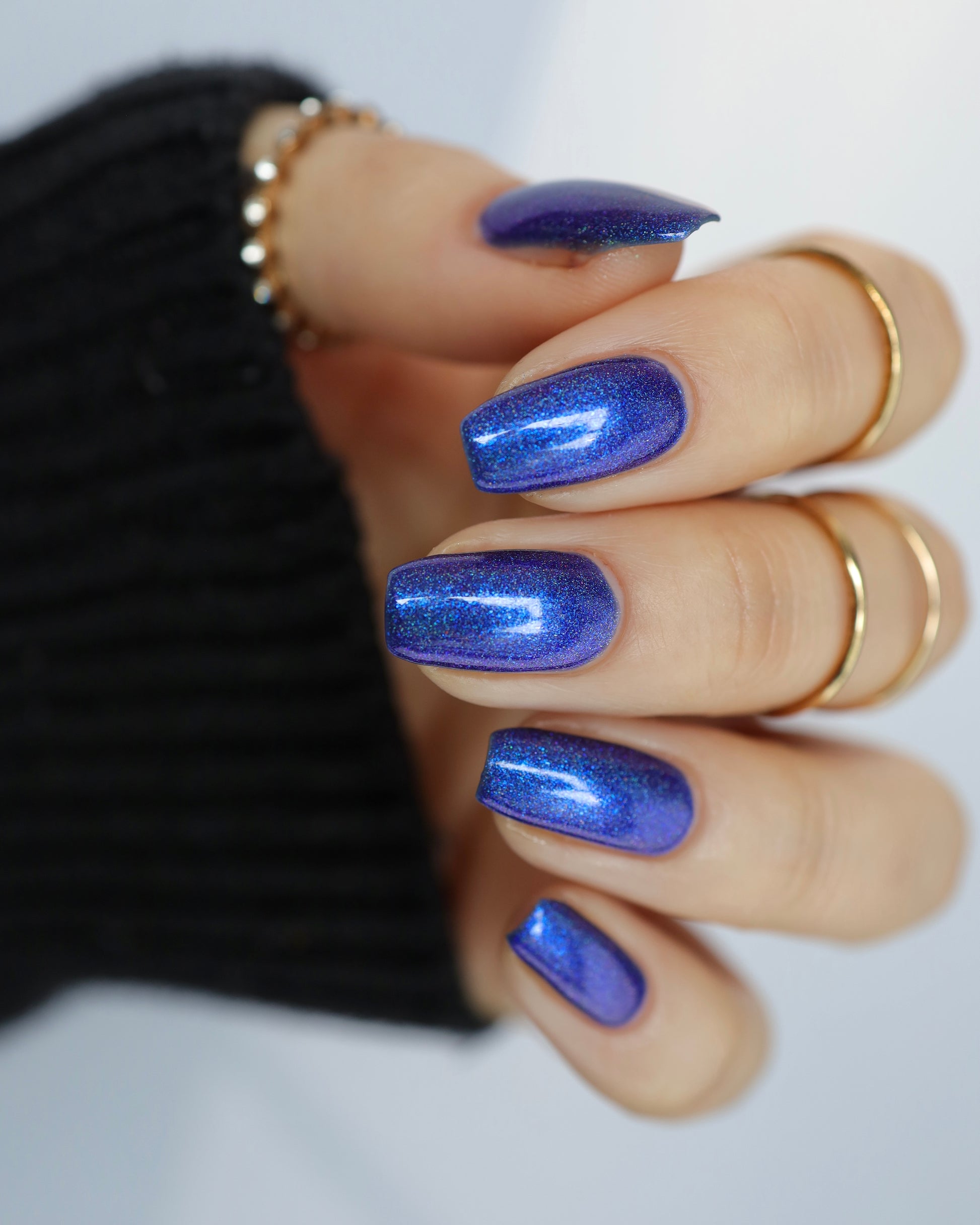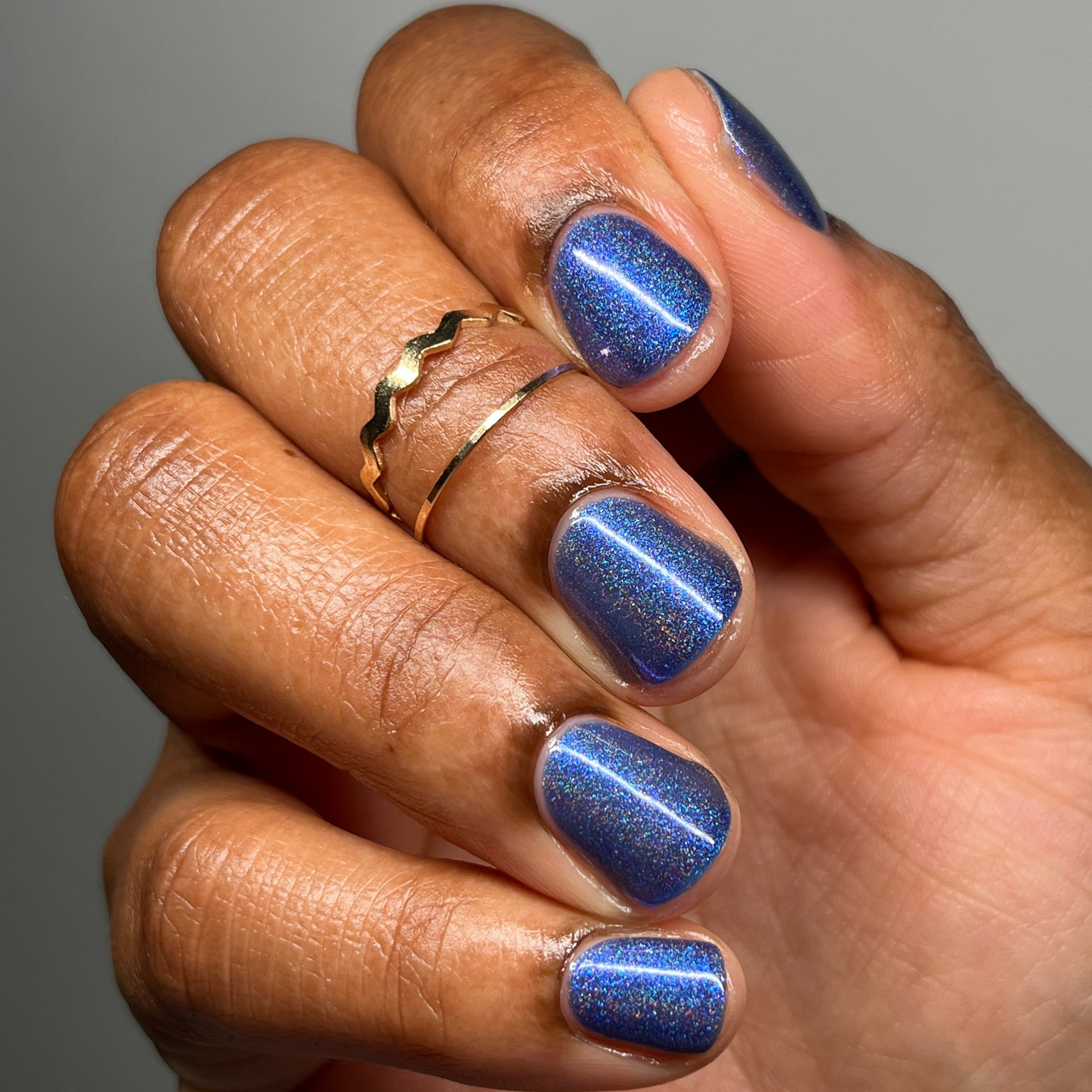 An indigo jelly base with subtle blue to purple aurora shimmer and linear holographic pigment