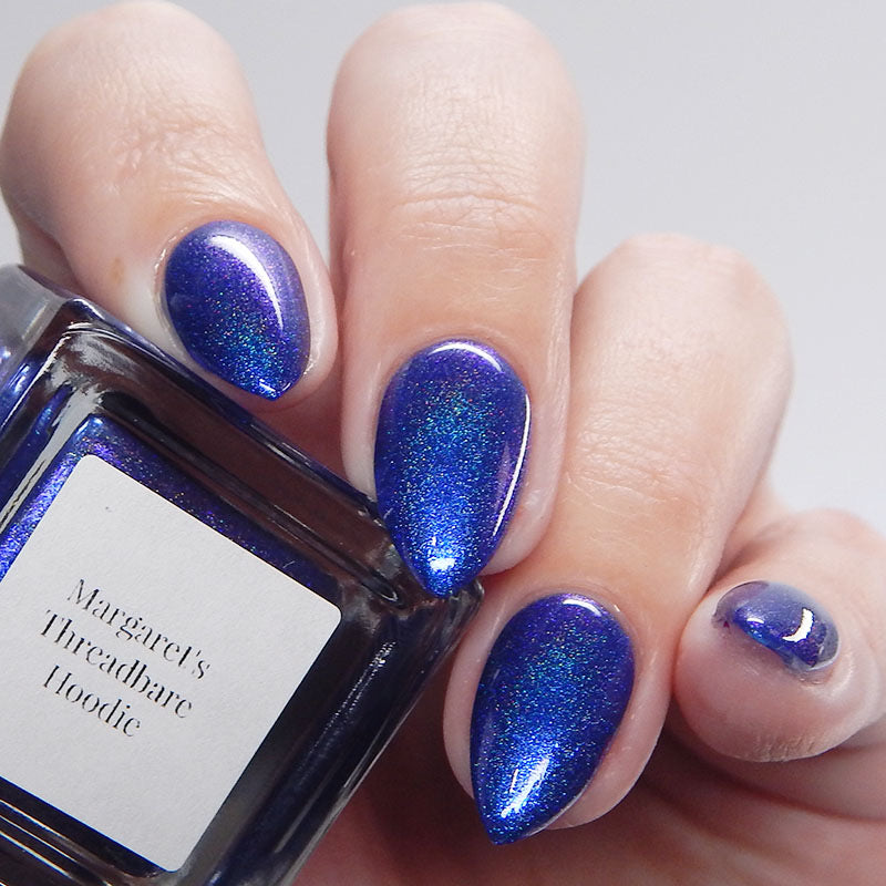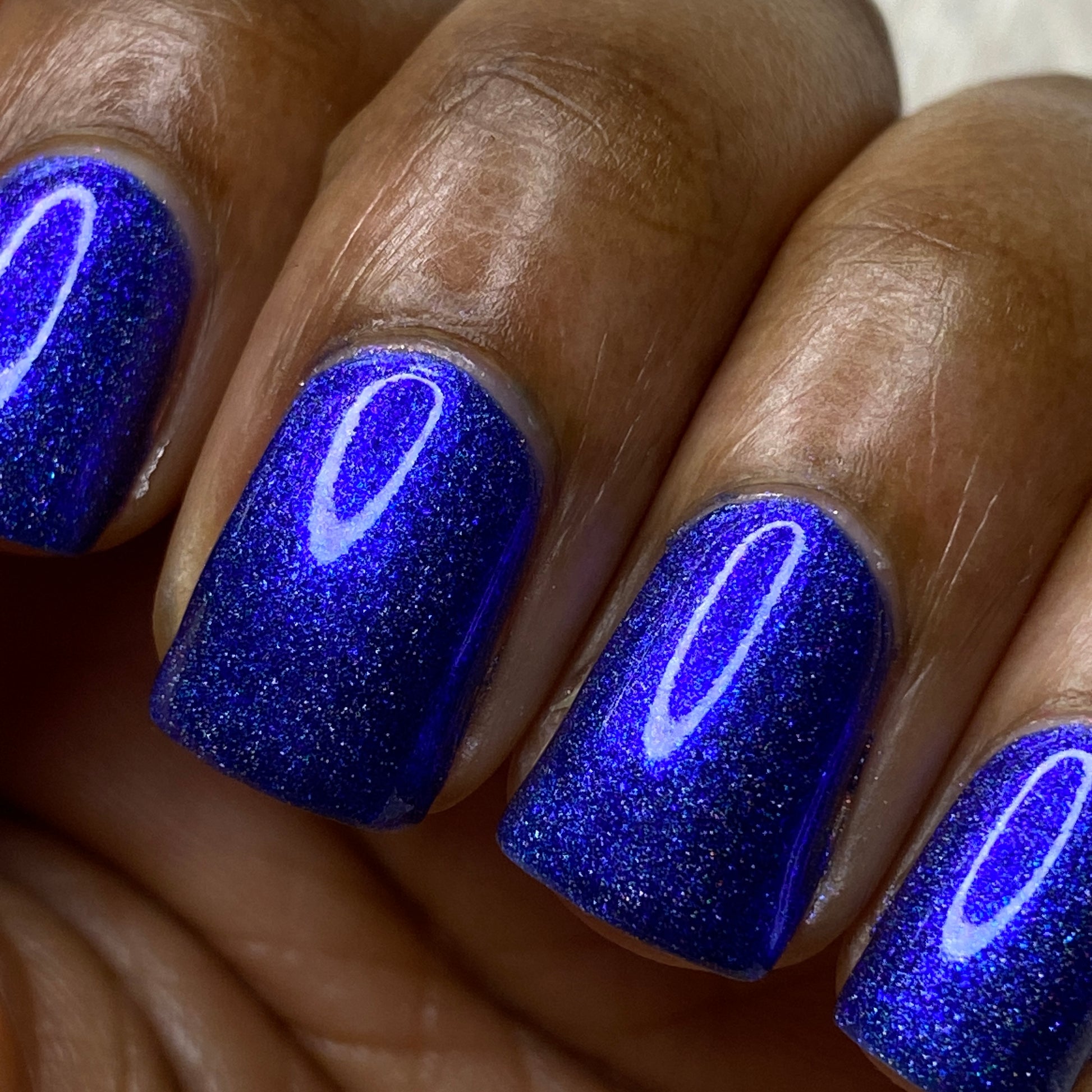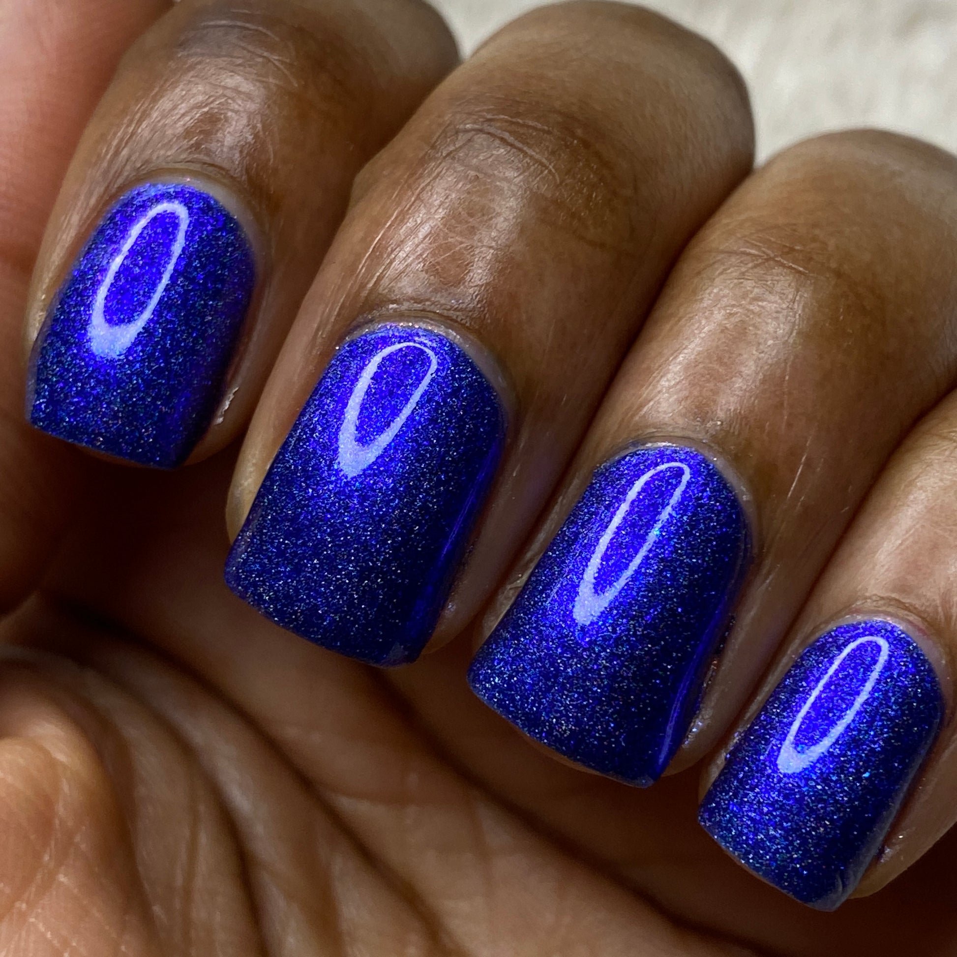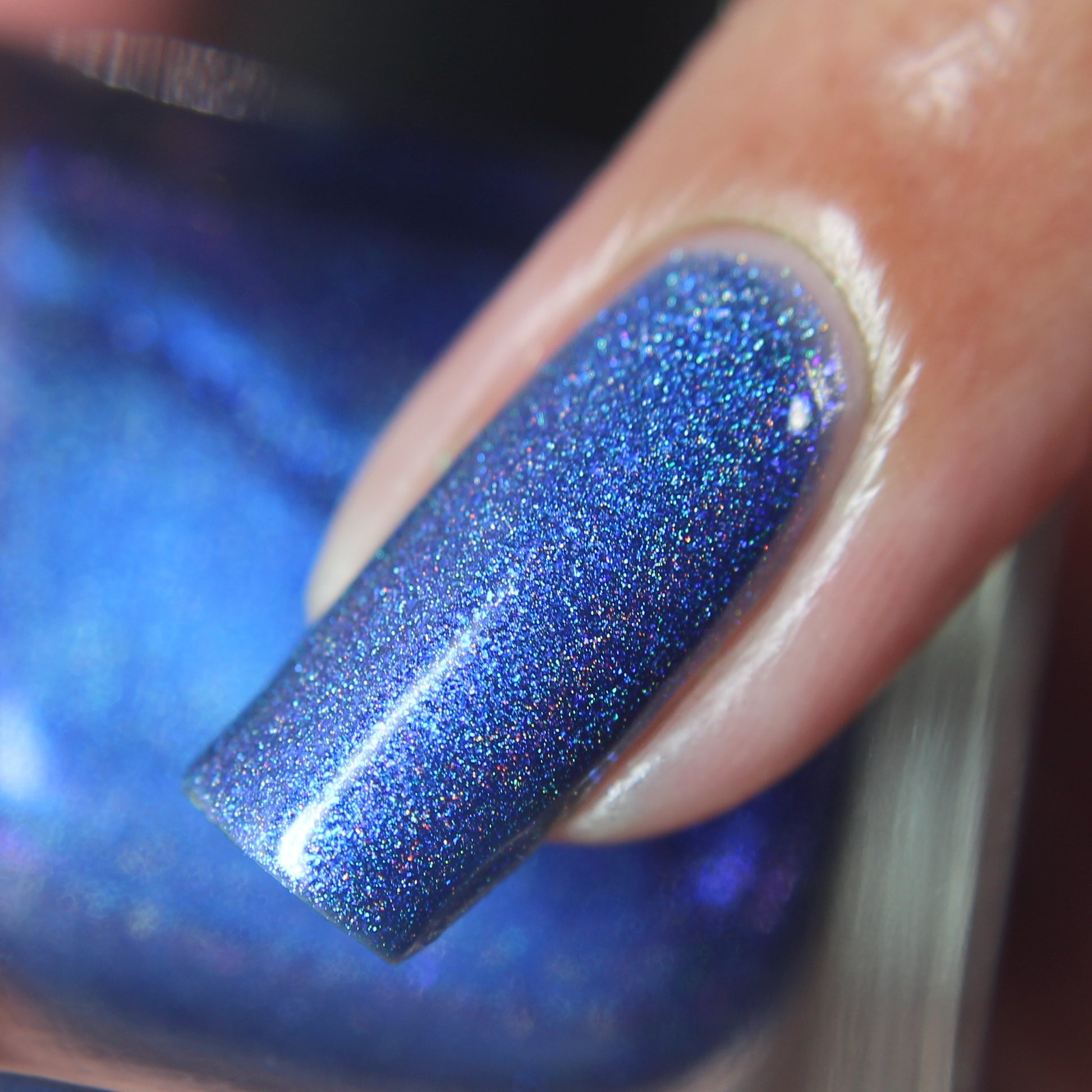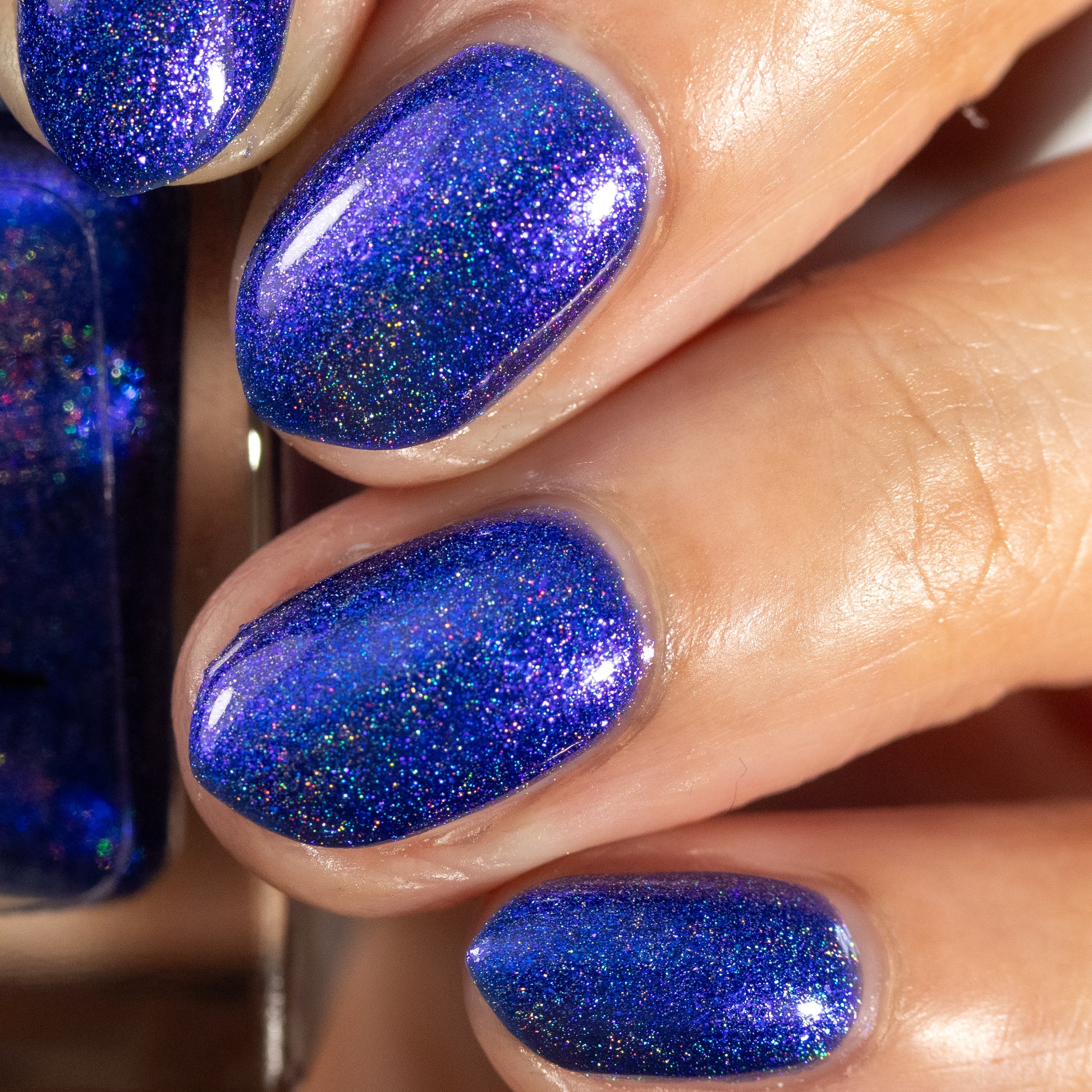 An indigo jelly base with subtle blue to purple aurora shimmer and linear holographic pigment