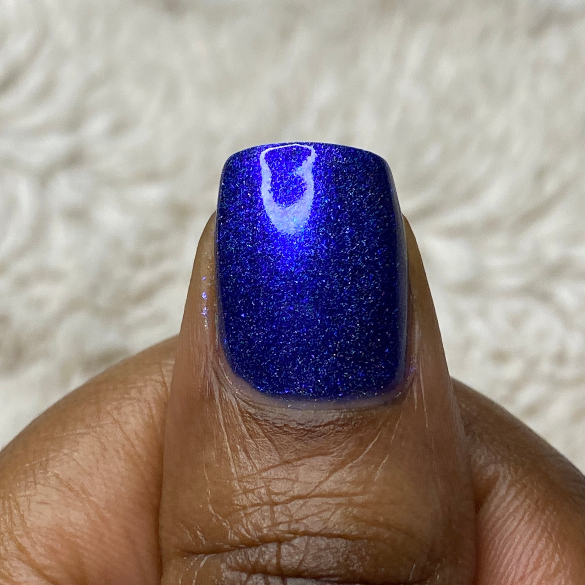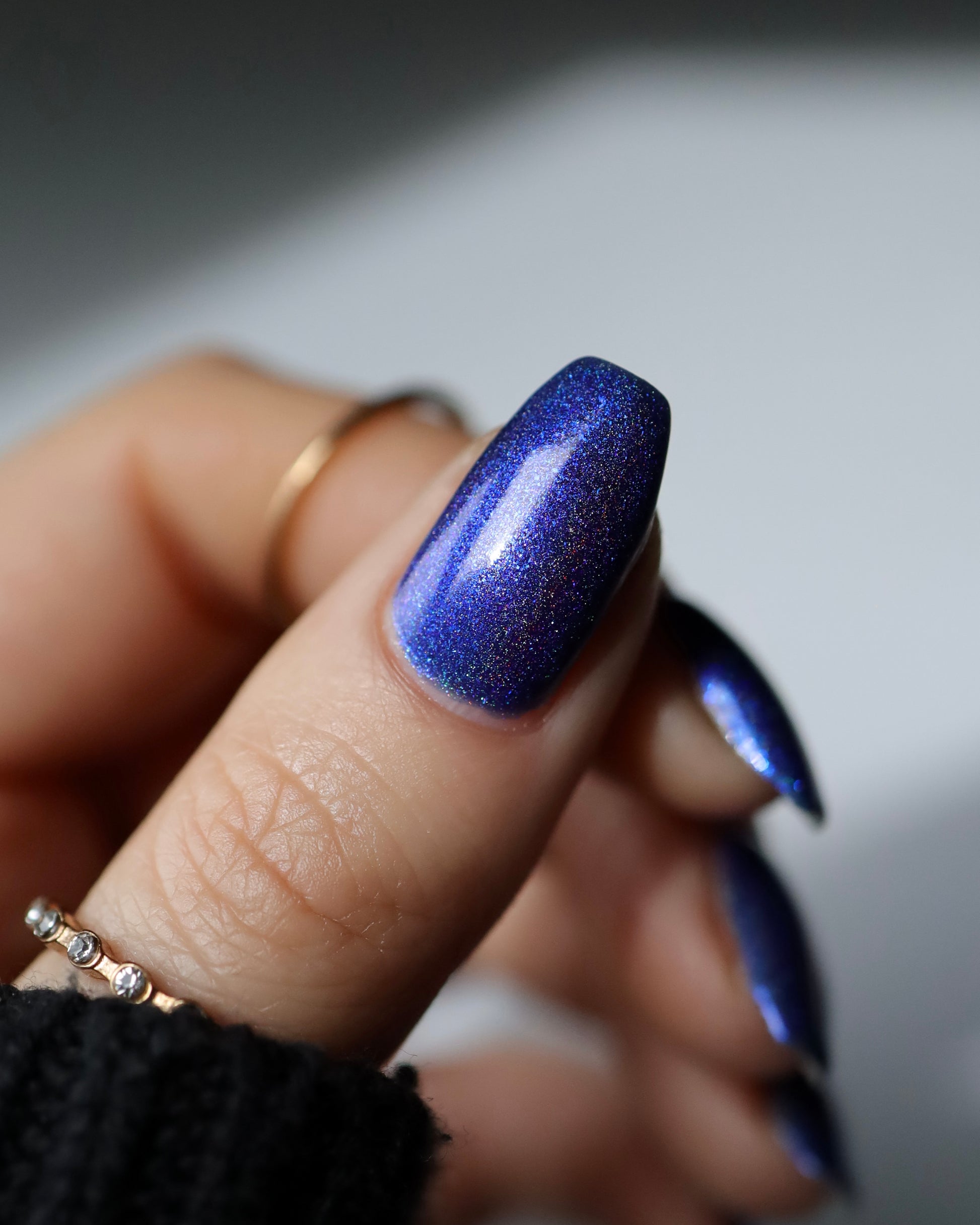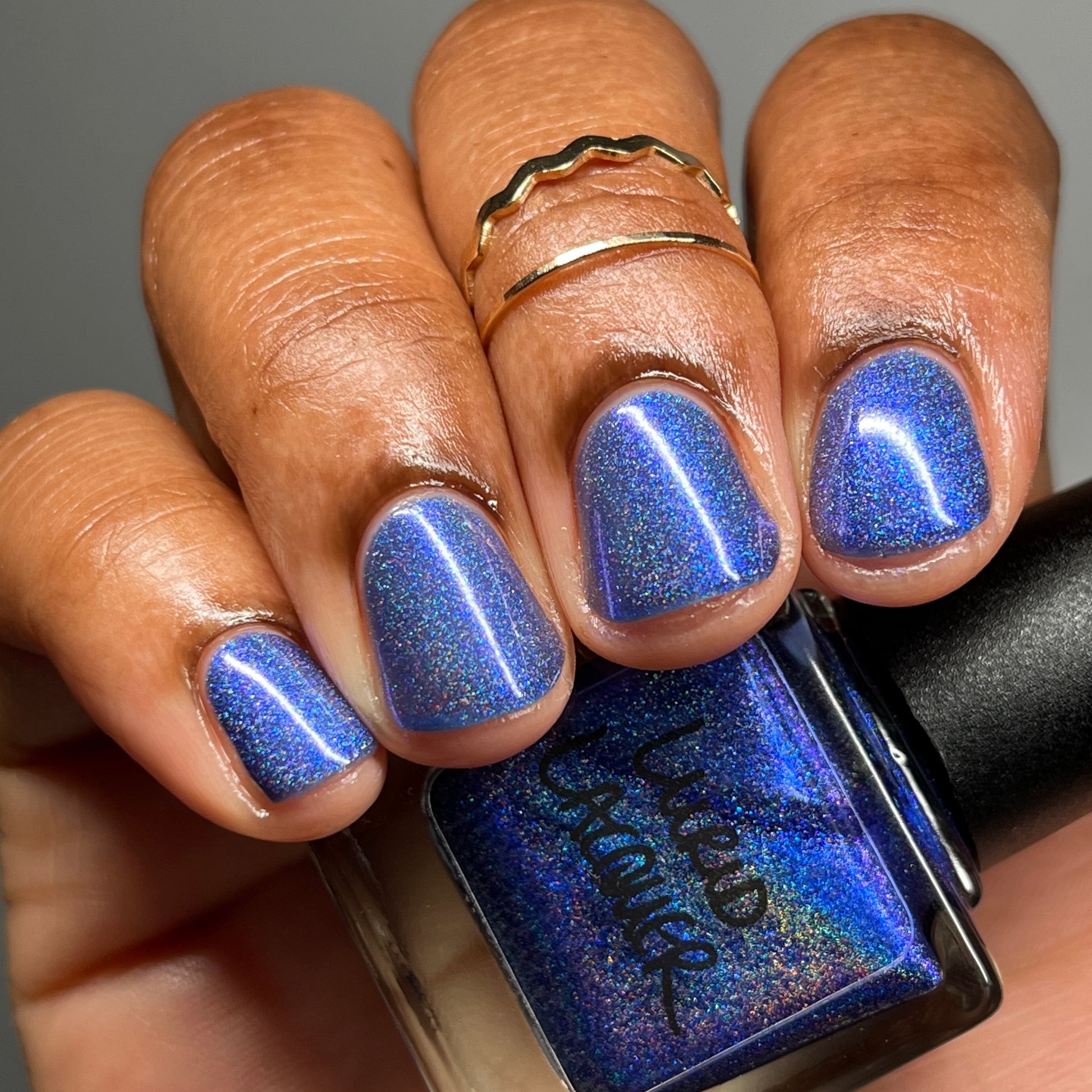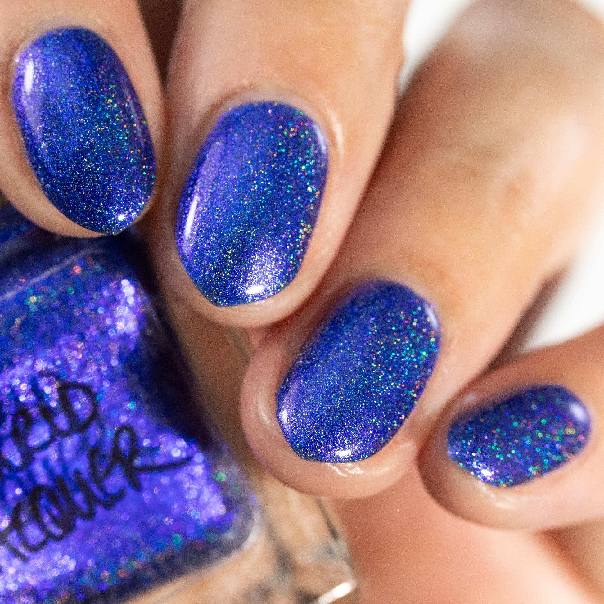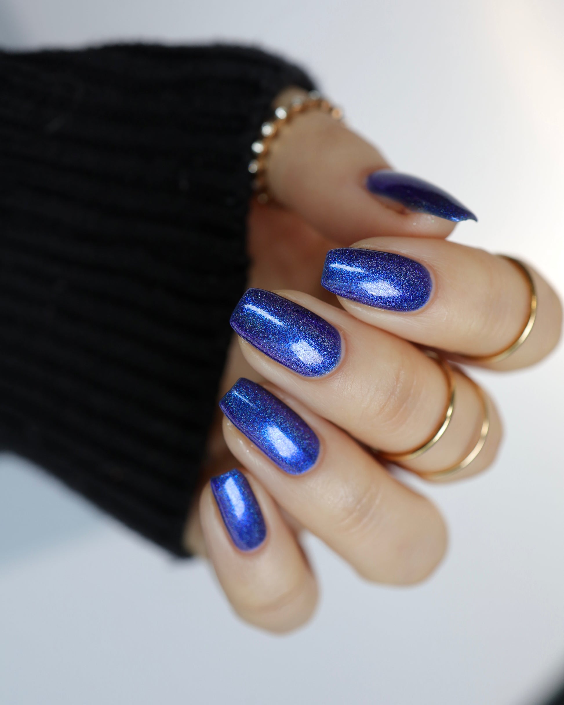 An indigo jelly base with subtle blue to purple aurora shimmer and linear holographic pigment