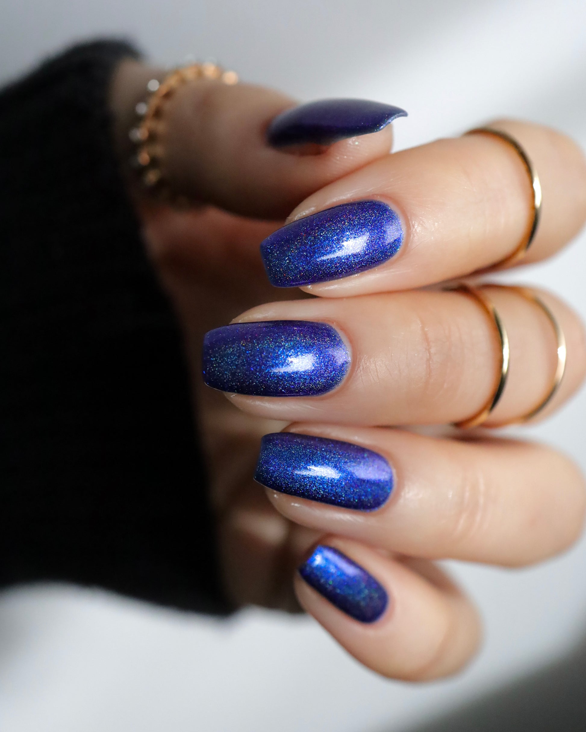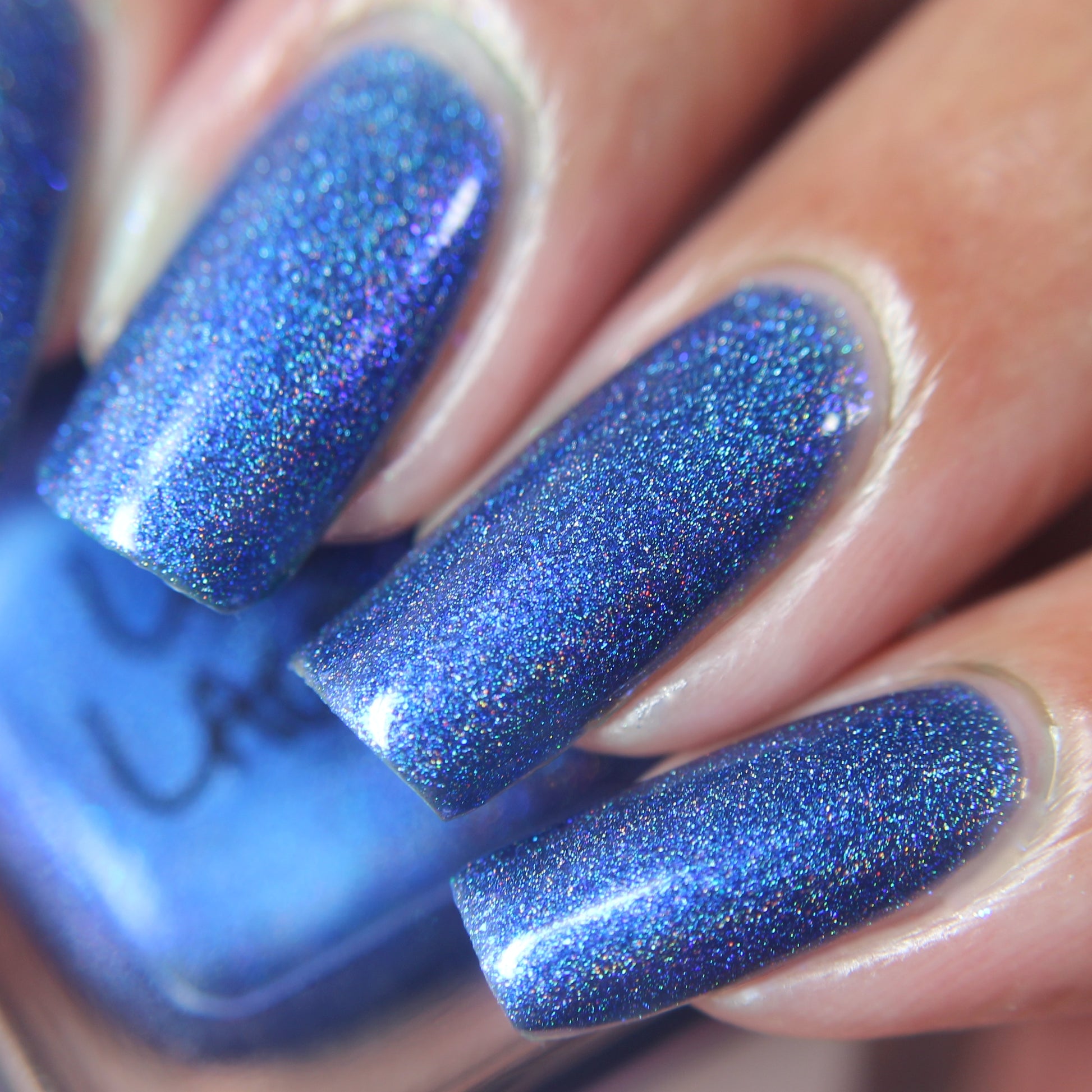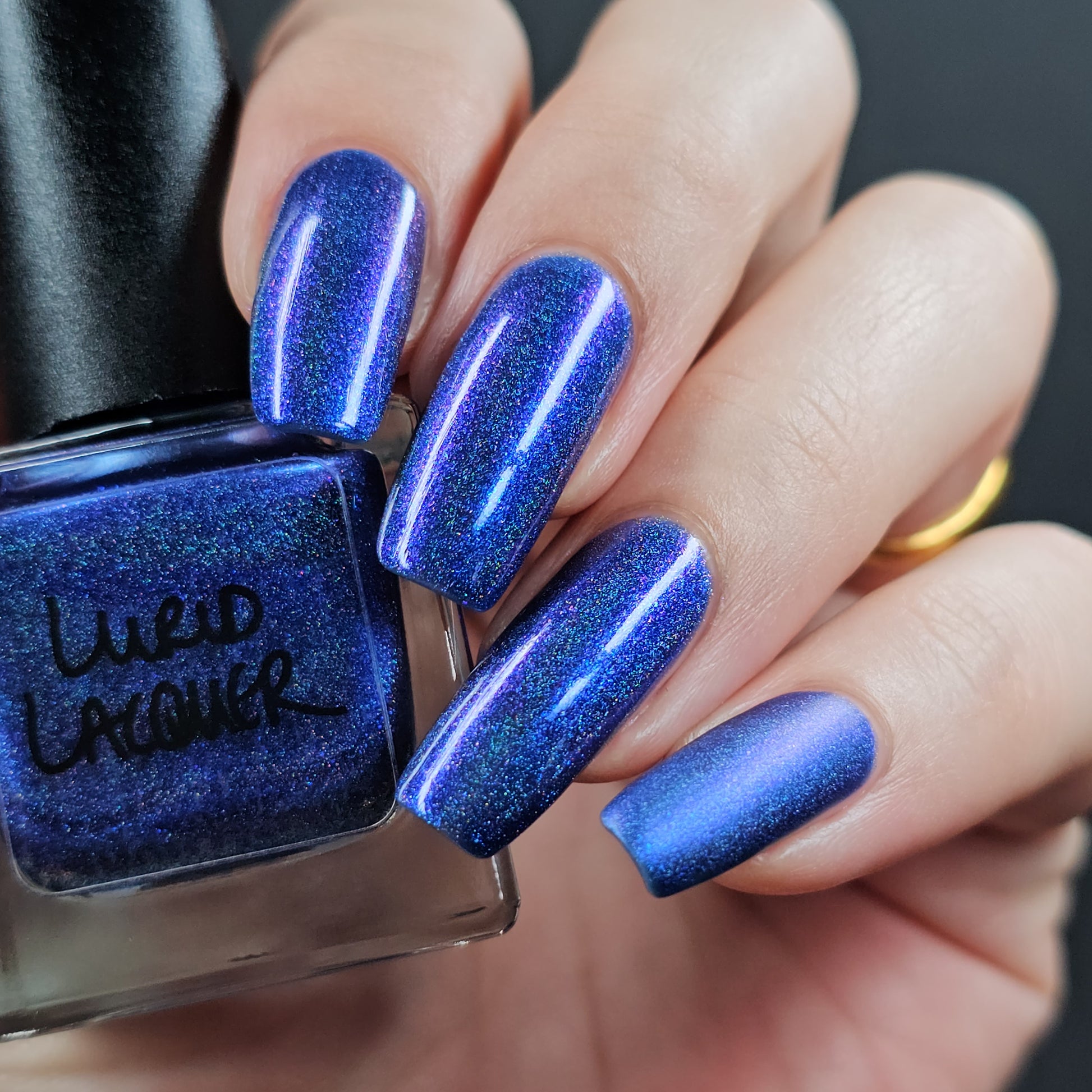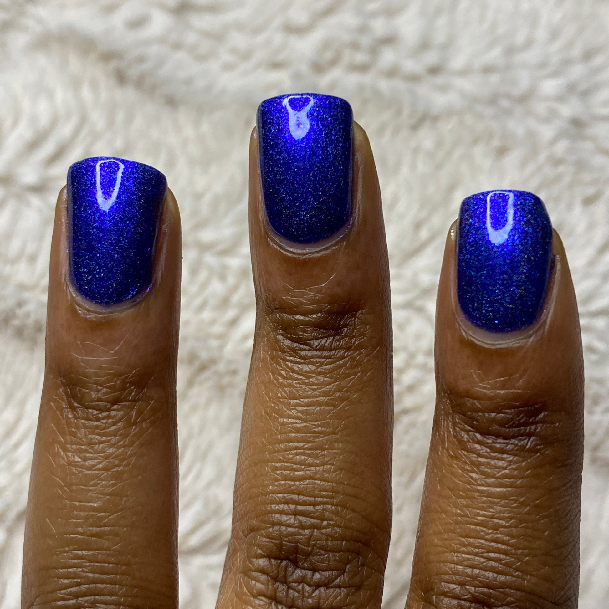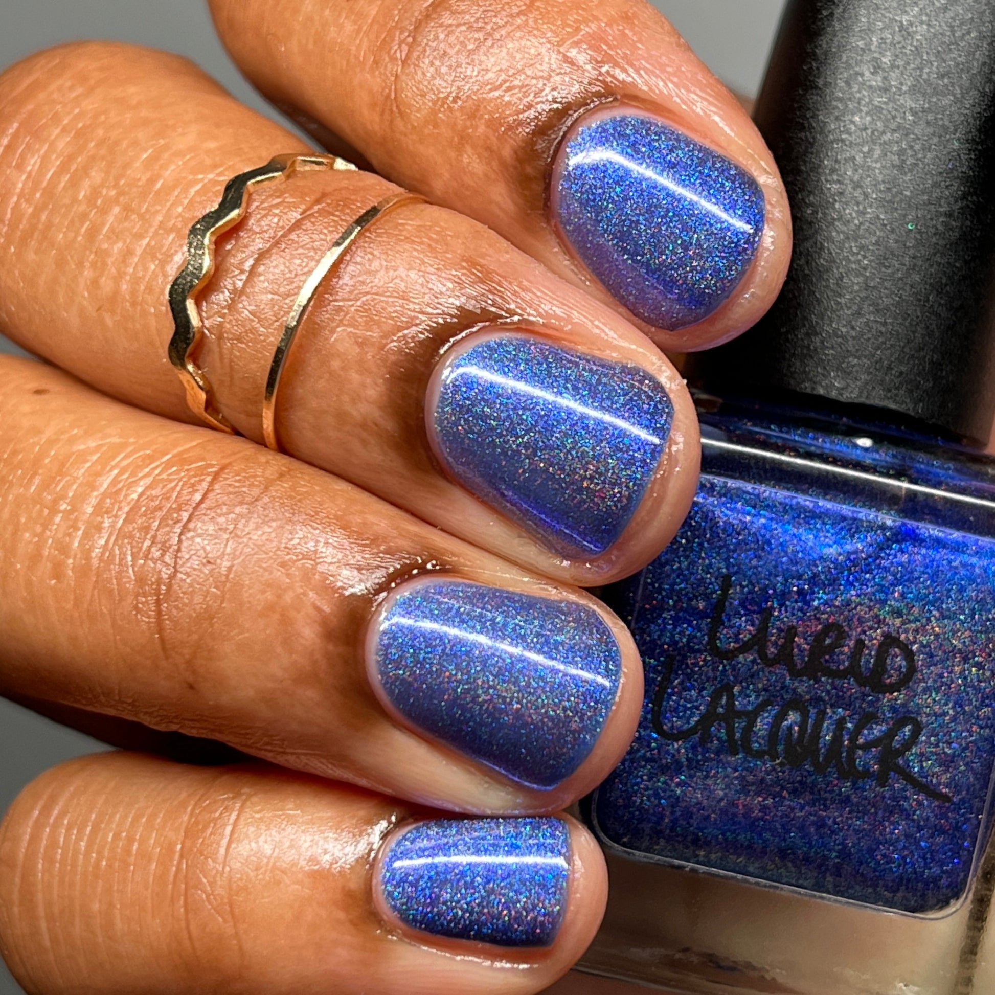 An indigo jelly base with subtle blue to purple aurora shimmer and linear holographic pigment